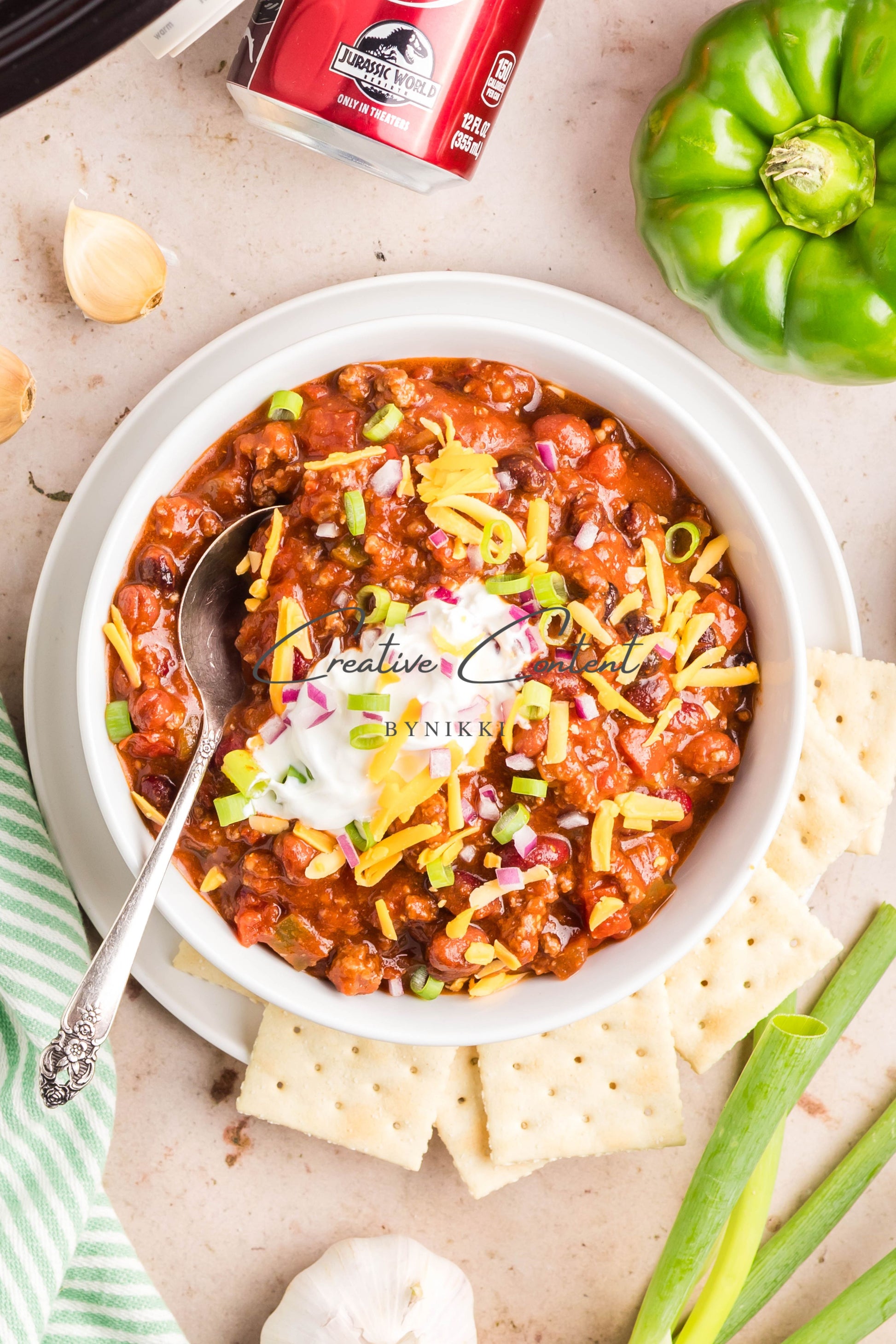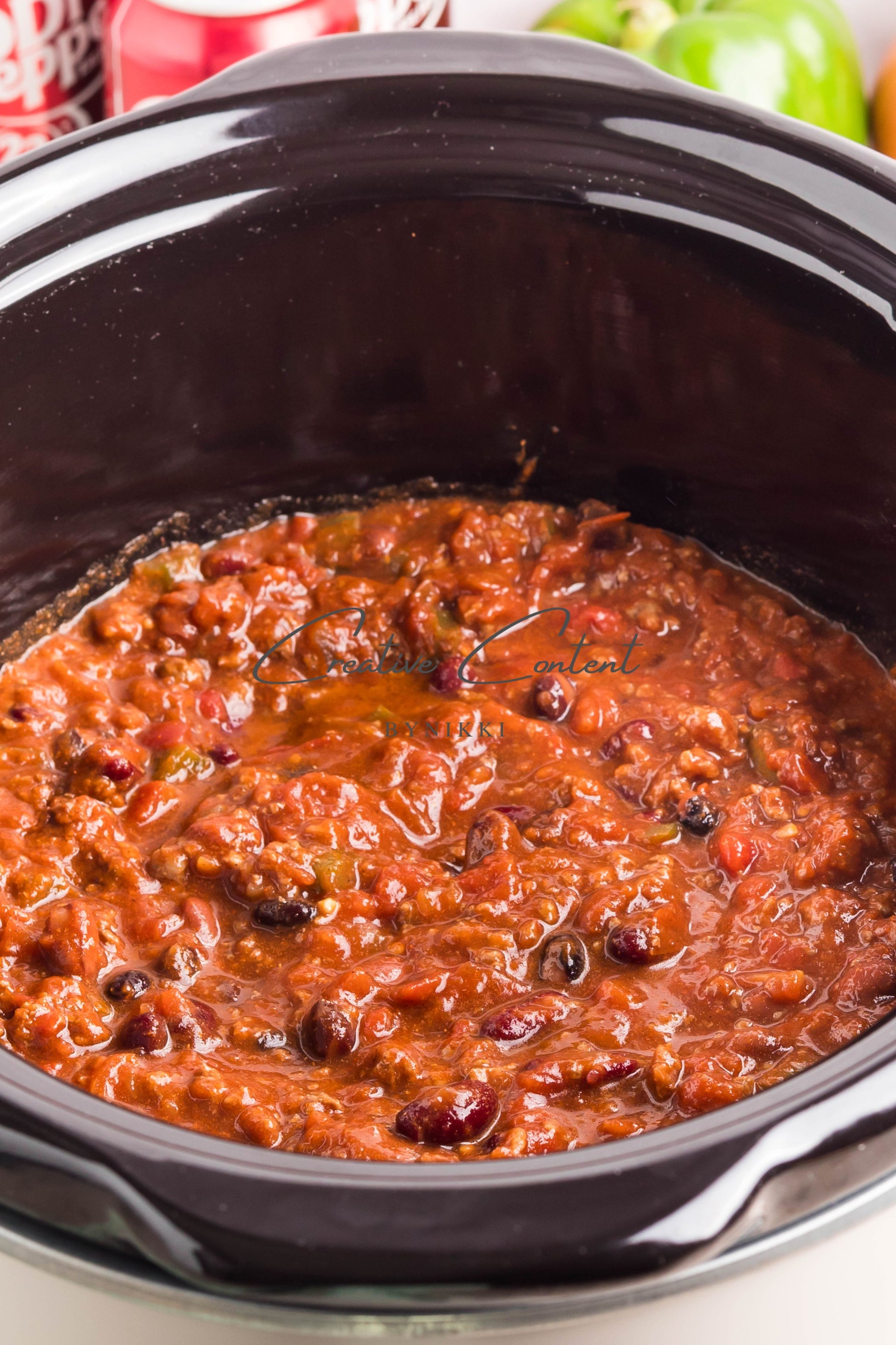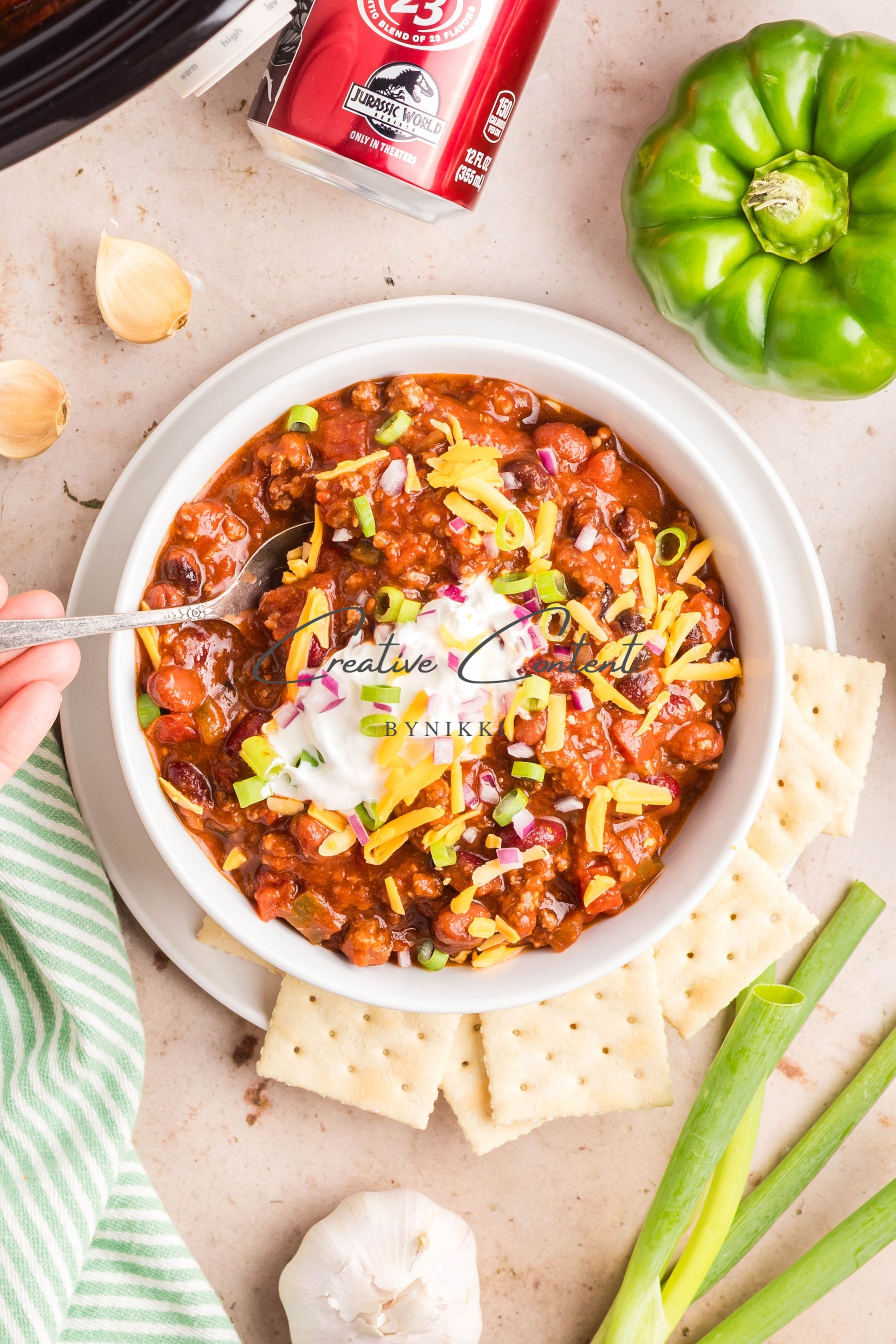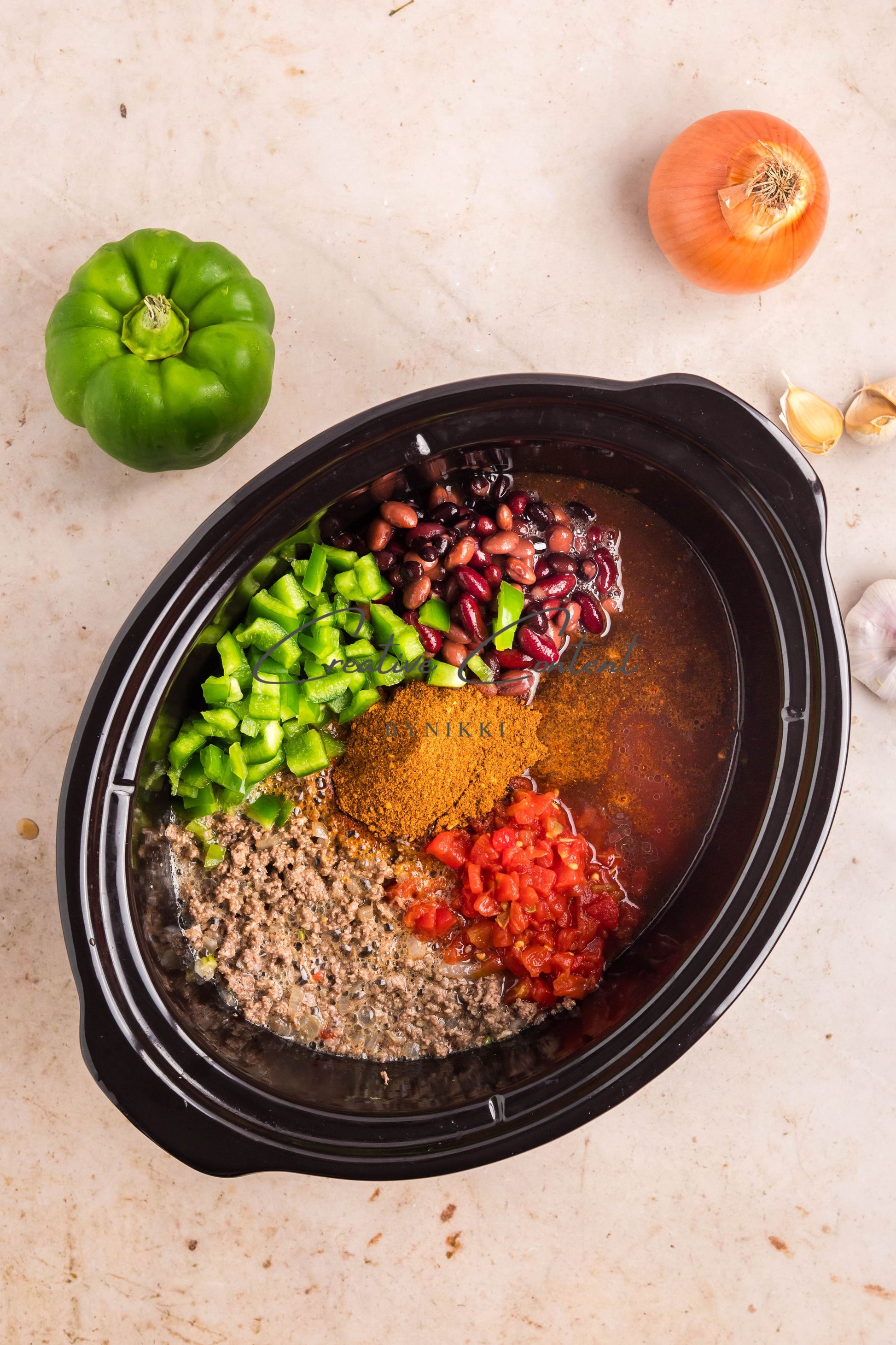 - Ingredients: Ground beef, yellow onion, garlic, green bell pepper, tri-color beans, tomatoes and chilies, crushed tomatoes, chili packet, Dr Pepper, cheese, sour cream, red onion, parsley