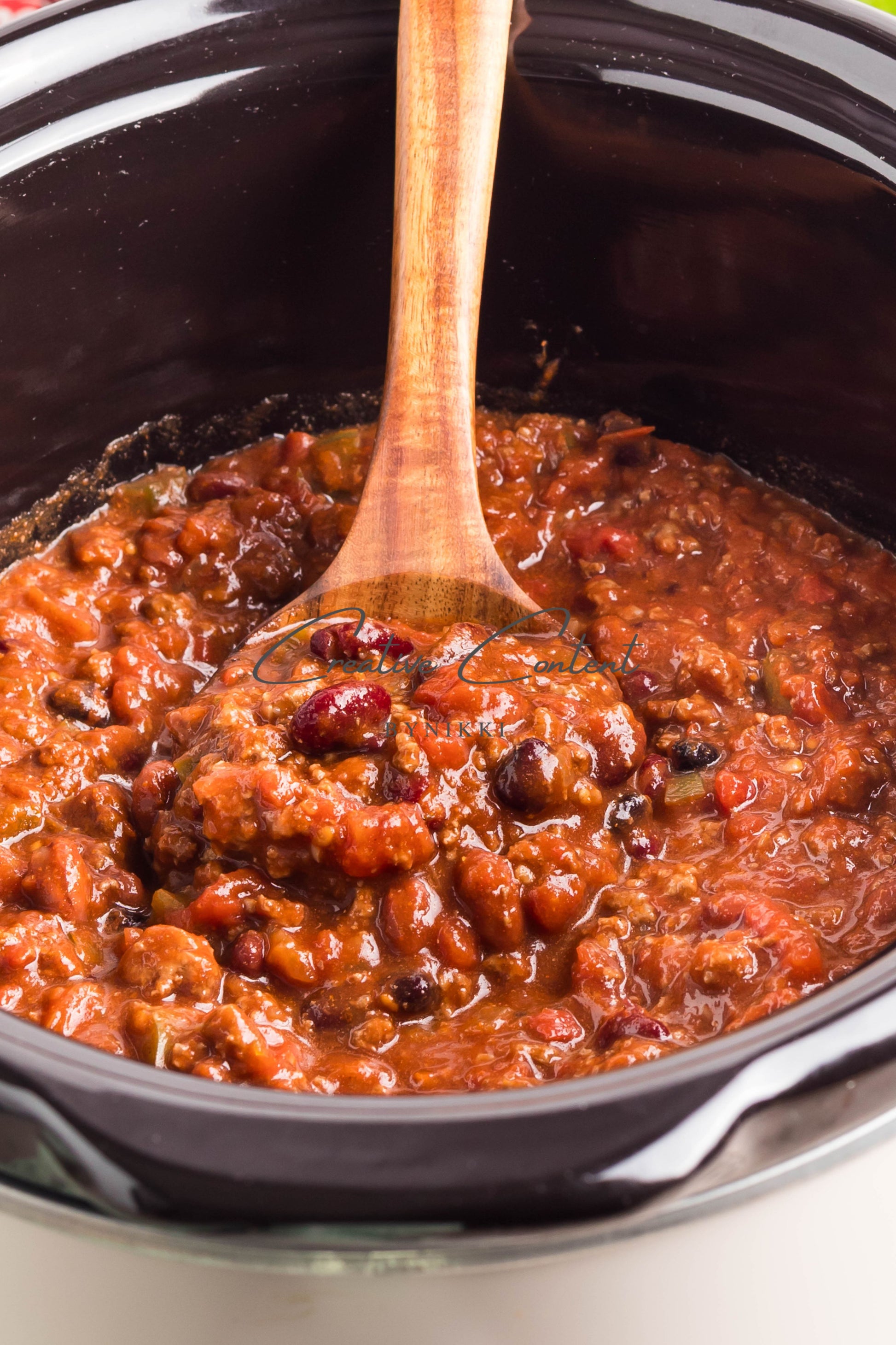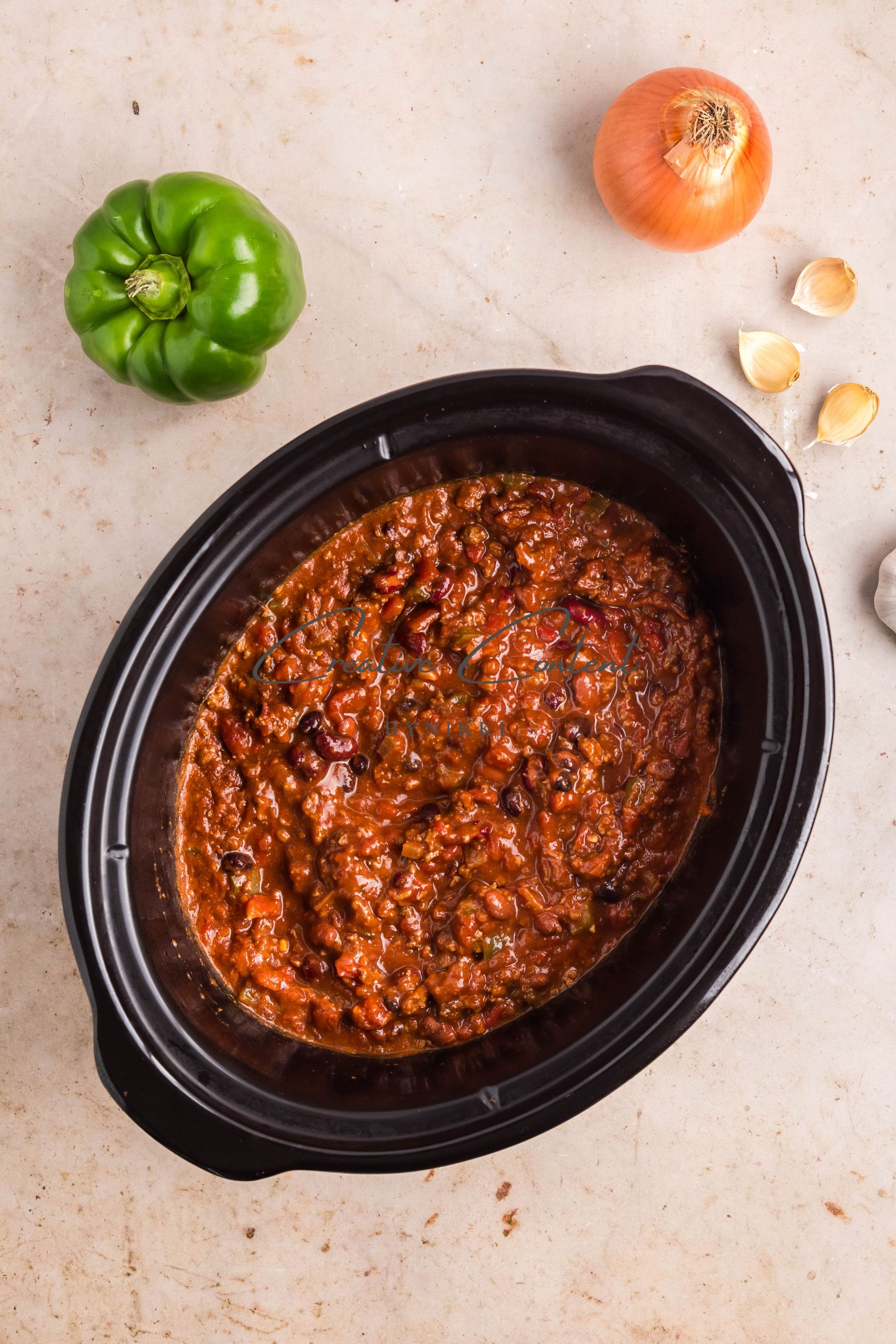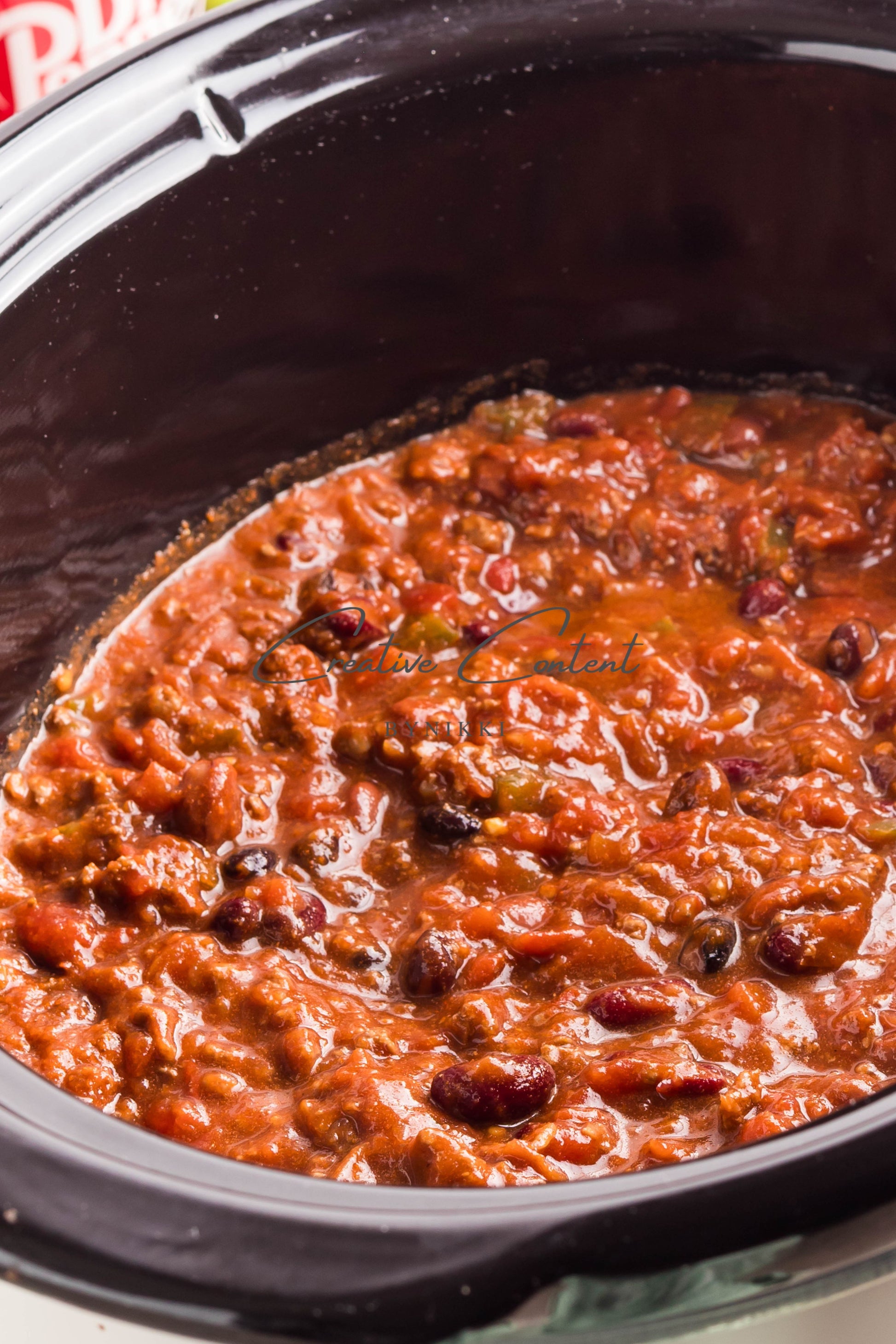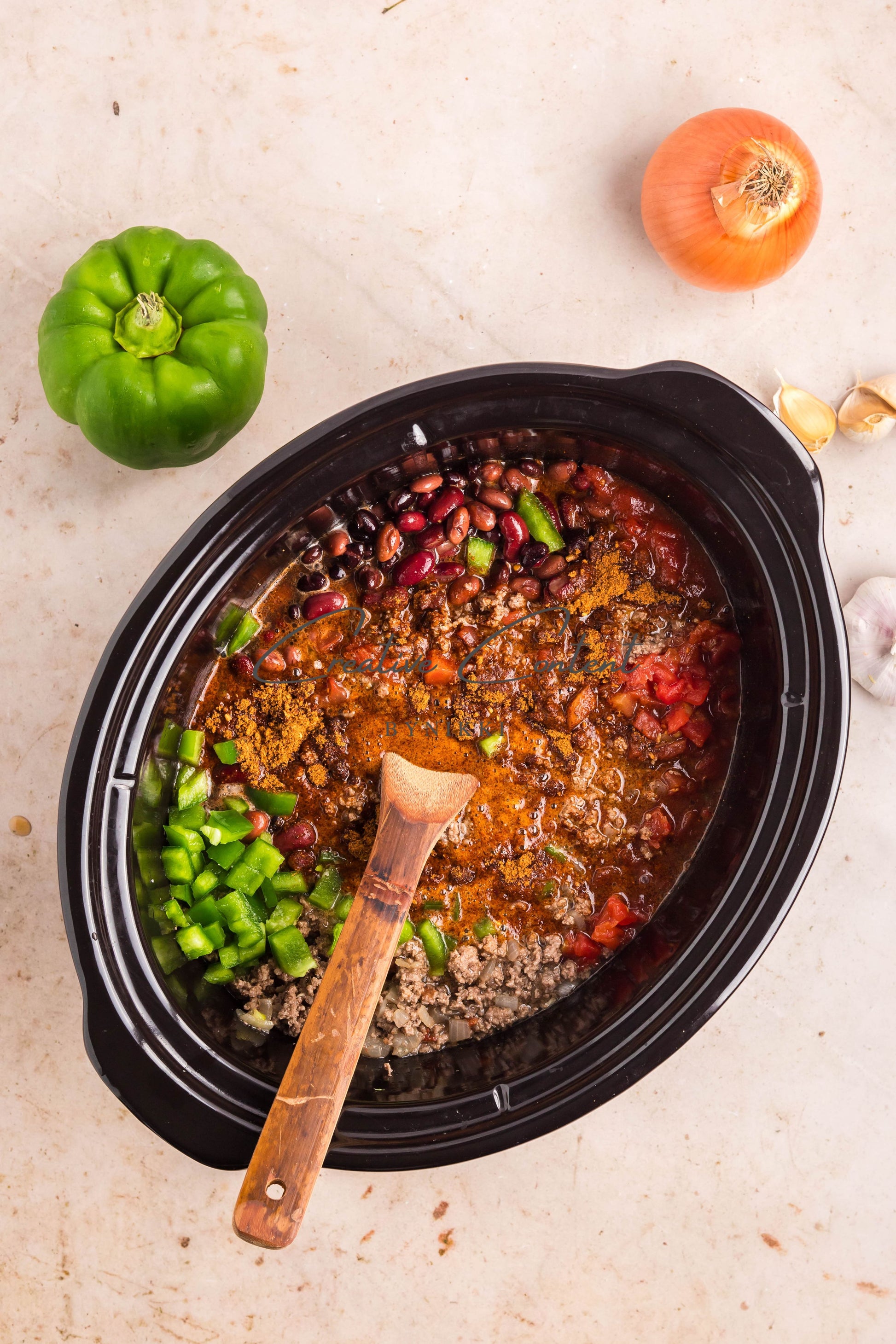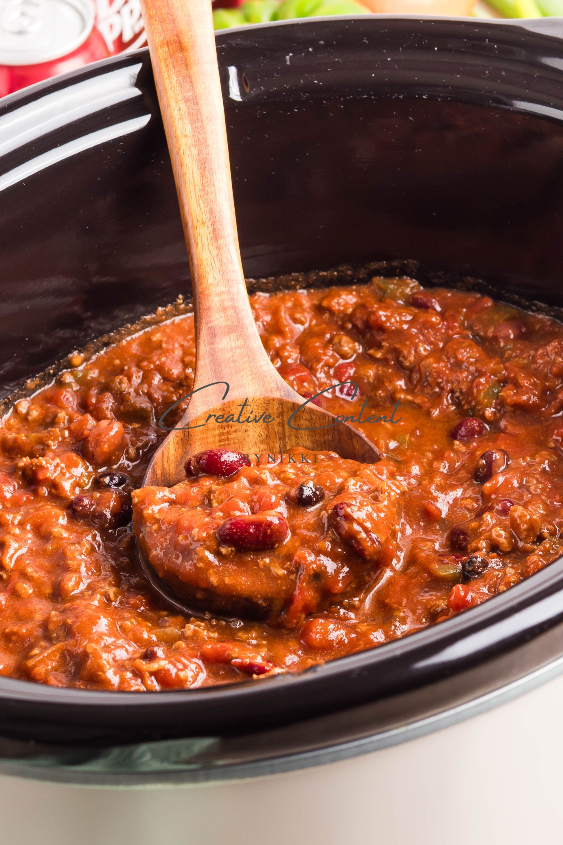- Ingredients: Ground beef, yellow onion, garlic, green bell pepper, tri-color beans, tomatoes and chilies, crushed tomatoes, chili packet, Dr Pepper, cheese, sour cream, red onion, parsley