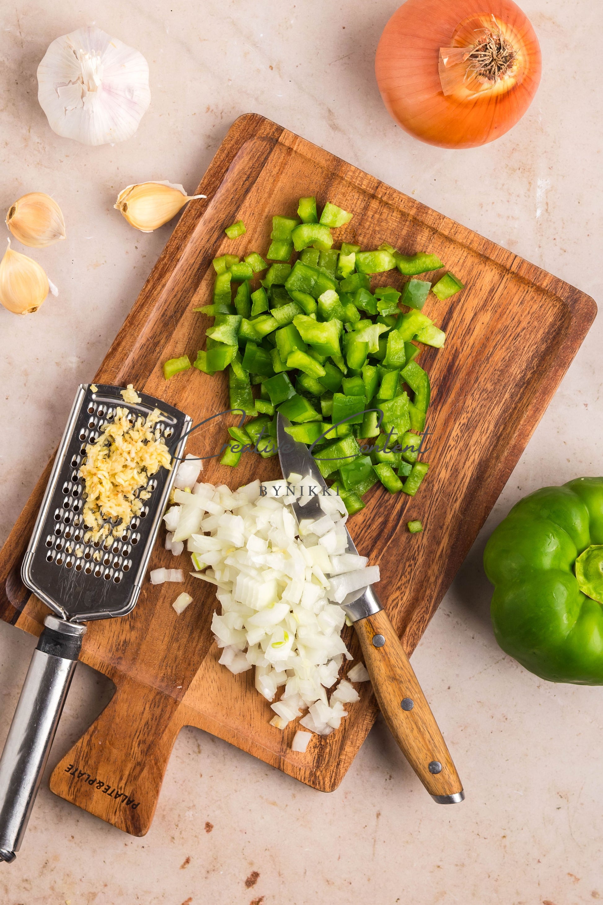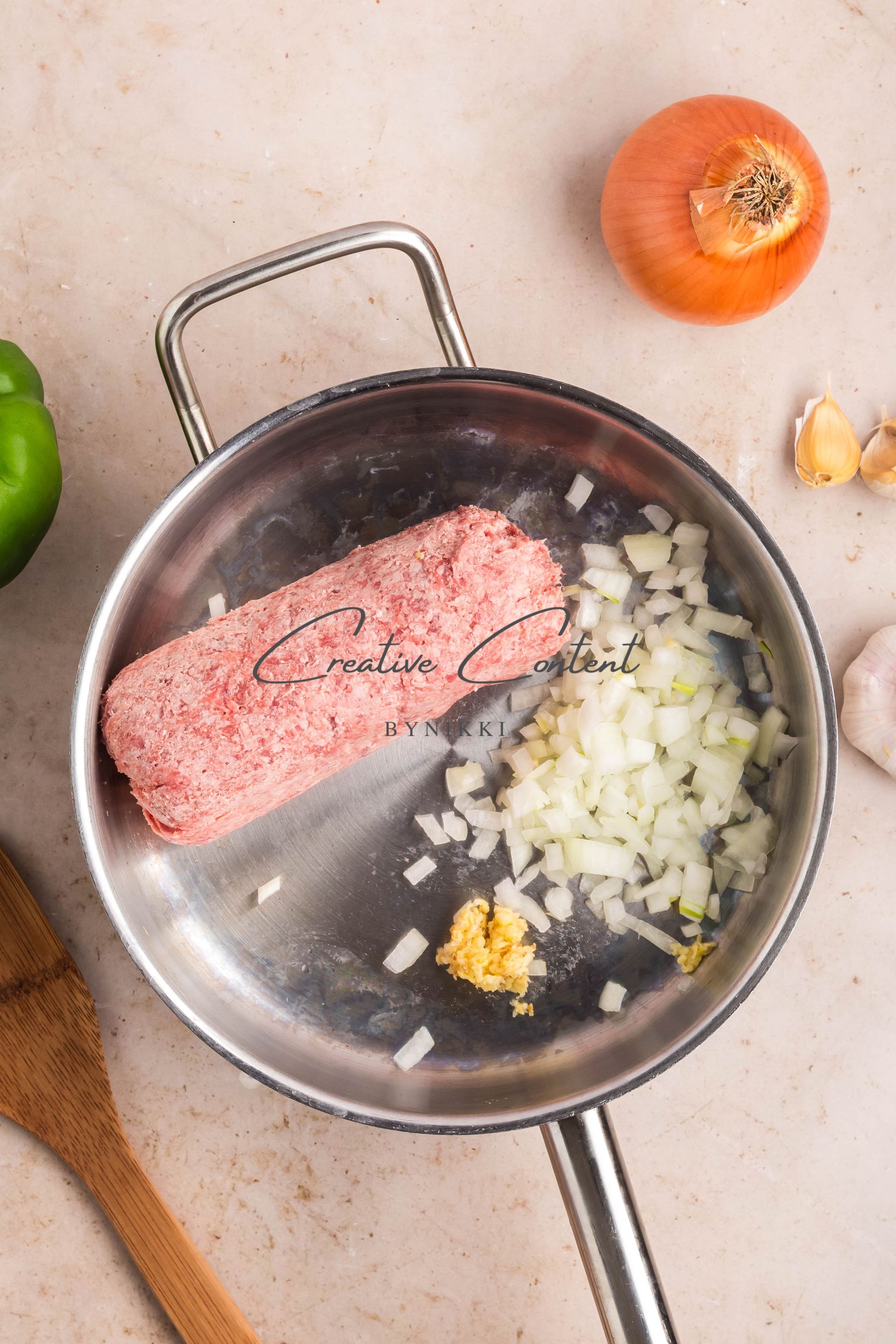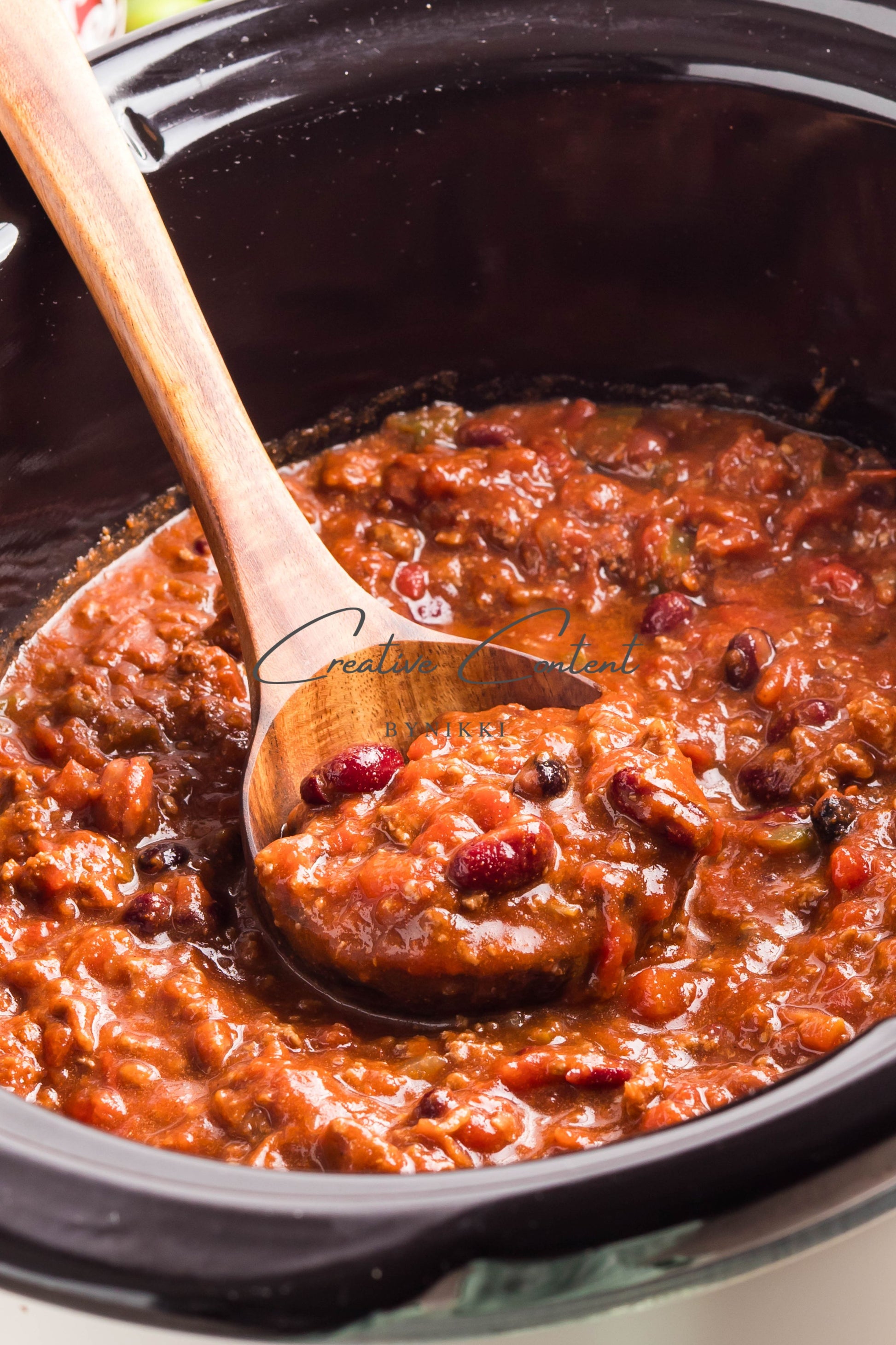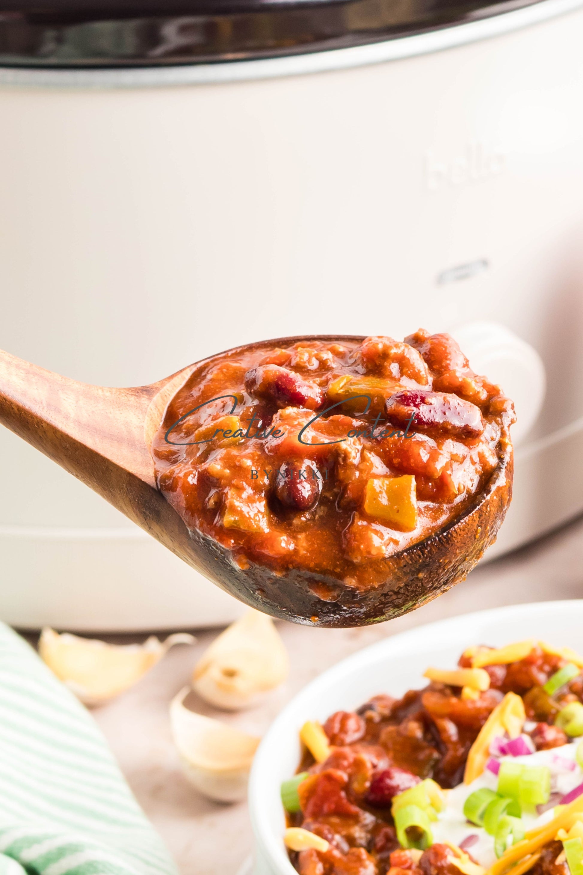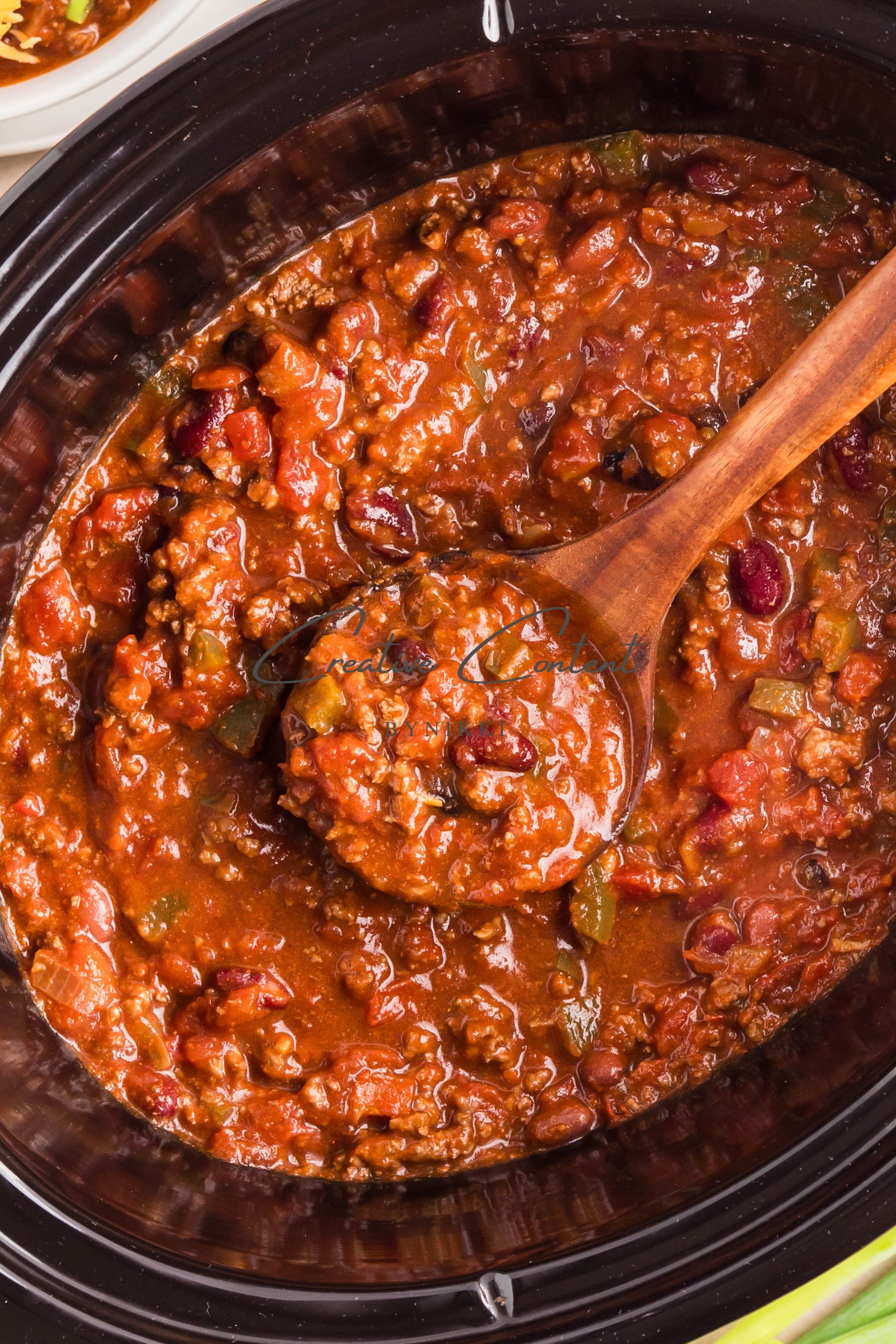 - Ingredients: Ground beef, yellow onion, garlic, green bell pepper, tri-color beans, tomatoes and chilies, crushed tomatoes, chili packet, Dr Pepper, cheese, sour cream, red onion, parsley