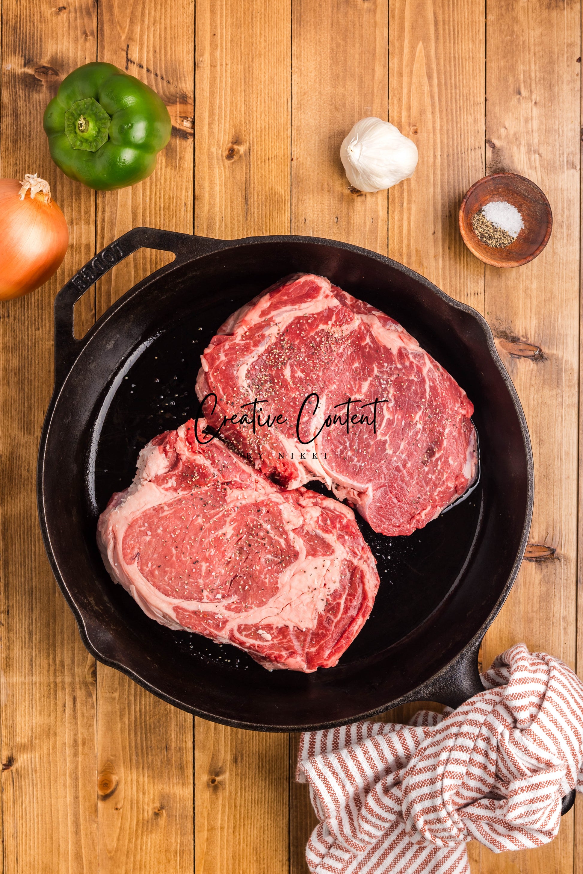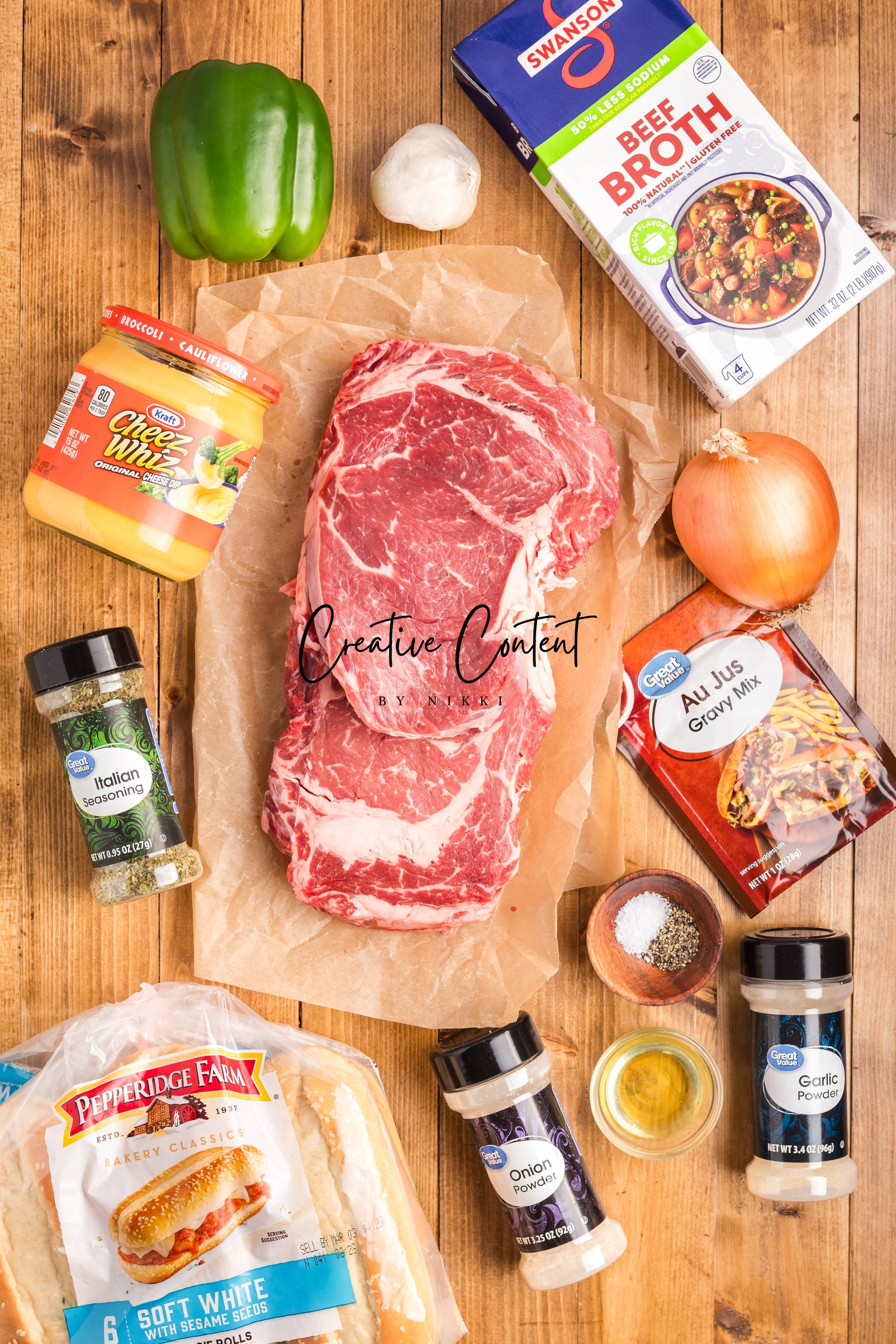 - Ingredients: avocado oil, ribeye steak, kosher salt, black pepper, onions, green bell peppers, beef broth, au jus gravy mix, garlic cloves, Italian seasoning, garlic powder, onion powder, hoagie rolls, cheese whiz