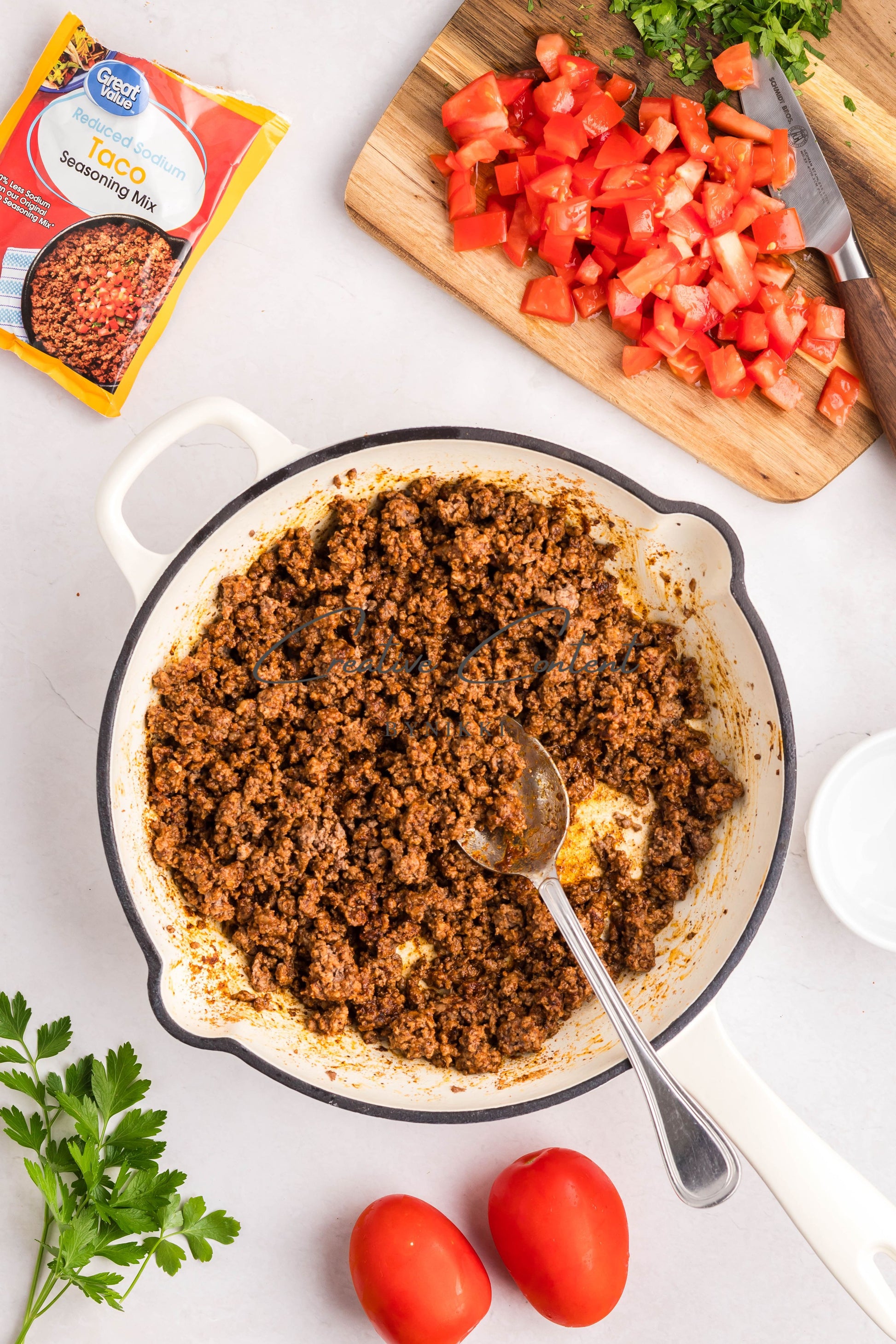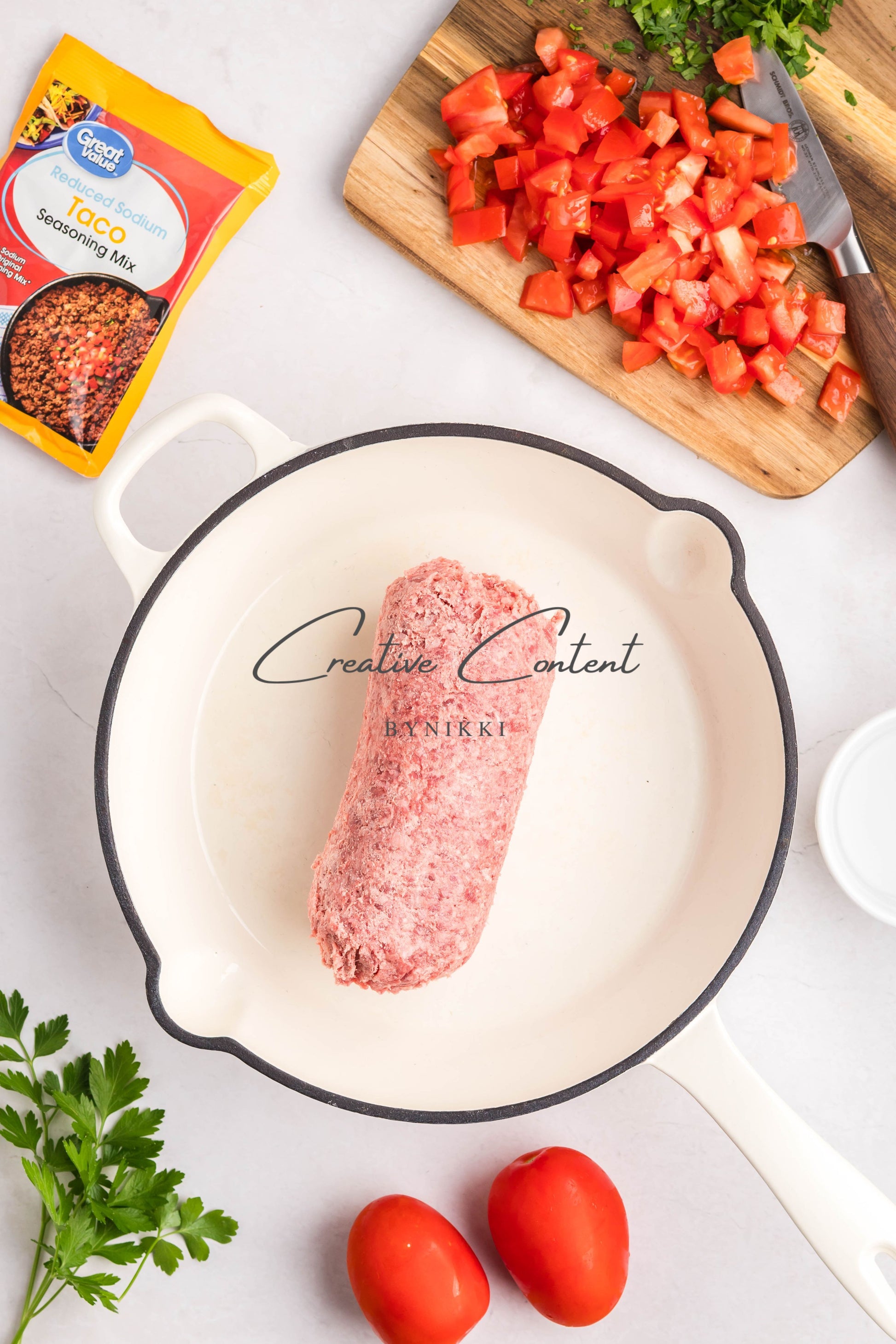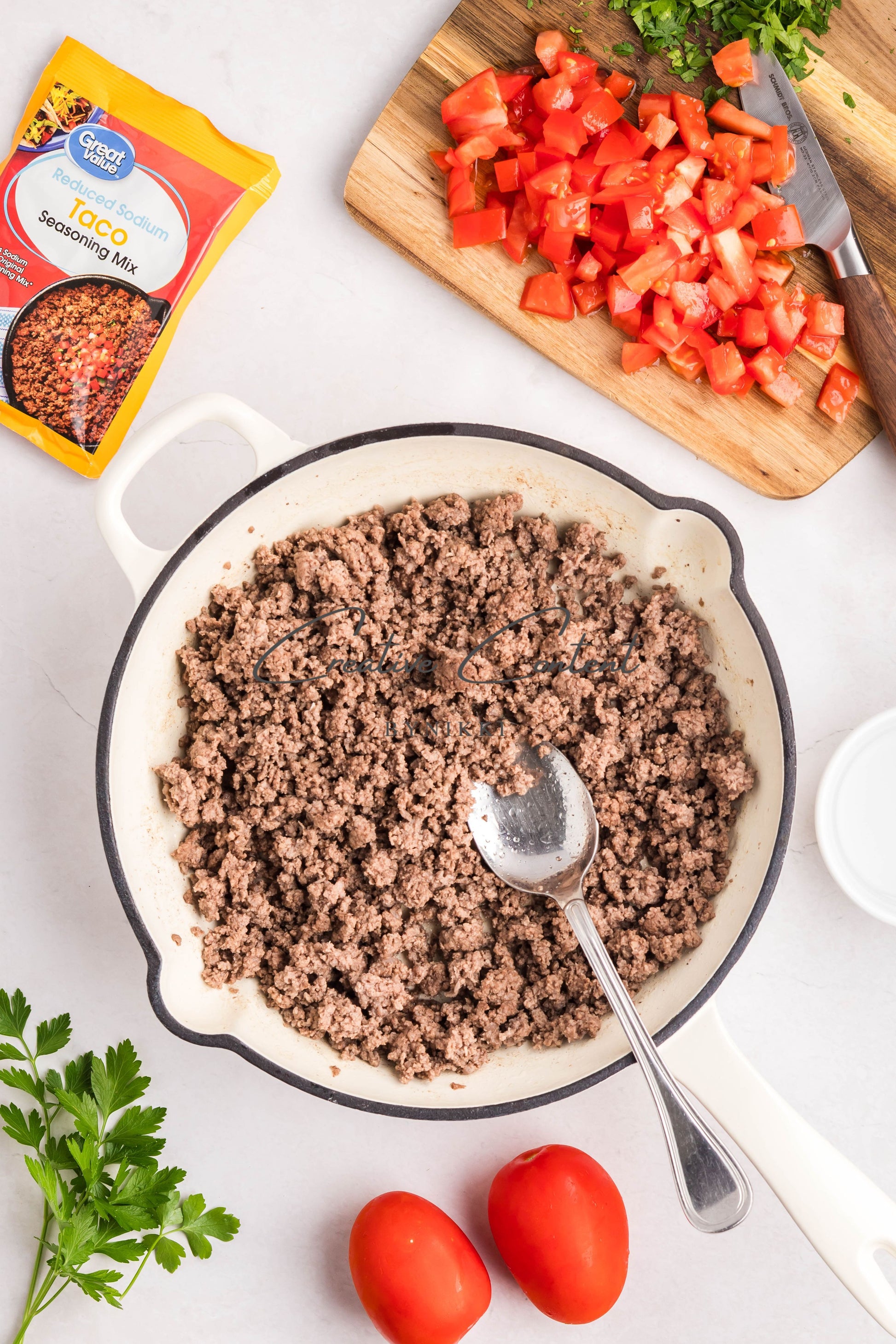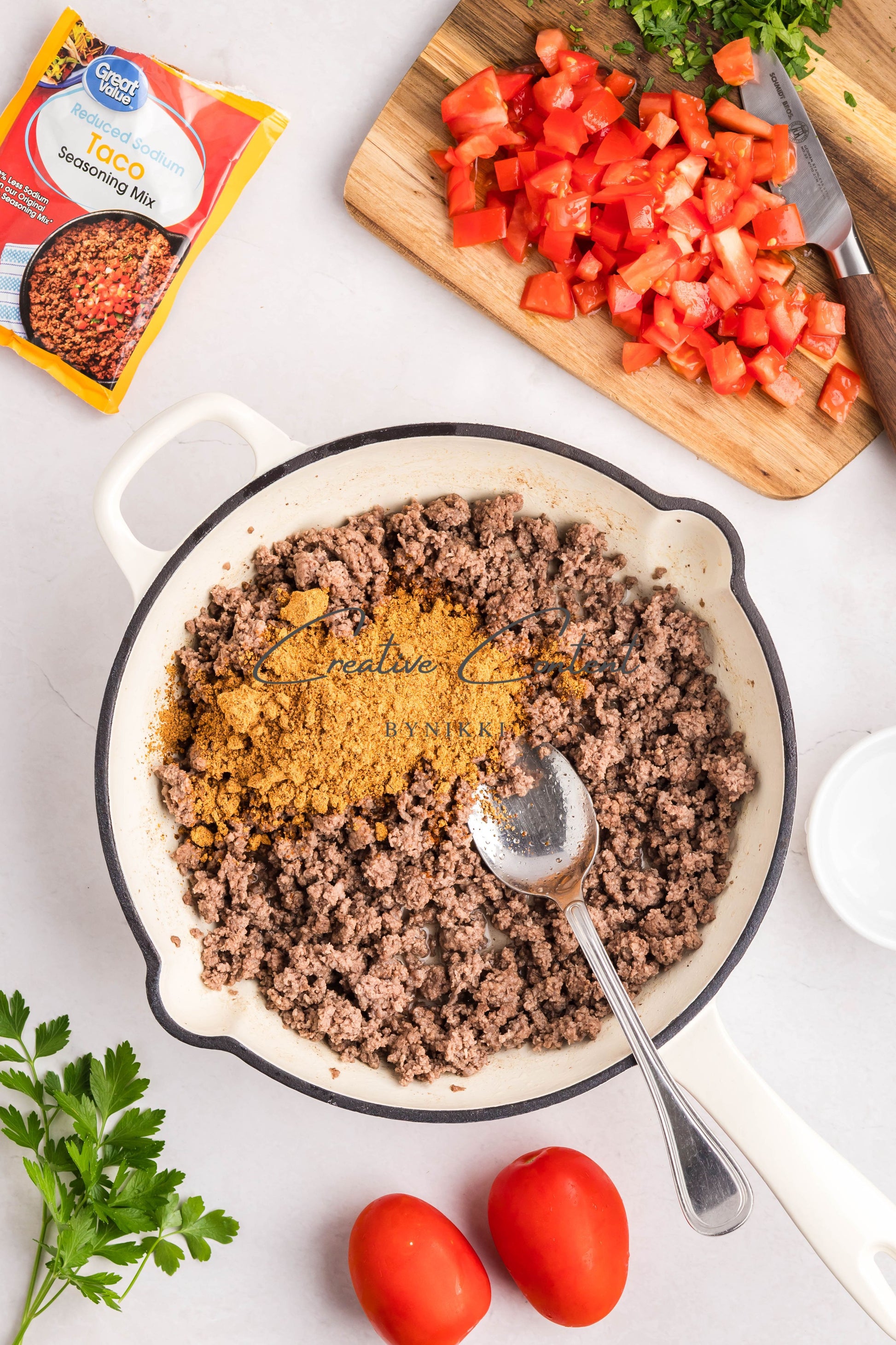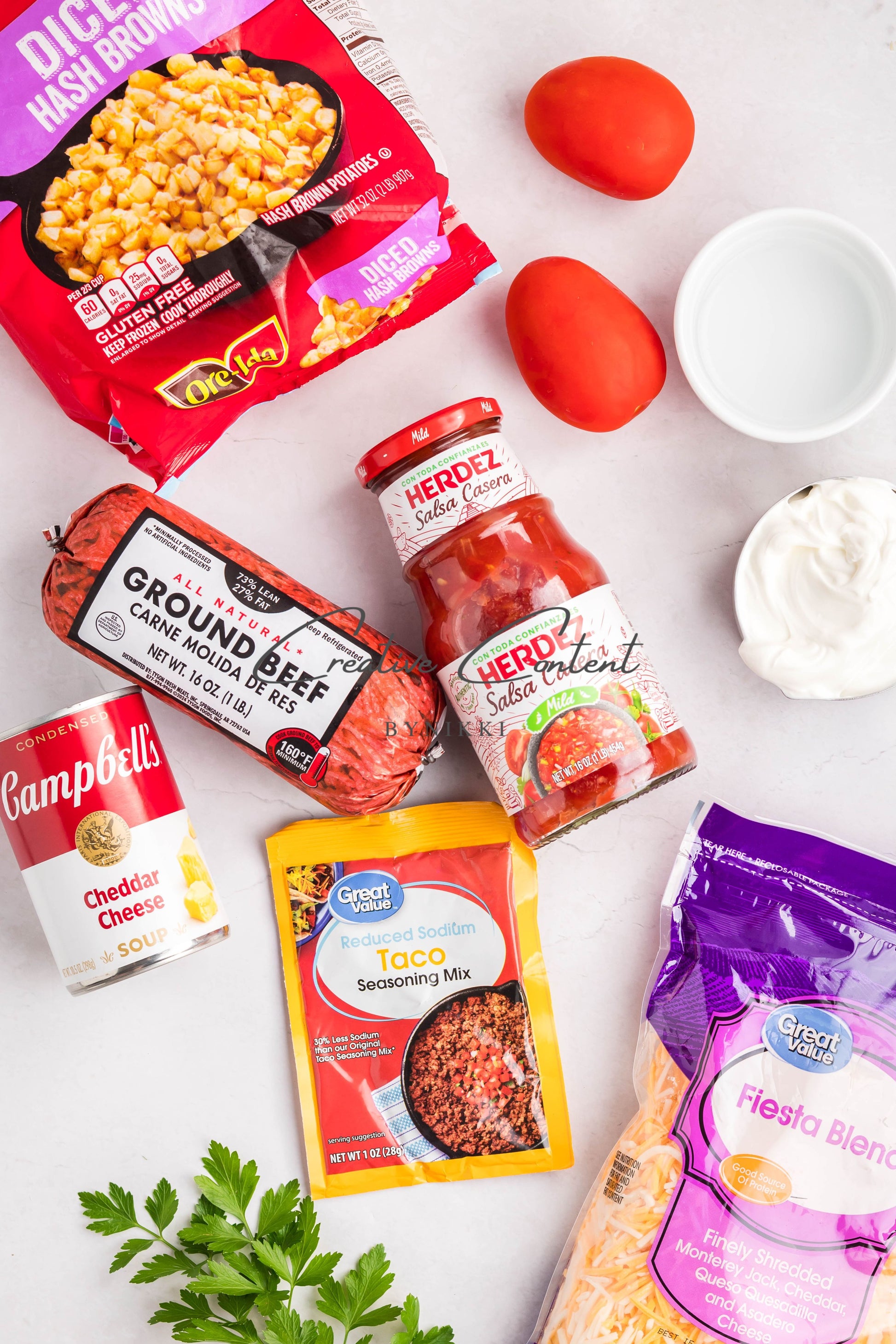 - Ingredients: Ore-Ida Diced Hash Brown Frozen Potatoes, ground beef, low sodium taco seasoning, water, condensed cheddar cheese soup, sour cream, Herdez mild salsa, Mexican shredded cheese, low sodium taco seasoning, Mexican shredded cheese, fresh chopped parsley, diced Roma tomatoes.