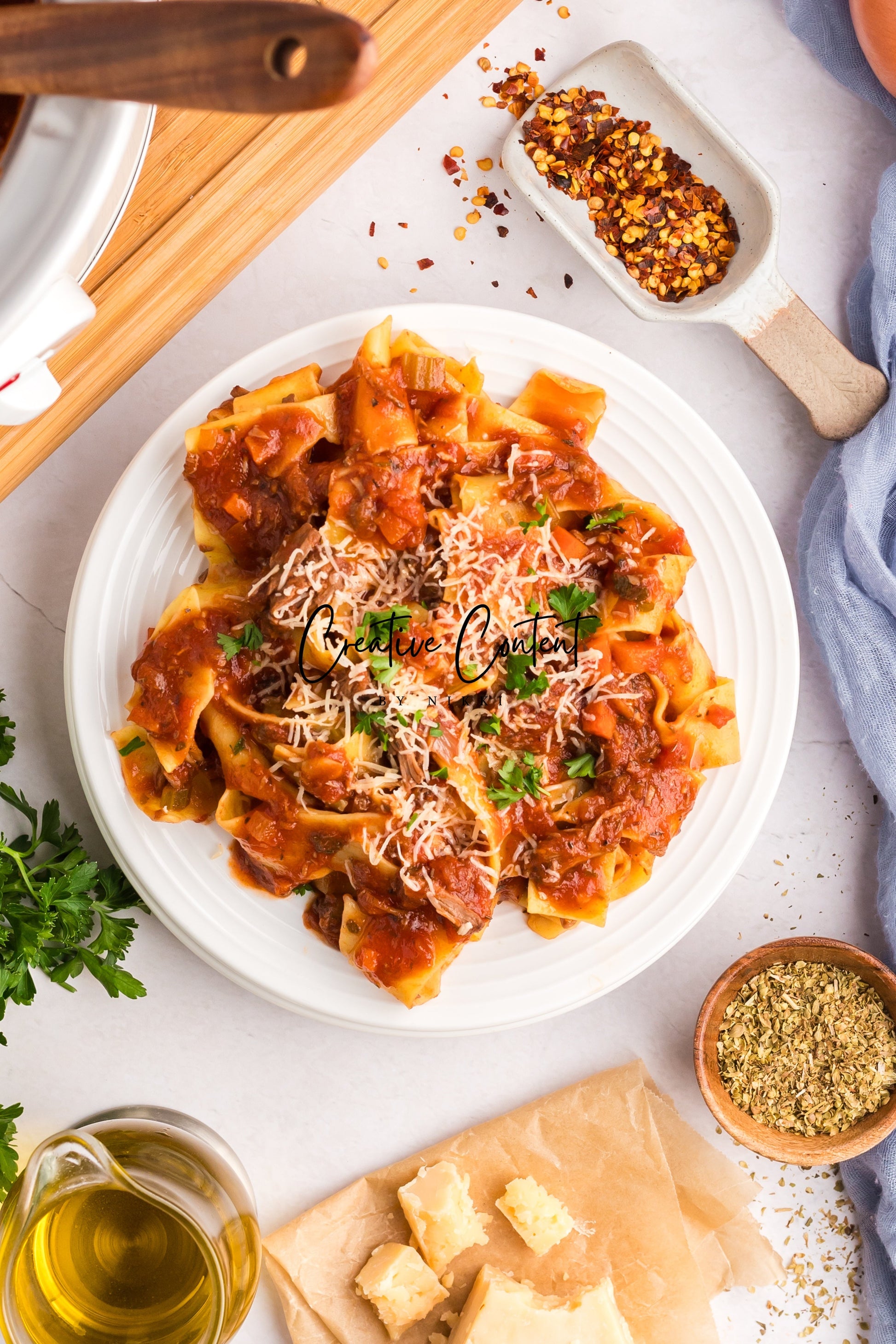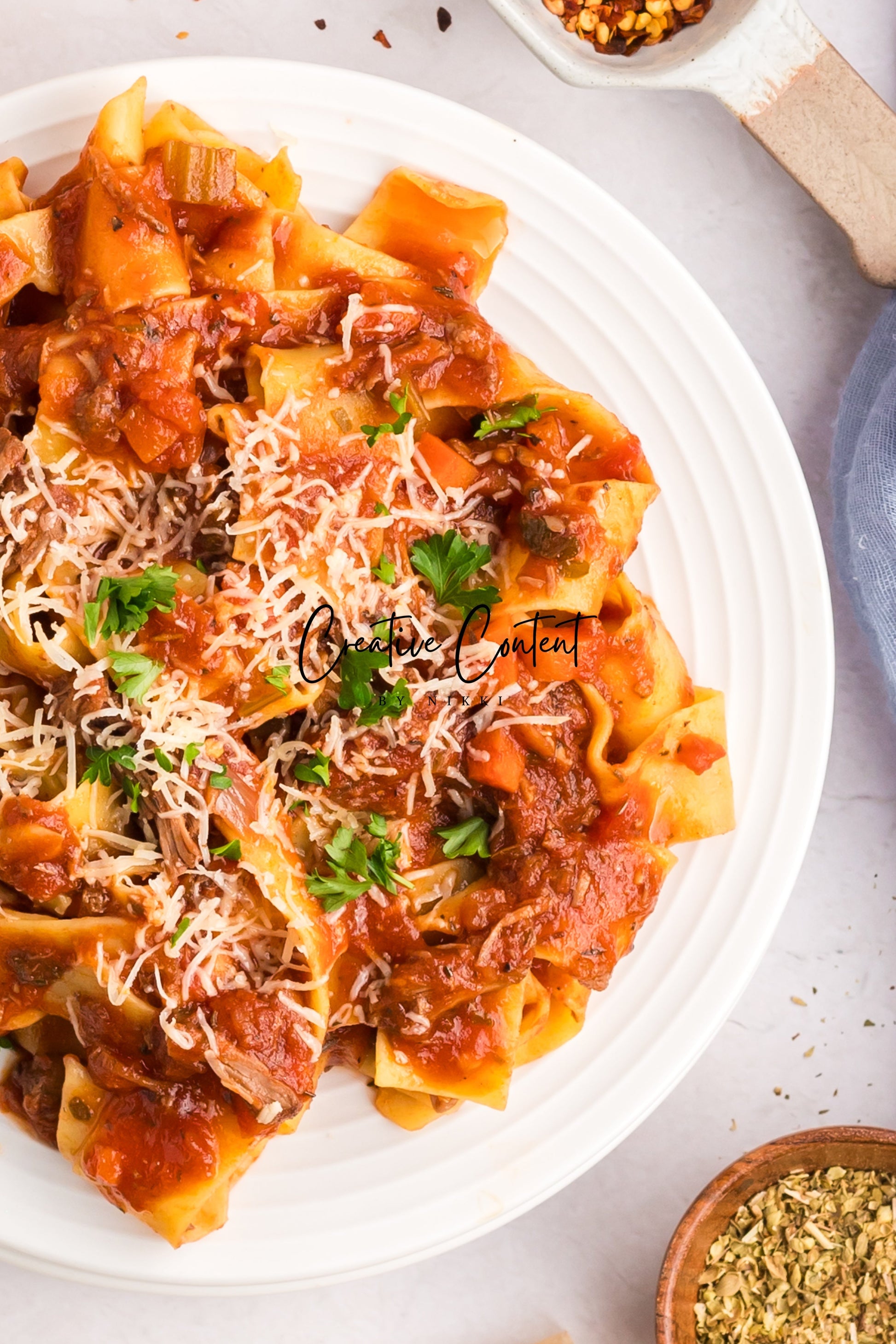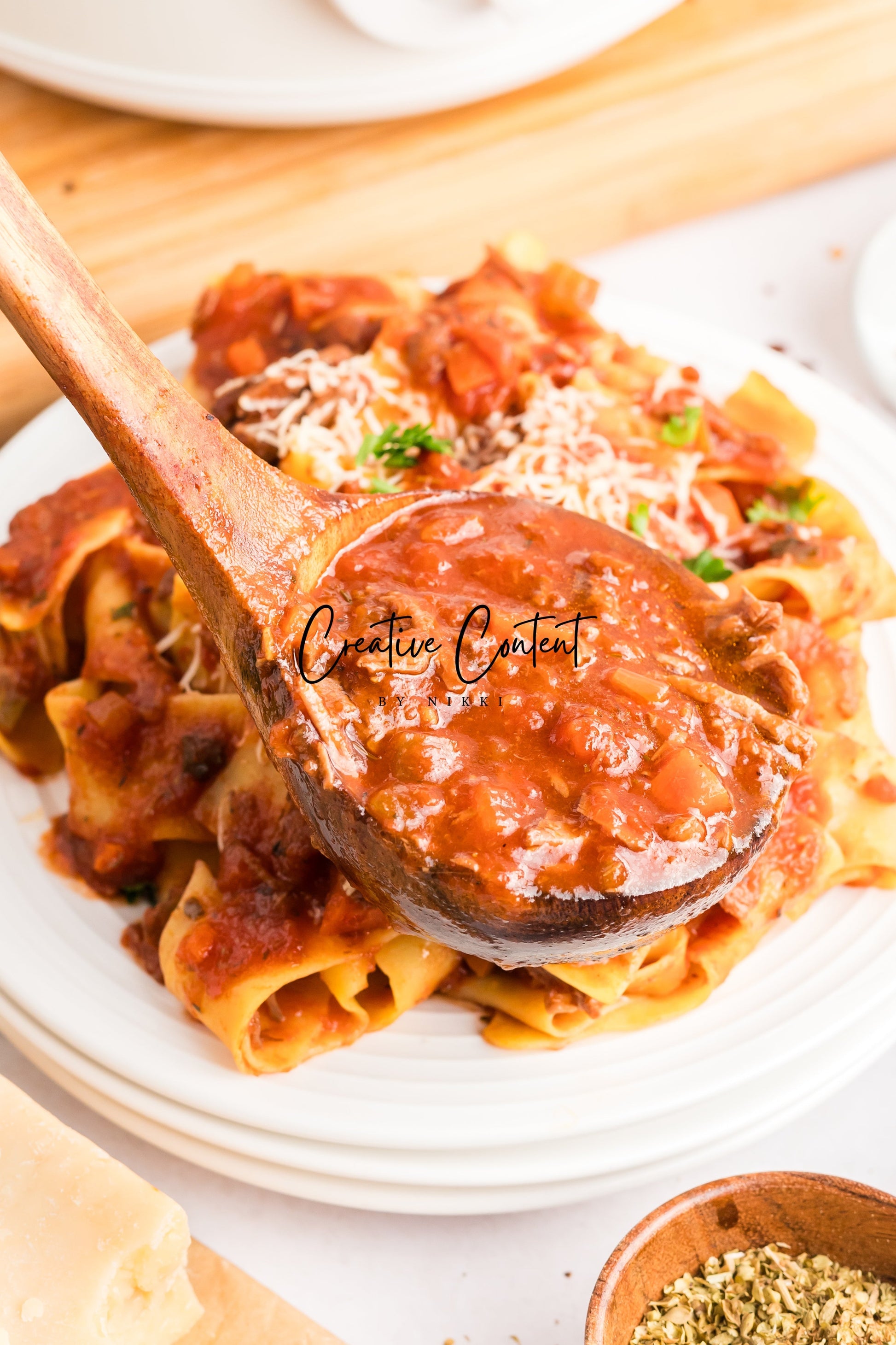 This crockpot beef ragu is beyond delicious. It takes pasta night to the next level. The fresh onions, carrots, celery, beef chuck steak, red wine, and dried thyme come together to create a delicious recipe everyone will love. This is a great dish to serve a crowd.