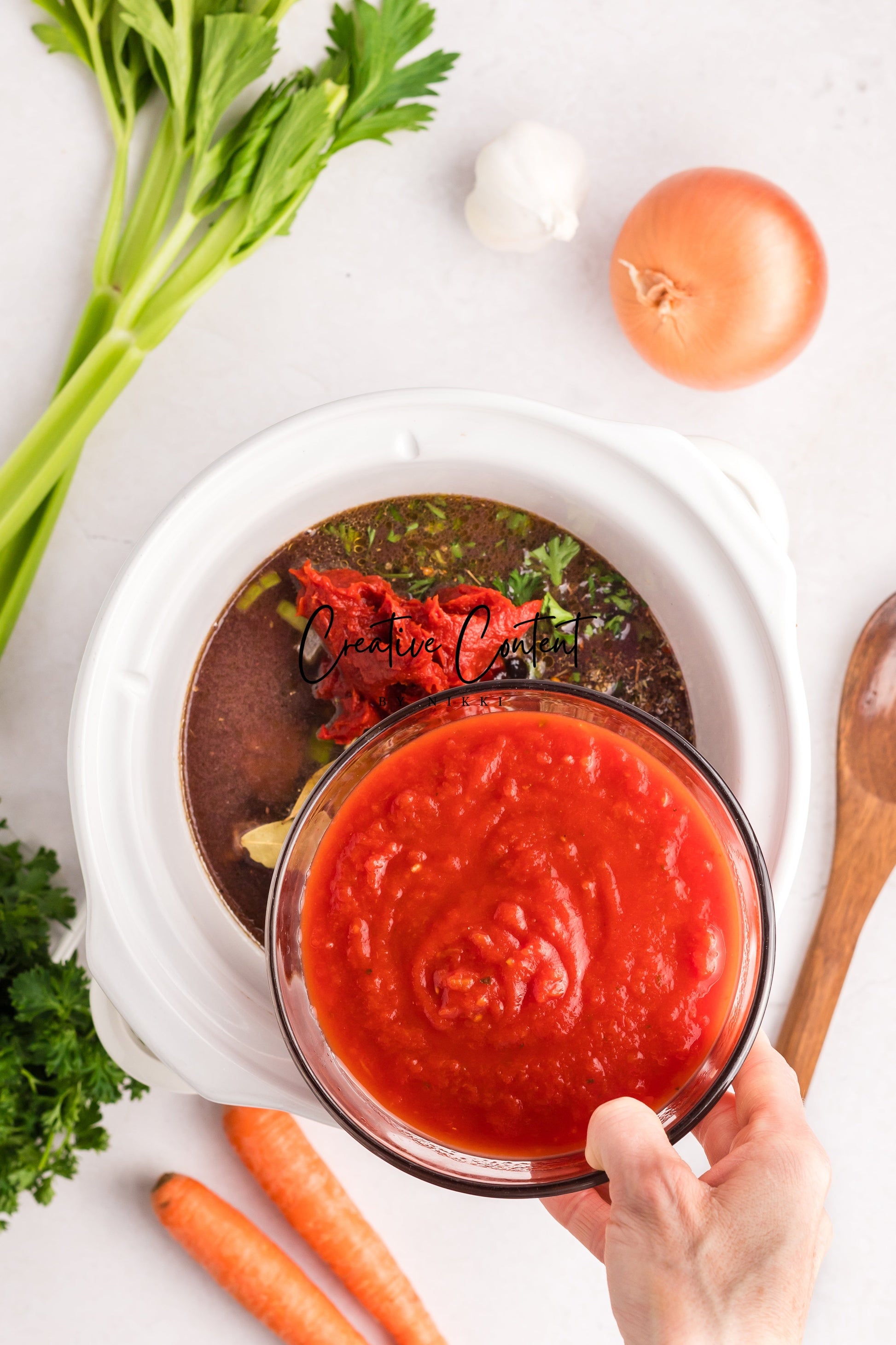 - Featured Ingredients; avocado oil, butter, yellow onion, carrots, celery, seasonings, beef chuck steak, crushed tomatoes, beef stock, water, red wine, tomato pasta, better than bouillon, dried thyme, honey, red pepper flakes, bay leaves, pasta, and parmesan cheese.