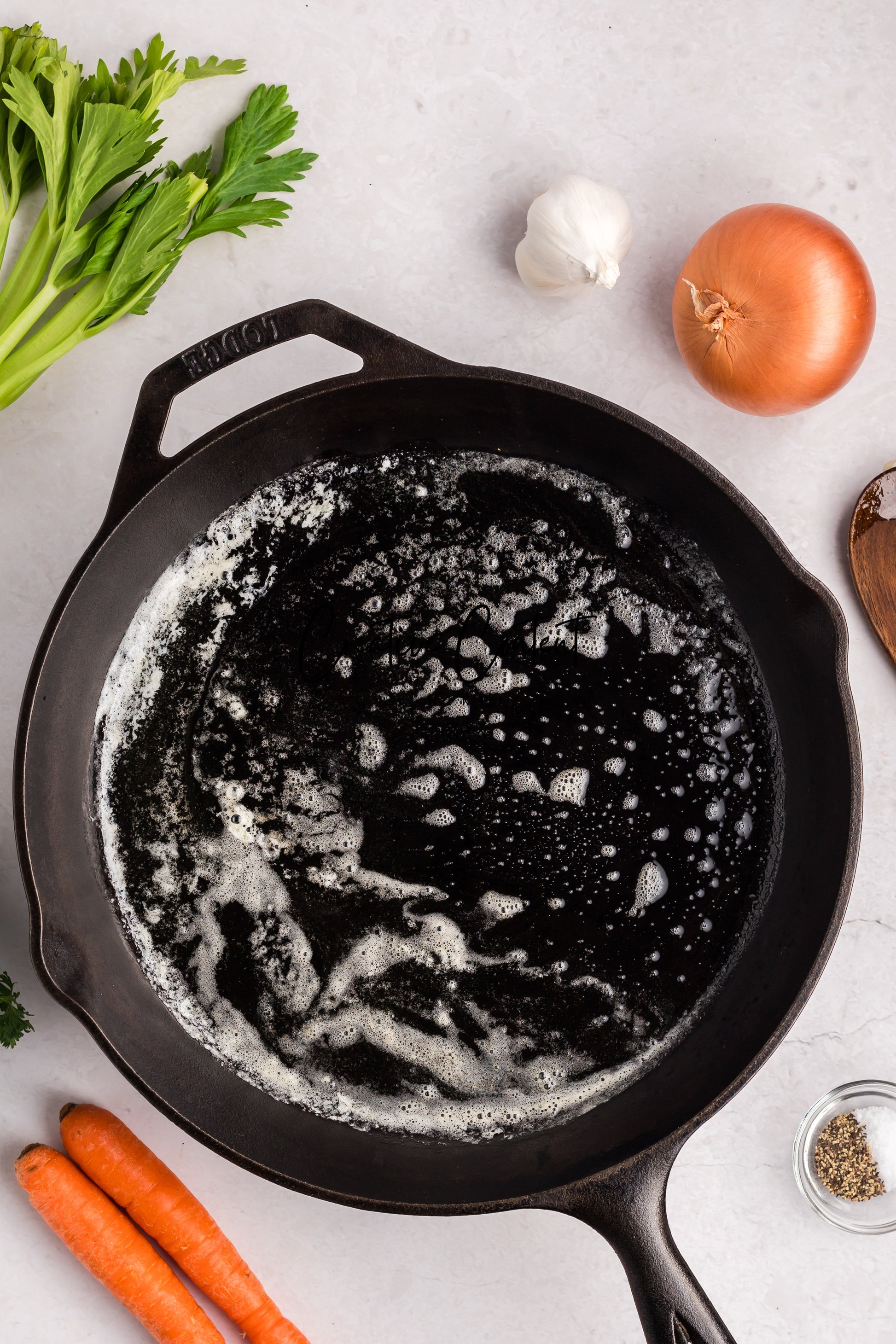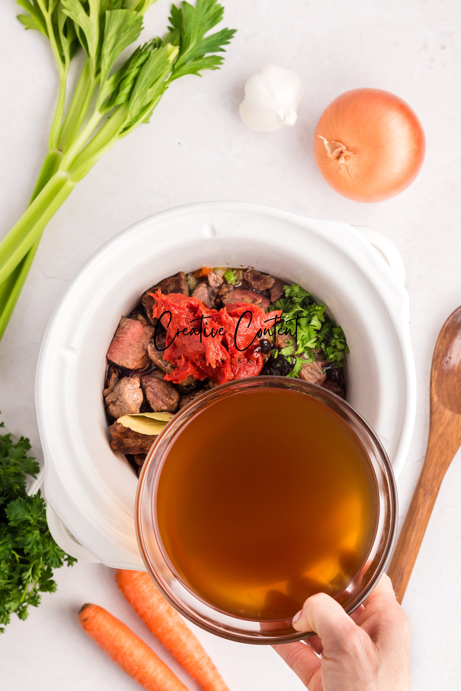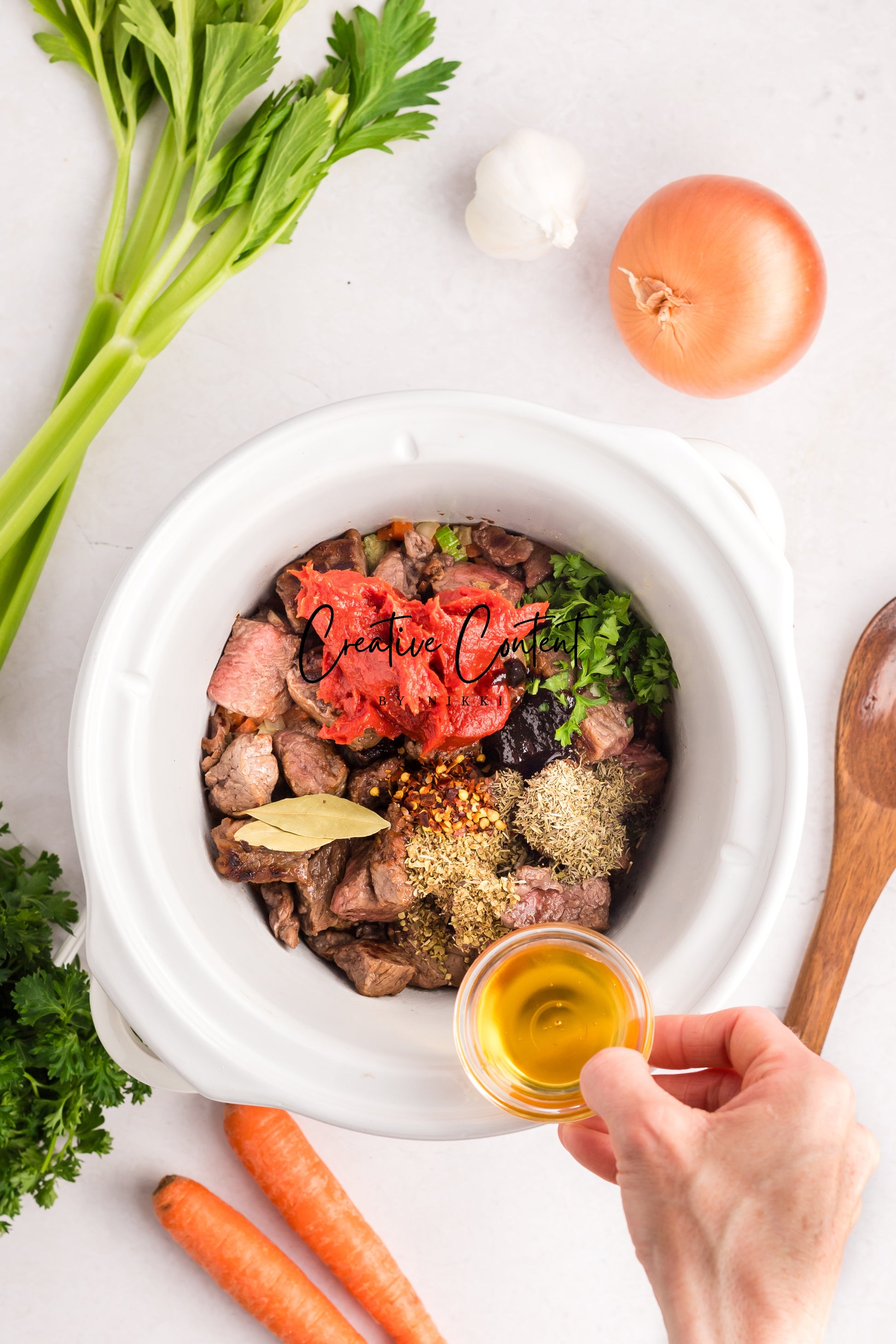 - Featured Ingredients; avocado oil, butter, yellow onion, carrots, celery, seasonings, beef chuck steak, crushed tomatoes, beef stock, water, red wine, tomato pasta, better than bouillon, dried thyme, honey, red pepper flakes, bay leaves, pasta, and parmesan cheese.