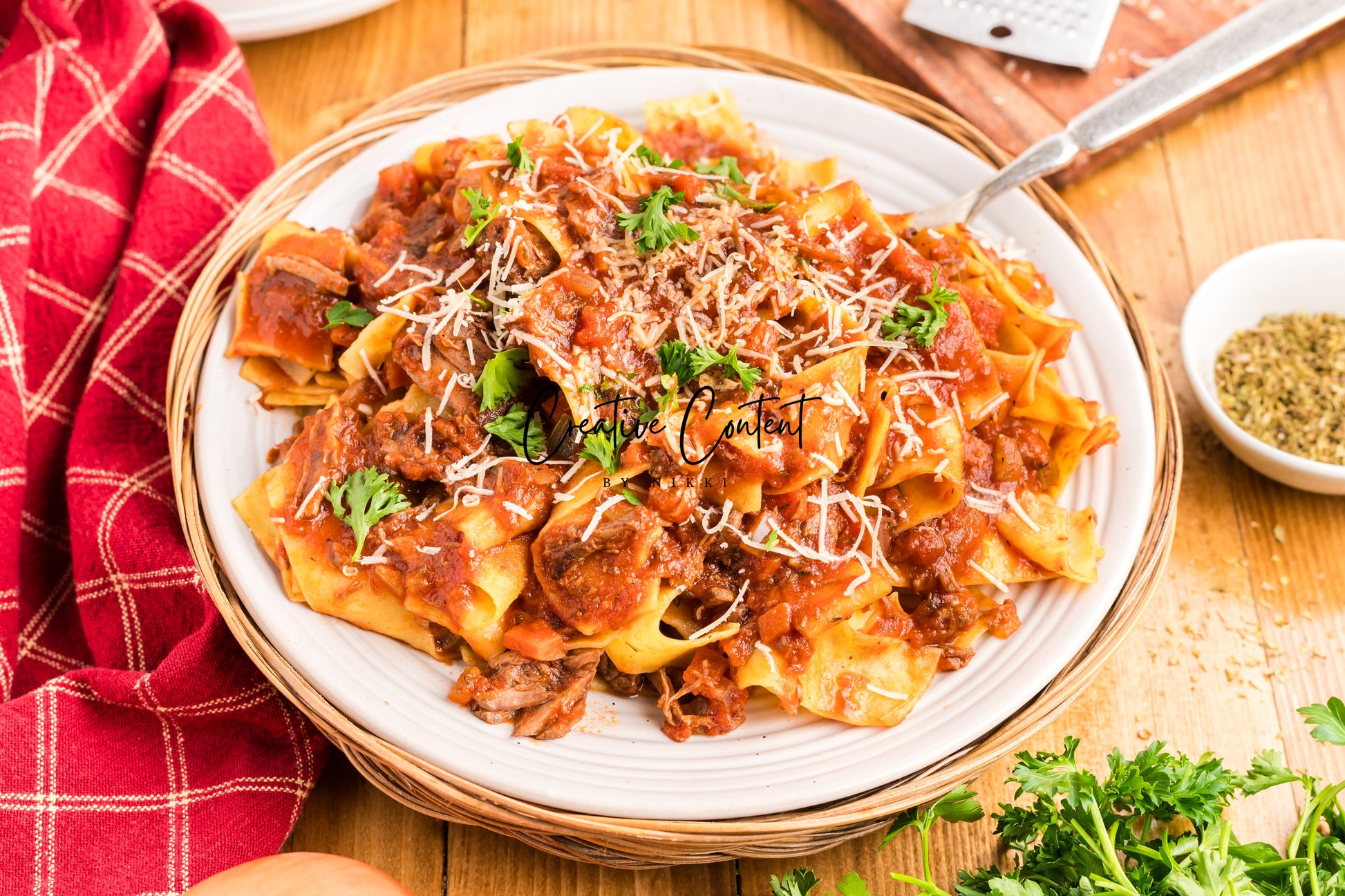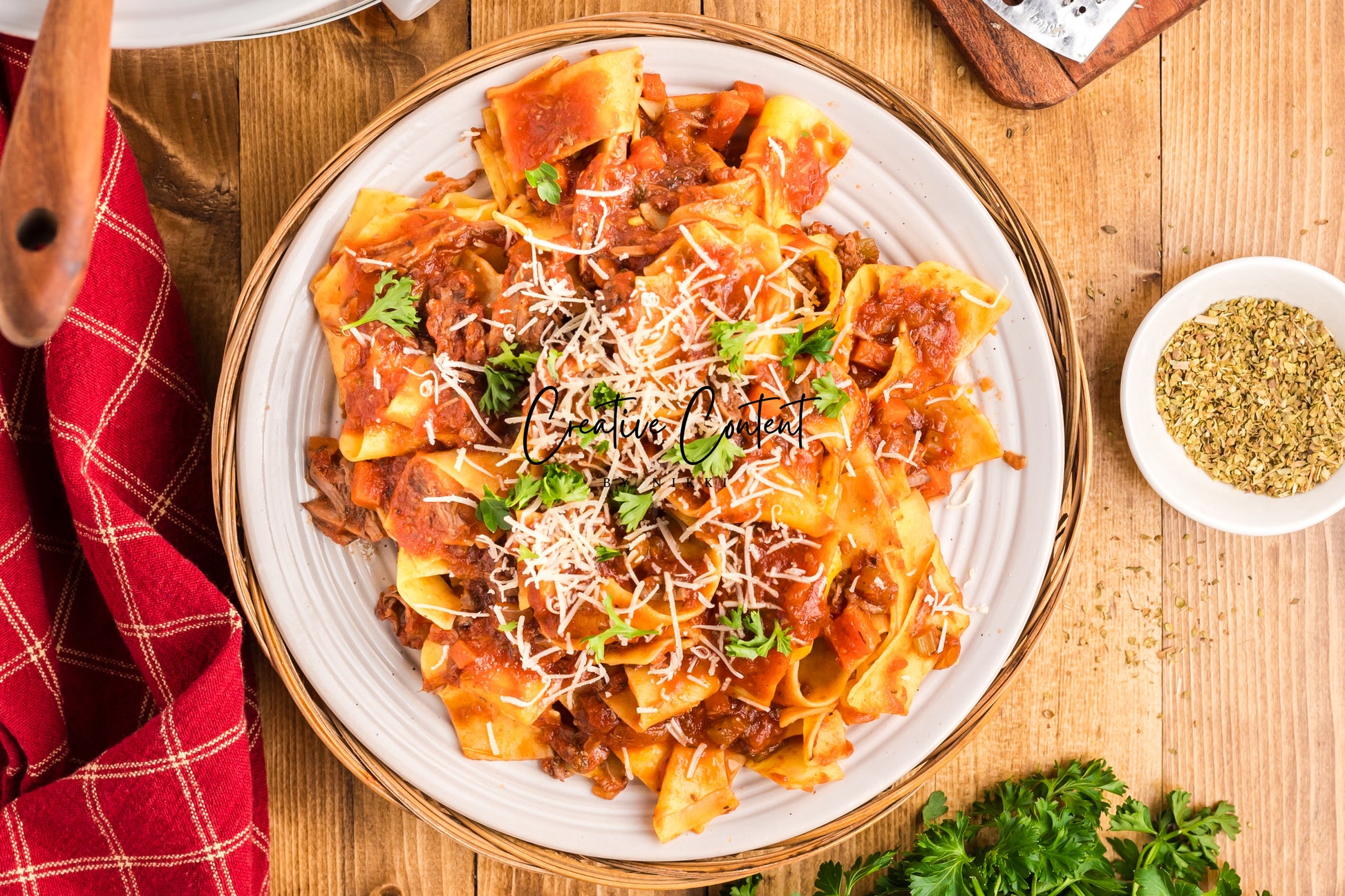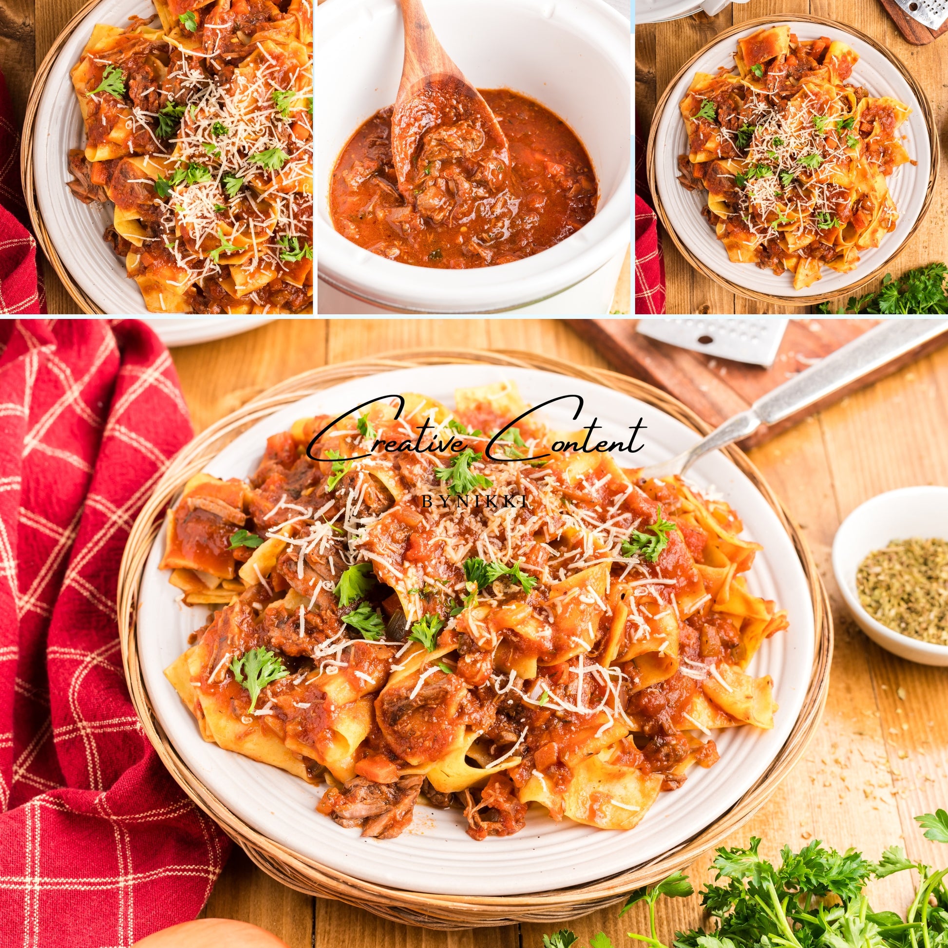 This crockpot beef ragu is beyond delicious. It takes pasta night to the next level. The fresh onions, carrots, celery, beef chuck steak, red wine, and dried thyme come together to create a delicious recipe everyone will love. This is a great dish to serve a crowd.