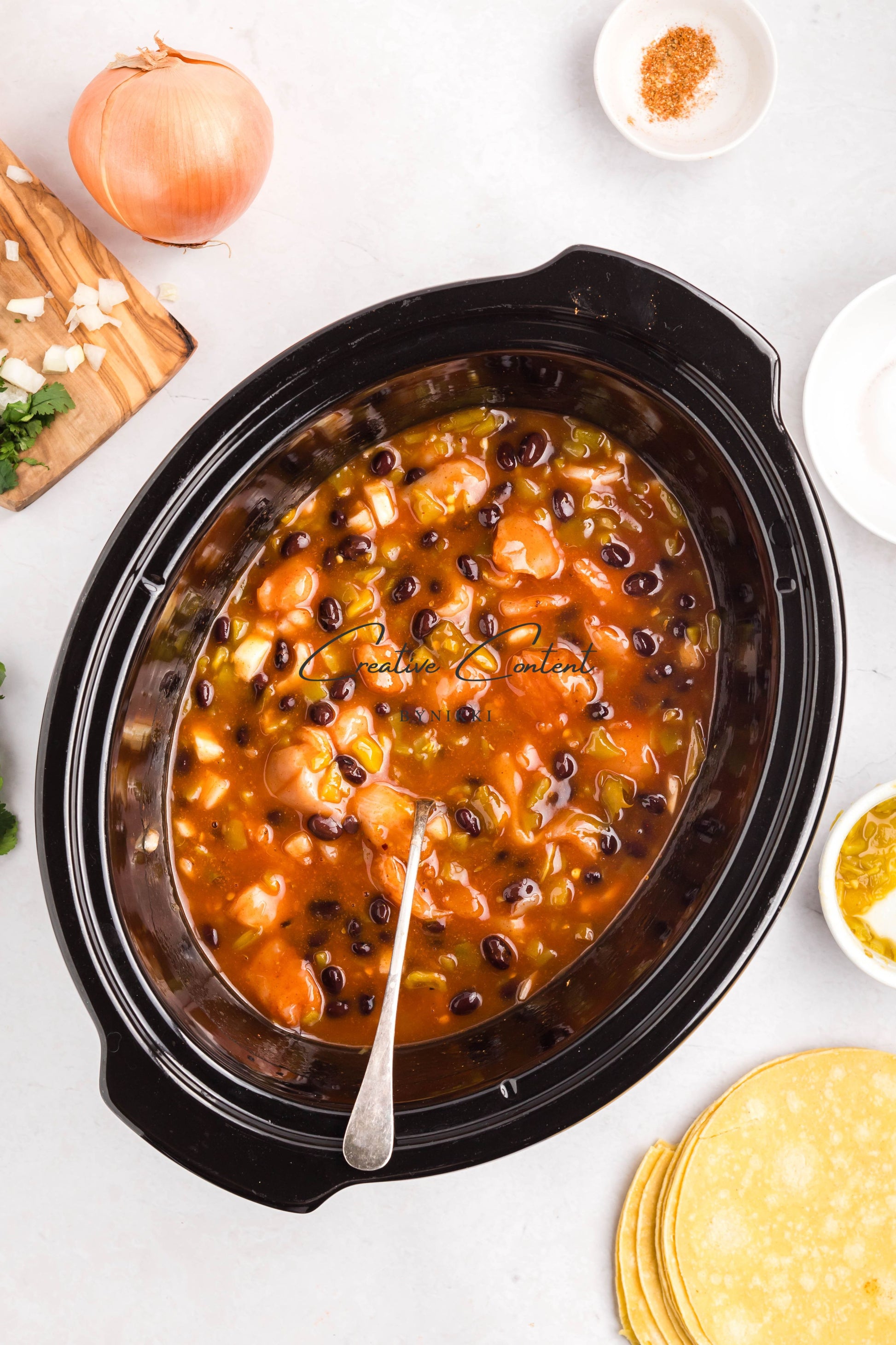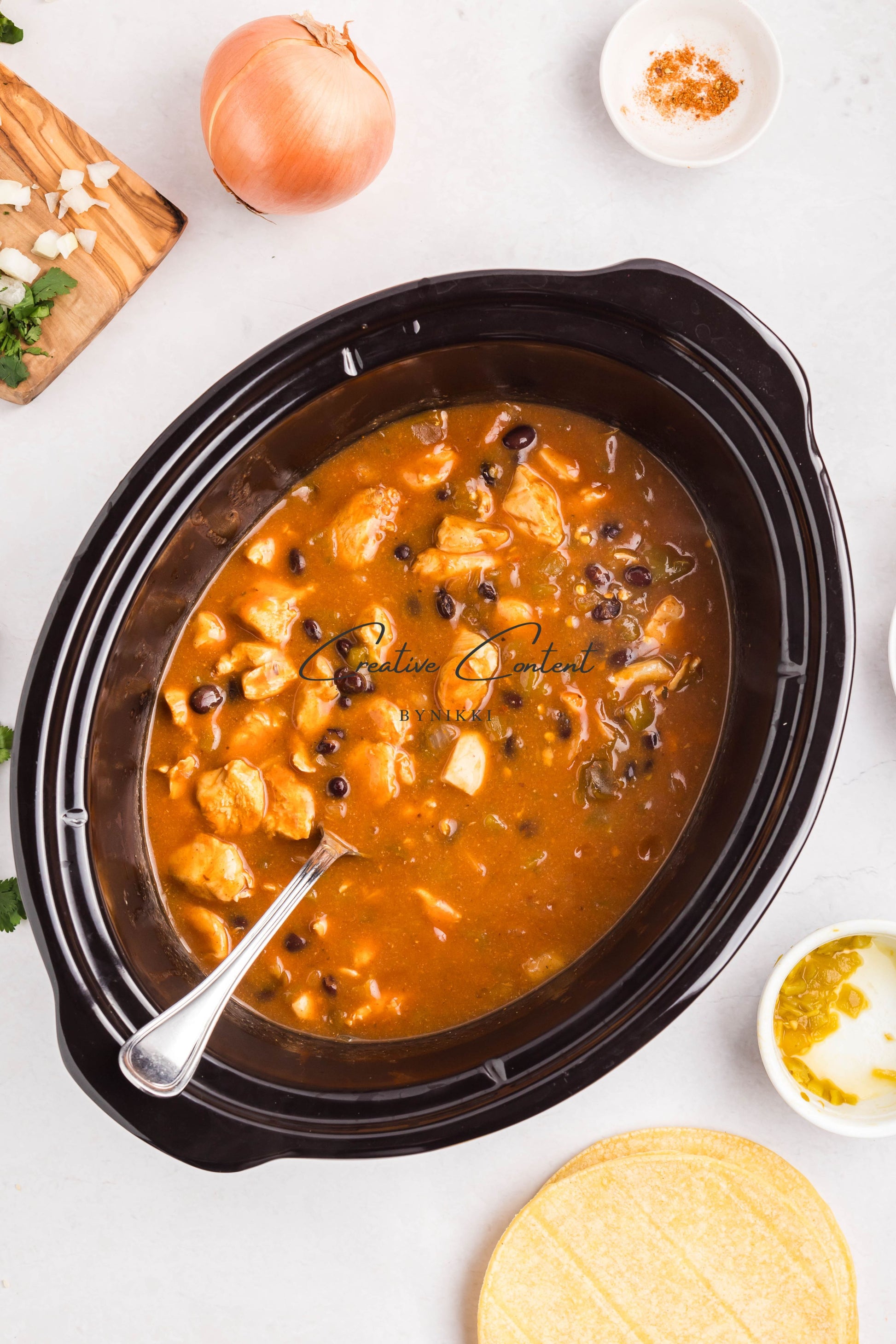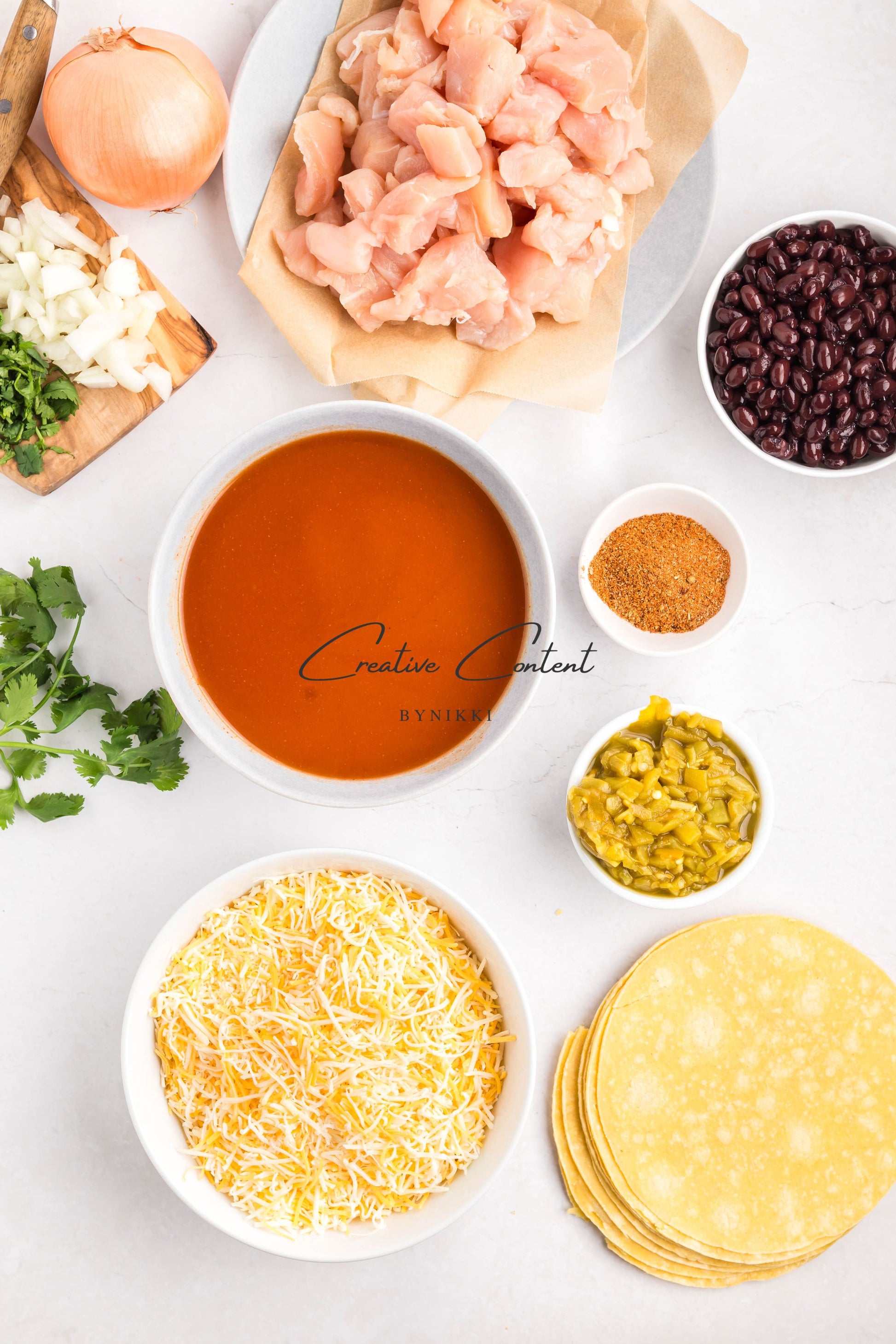 - Ingredients: chicken, taco seasoning, enchilada sauce, green chiles, black beans, yellow onion, Mexican cheese, corn tortilla shells