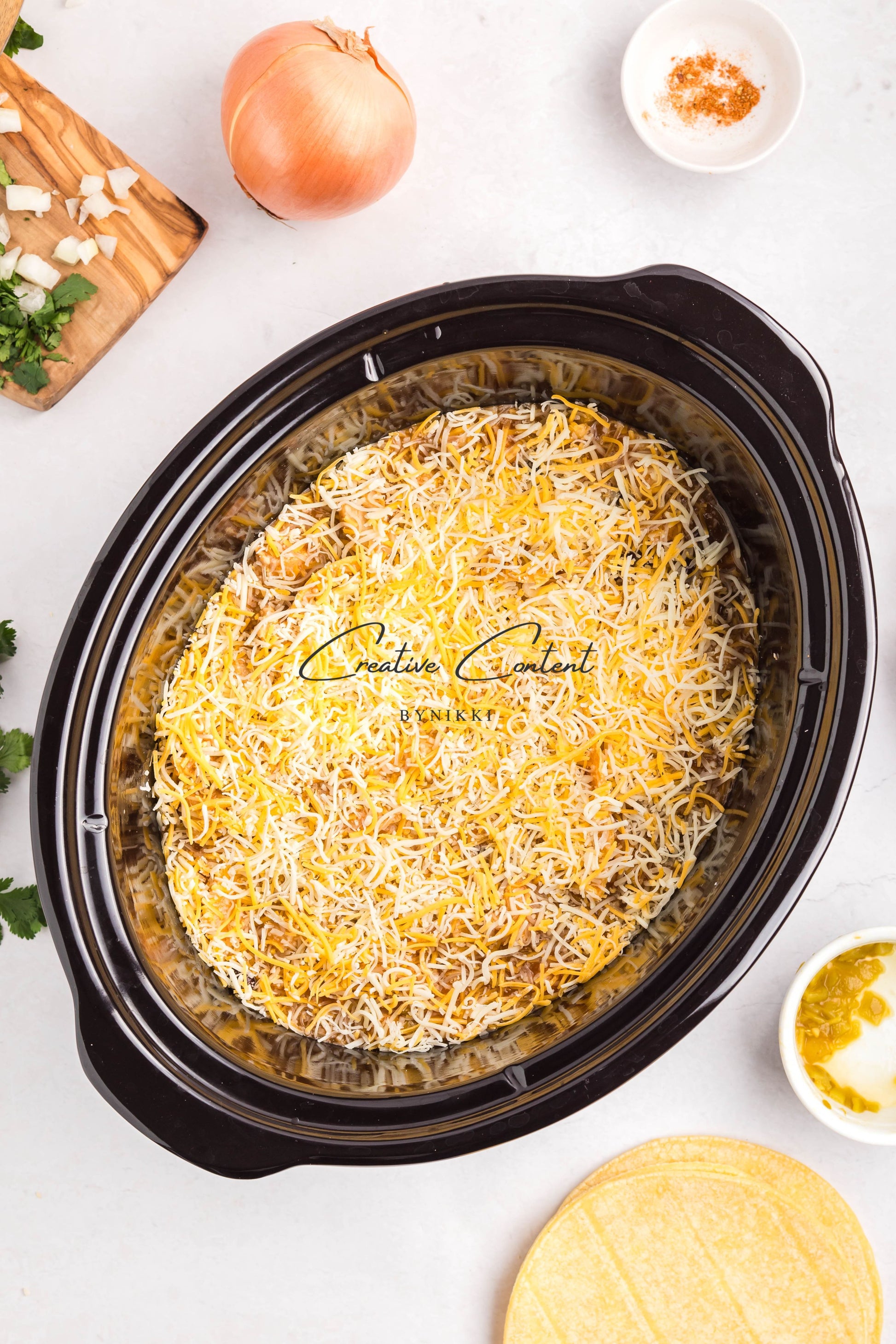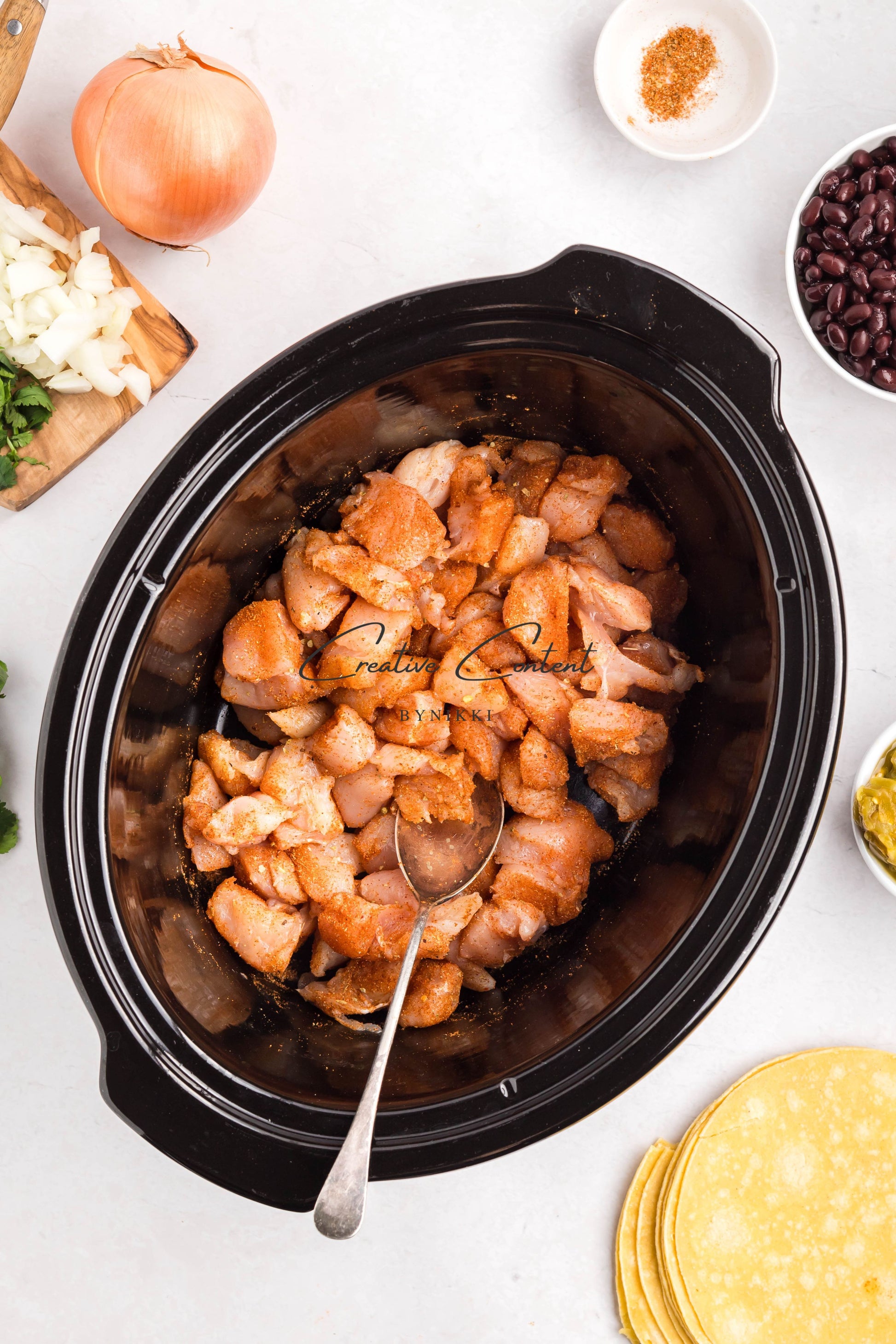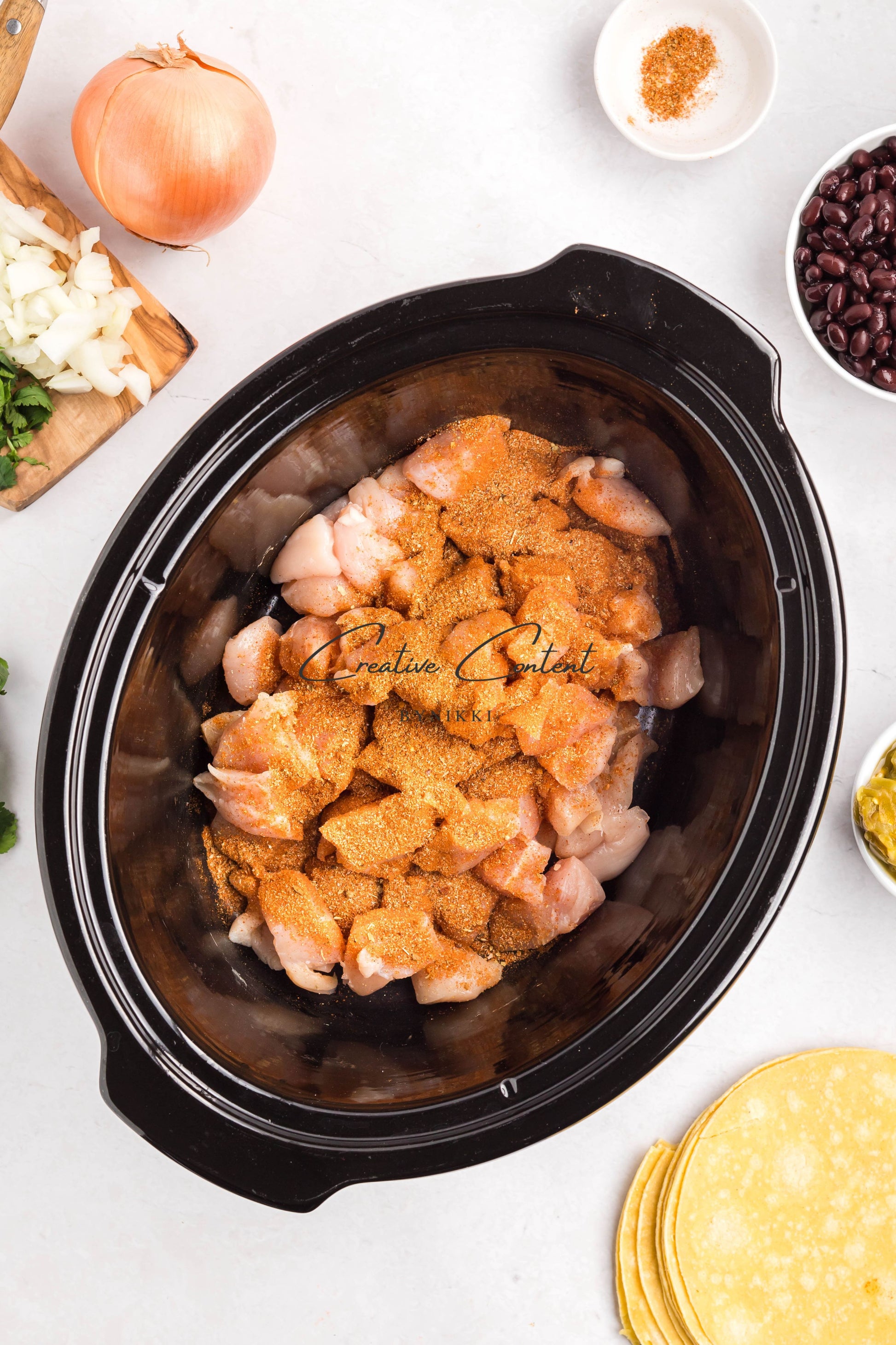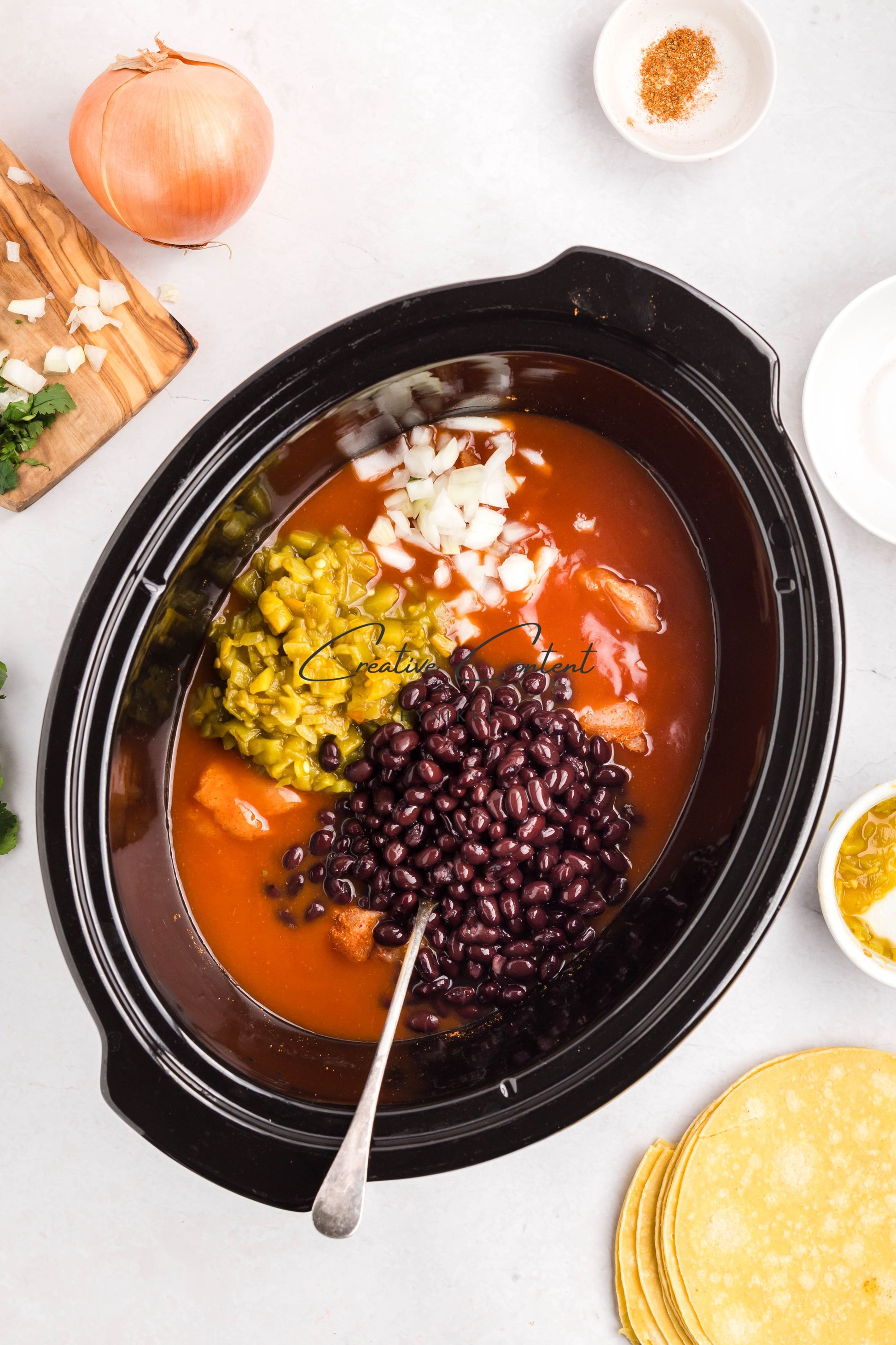 - Ingredients: chicken, taco seasoning, enchilada sauce, green chiles, black beans, yellow onion, Mexican cheese, corn tortilla shells