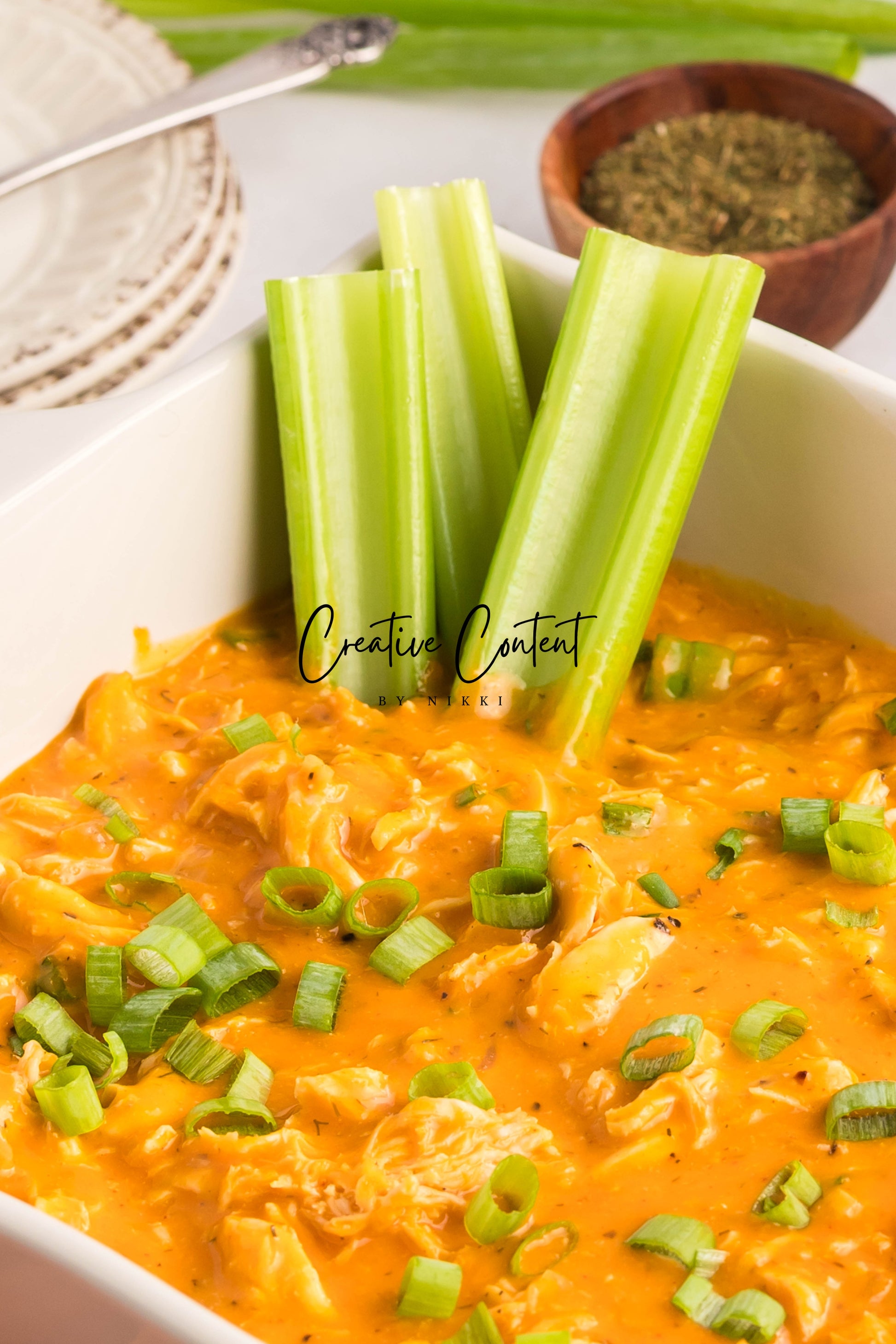 Featured Ingredients: chopped yellow onion, avocado oil, dairy-free cream cheese, mayonnaise, dairy-free ranch dressing, Frank’s Original Hot Sauce, garlic powder, onion pepper, black pepper, dried dill, paprika, cooked shredded chicken, dairy-free shredded cheddar cheese, and sliced green onion.