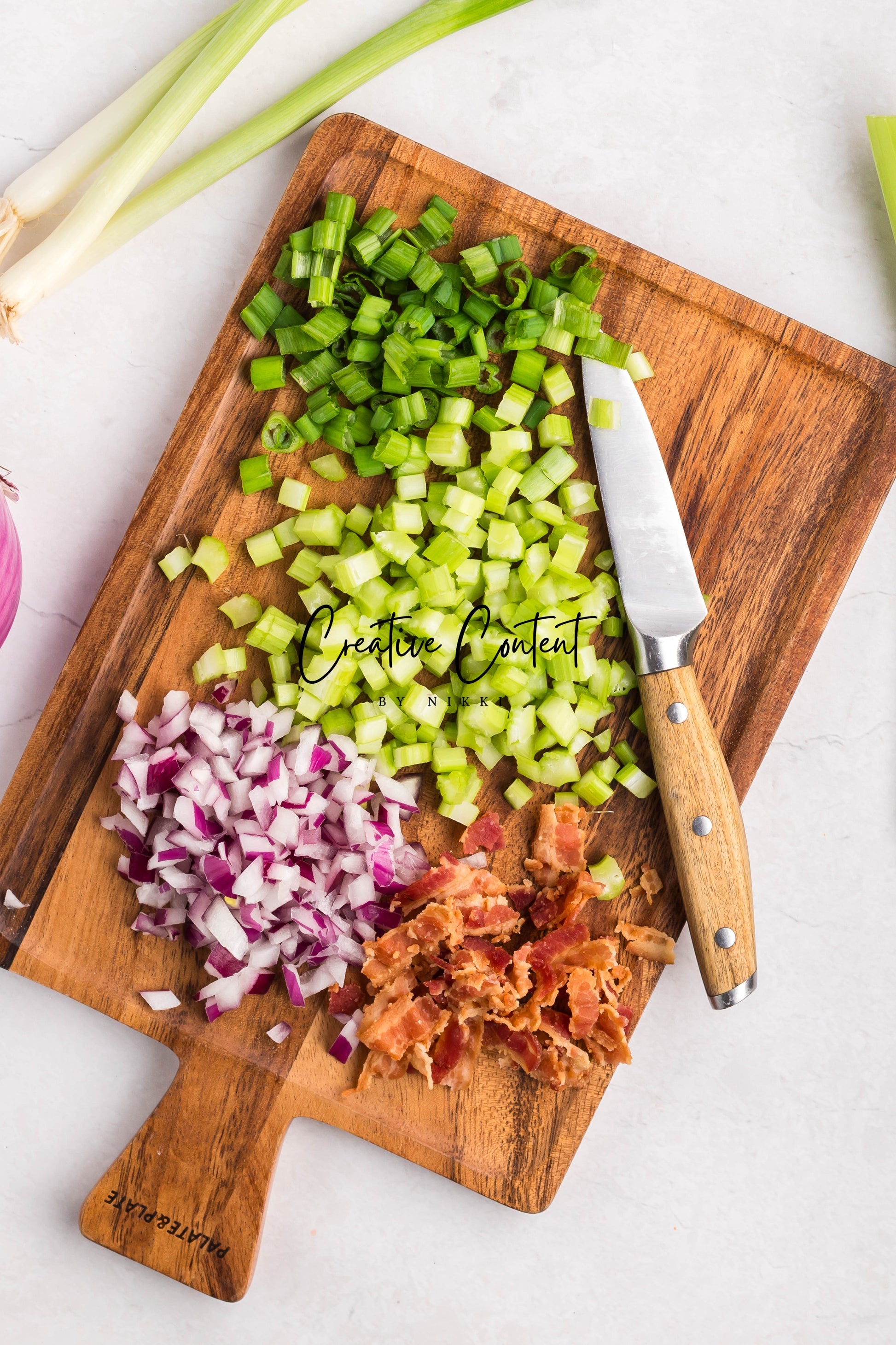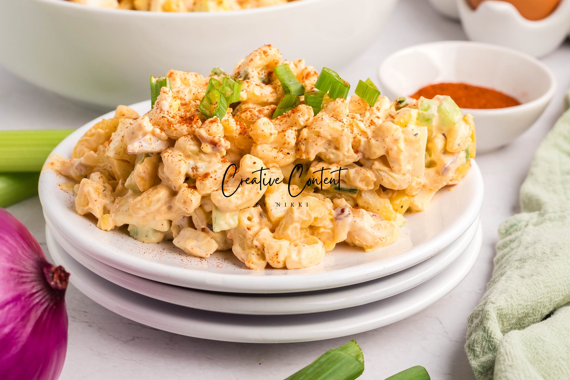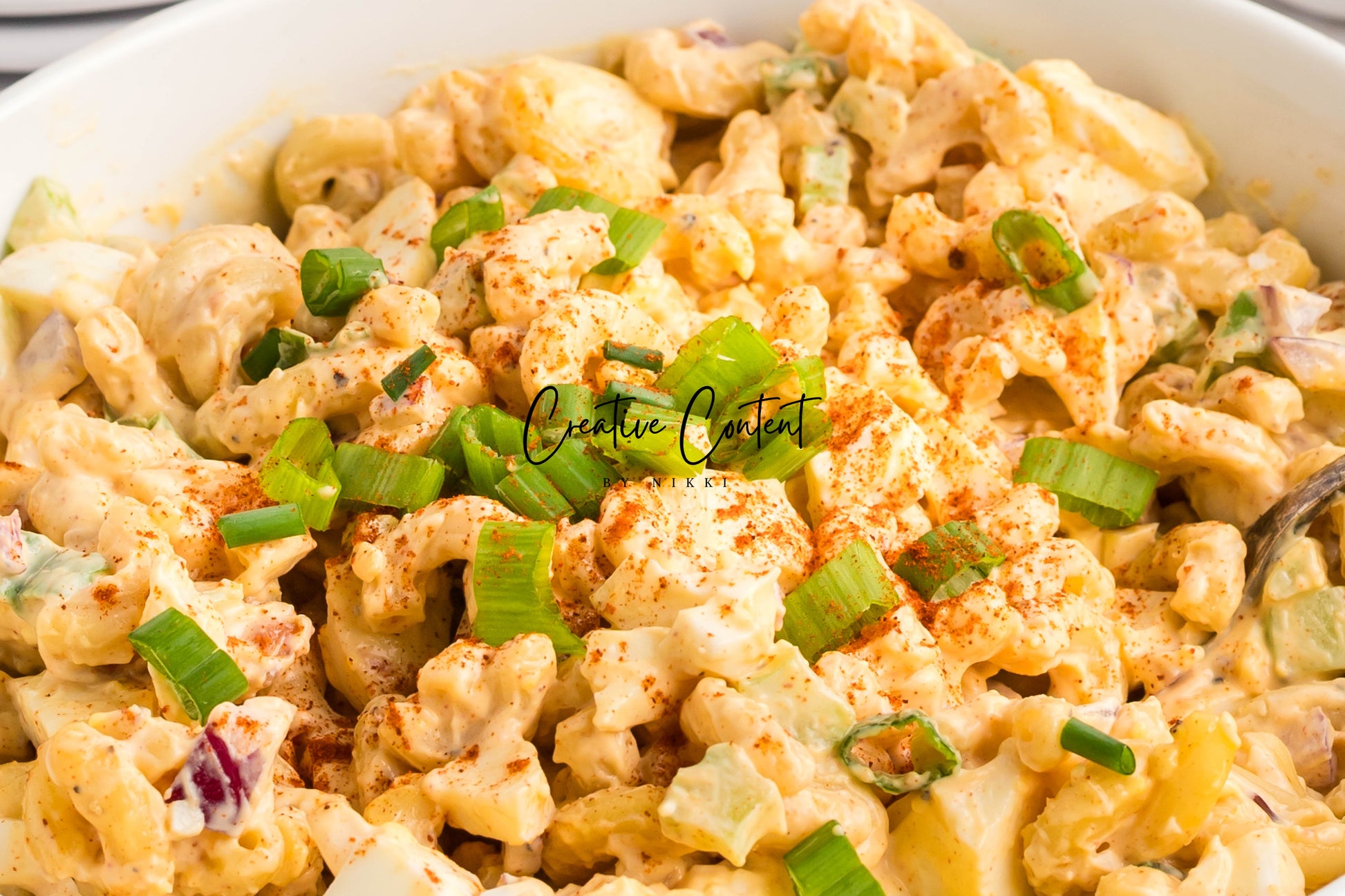- Ingredients: Eggs, macaroni pasta, mayonnaise, Dijon mustard, white wine vinegar, paprika, garlic powder, salt, pepper, cooked bacon, green onion, red onion, celery.