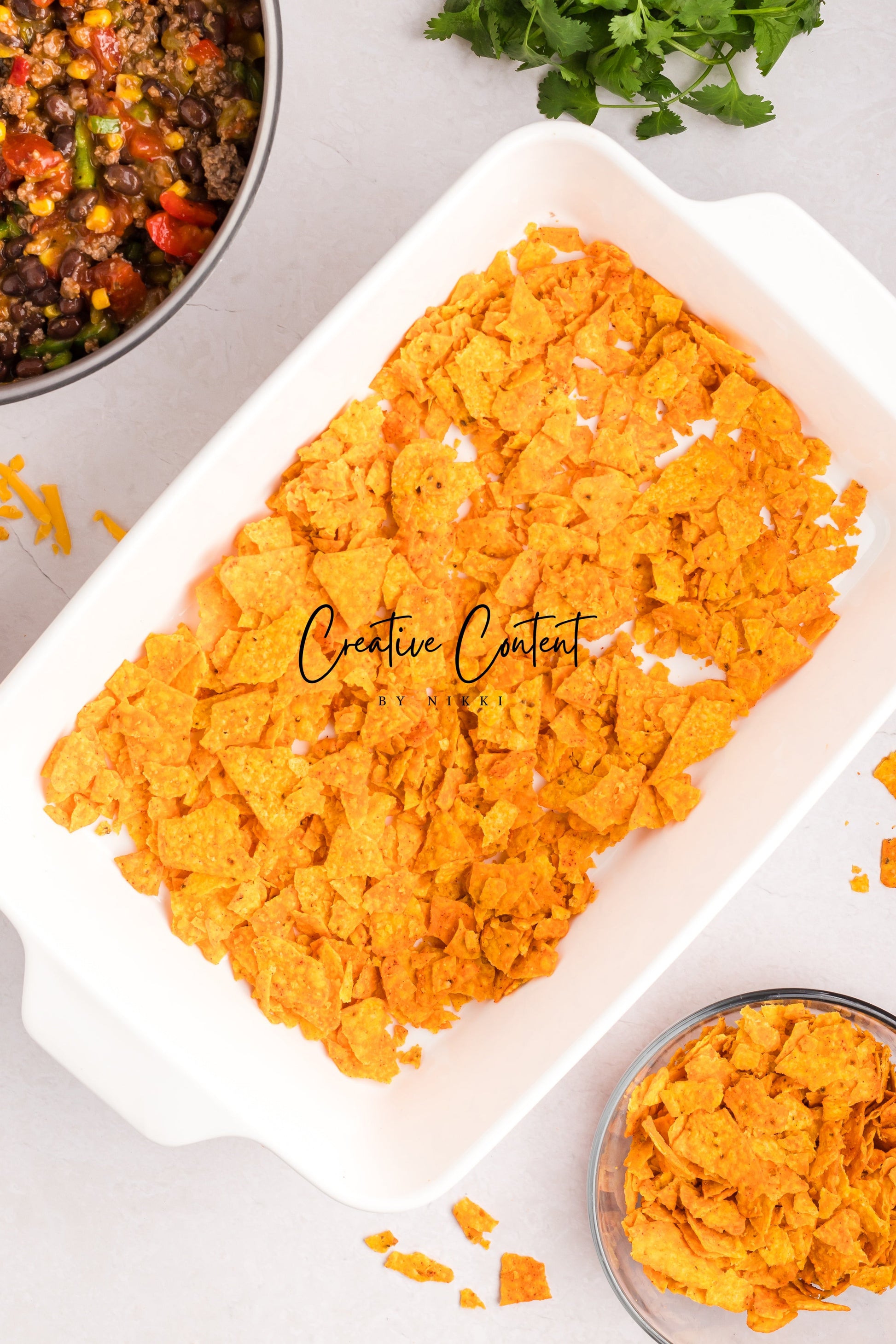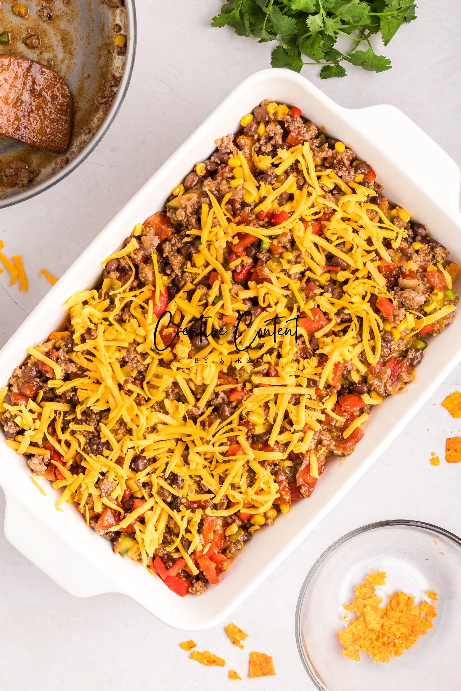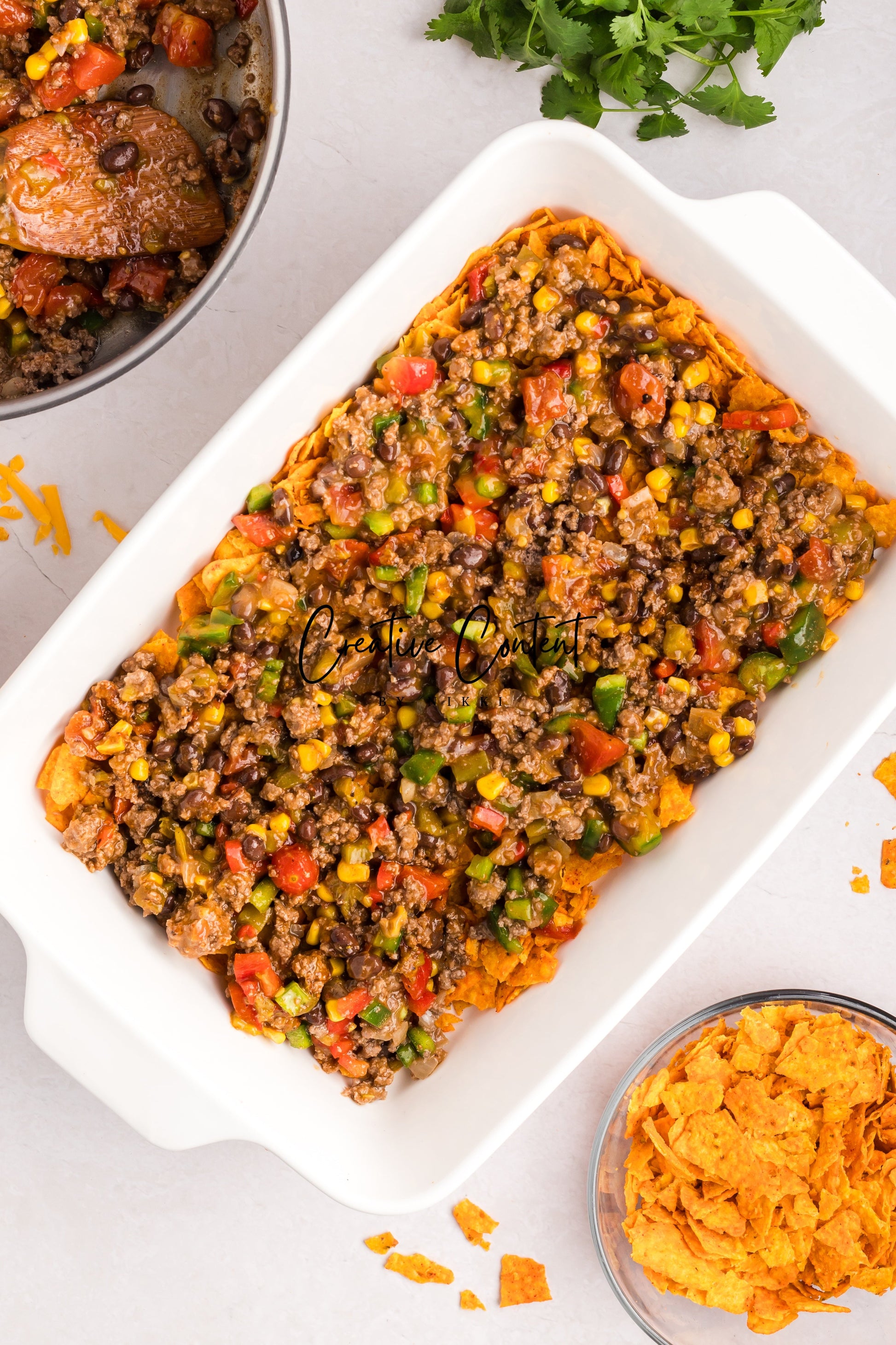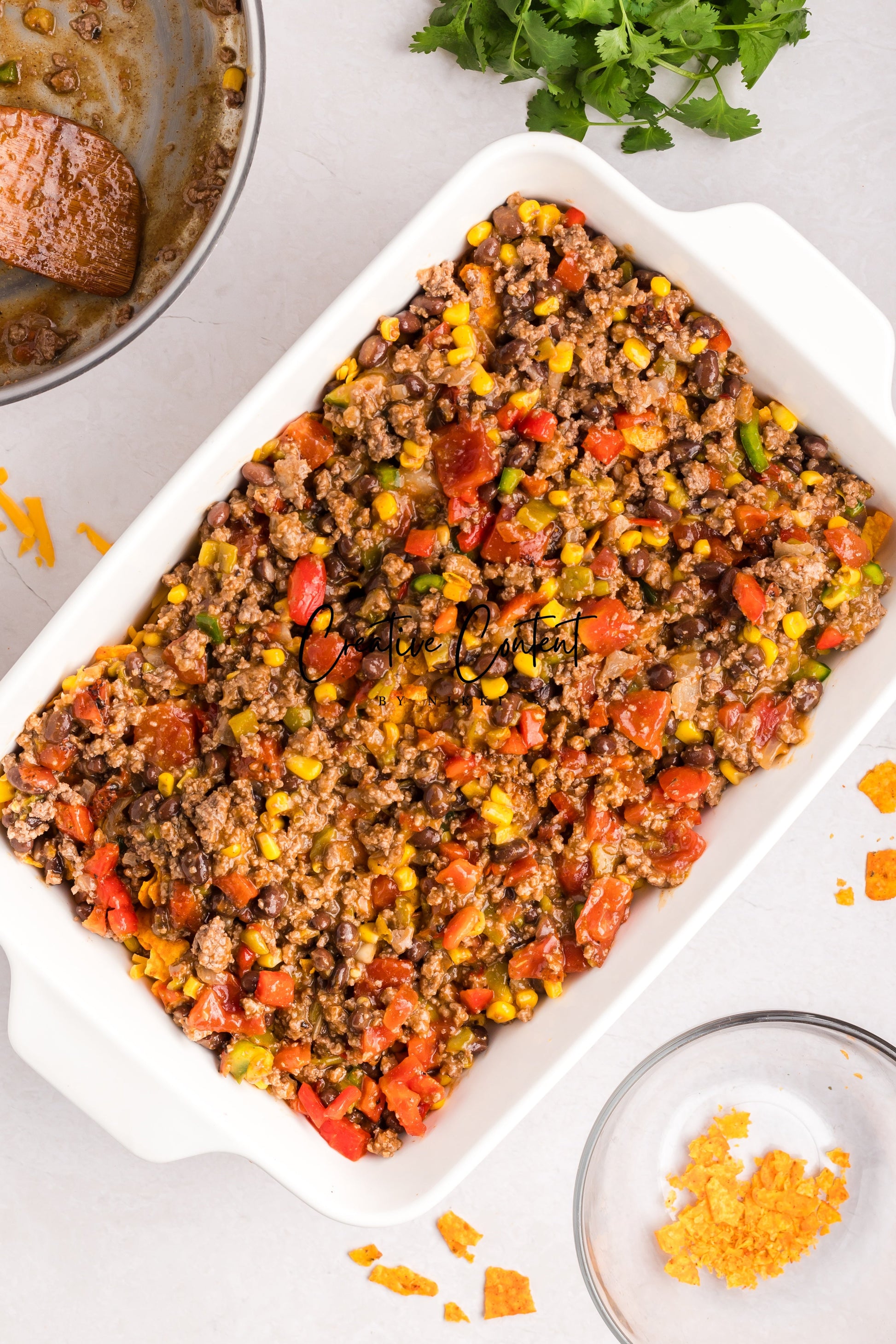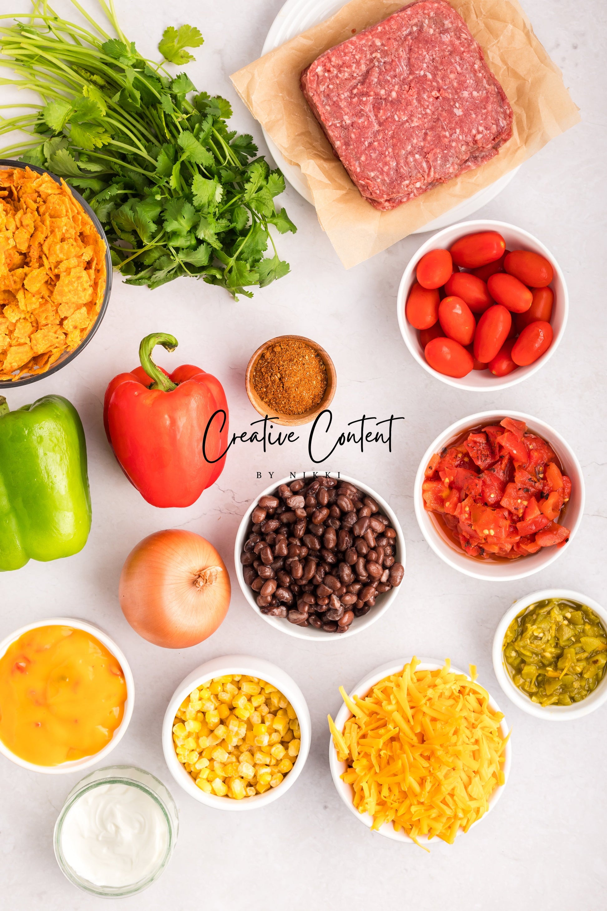- Featured Ingredients; ground beef, yellow onion, red bell pepper, green bell pepper, taco seasoning, black beans, diced tomatoes, nacho cheese soup, corn, green chiles, Doritos, cheddar cheese, tomatoes, sour cream, and green onions.