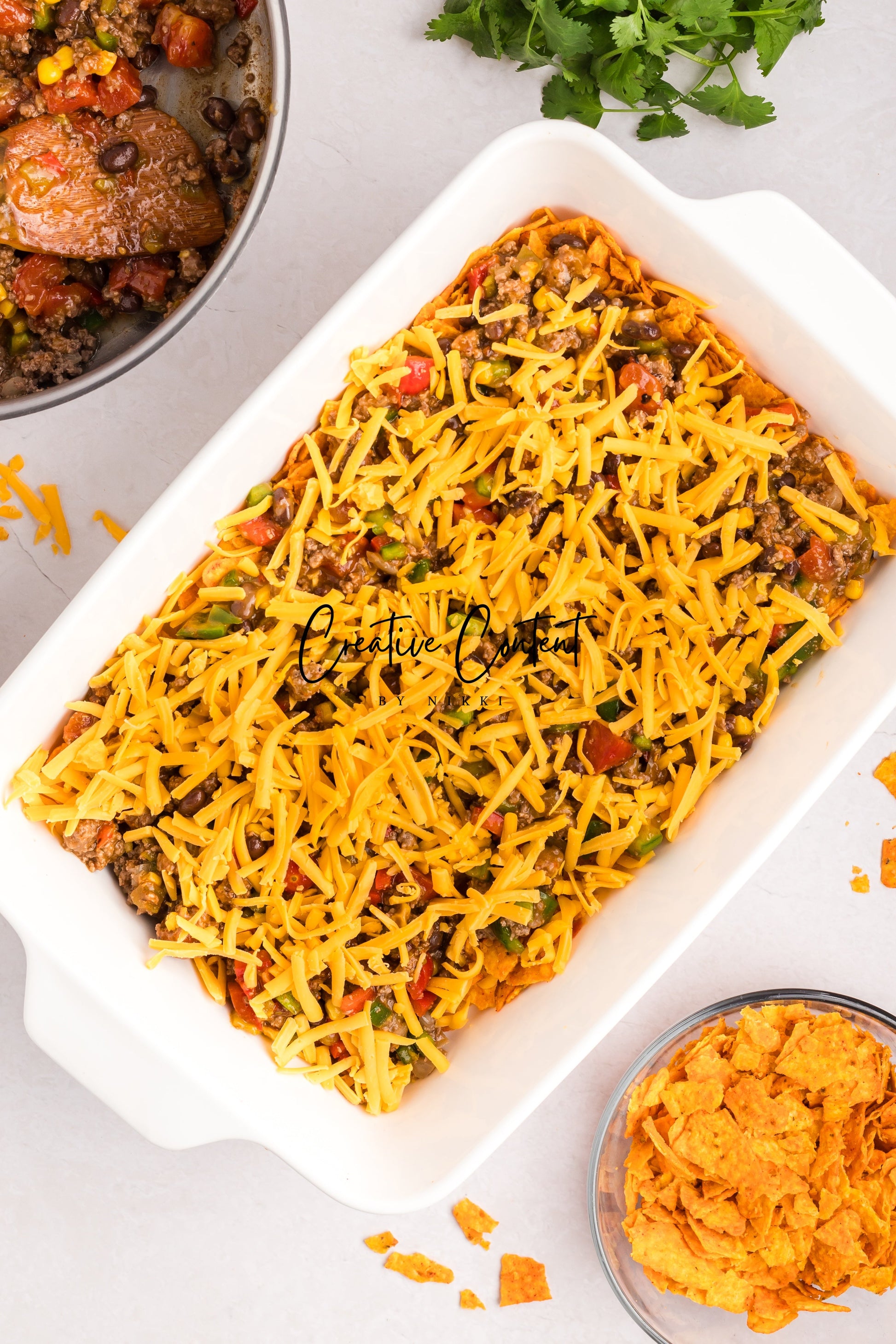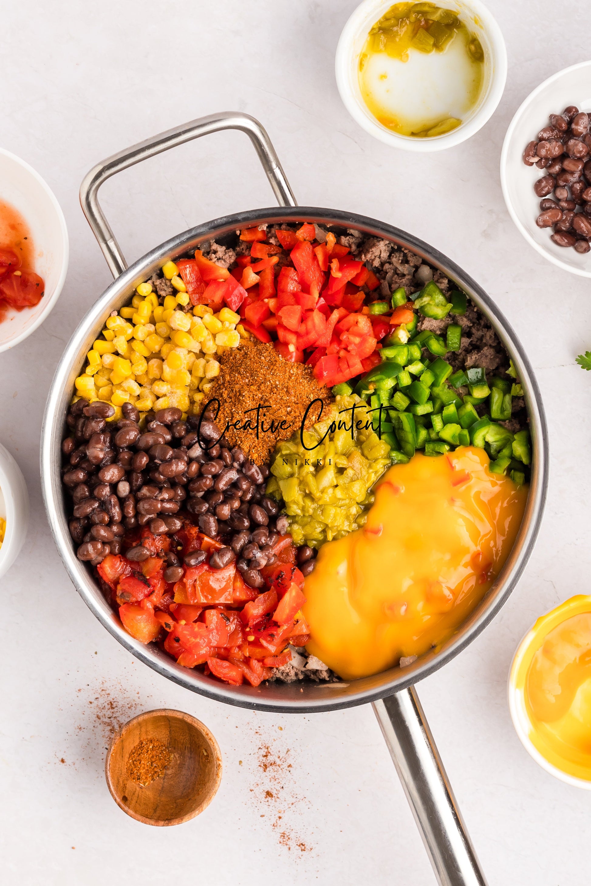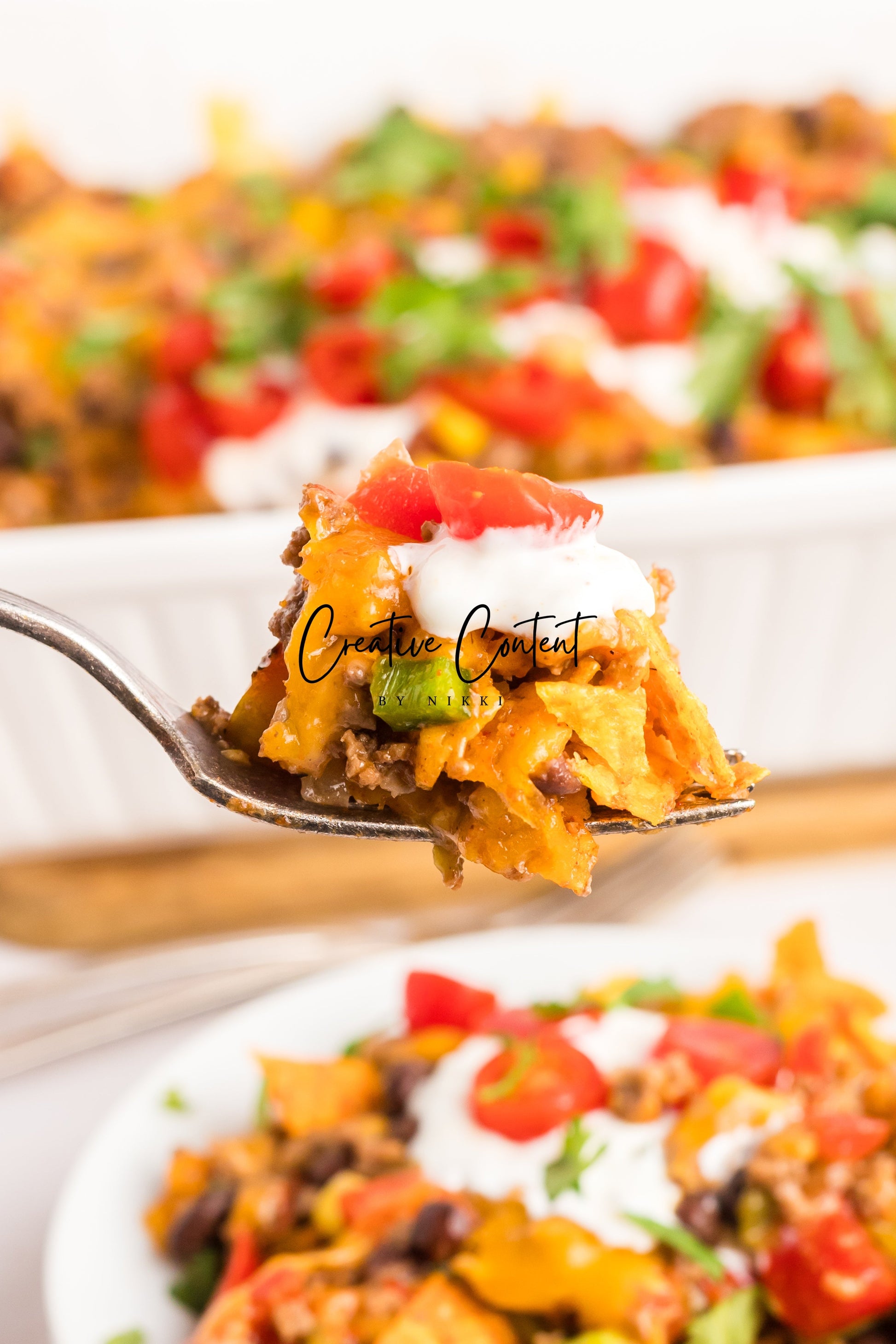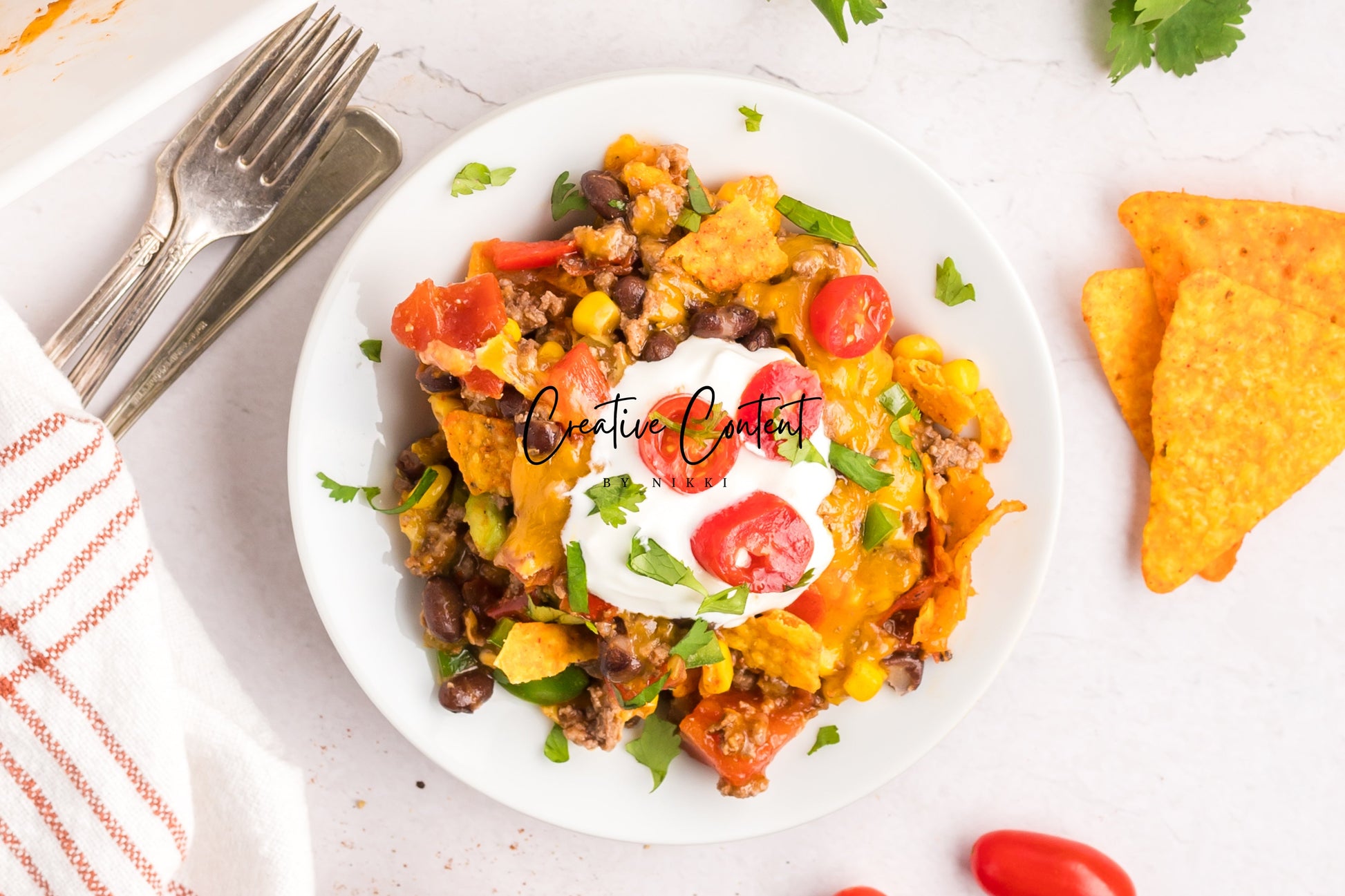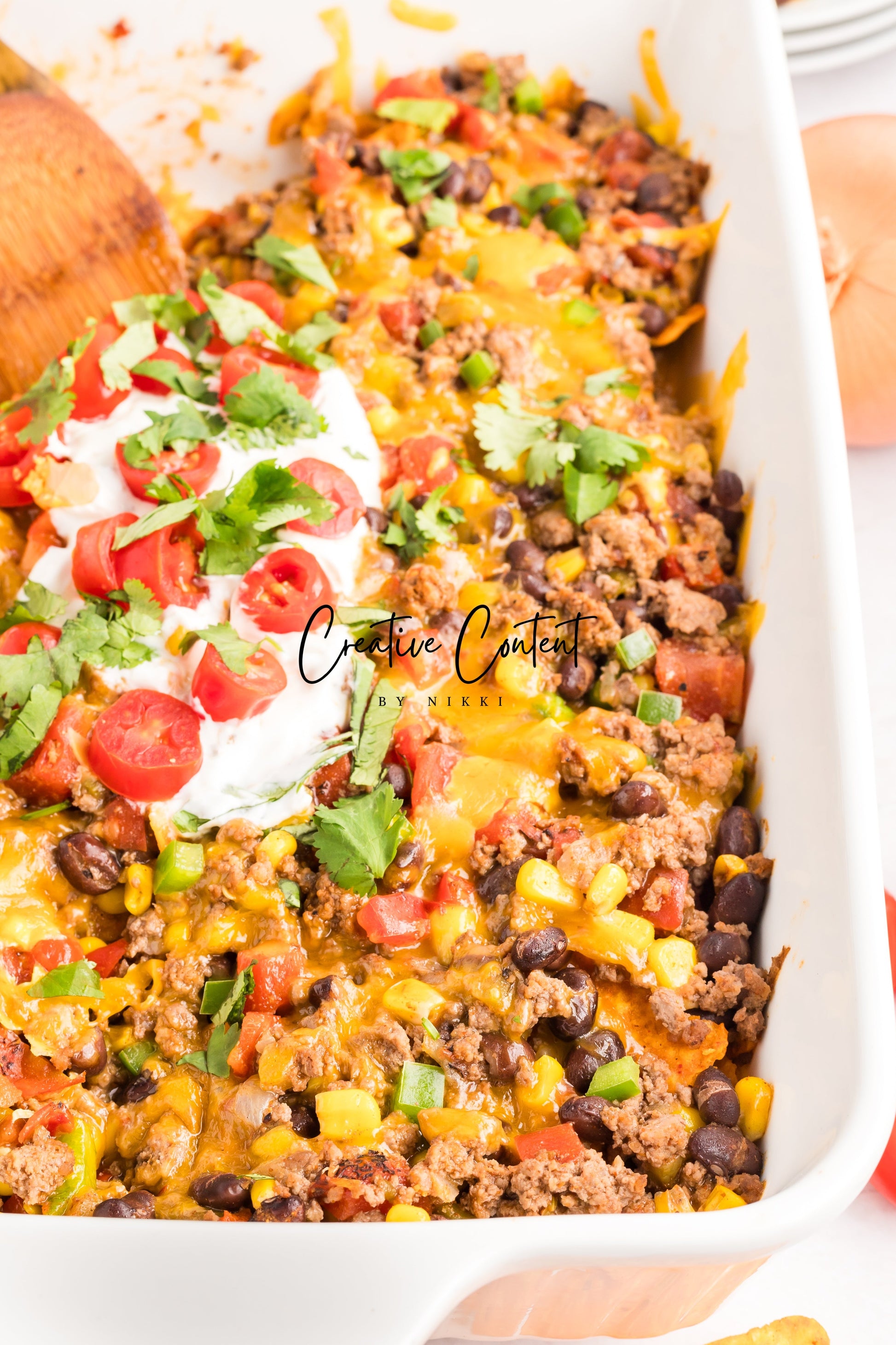 - Featured Ingredients; ground beef, yellow onion, red bell pepper, green bell pepper, taco seasoning, black beans, diced tomatoes, nacho cheese soup, corn, green chiles, Doritos, cheddar cheese, tomatoes, sour cream, and green onions.