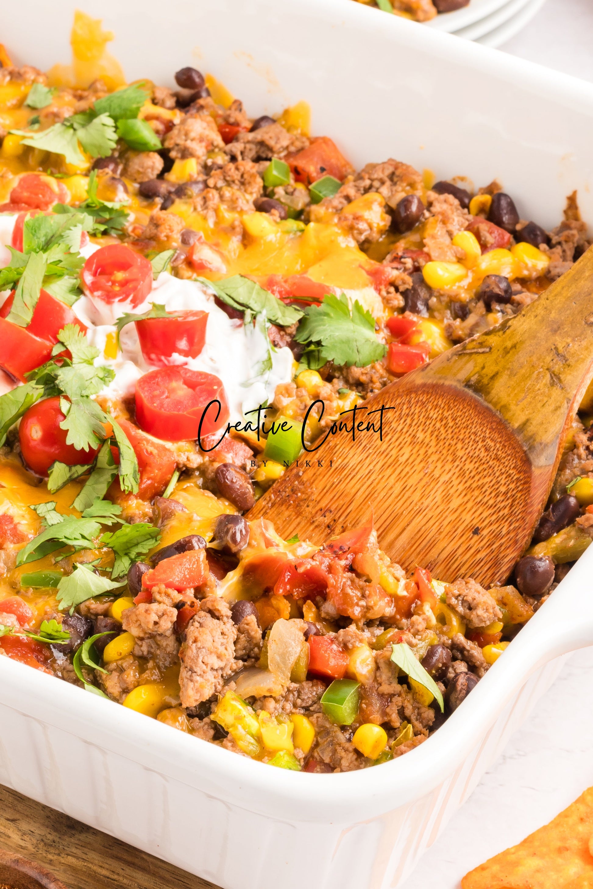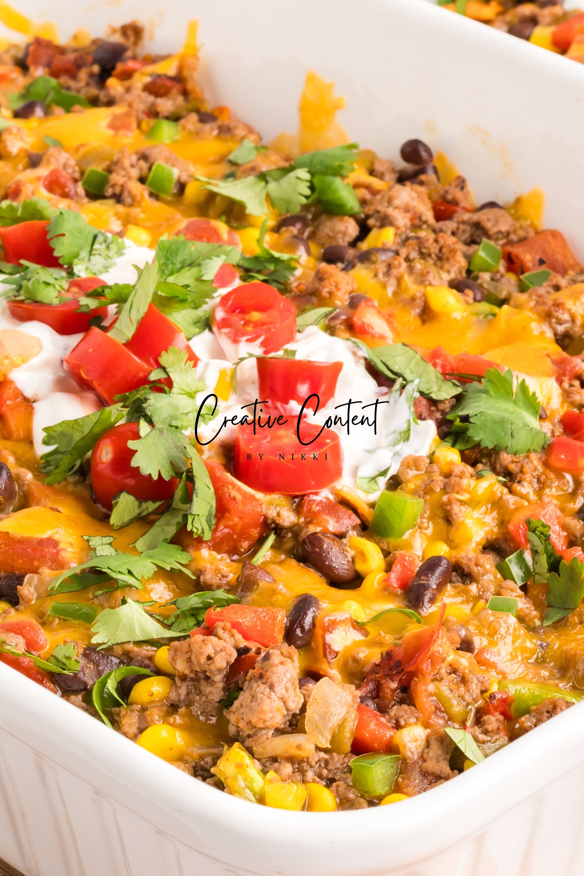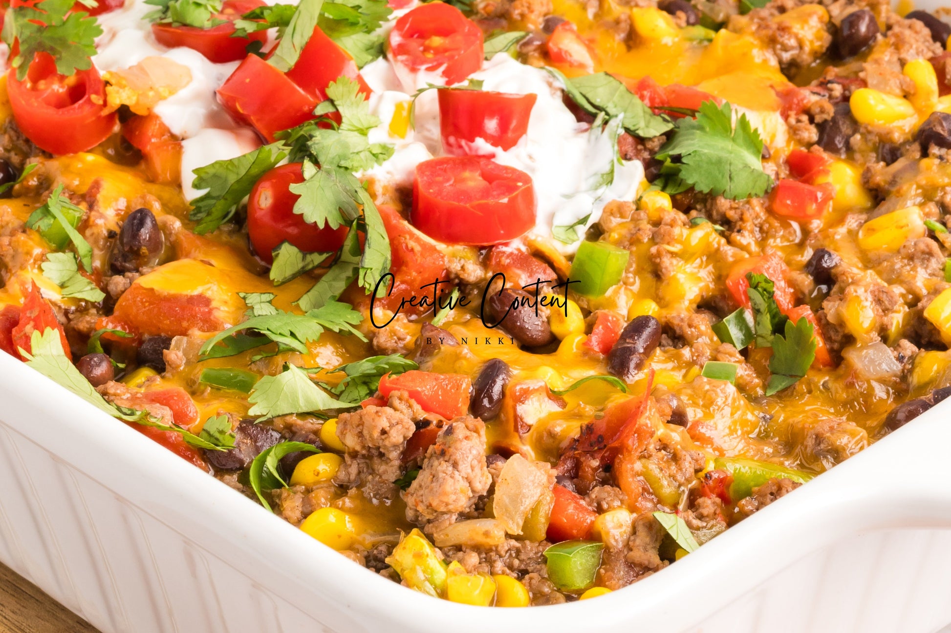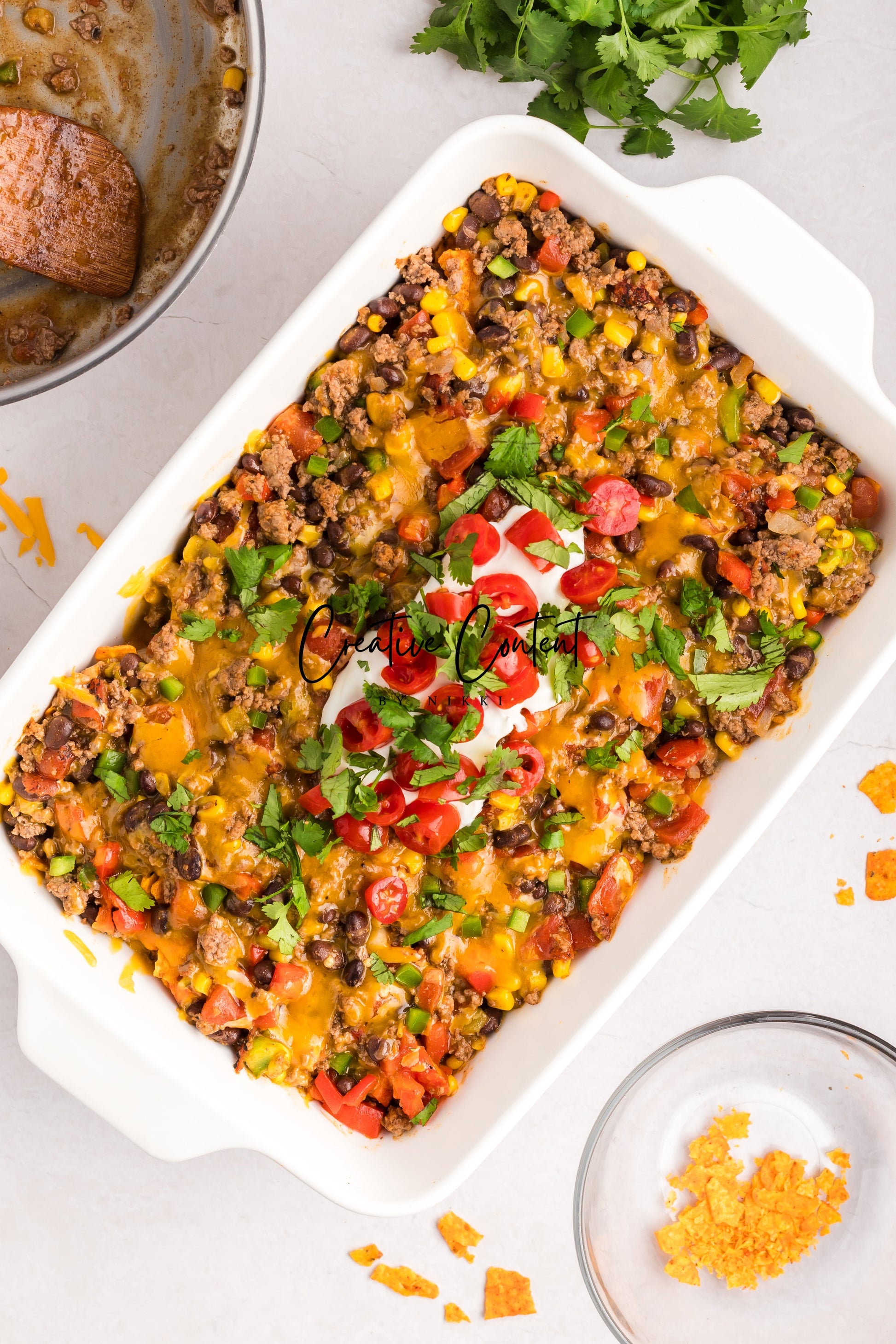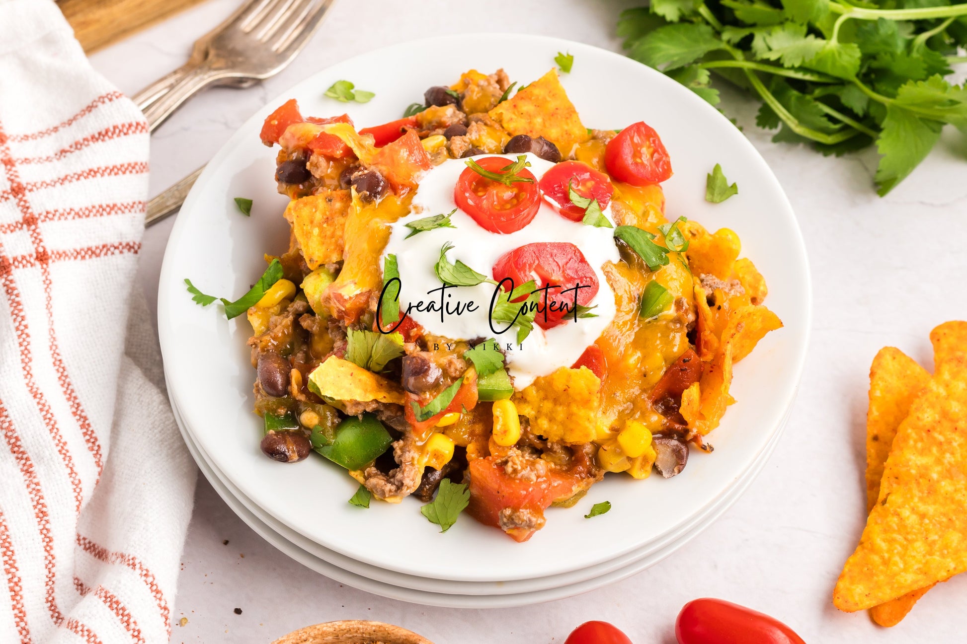 - Featured Ingredients; ground beef, yellow onion, red bell pepper, green bell pepper, taco seasoning, black beans, diced tomatoes, nacho cheese soup, corn, green chiles, Doritos, cheddar cheese, tomatoes, sour cream, and green onions.