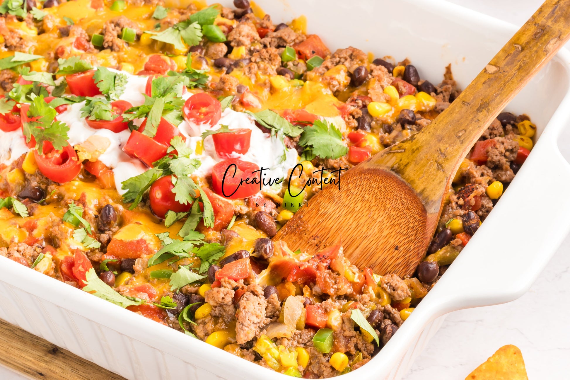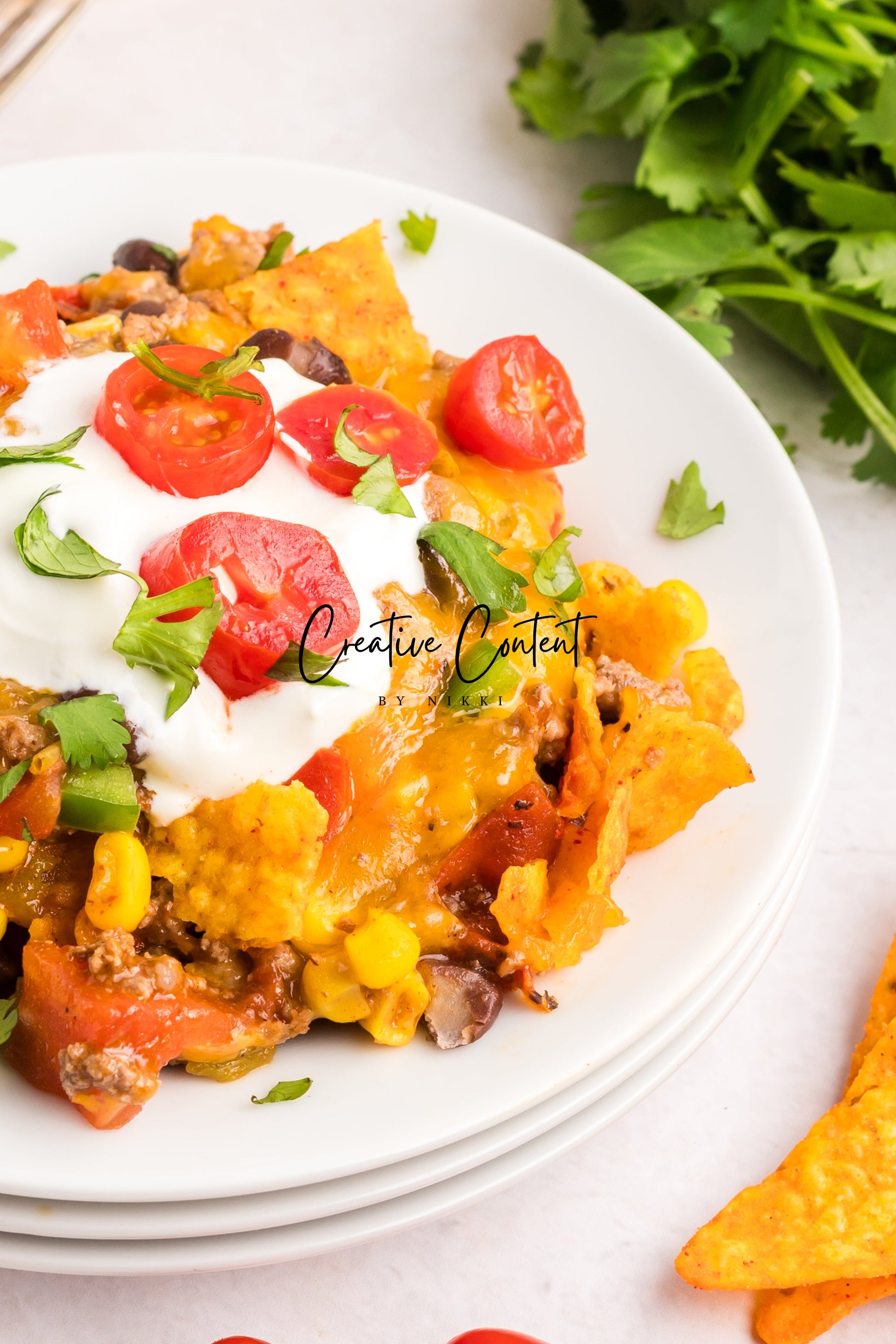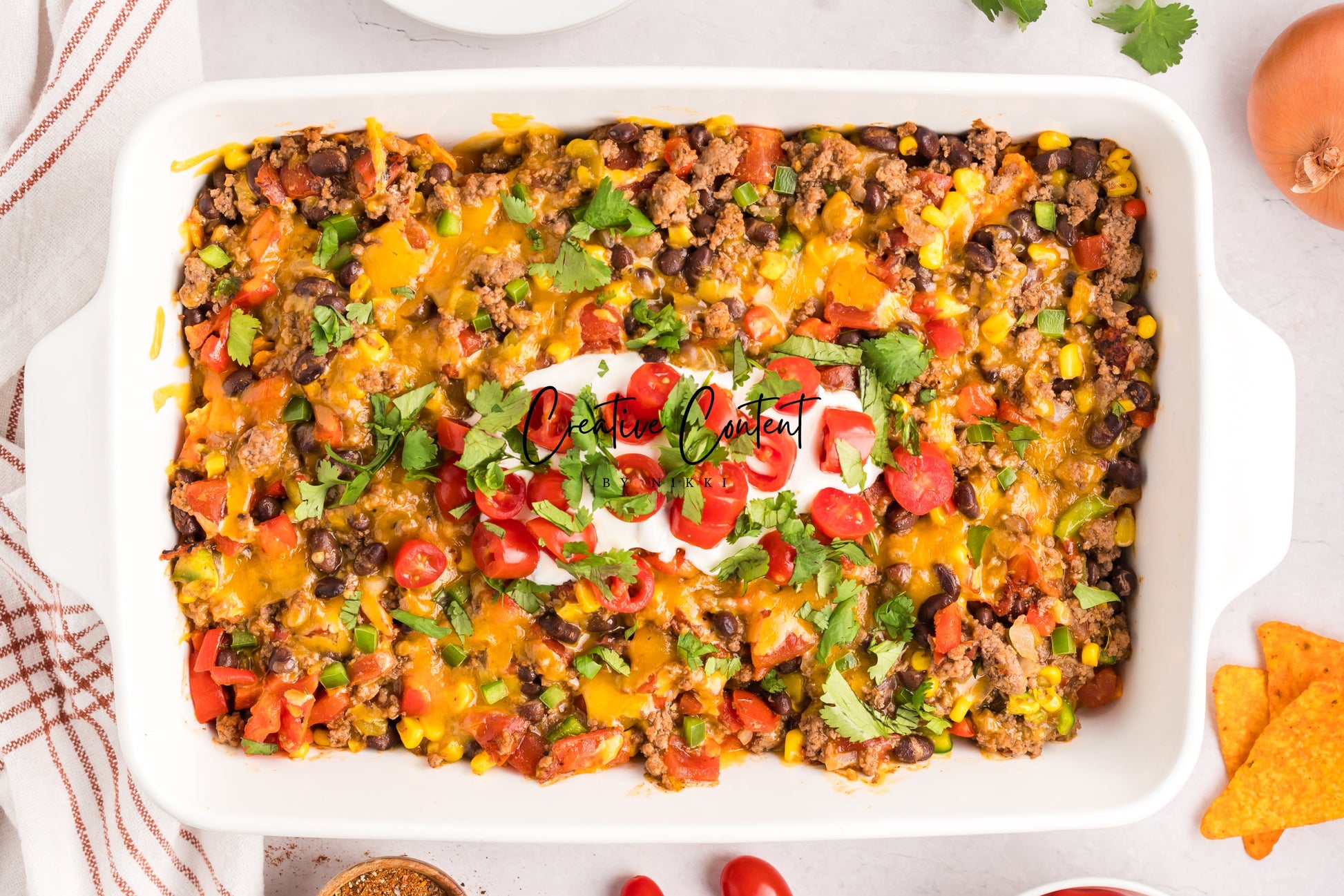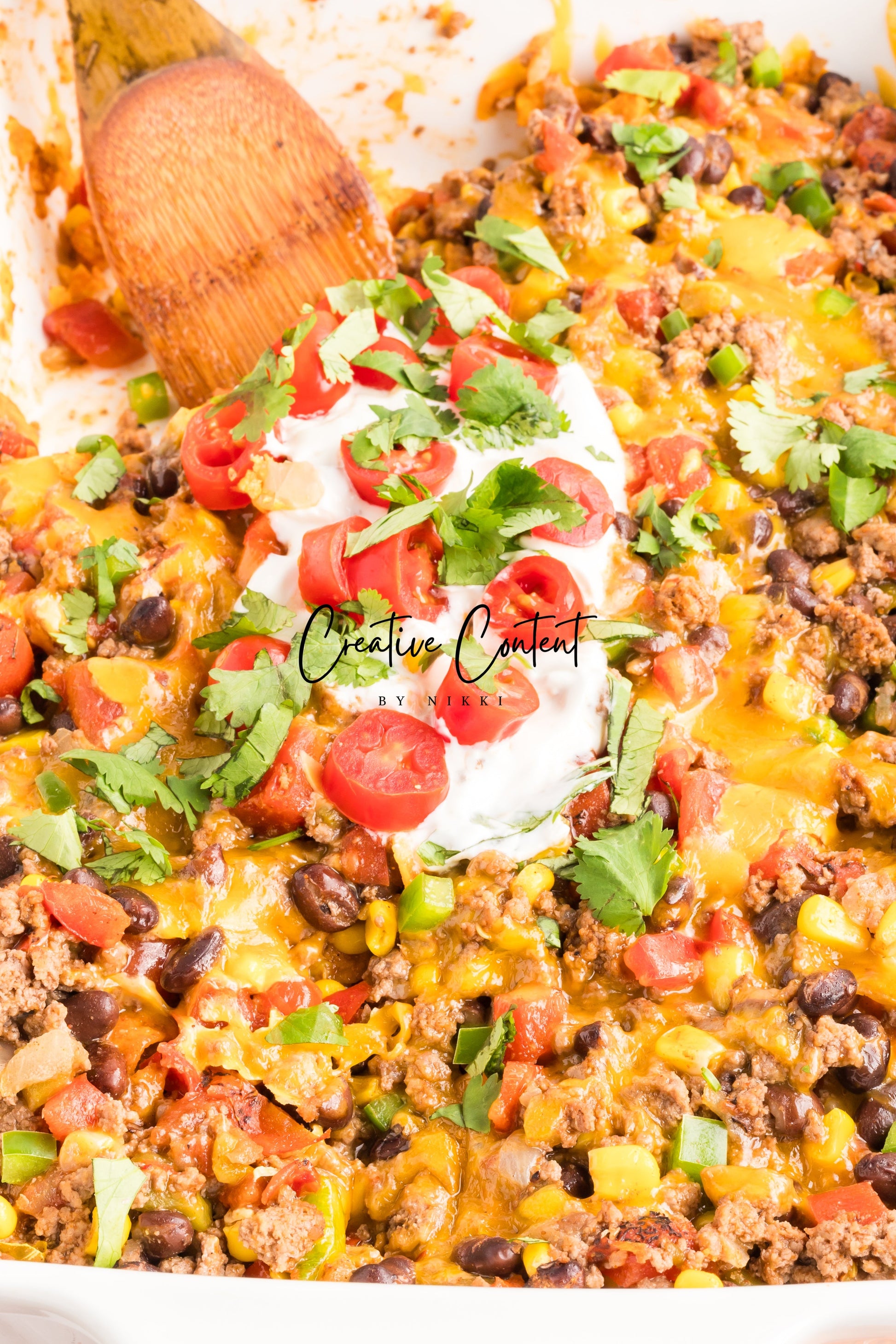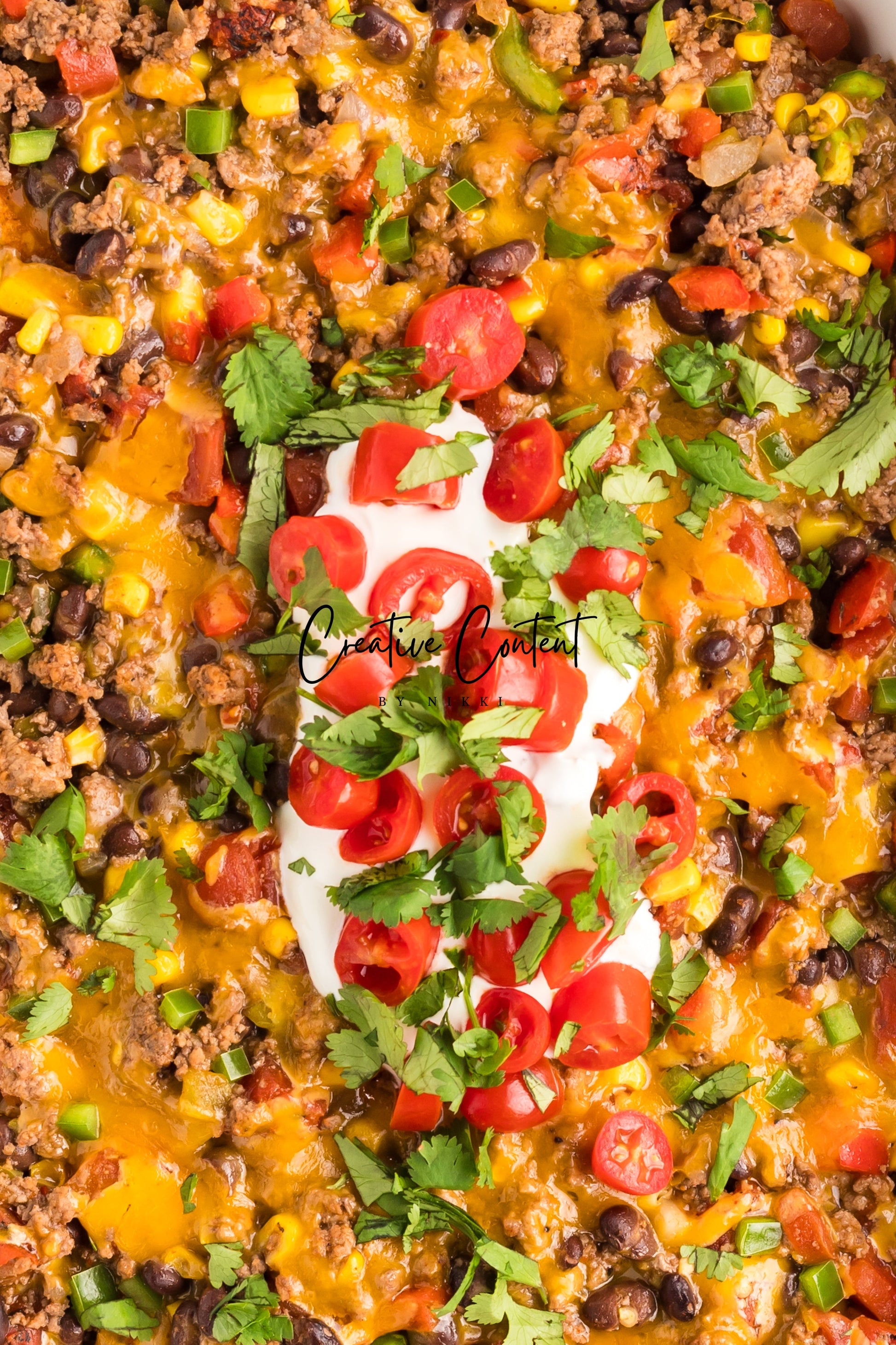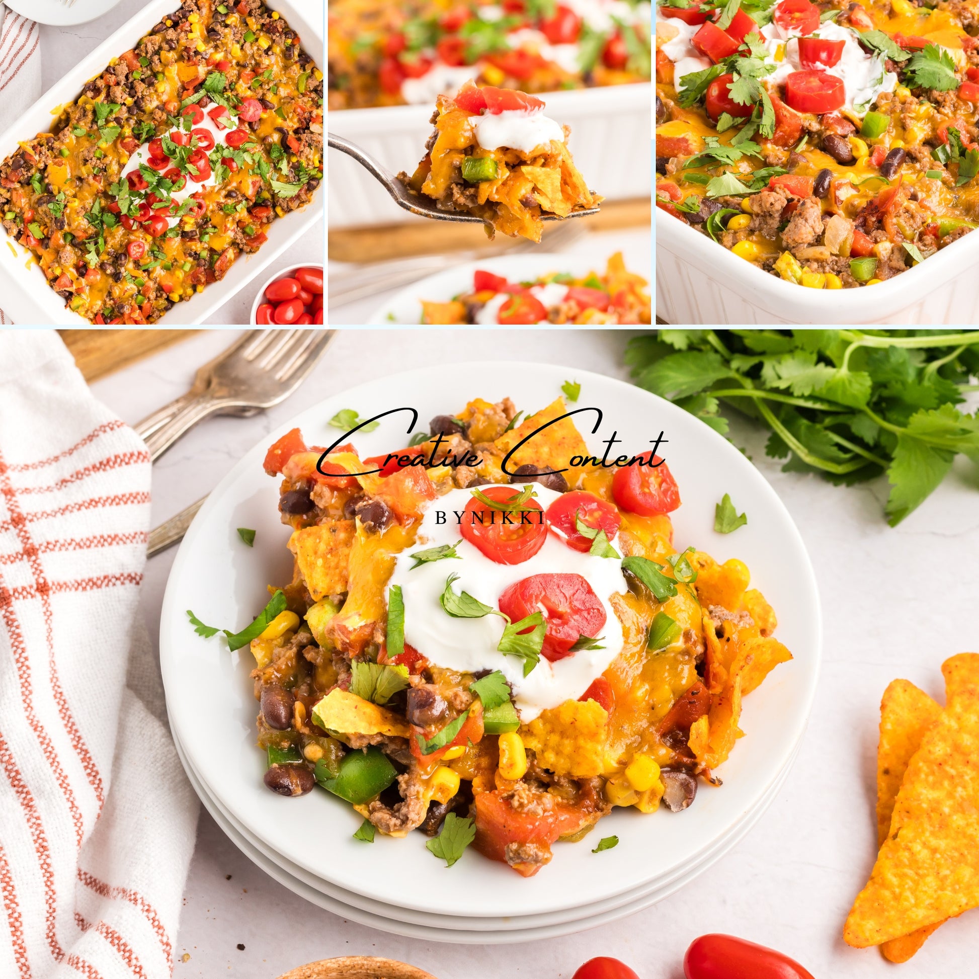 - Featured Ingredients; ground beef, yellow onion, red bell pepper, green bell pepper, taco seasoning, black beans, diced tomatoes, nacho cheese soup, corn, green chiles, Doritos, cheddar cheese, tomatoes, sour cream, and green onions.