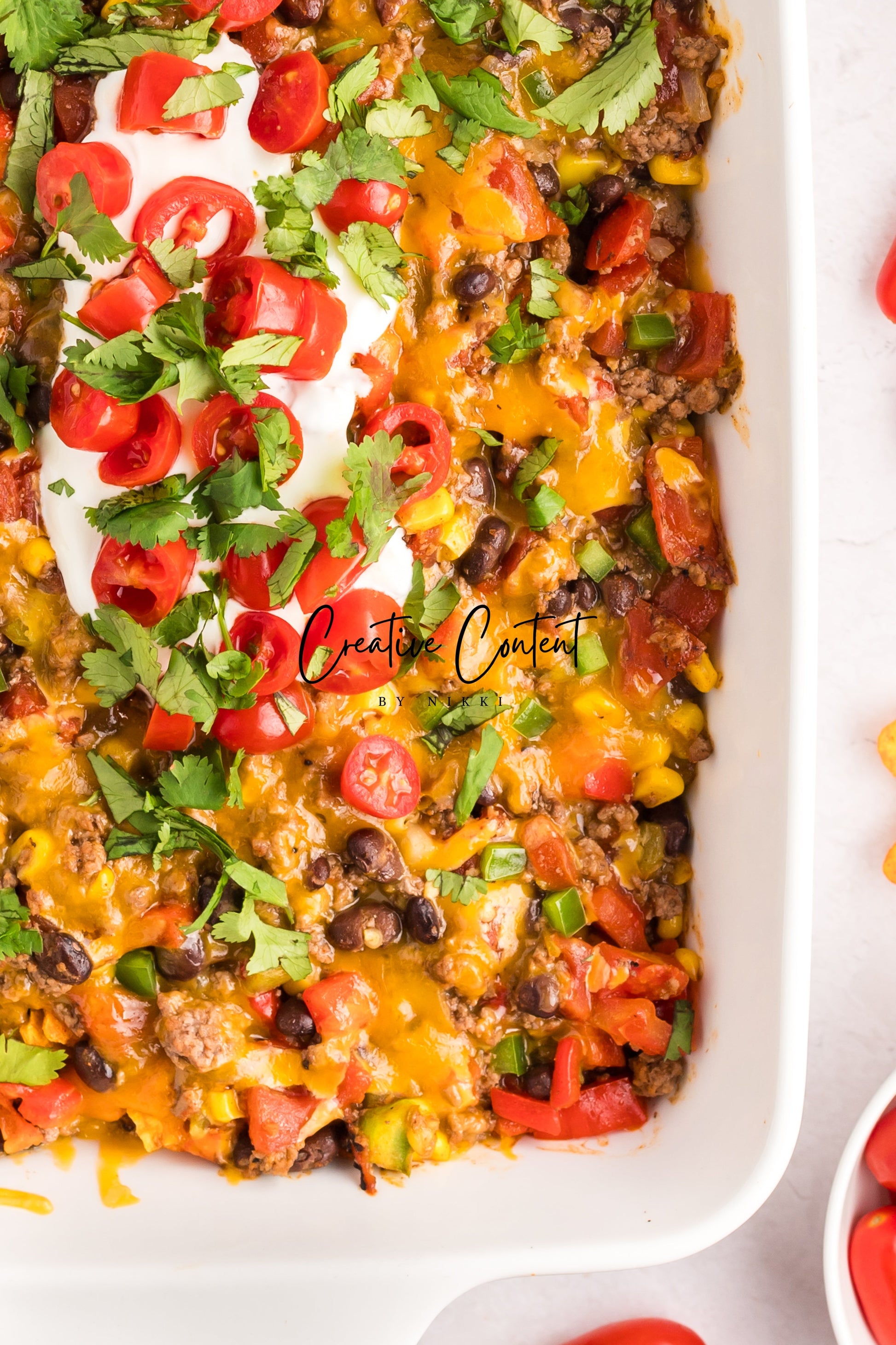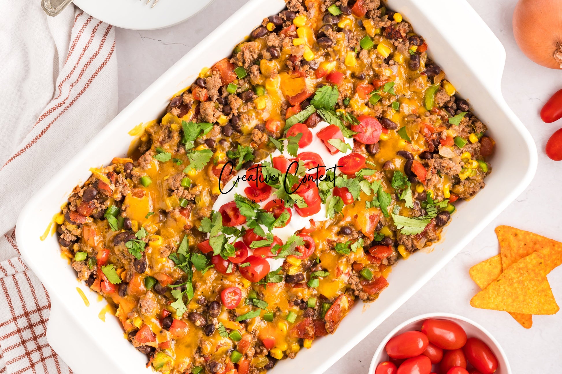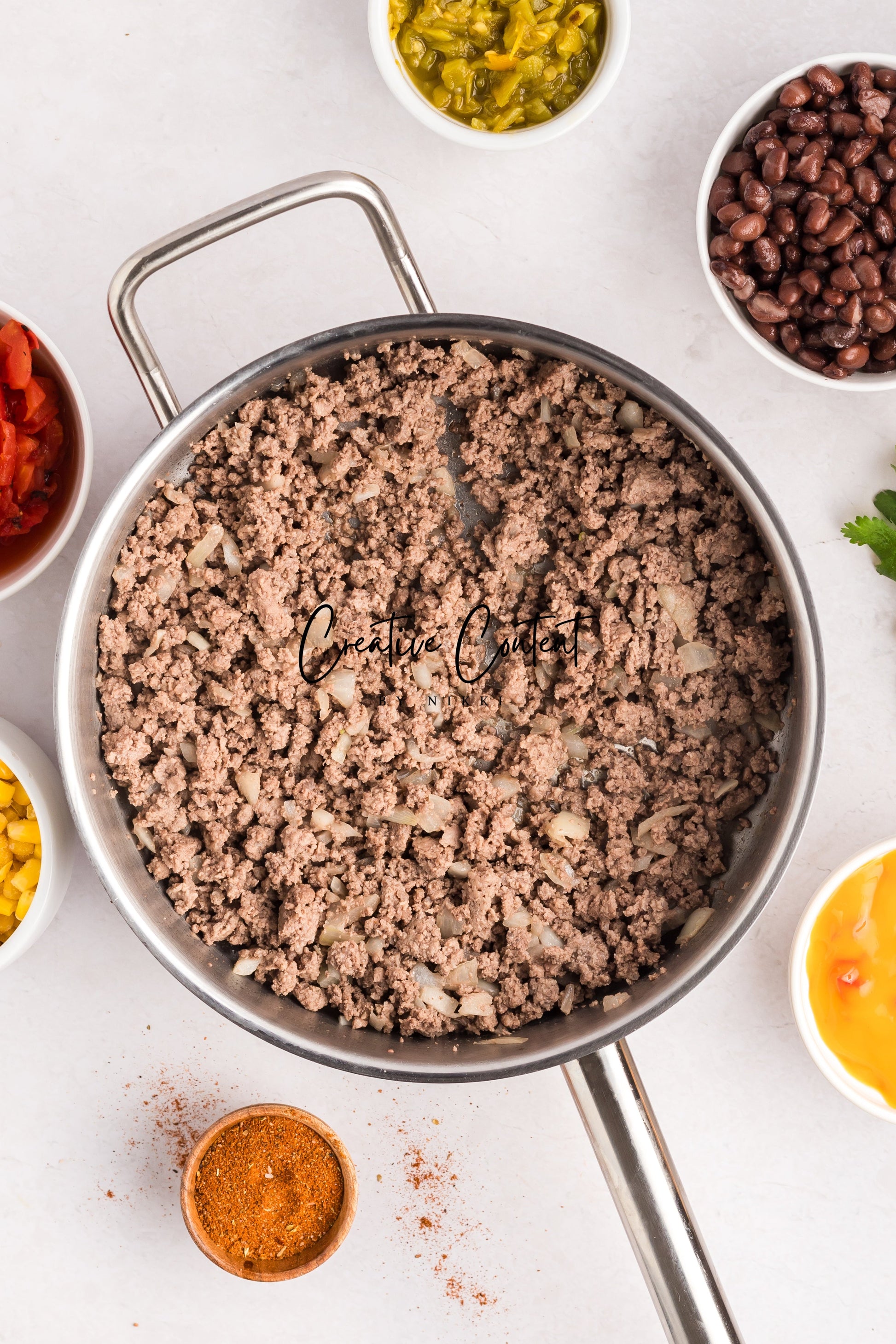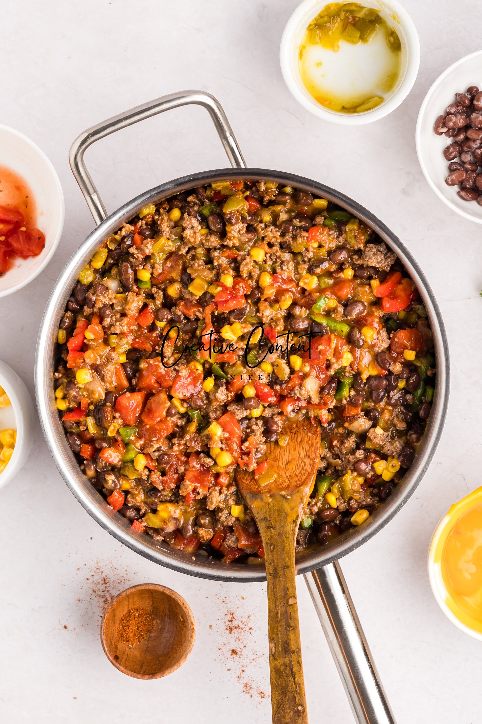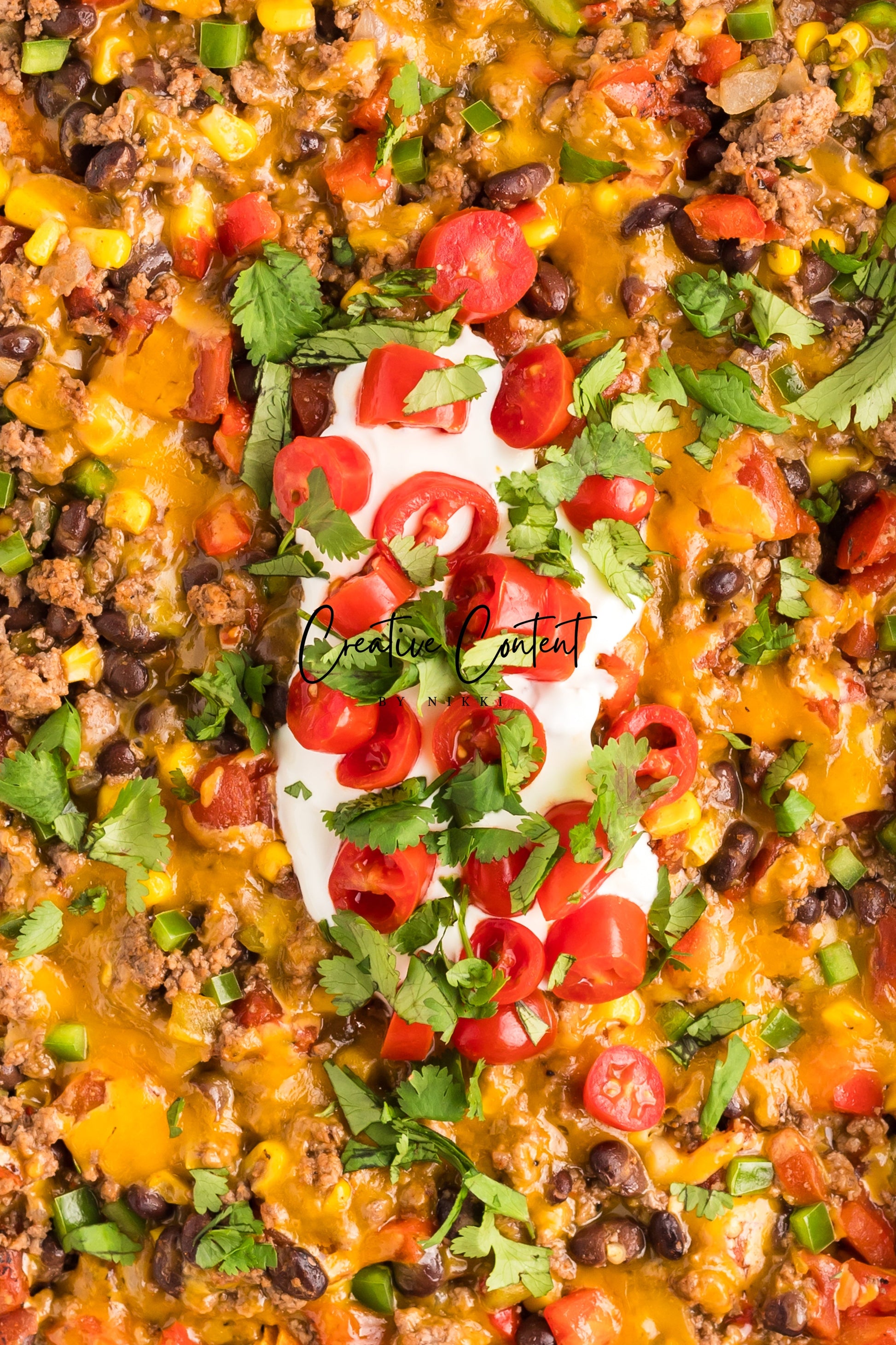 - Featured Ingredients; ground beef, yellow onion, red bell pepper, green bell pepper, taco seasoning, black beans, diced tomatoes, nacho cheese soup, corn, green chiles, Doritos, cheddar cheese, tomatoes, sour cream, and green onions.