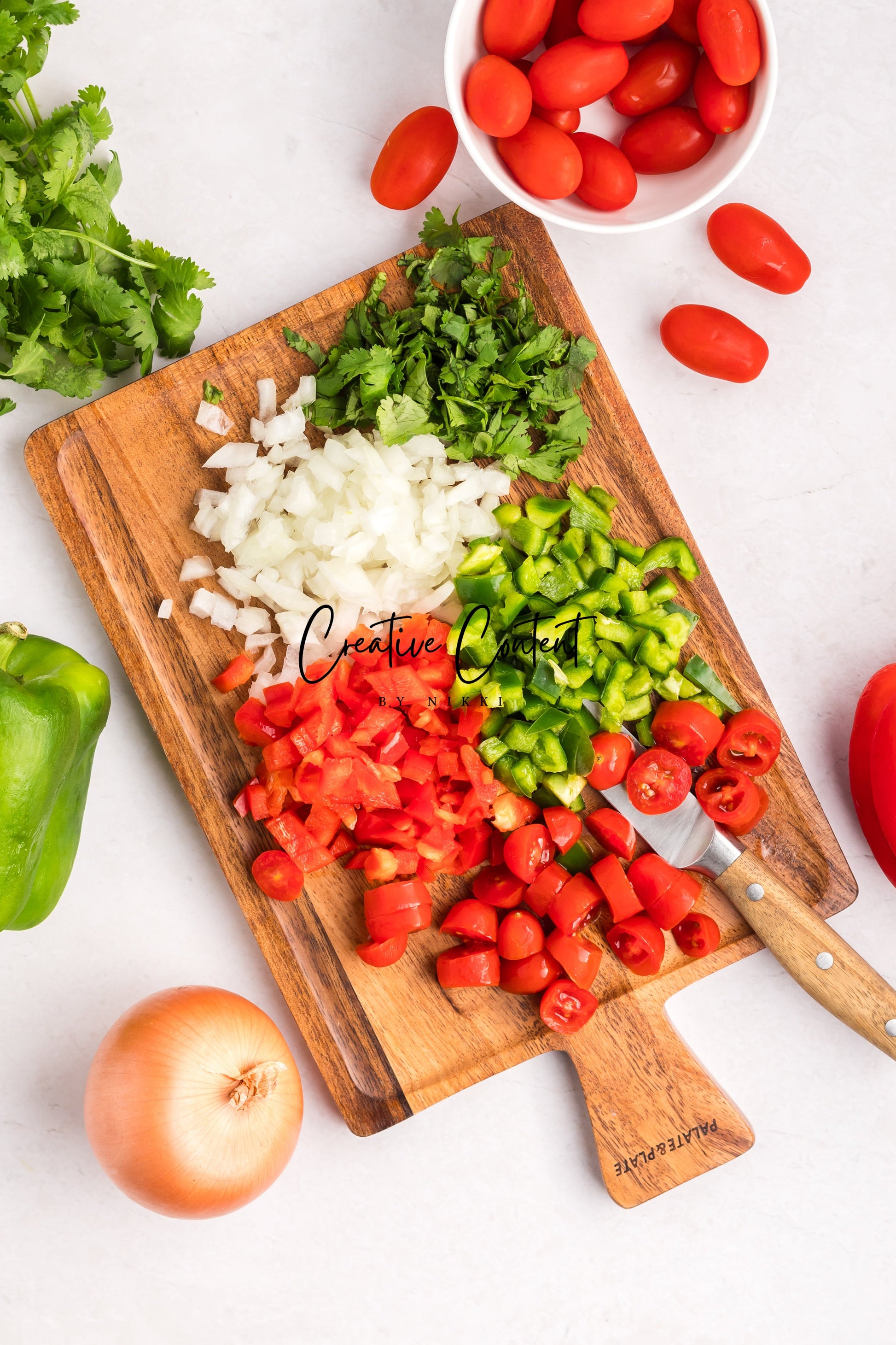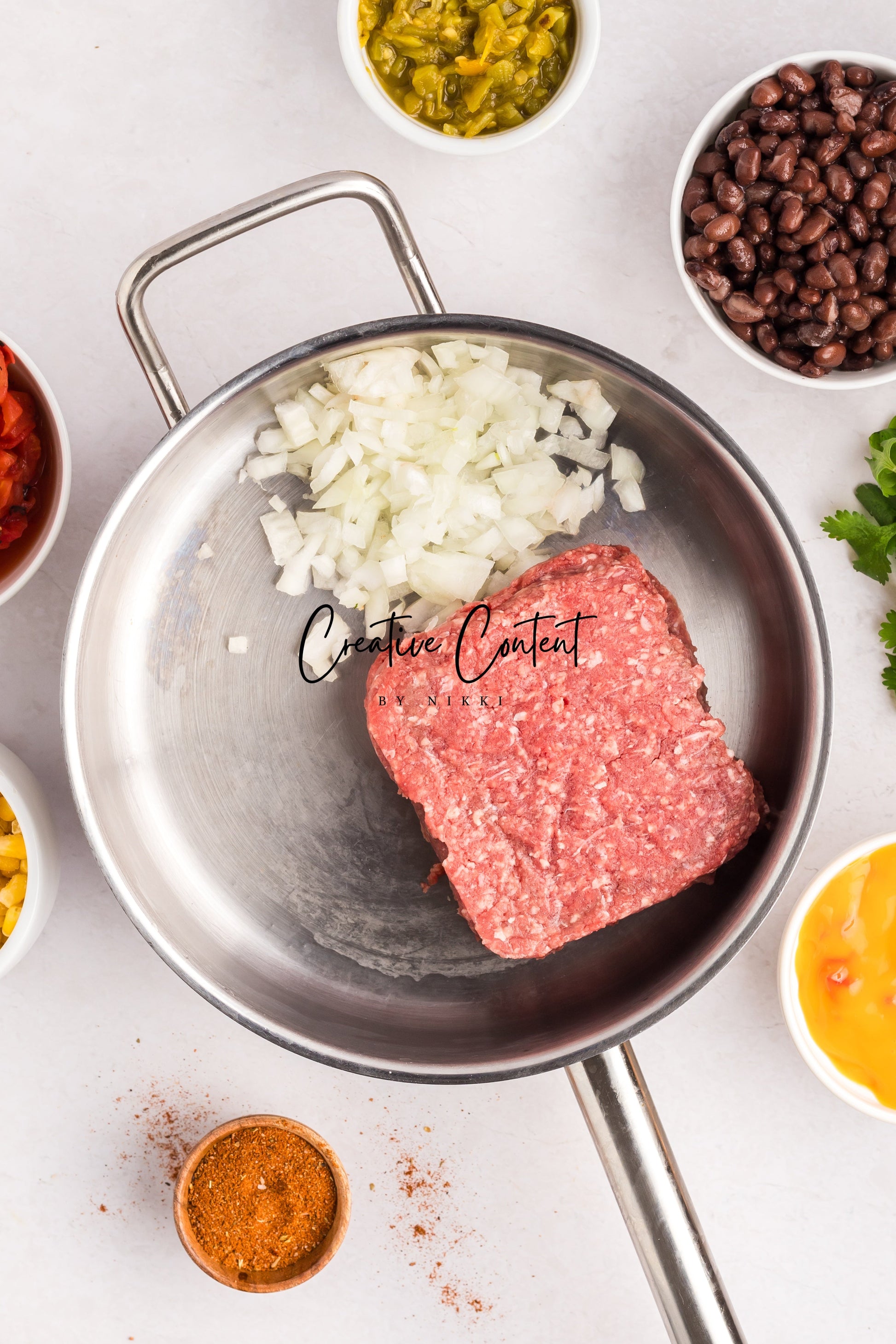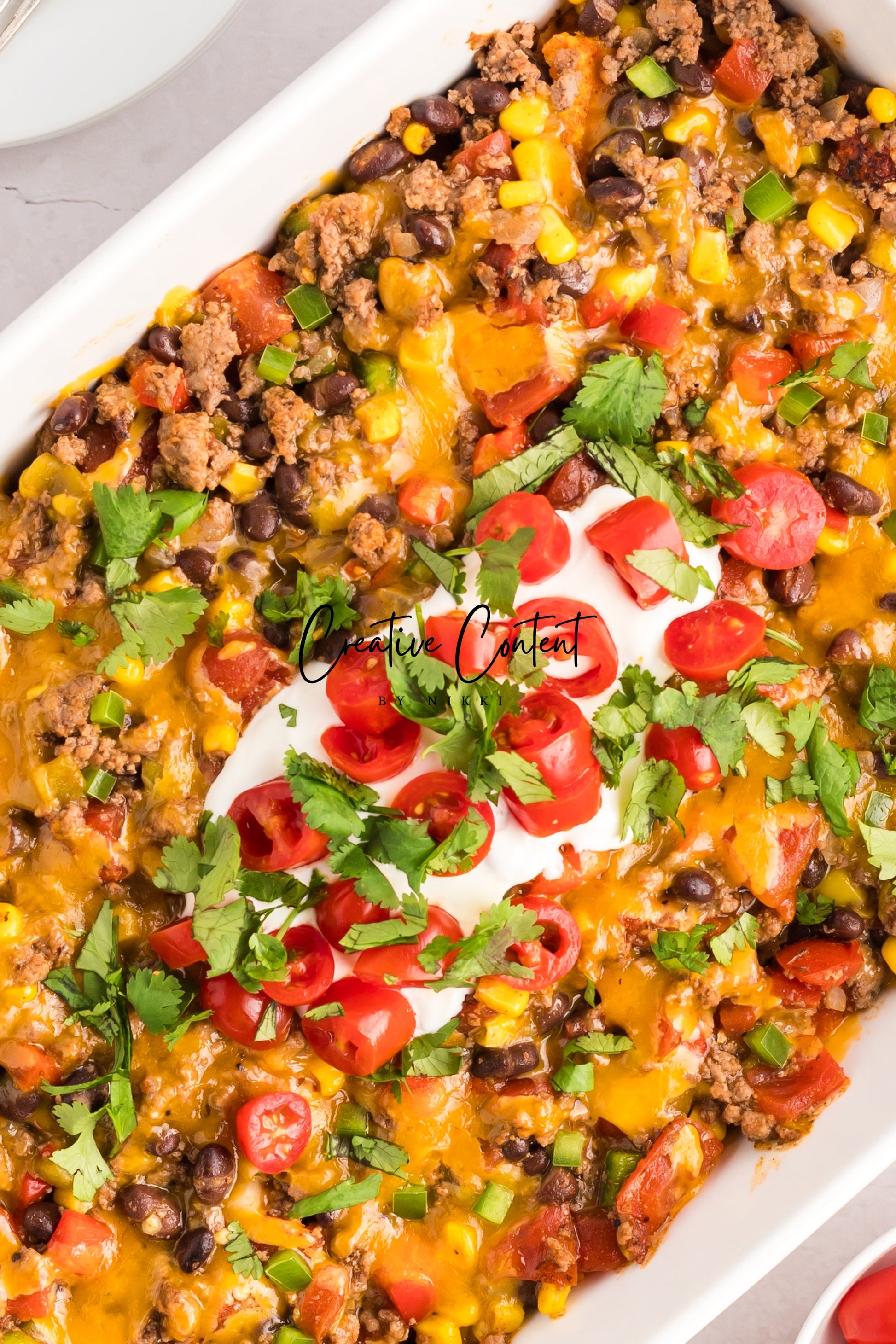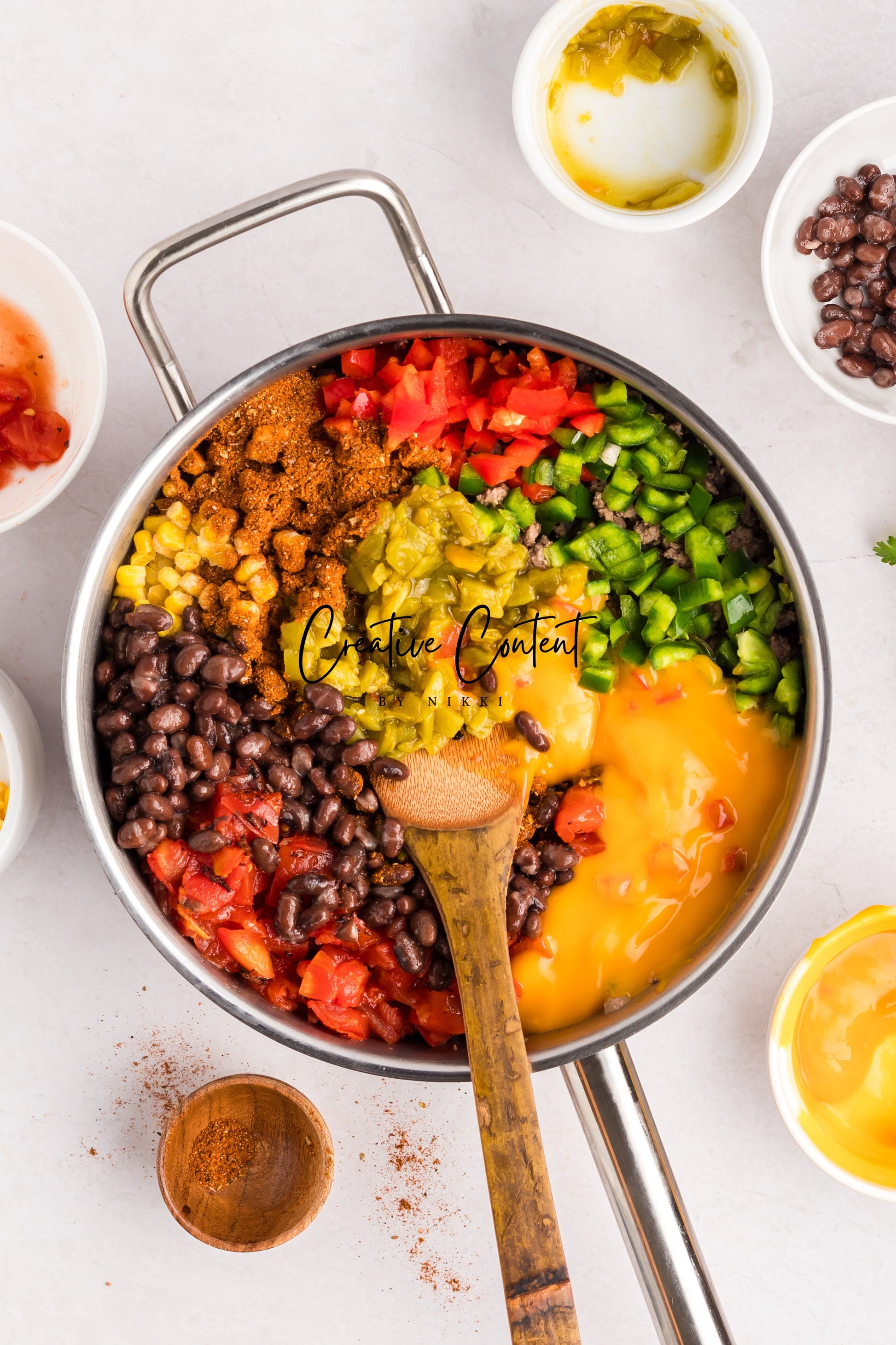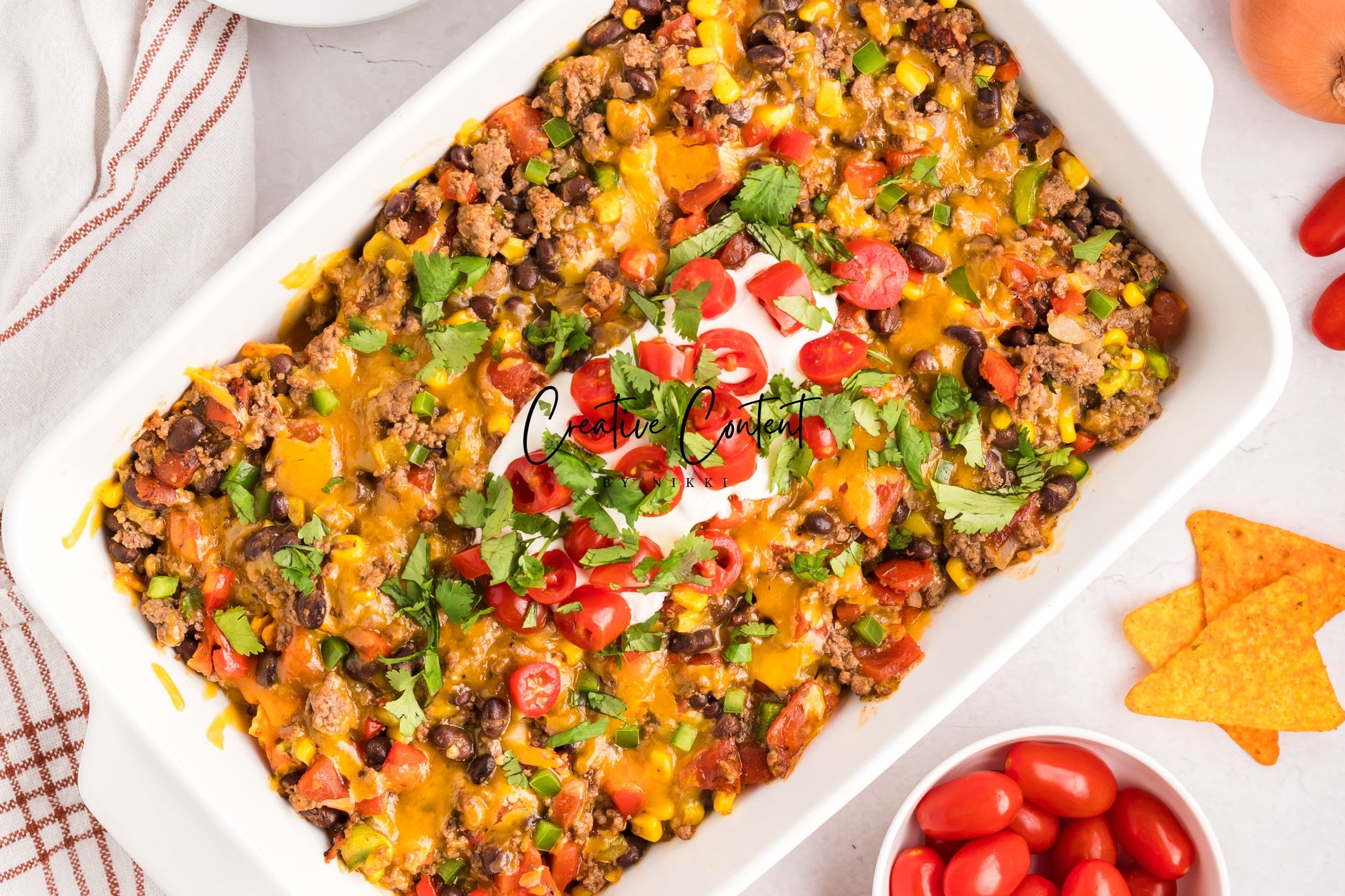 - Featured Ingredients; ground beef, yellow onion, red bell pepper, green bell pepper, taco seasoning, black beans, diced tomatoes, nacho cheese soup, corn, green chiles, Doritos, cheddar cheese, tomatoes, sour cream, and green onions.