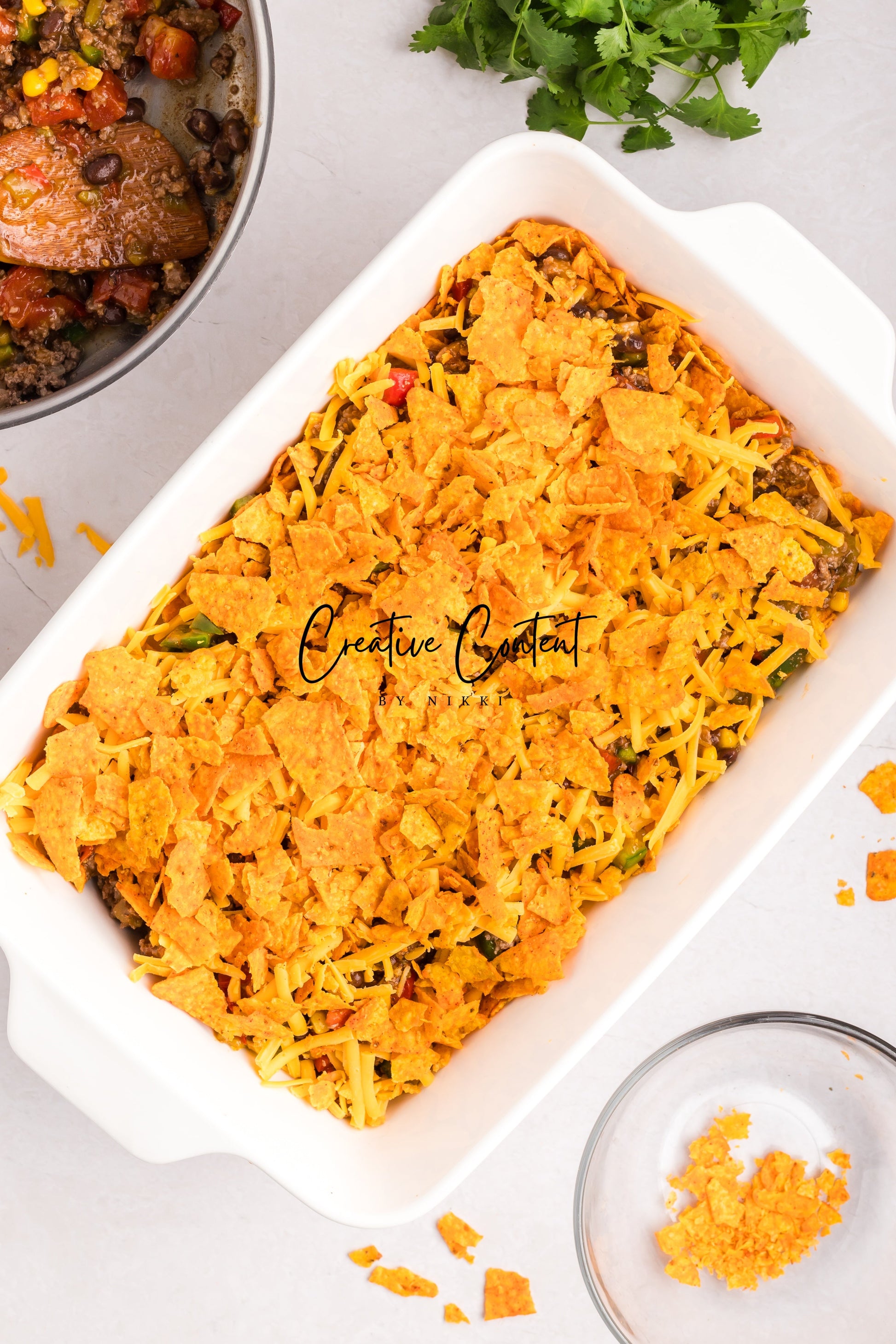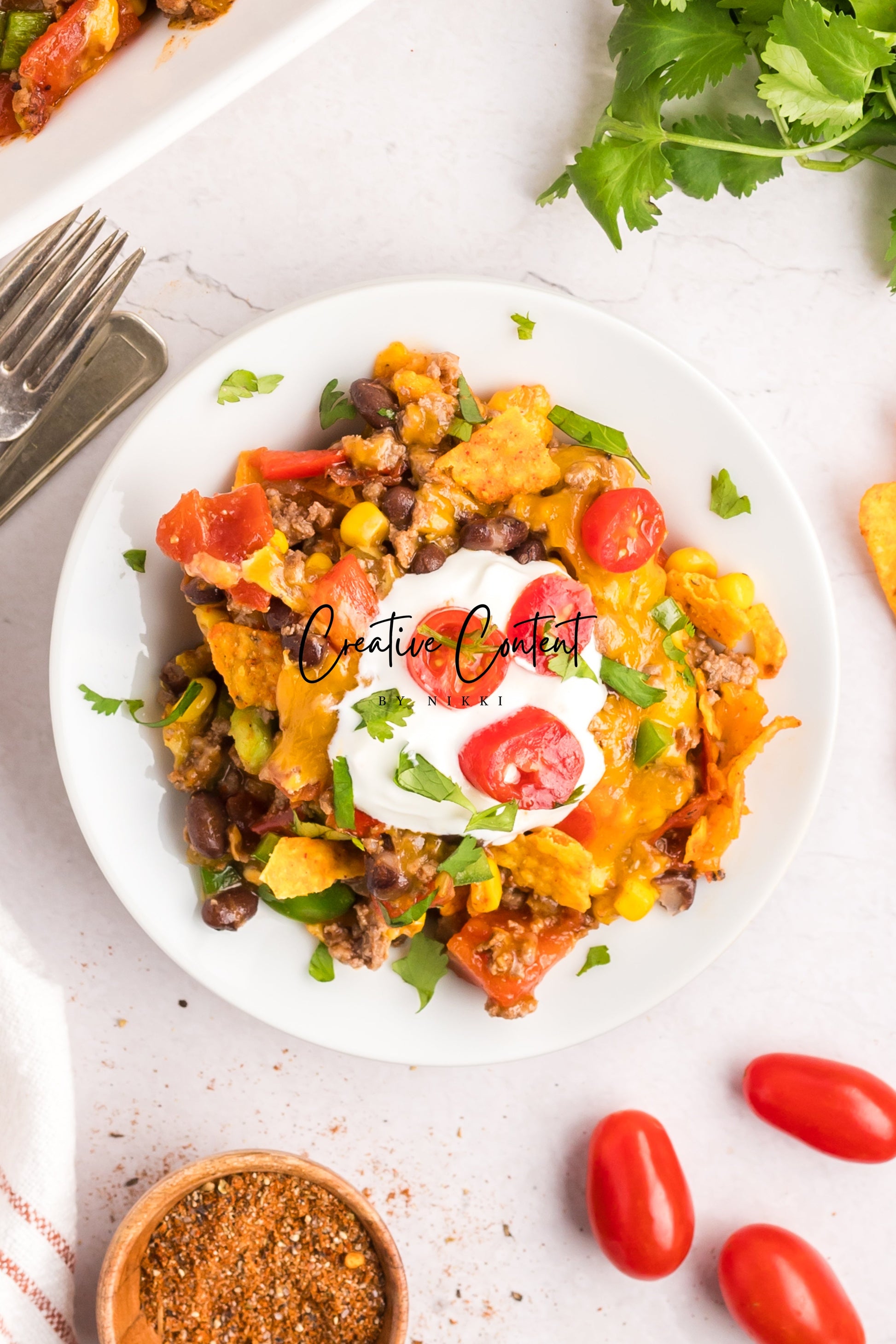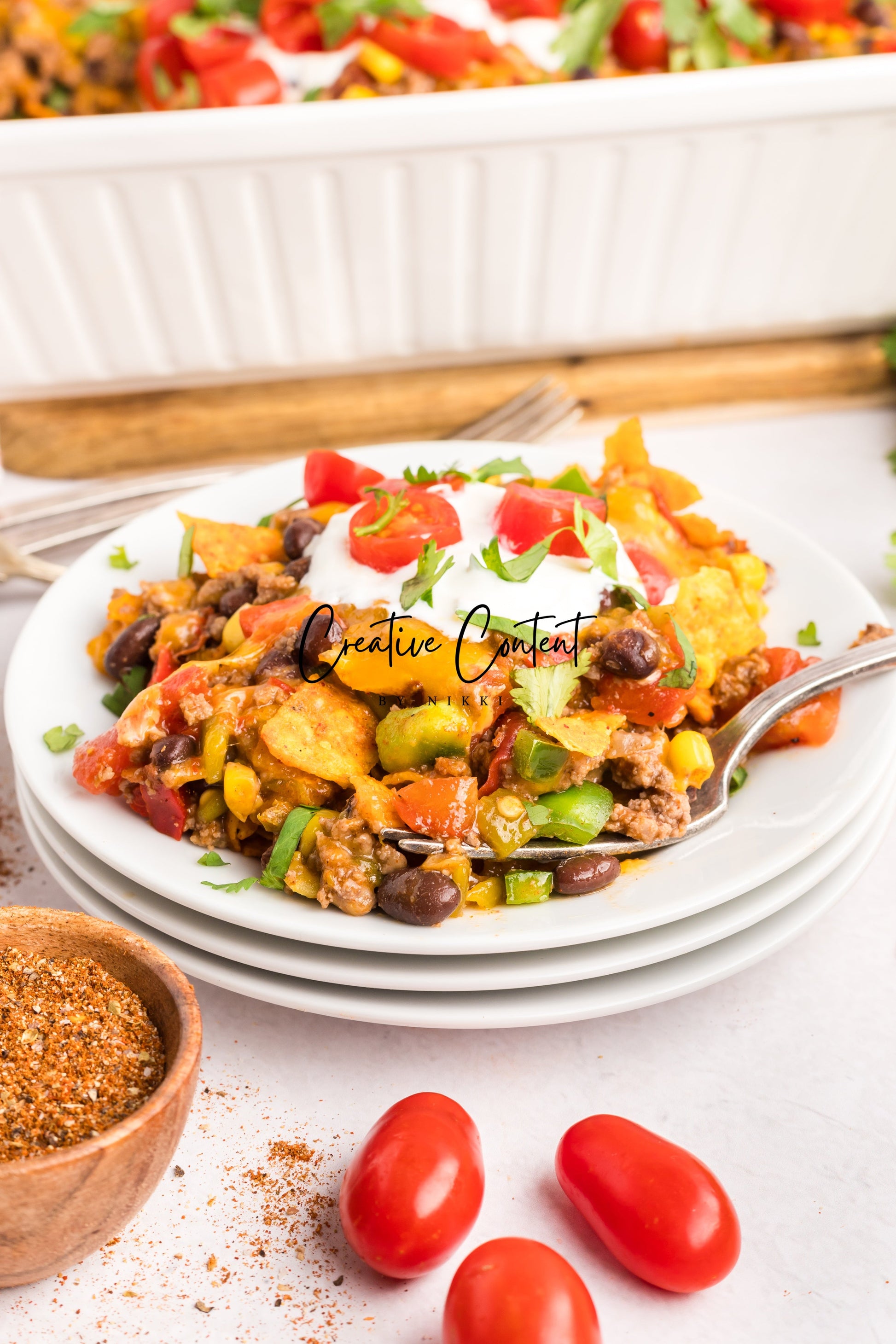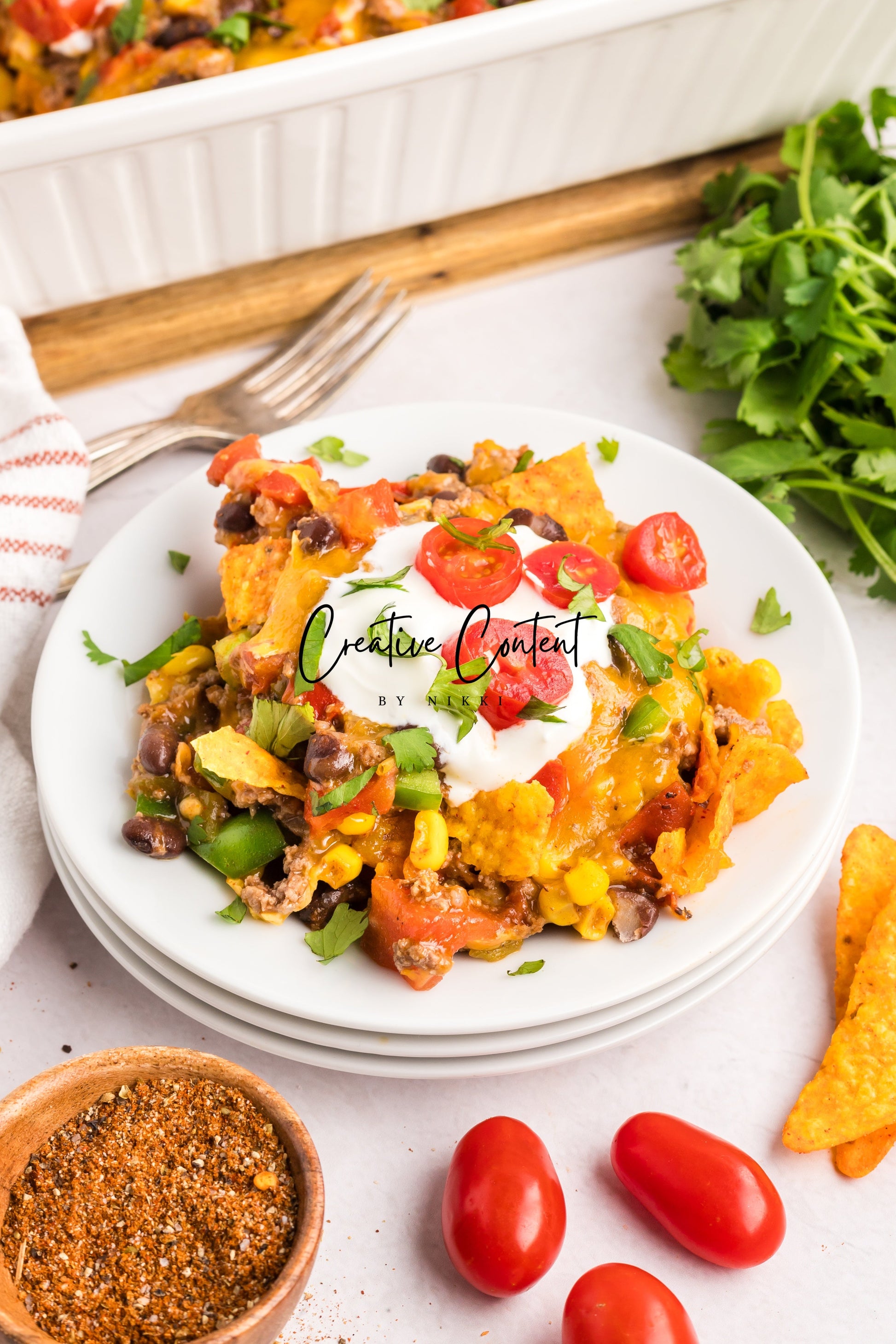 This Doritos Casserole is a quick and easy recipe for a busy weeknight meal. This is a great dish full of flavor with taco seasoning, fire-roasted tomatoes, green chiles, and nacho cheese soup. This is the perfect meal for the family or if you have an event where you need to bring something. Everyone will be asking for the recipe. In 35 minutes you can’t go wrong with this tasty dish.
