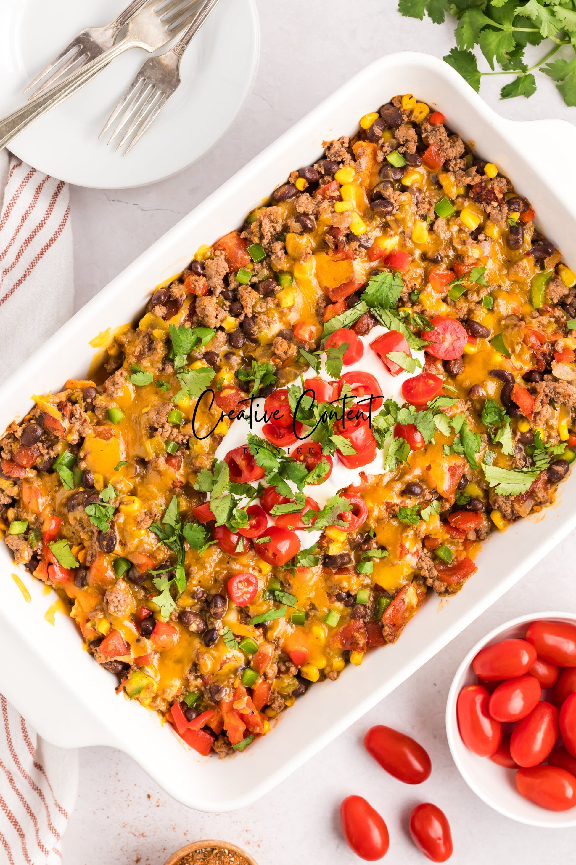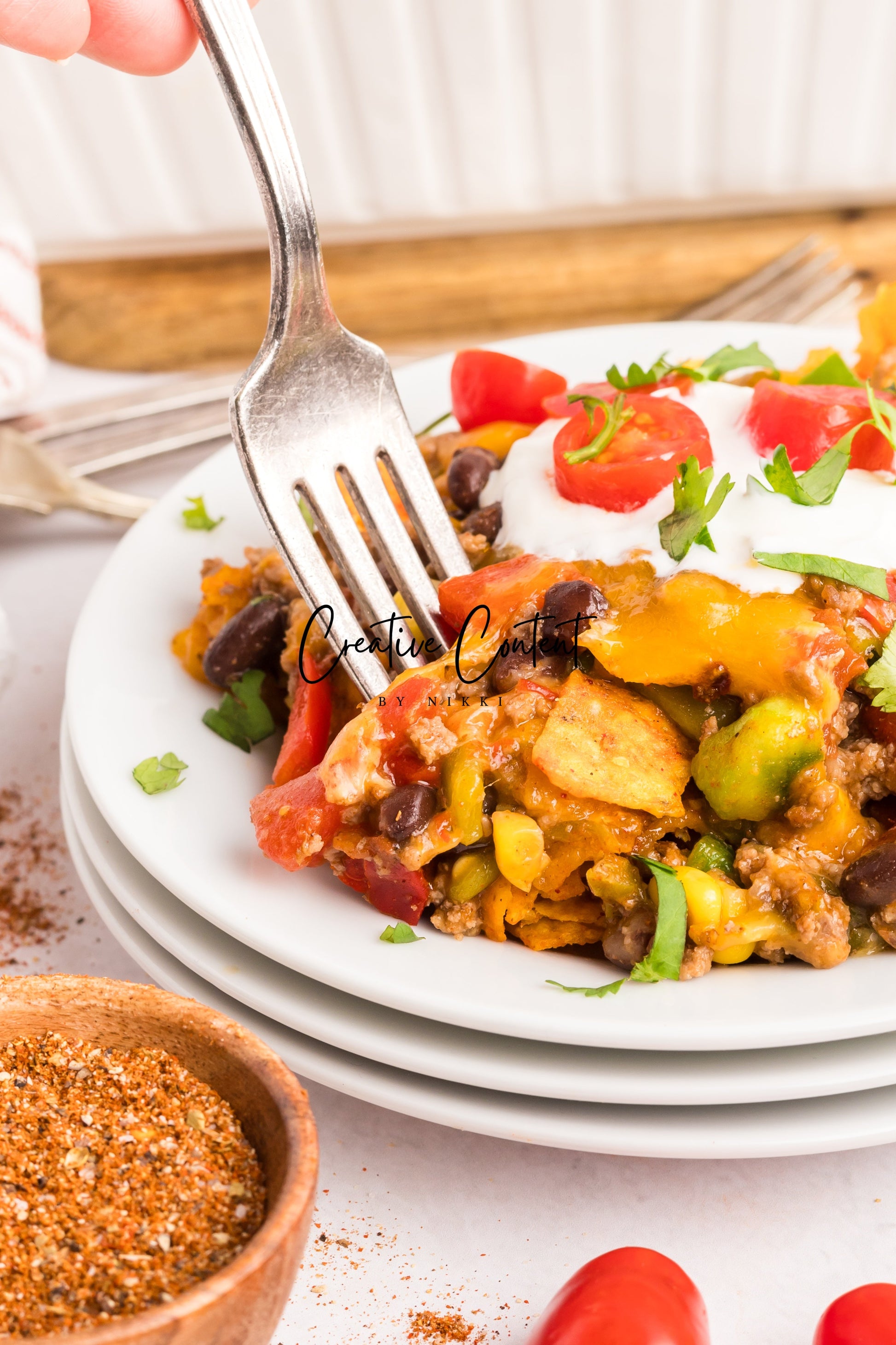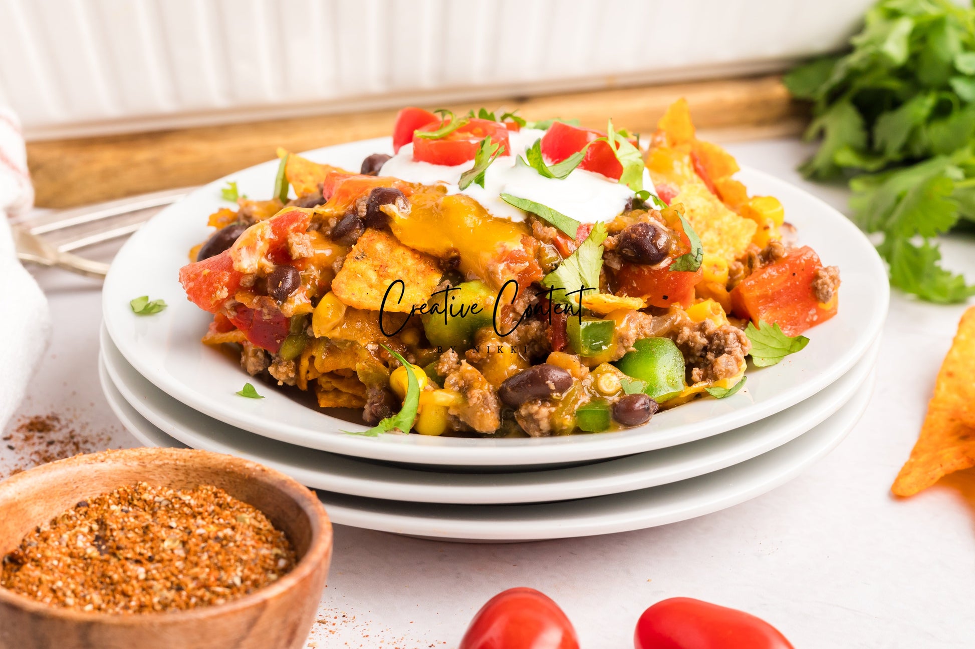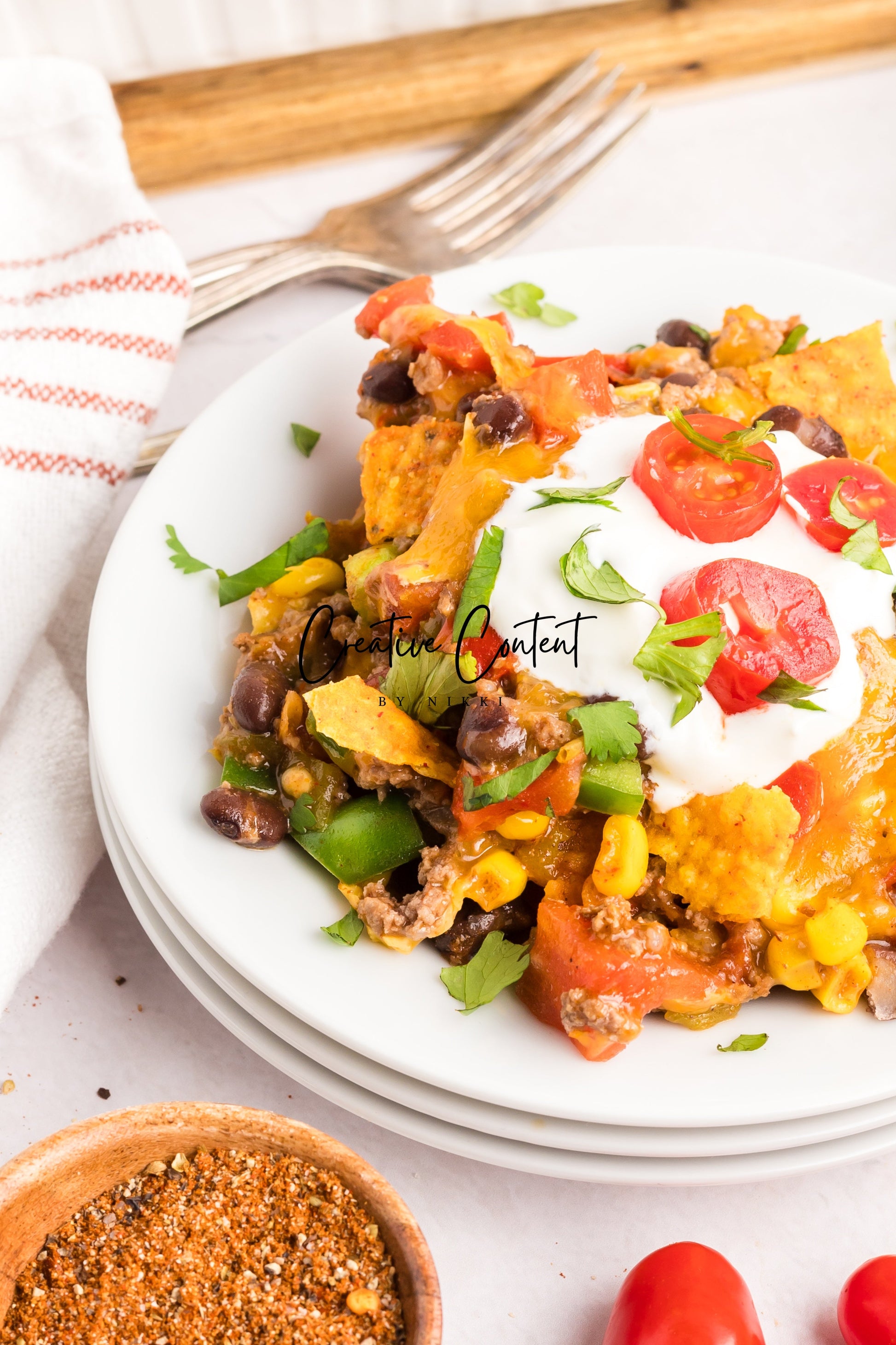 This Doritos Casserole is a quick and easy recipe for a busy weeknight meal. This is a great dish full of flavor with taco seasoning, fire-roasted tomatoes, green chiles, and nacho cheese soup. This is the perfect meal for the family or if you have an event where you need to bring something. Everyone will be asking for the recipe. In 35 minutes you can’t go wrong with this tasty dish.