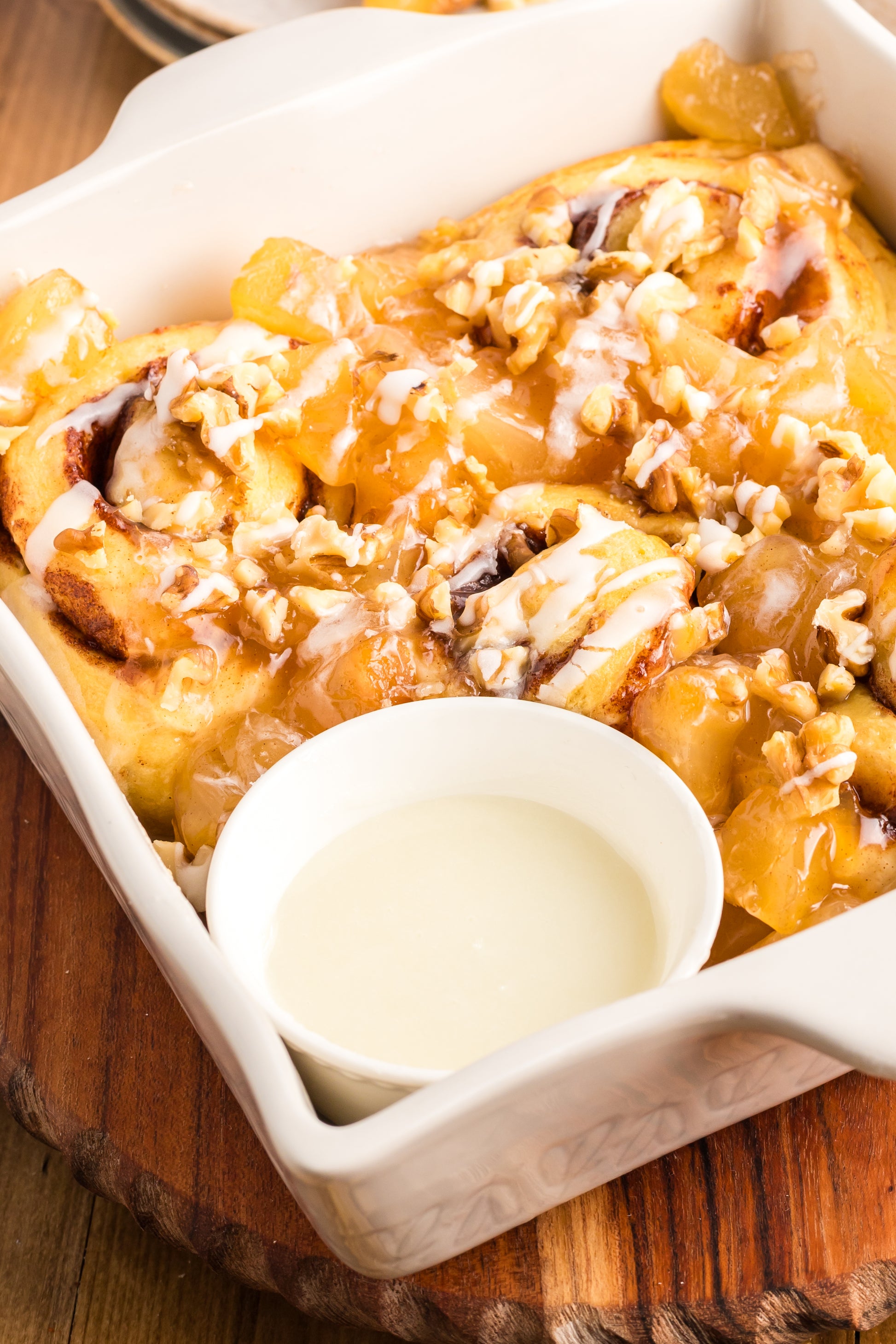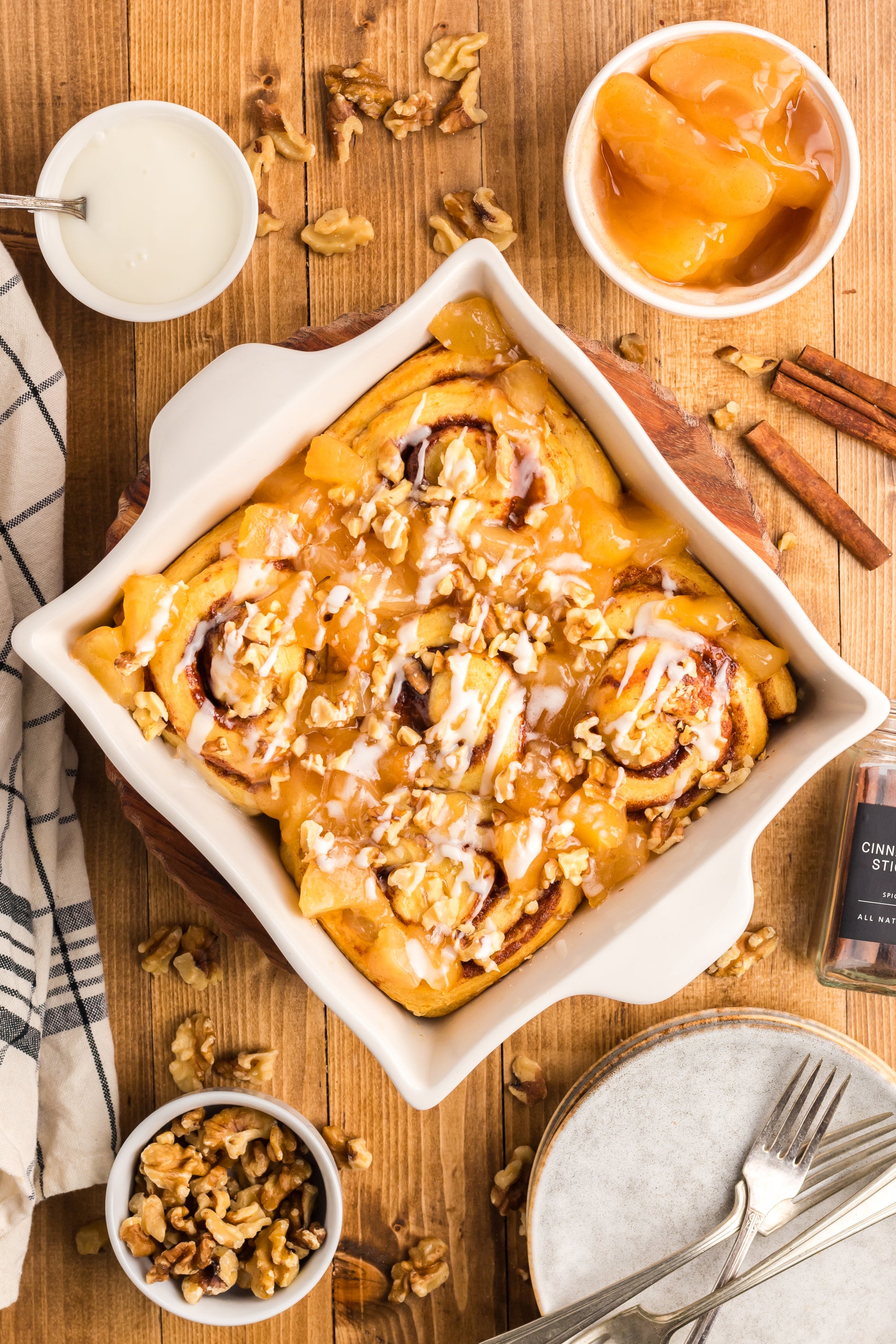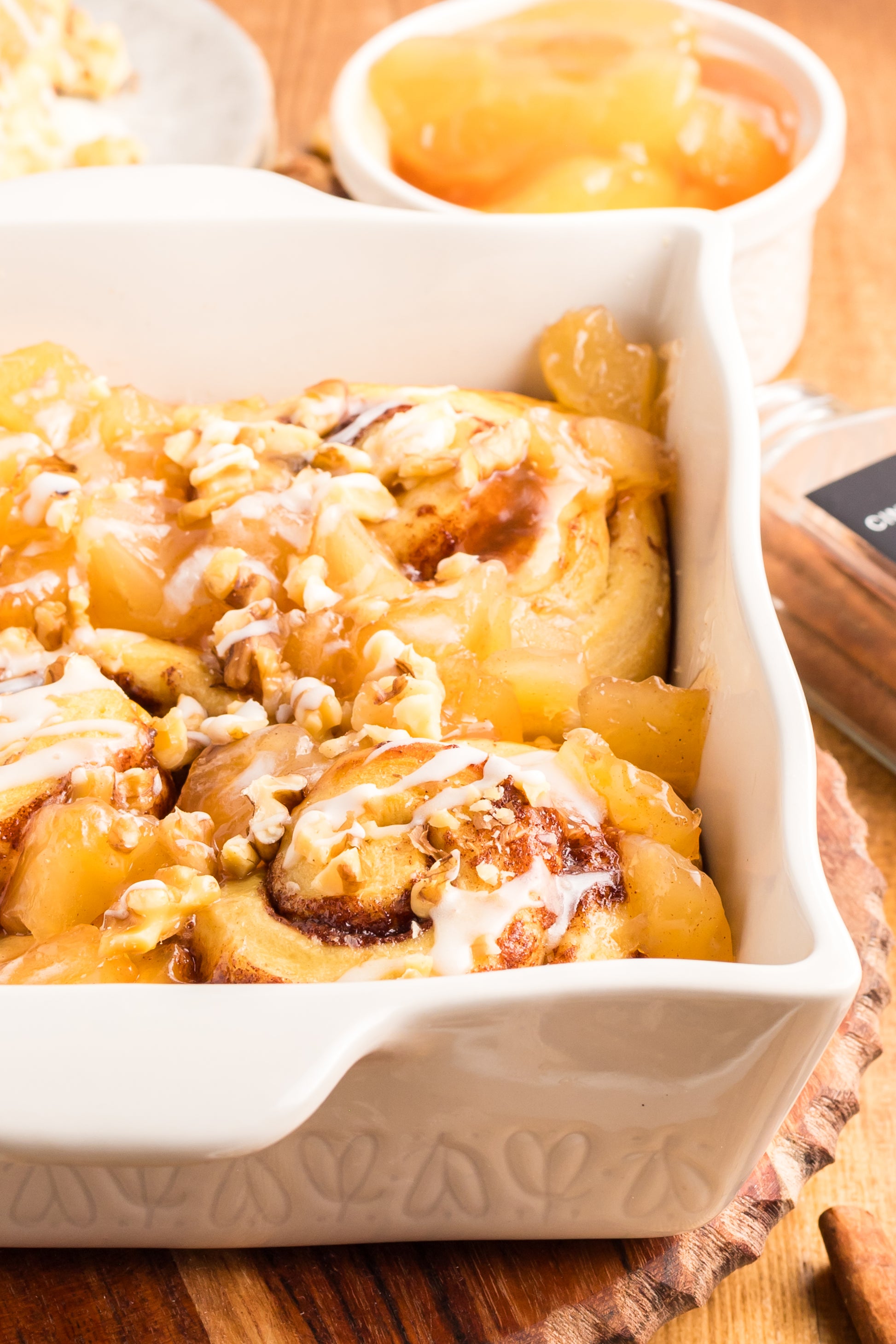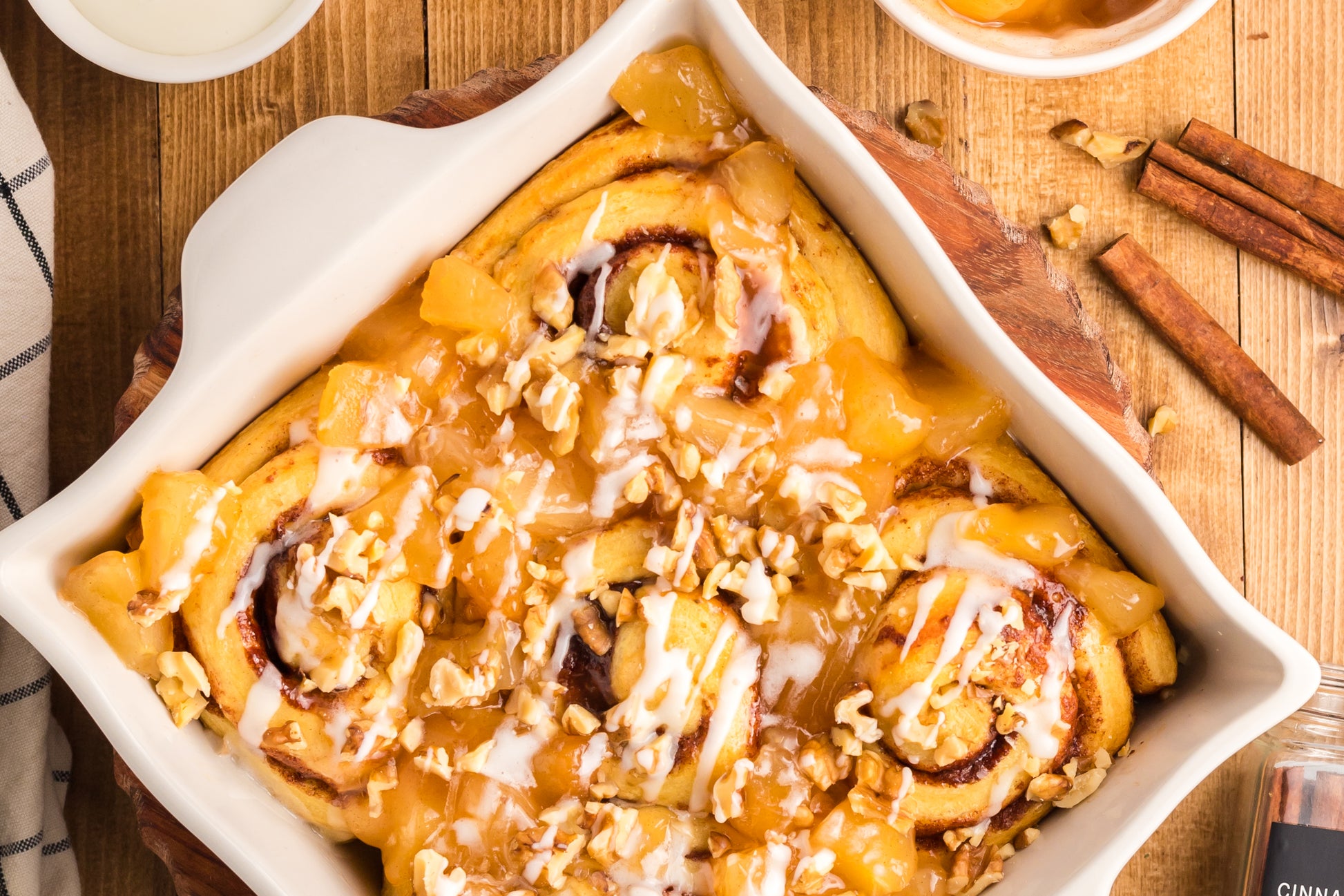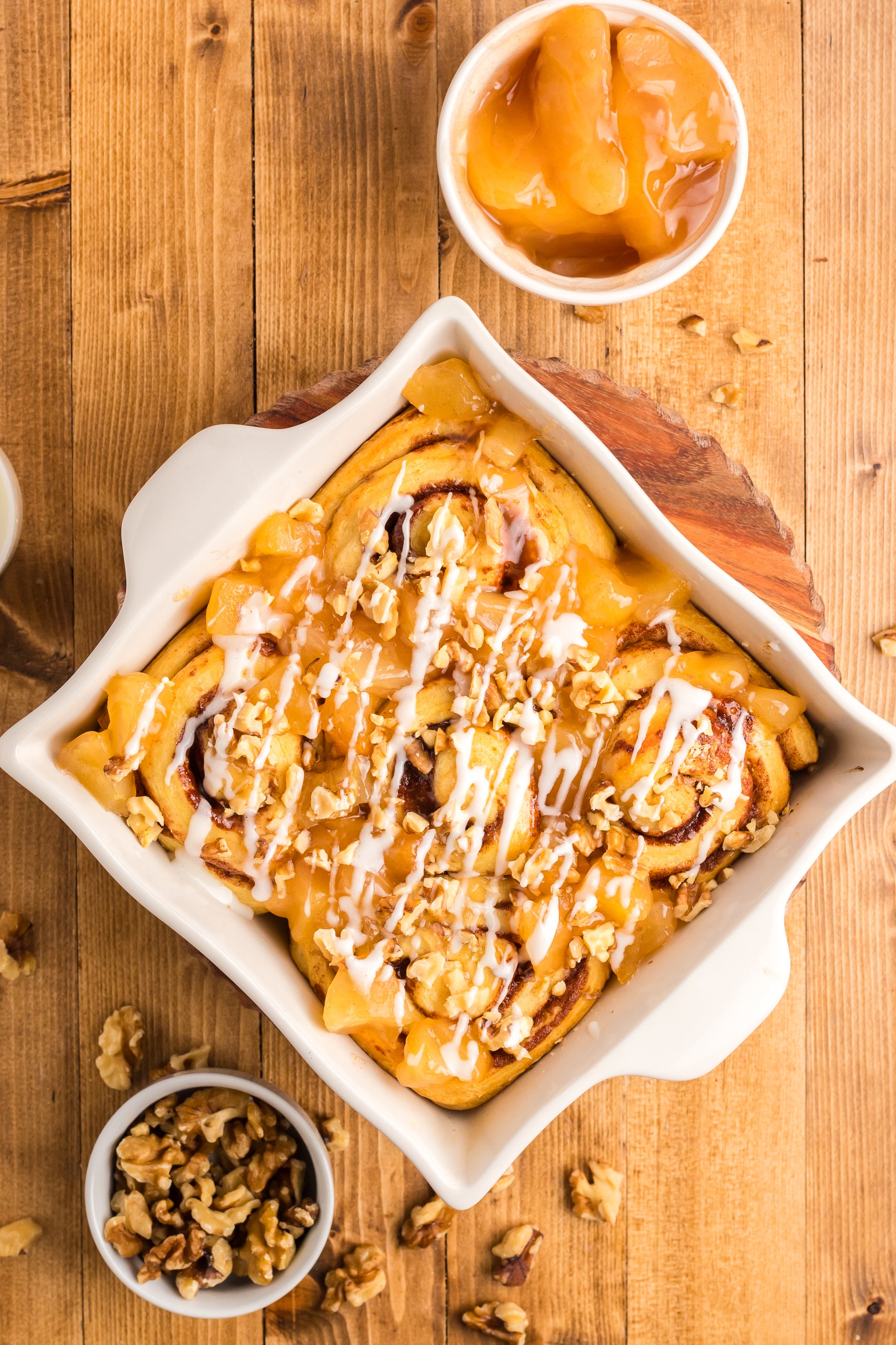 - Featured Ingredients; cinnamon rolls, apple pie filling, and walnuts.