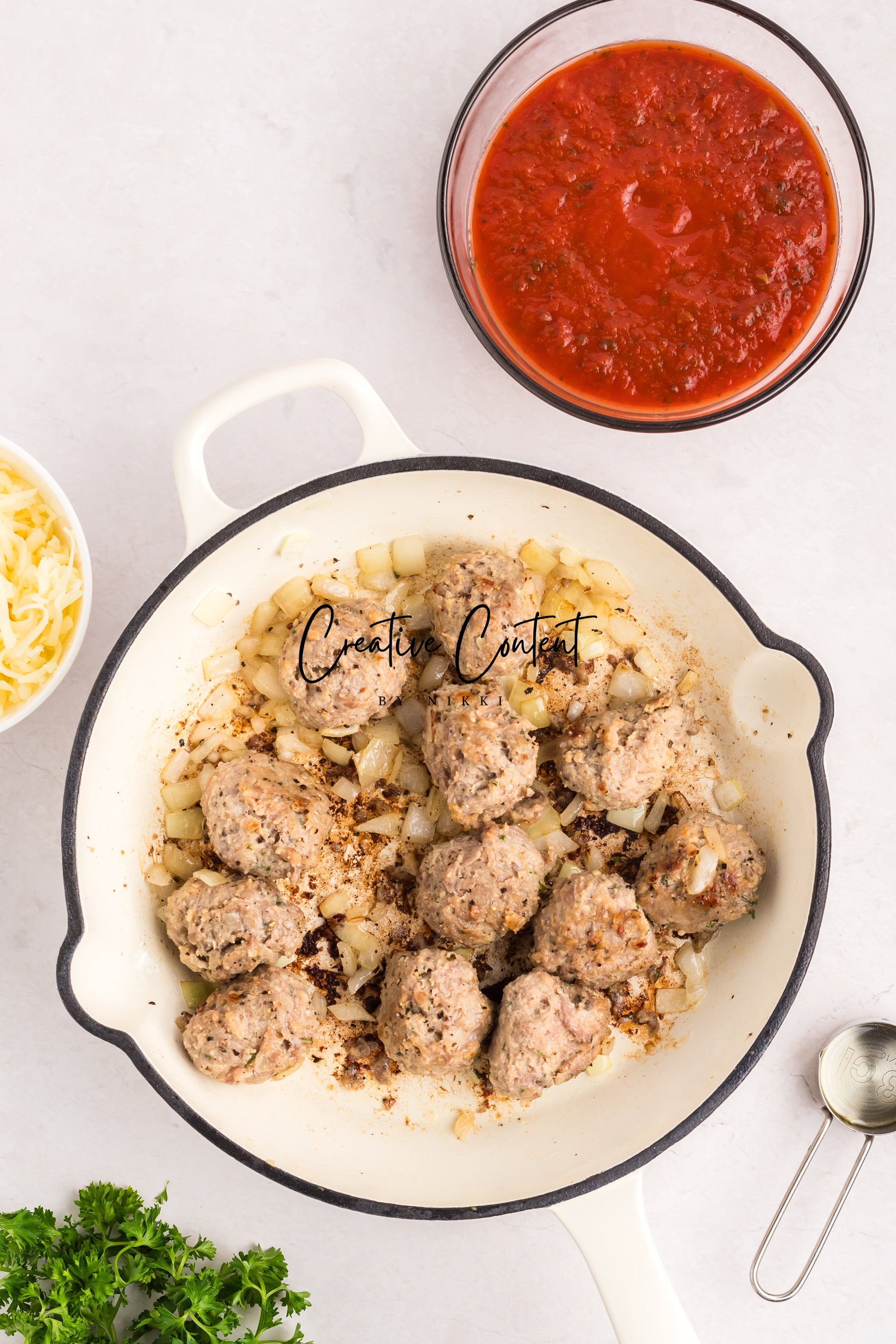 - Featured Ingredients; Pasta, marinara sauce, meatballs, yellow onion, avocado oil, salt, pepper, garlic powder, onion powder, garlic cloves, mozzarella cheese, and basil.