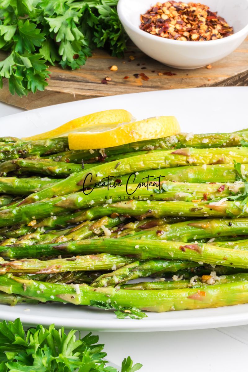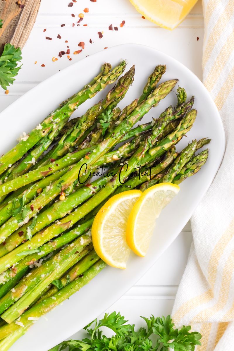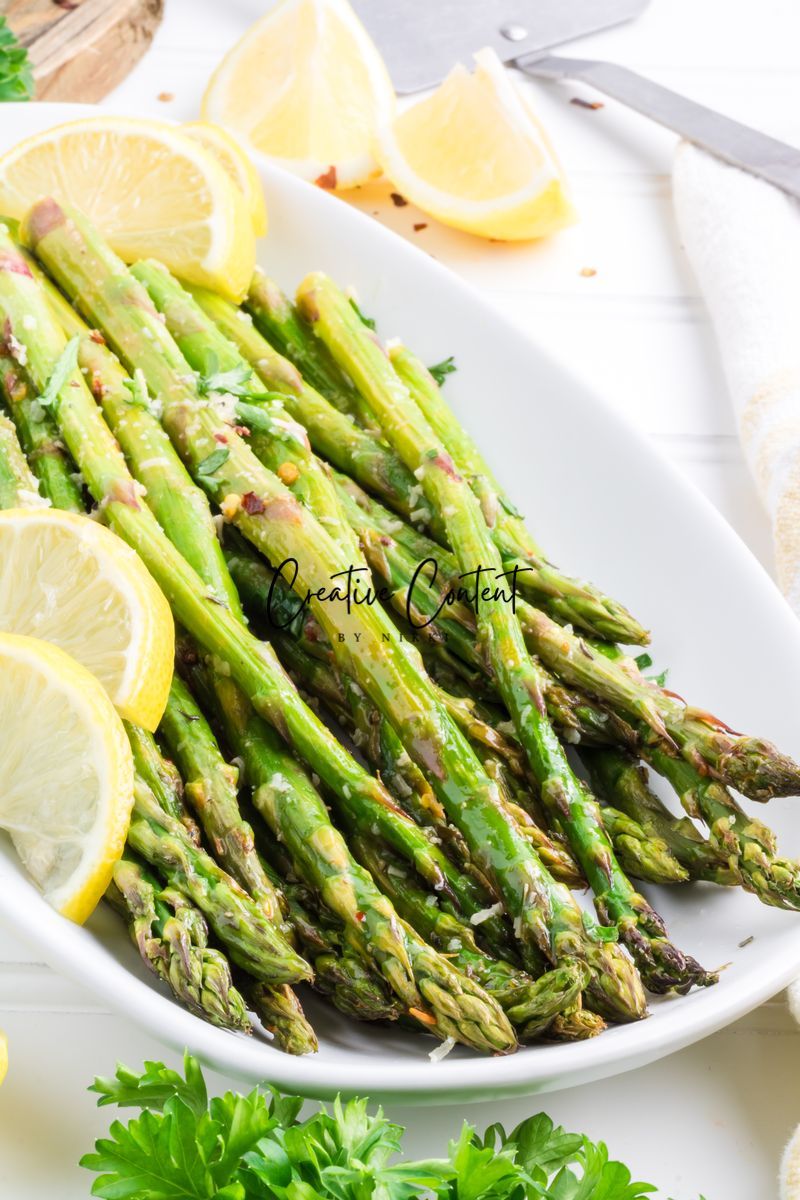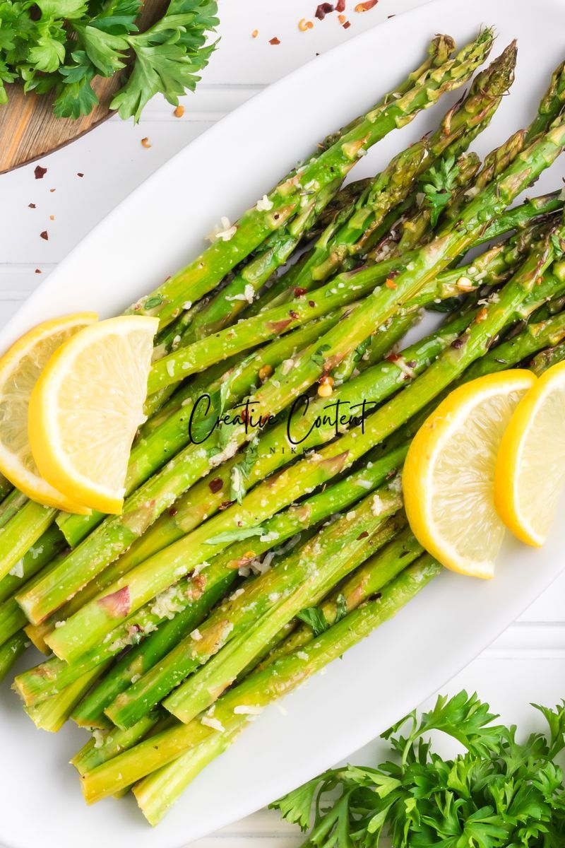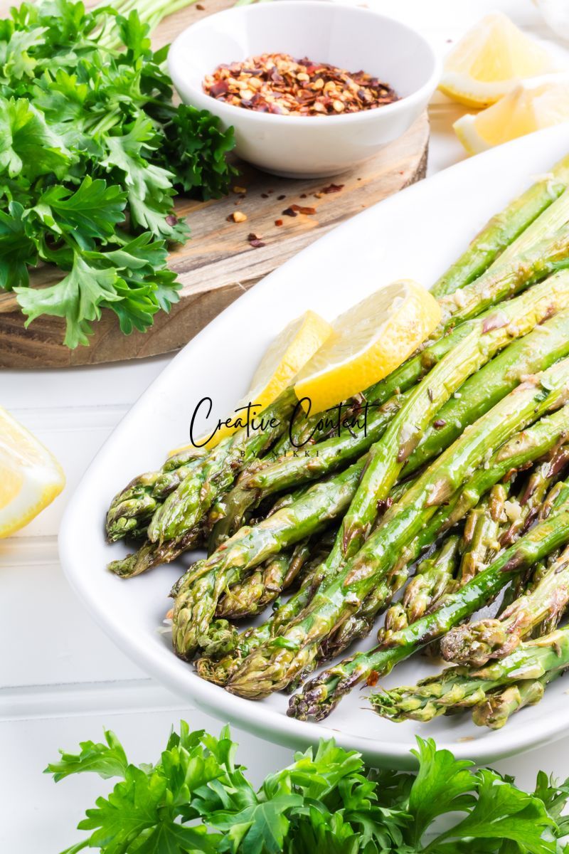 This oven-roasted asparagus side dish is made with just a few ingredients that will be the star of the show. The roasted asparagus is topped with parmesan cheese, red pepper flakes, and garlic seasoning. The lemon juice brings out the freshness of the asparagus.