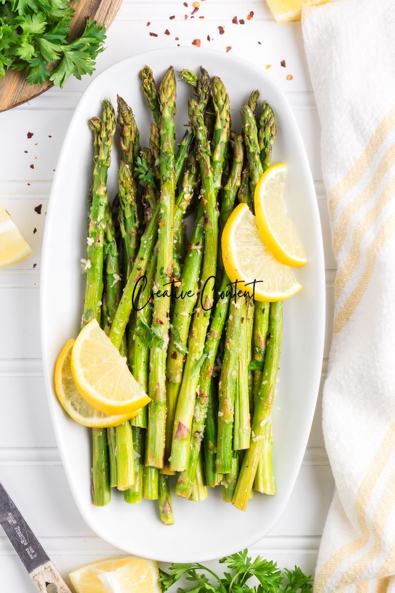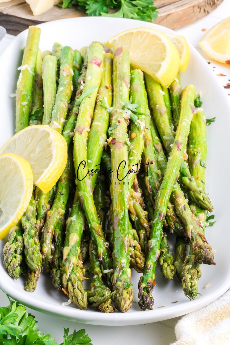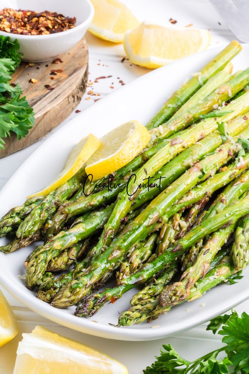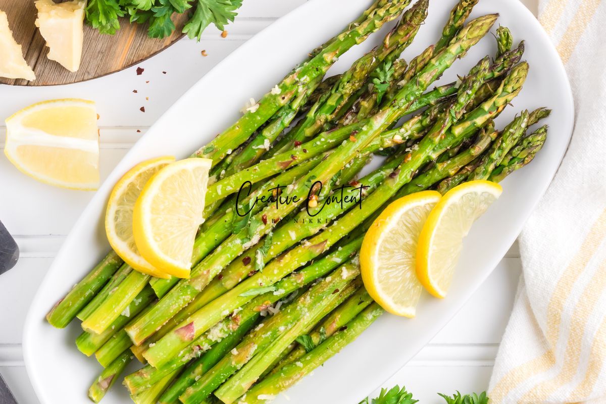This oven-roasted asparagus side dish is made with just a few ingredients that will be the star of the show. The roasted asparagus is topped with parmesan cheese, red pepper flakes, and garlic seasoning. The lemon juice brings out the freshness of the asparagus.