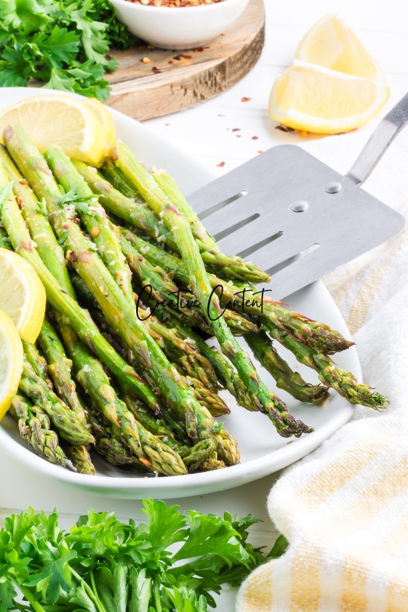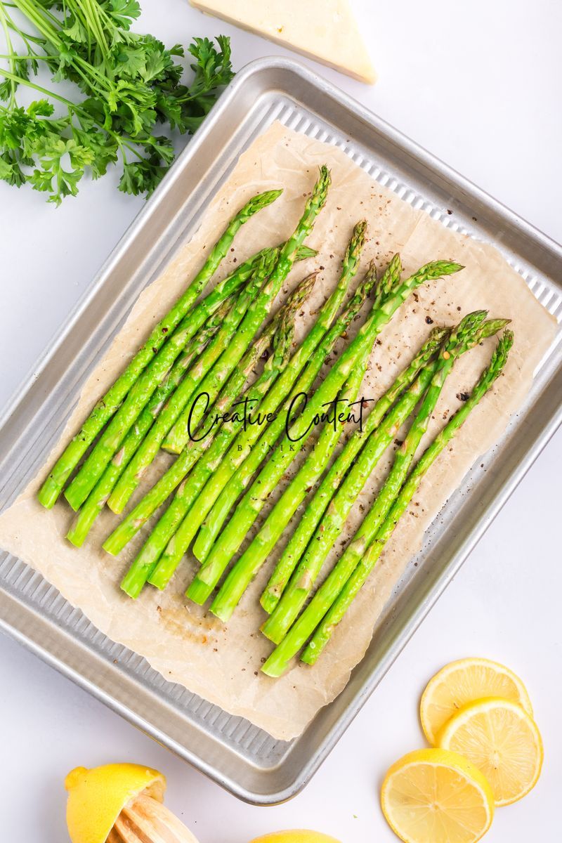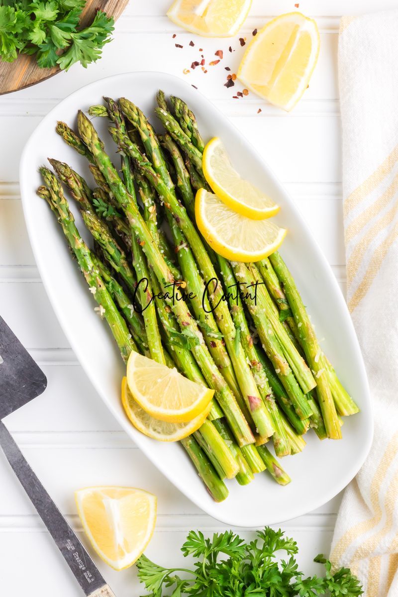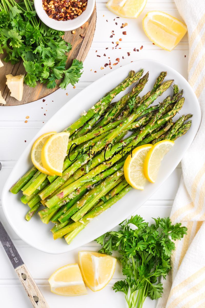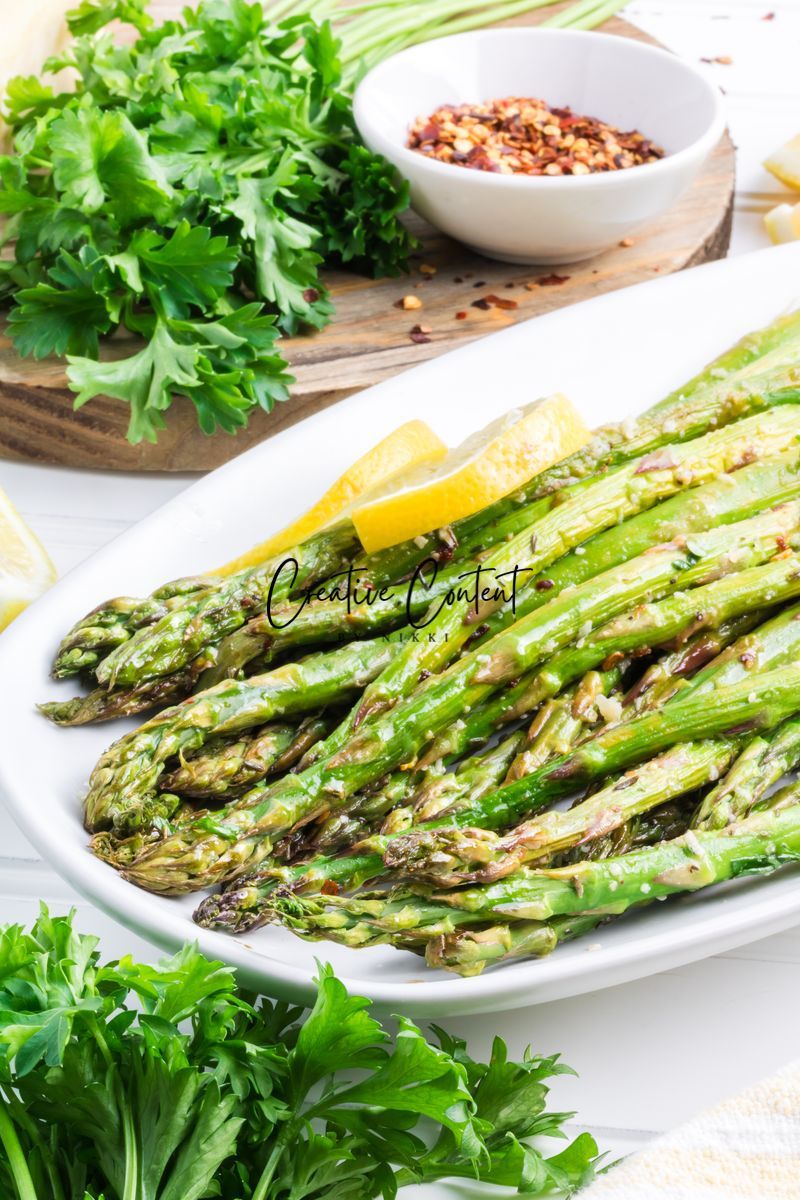 This oven-roasted asparagus side dish is made with just a few ingredients that will be the star of the show. The roasted asparagus is topped with parmesan cheese, red pepper flakes, and garlic seasoning. The lemon juice brings out the freshness of the asparagus.