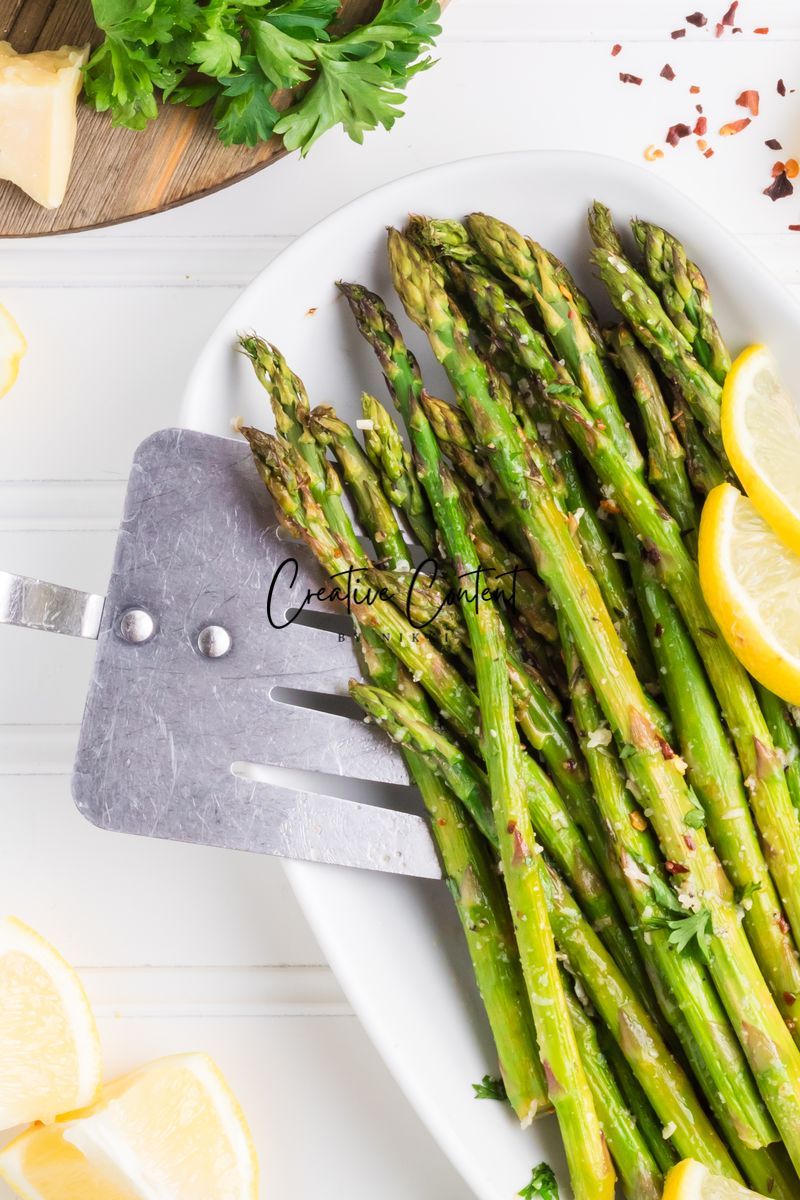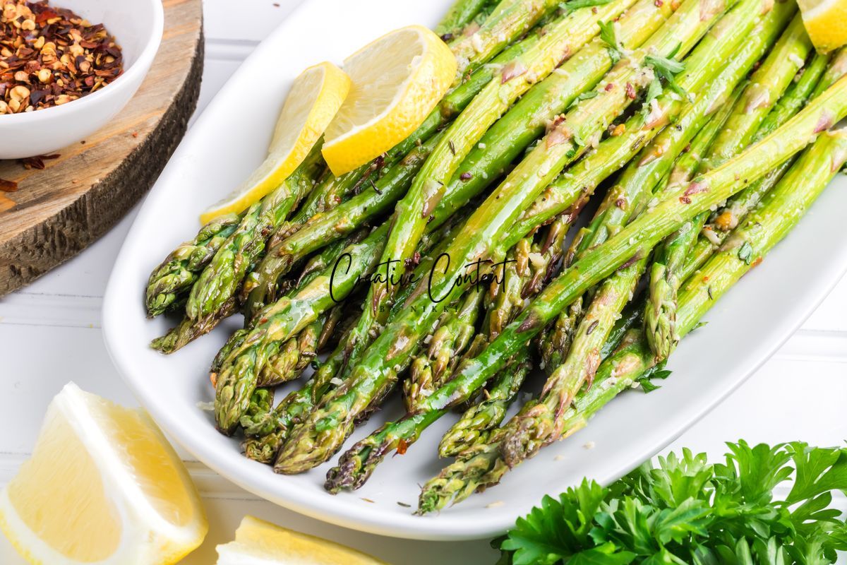 Featured Ingredients; asparagus, avocado oil, butter, lemon juice, garlic powder, coarse kosher salt, black pepper, red pepper flakes, and parmesan cheese.