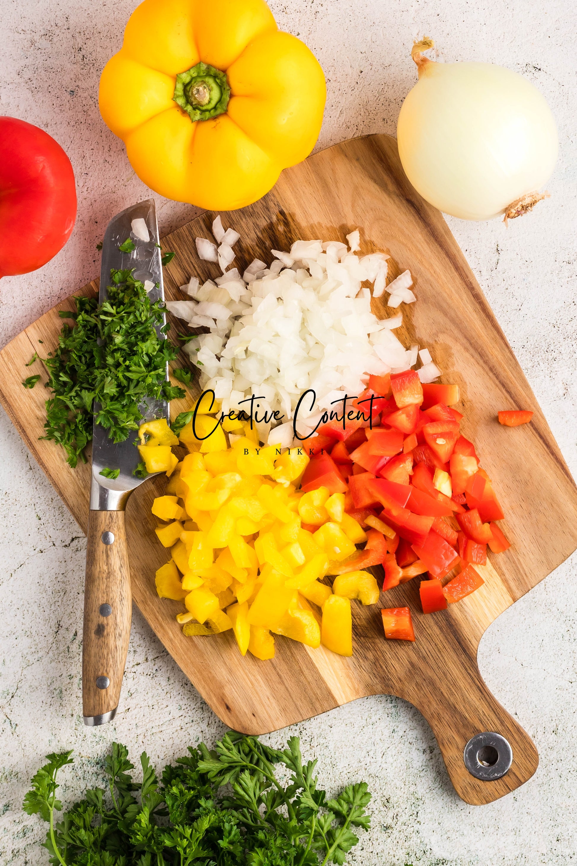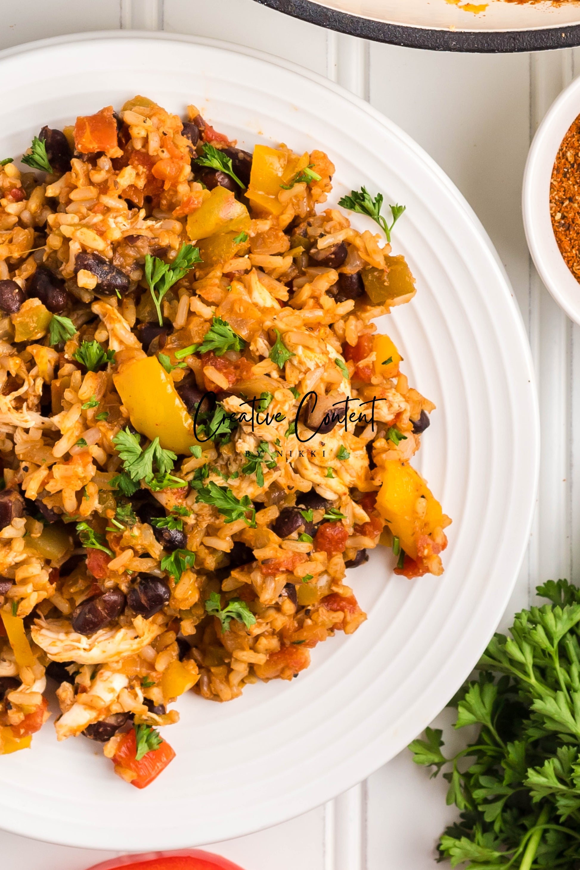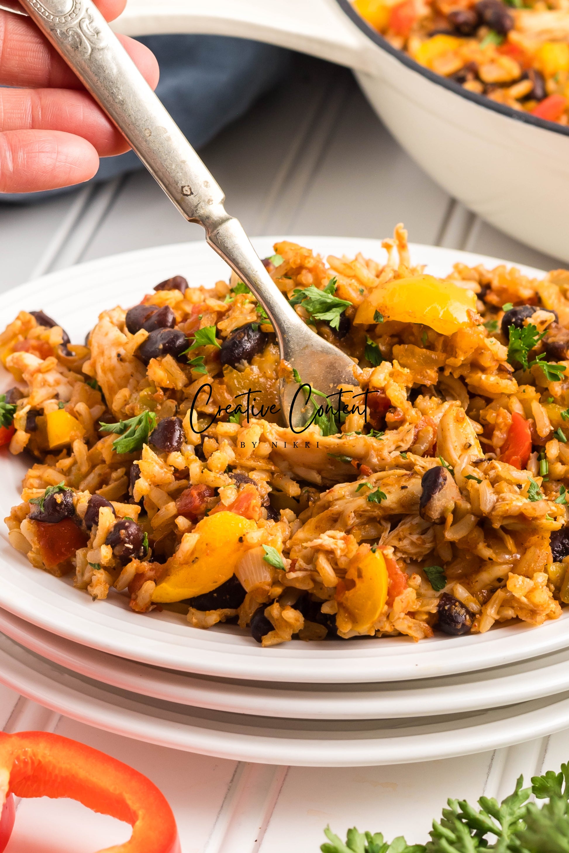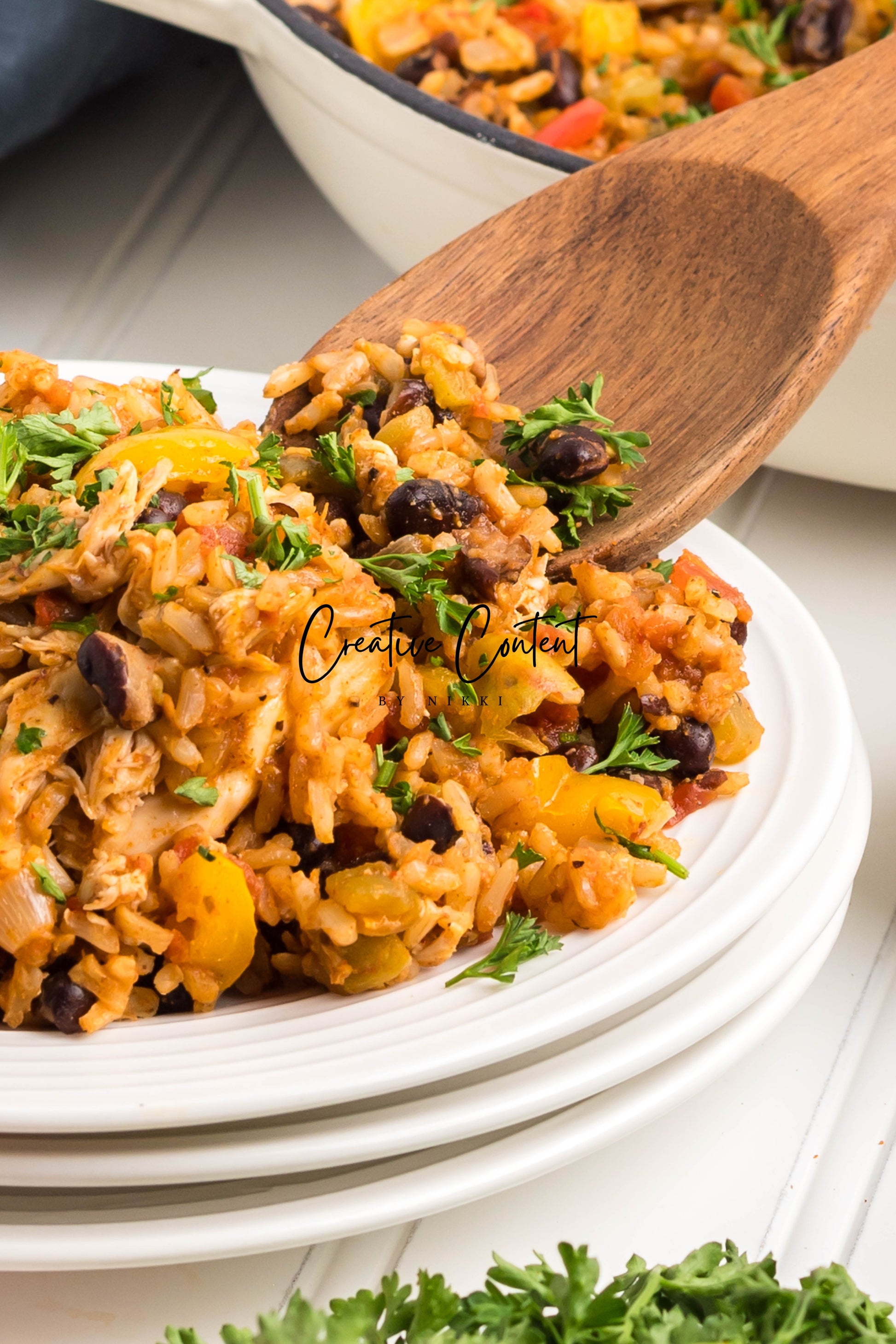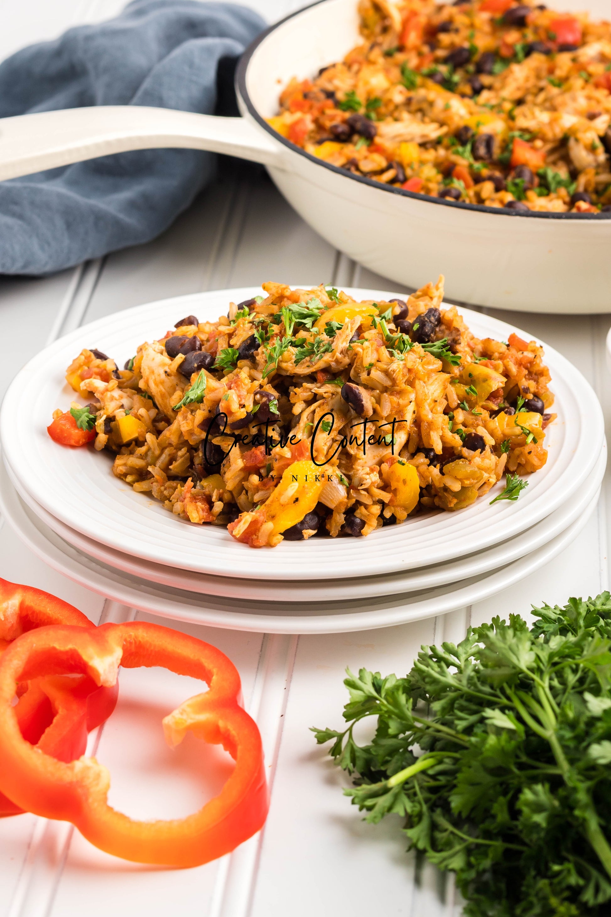 This fiesta chicken brings together onions, bell peppers, green chiles, seasonings, and brown rice for a delicious dish. It's perfect for a weeknight dinner or meal prepping for the week.