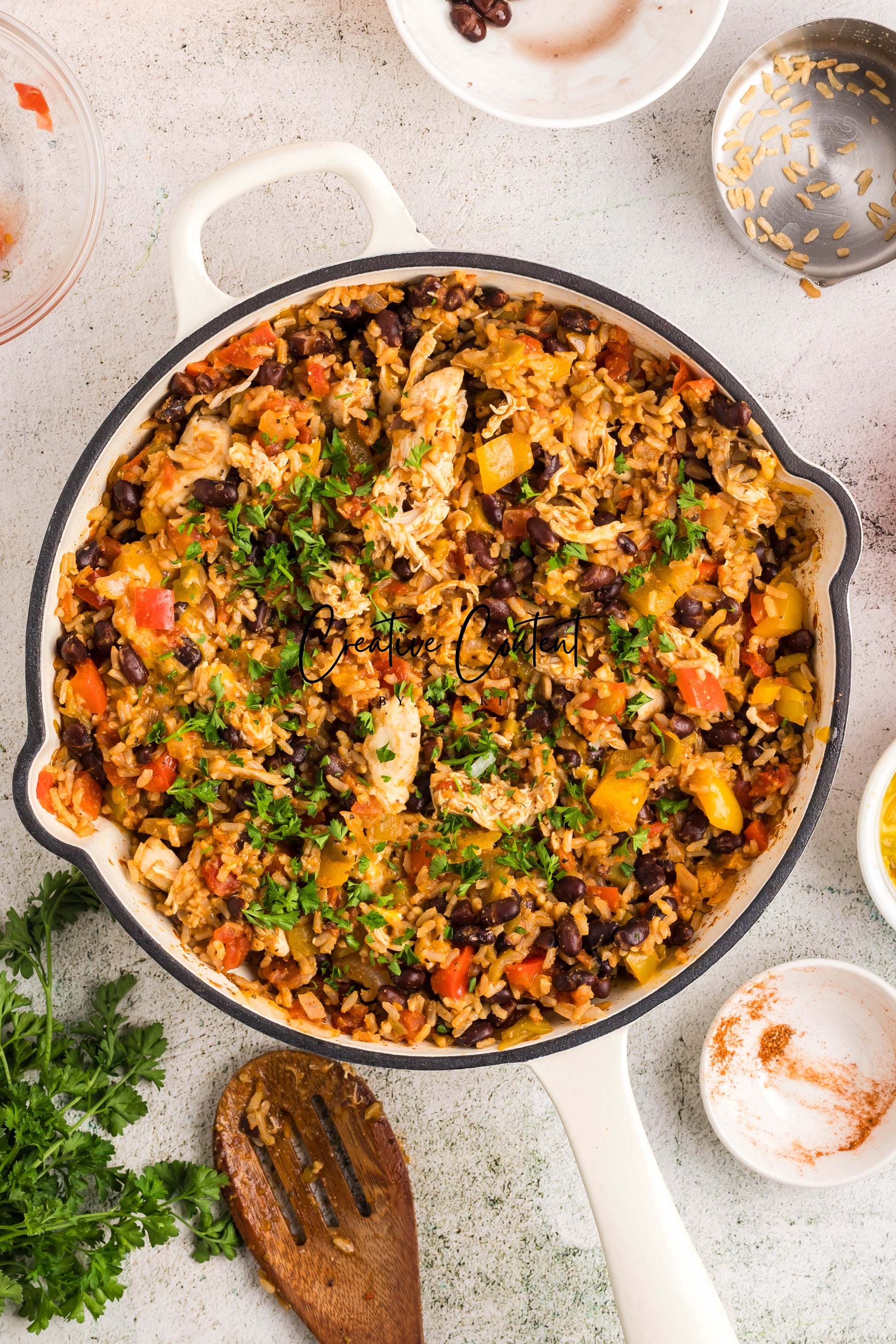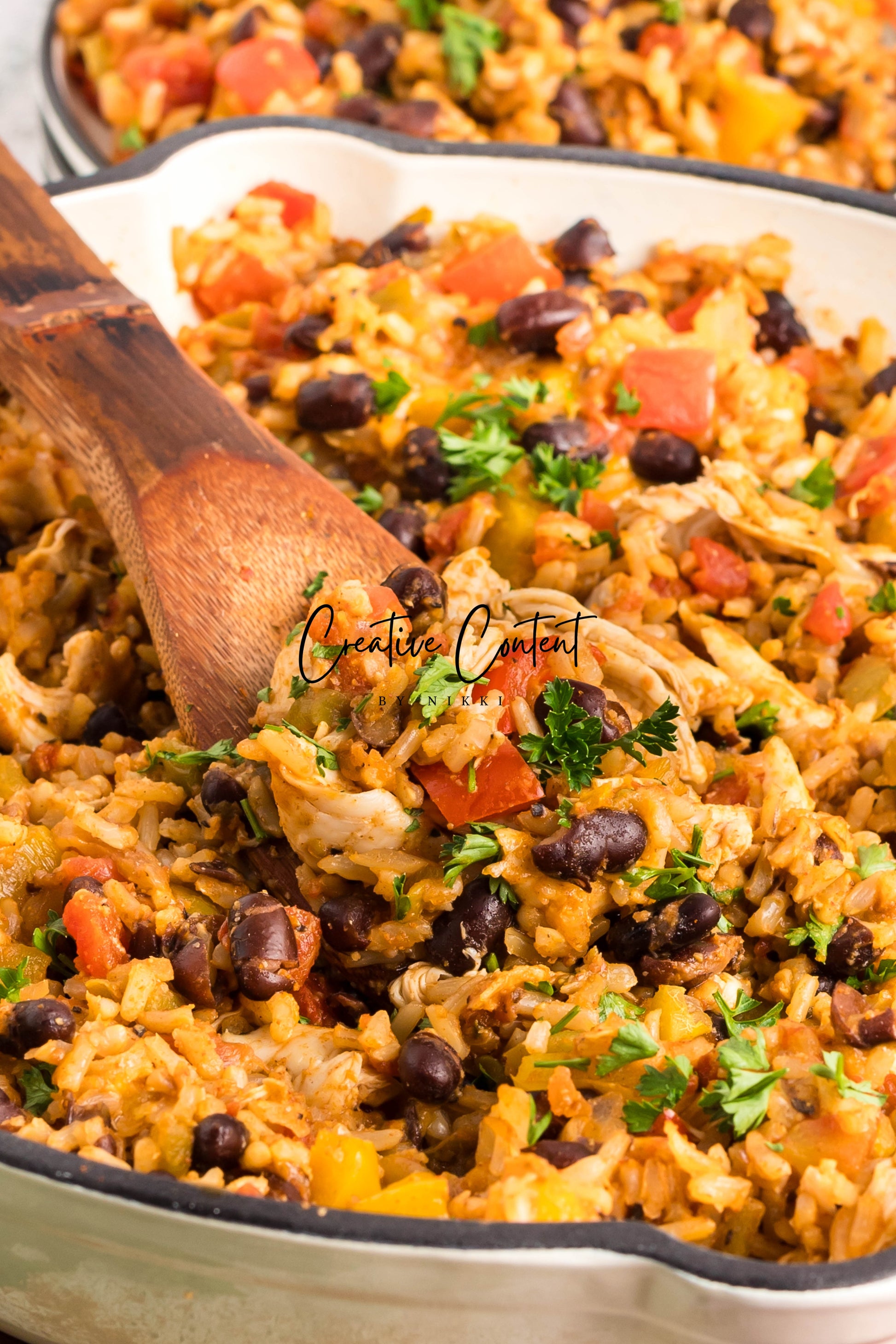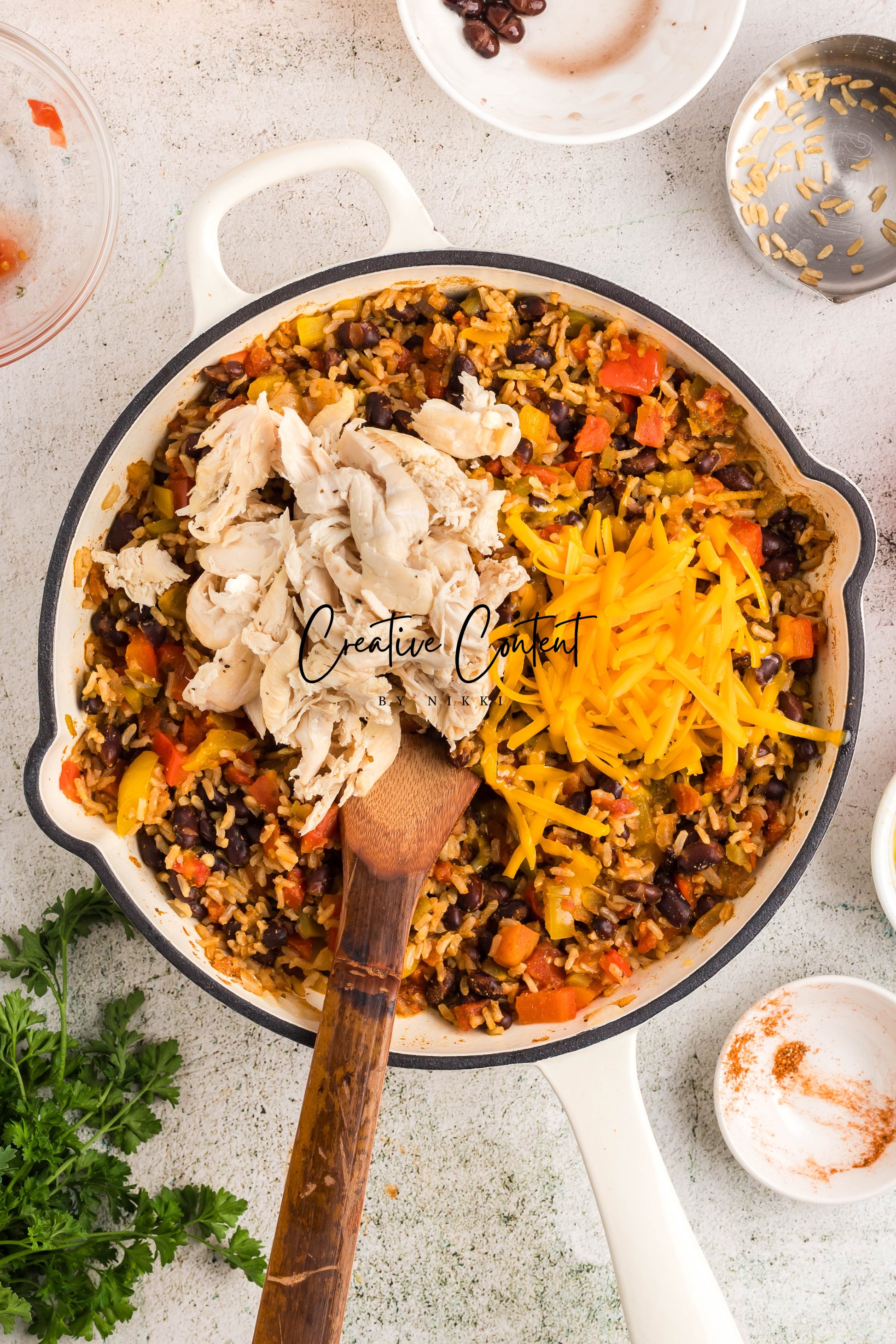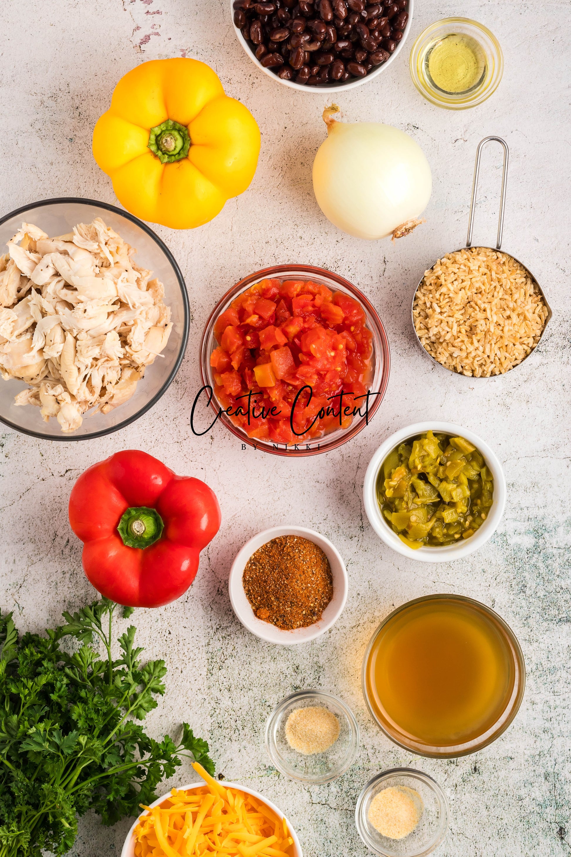 - Featured Ingredients: avocado oil, yellow onion, bell peppers, black beans, diced tomatoes, green chiles, instant brown rice, chicken stock, seasonings, shredded chicken, and cheddar cheese.