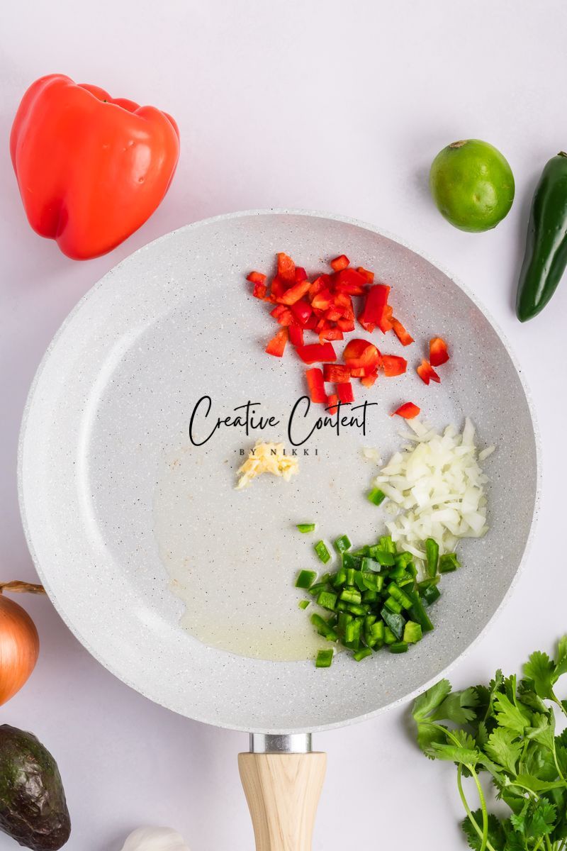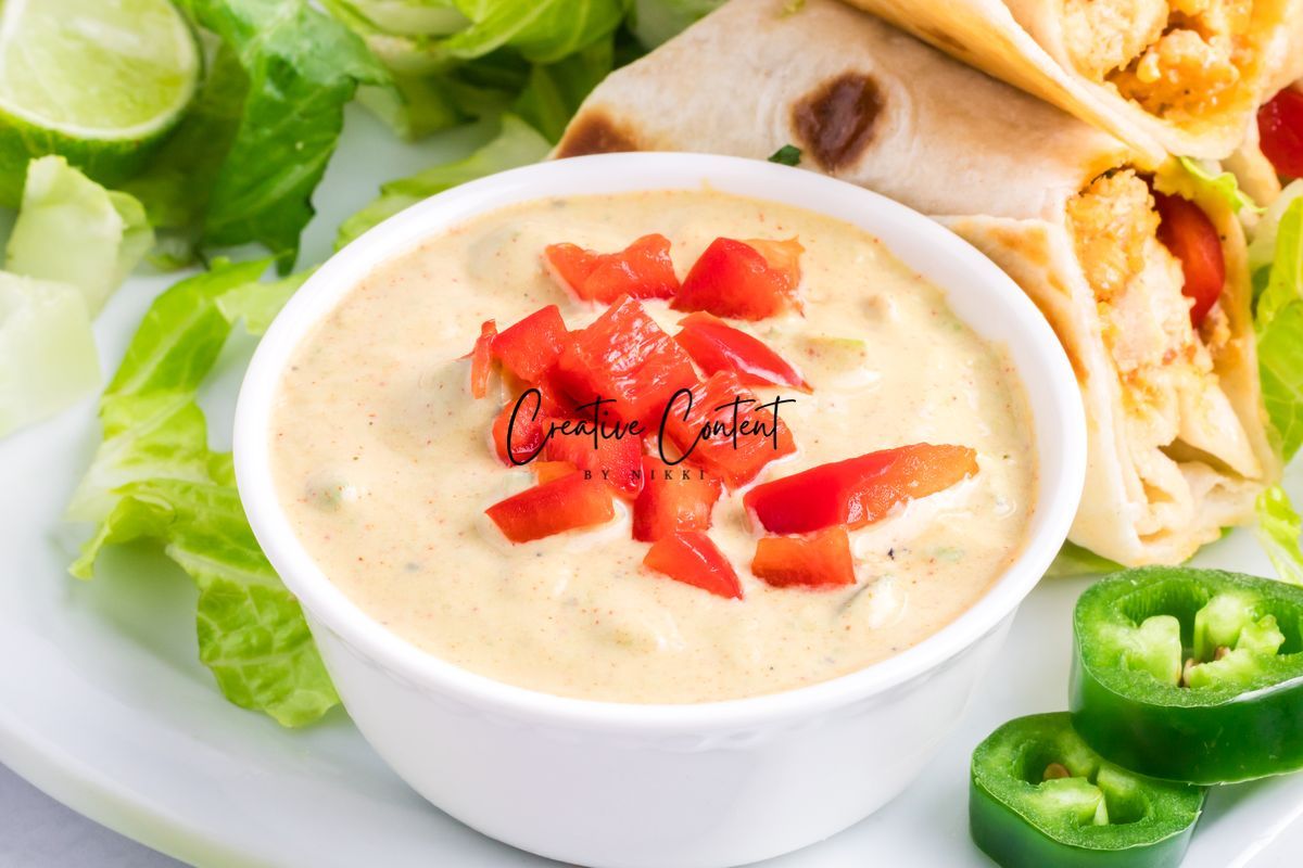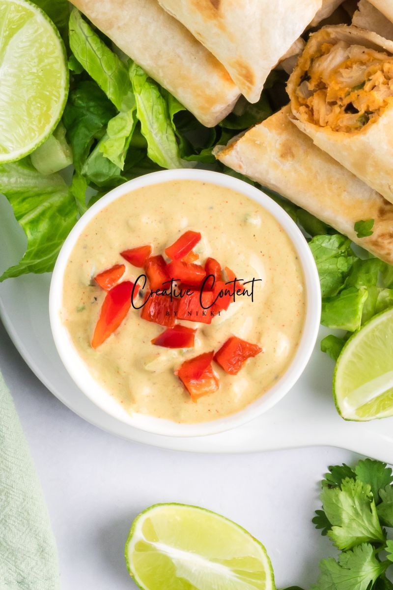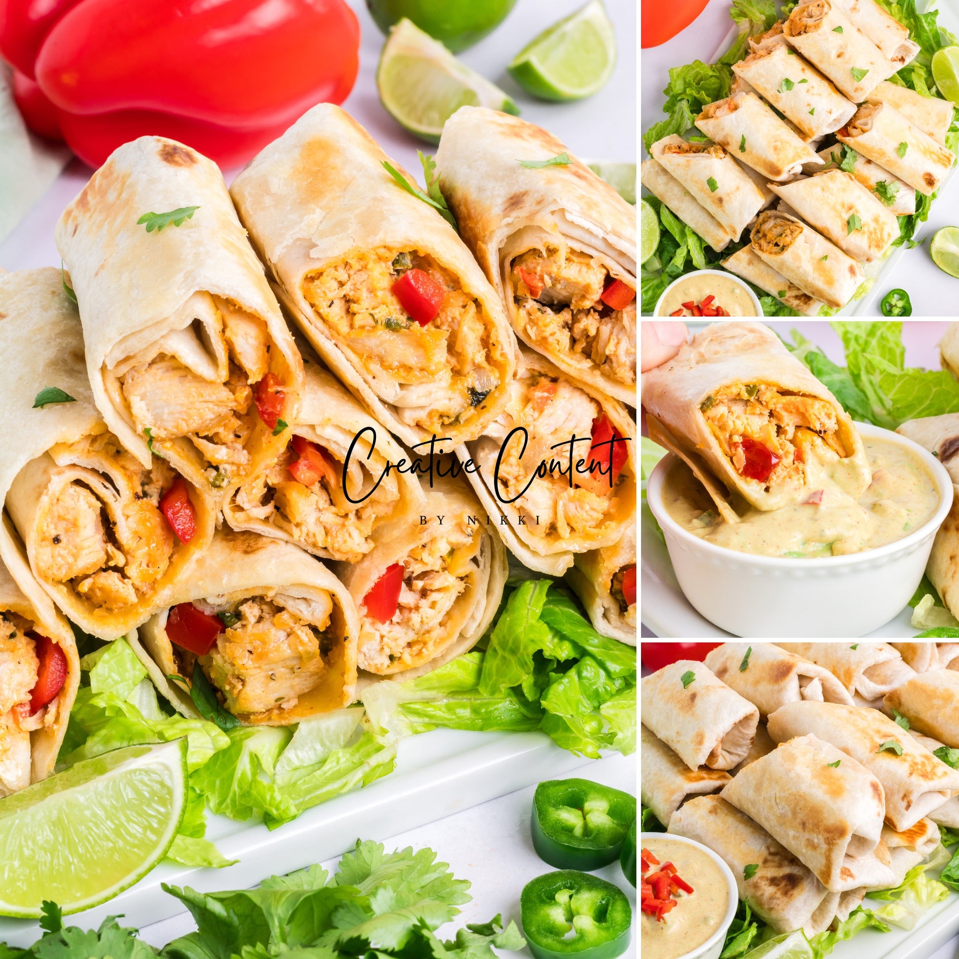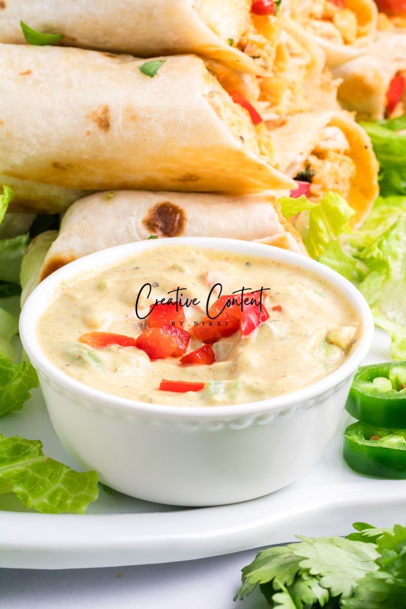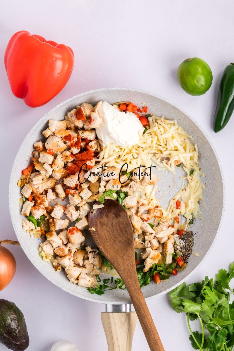 Featured Ingredients; sour cream, mayonnaise, avocado, lime juice, coarse kosher salt, black pepper, paprika, jalapenos, cayenne pepper, cooked chicken, red bell pepper, yellow onion, avocado oil, garlic clove, pepper jack cheese, cream cheese, paprika, cilantro, and 7 inch flour tortilla shells.