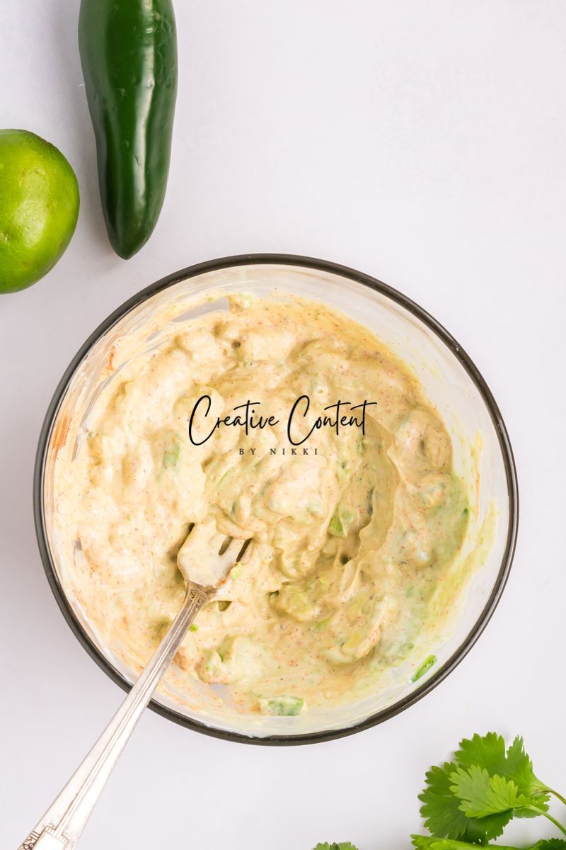 Featured Ingredients; sour cream, mayonnaise, avocado, lime juice, coarse kosher salt, black pepper, paprika, jalapenos, cayenne pepper, cooked chicken, red bell pepper, yellow onion, avocado oil, garlic clove, pepper jack cheese, cream cheese, paprika, cilantro, and 7 inch flour tortilla shells.