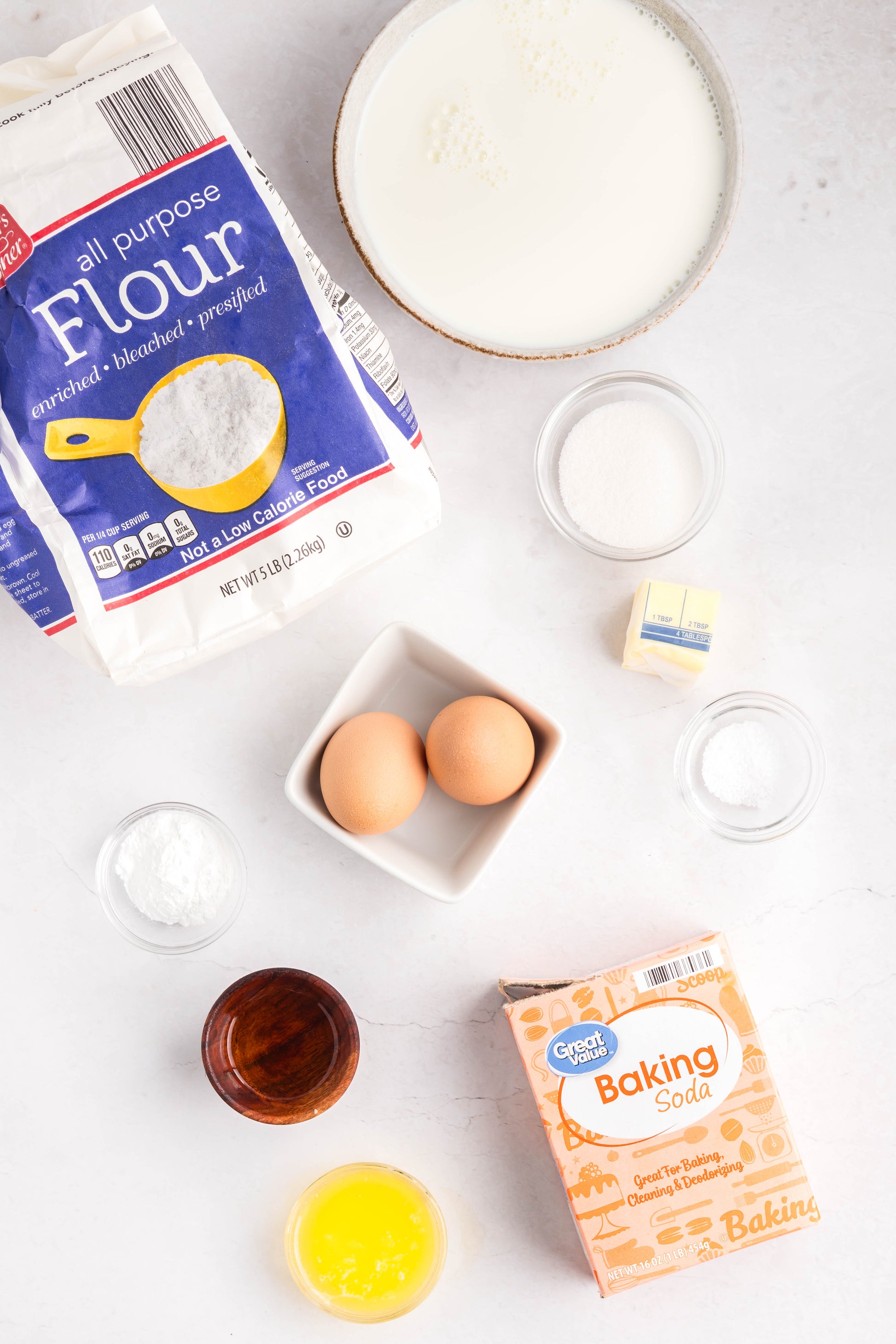 - Ingredients:all-purpose flour, baking powder, baking soda, coarse kosher salt, buttermilk, eggs, unsalted butter, white granulated sugar, and vanilla.