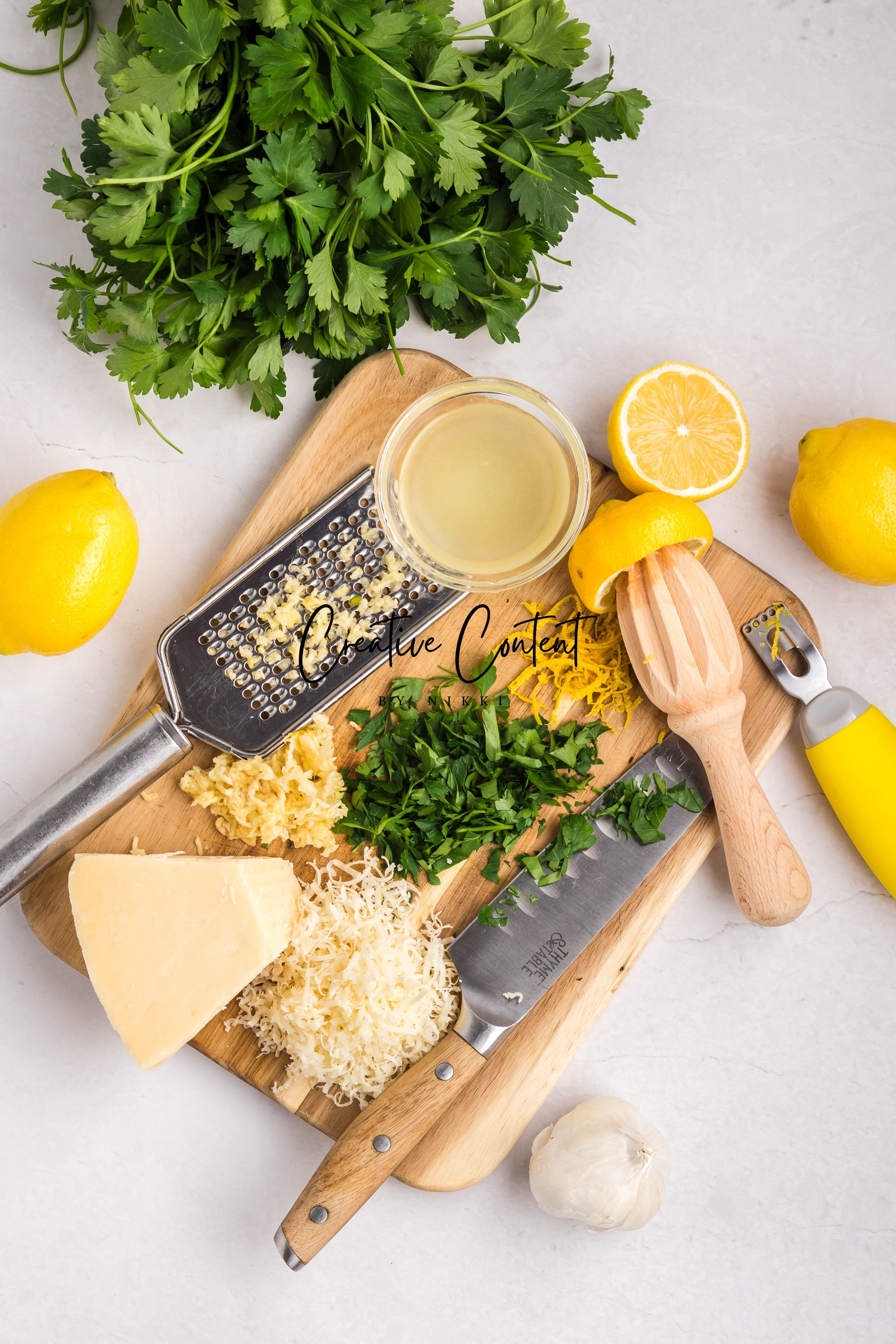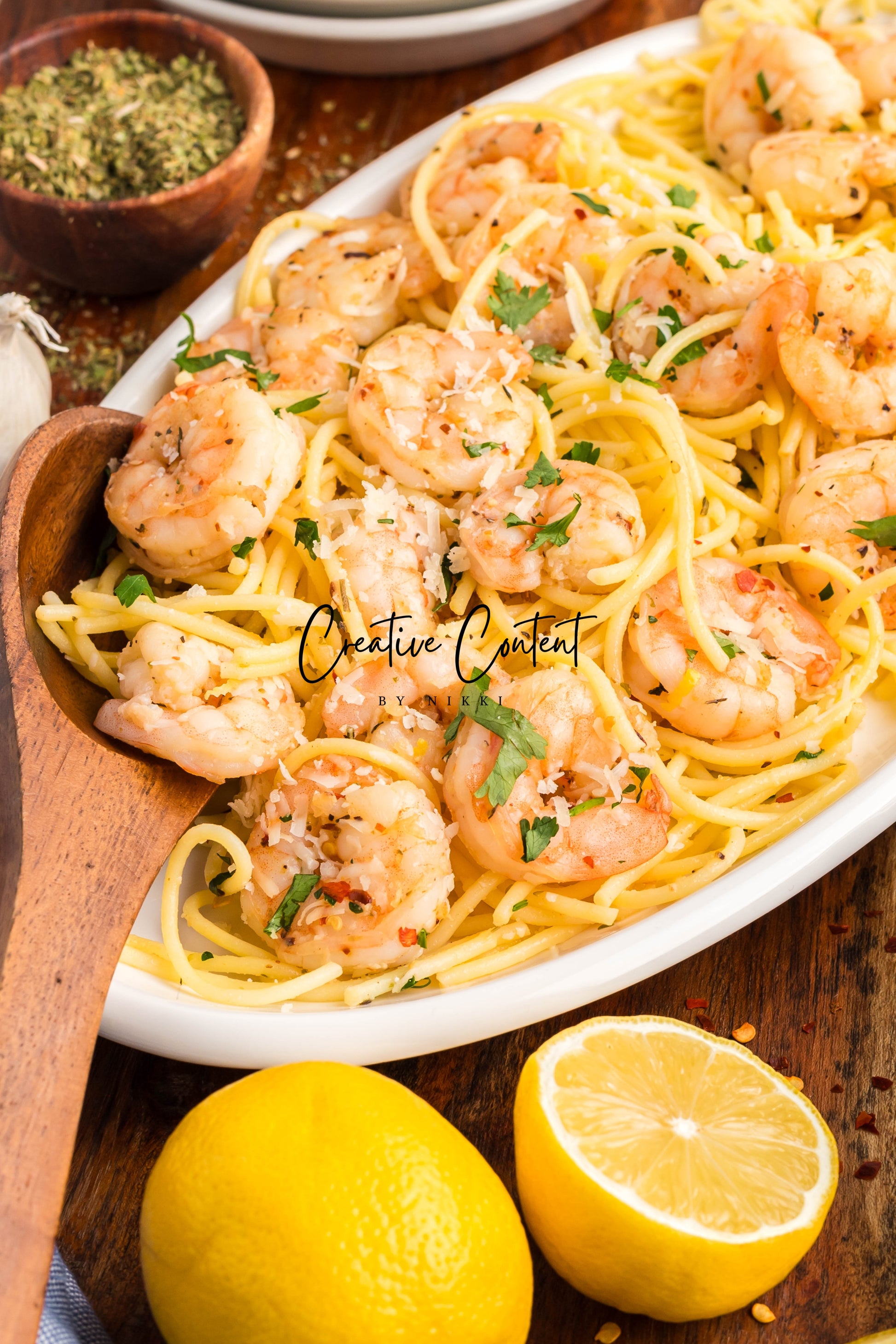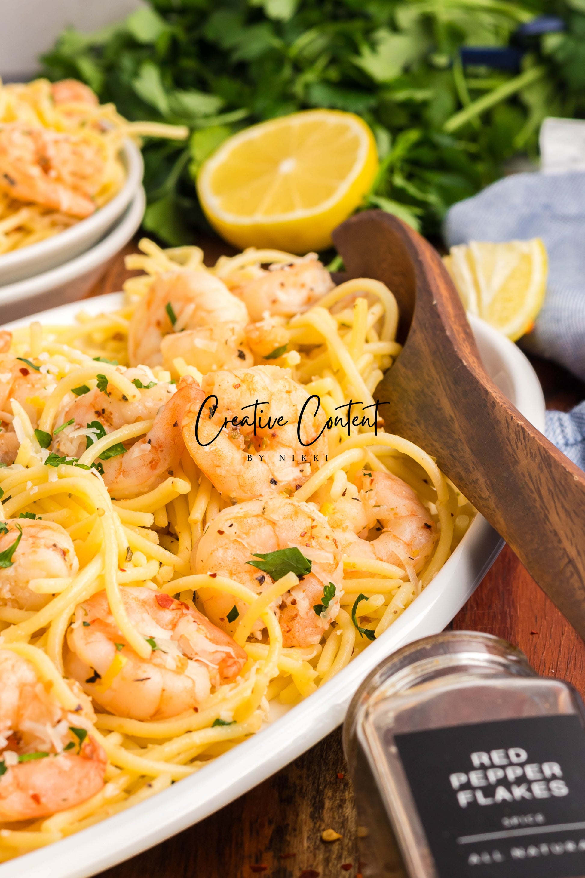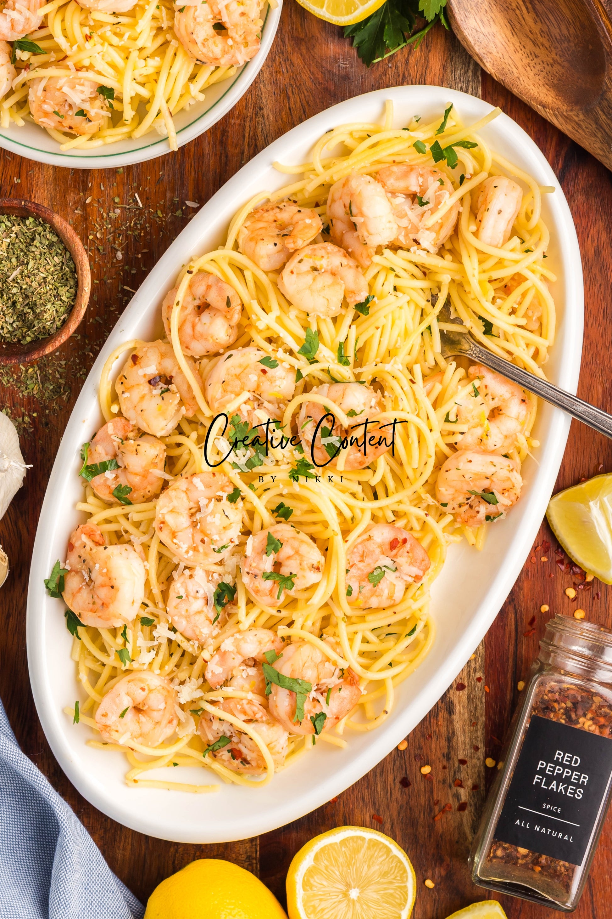 - Ingredients: spaghetti, butter, avocado oil, shrimp, salt, black pepper, crushed red pepper, garlic, dry white wine, lemon juice, lemon zest, parmesan cheese, parsley