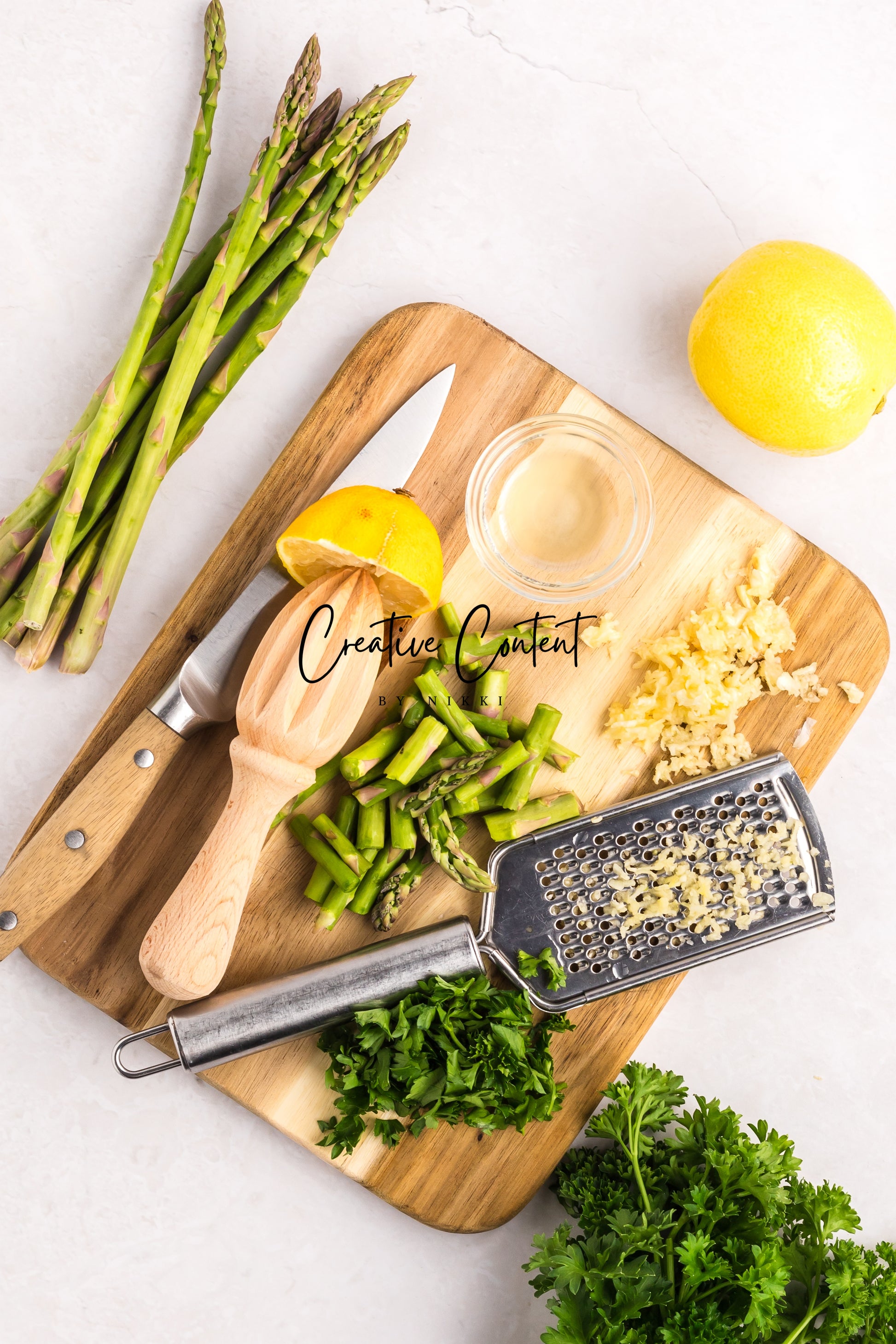 - Featured Ingredients; long pasta, butter, avocado oil, shrimp, garlic, red pepper flakes, lemon, coarse kosher salt, black pepper, asparagus, cherry tomatoes, parmesan cheese, parsley, and Italian seasoning.
