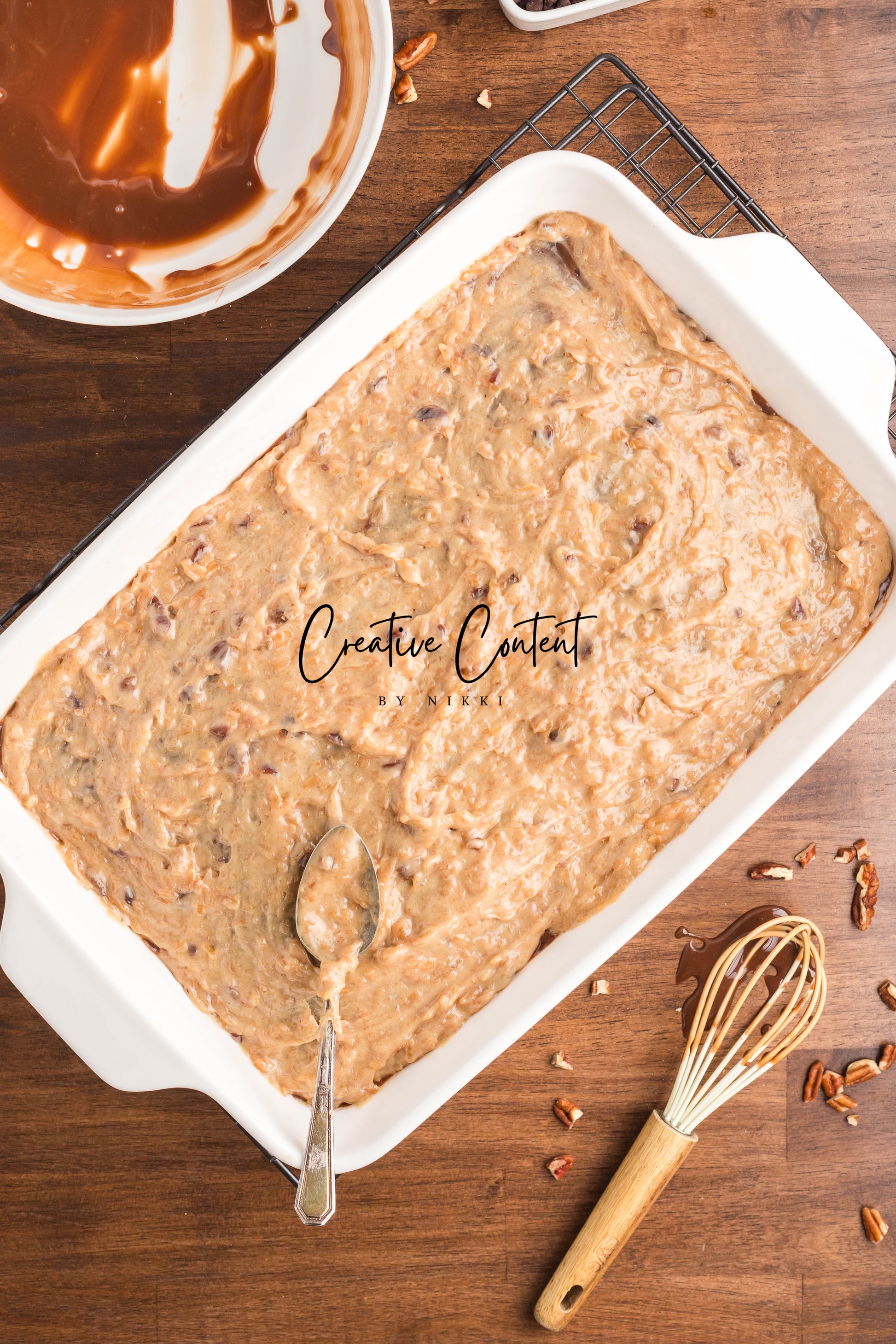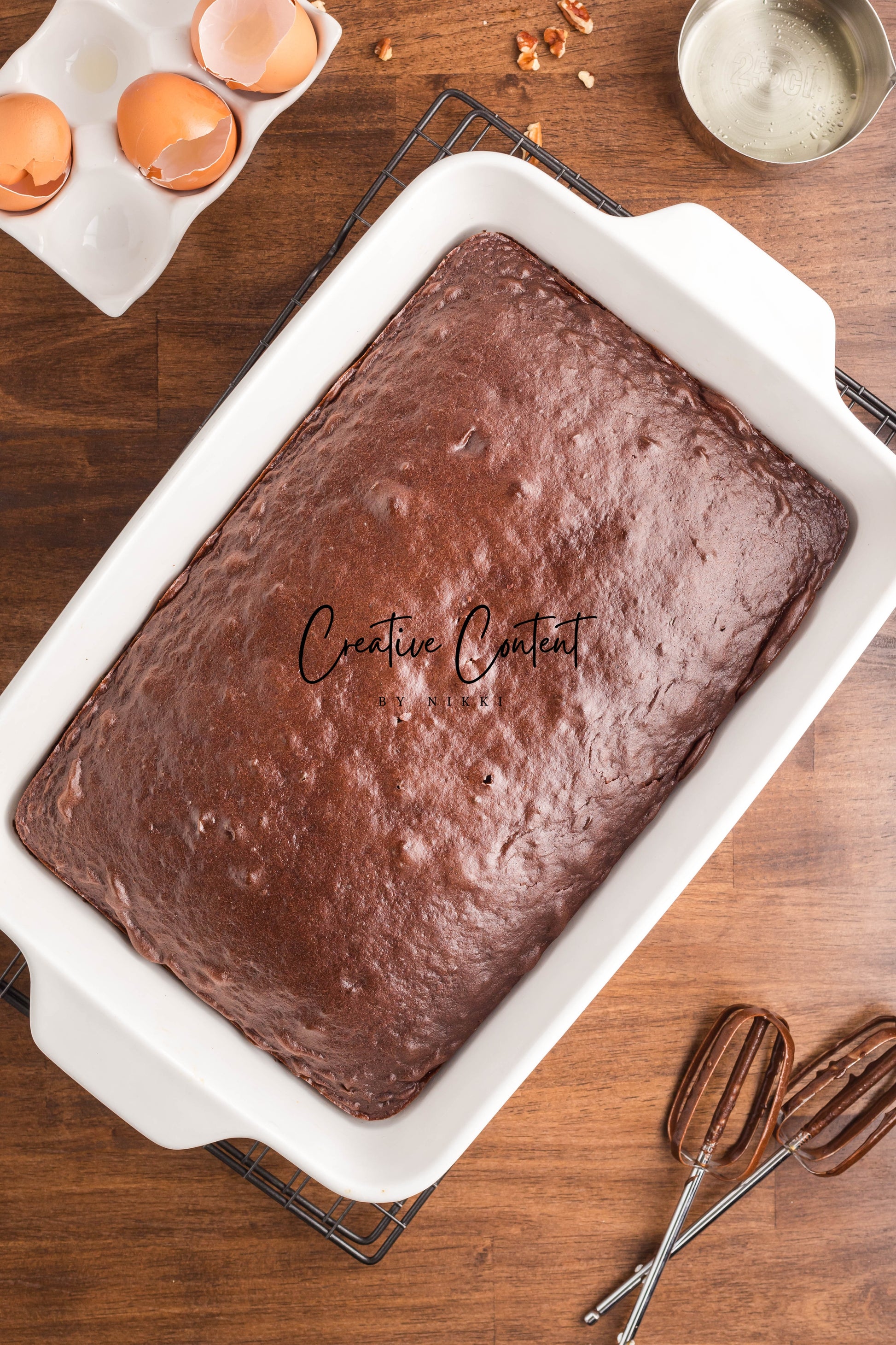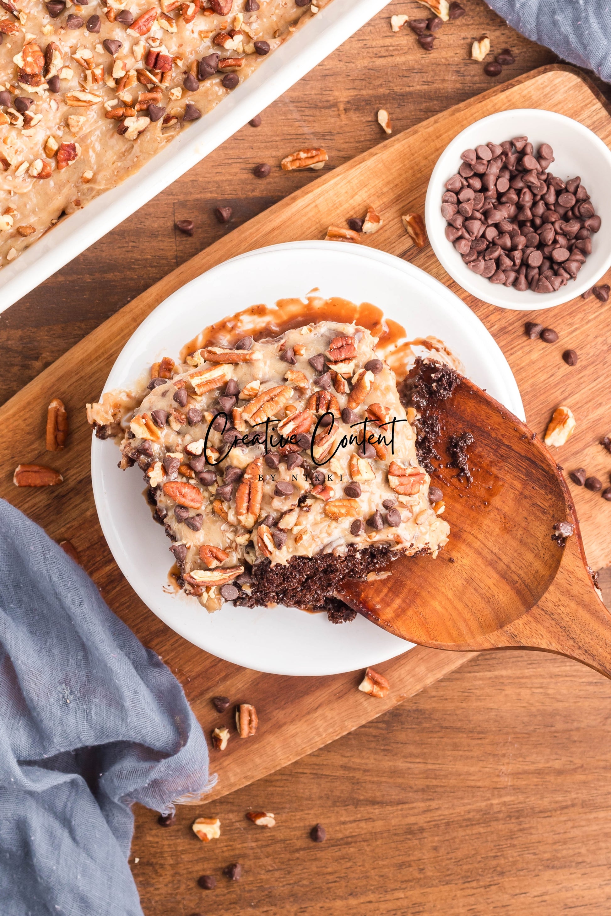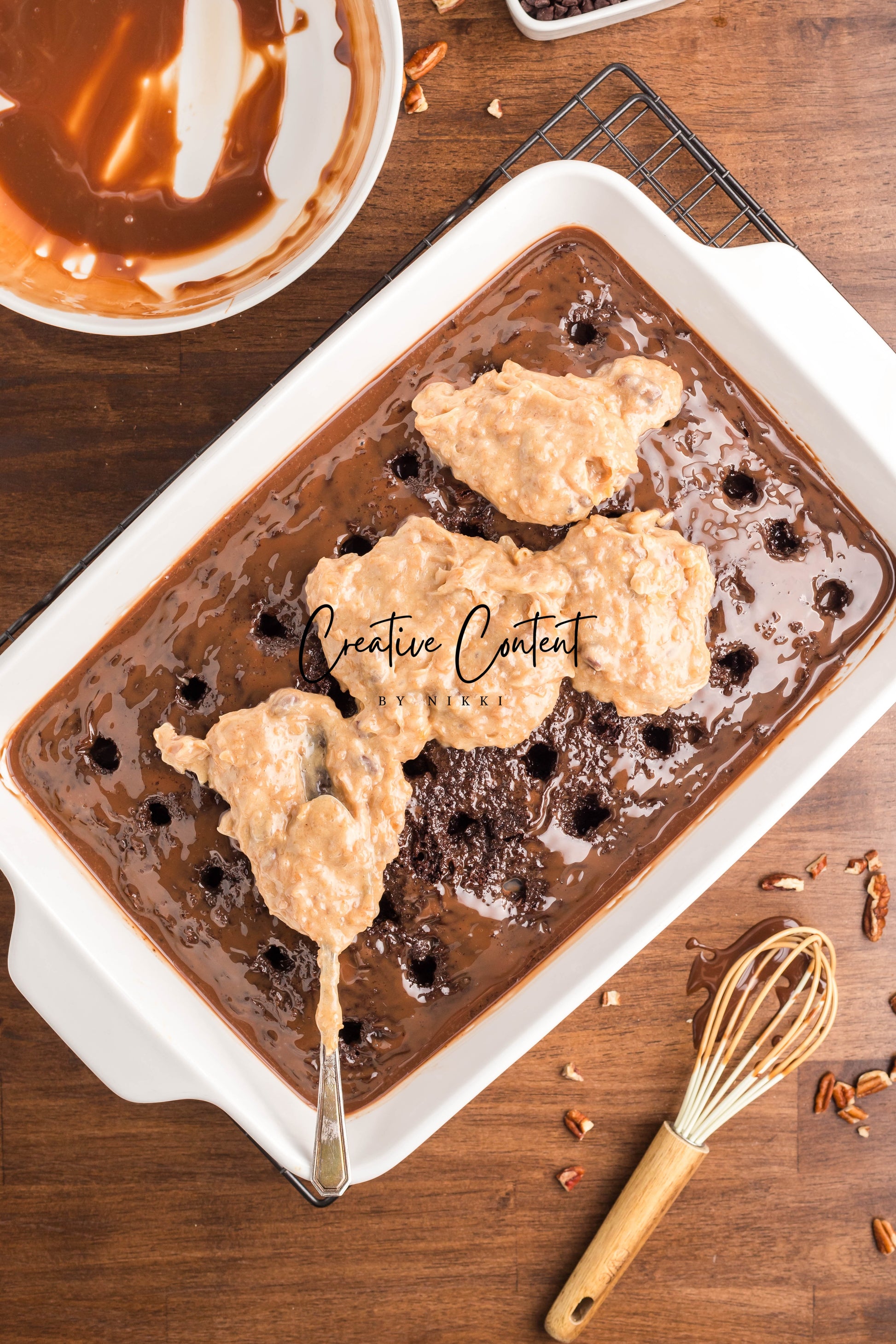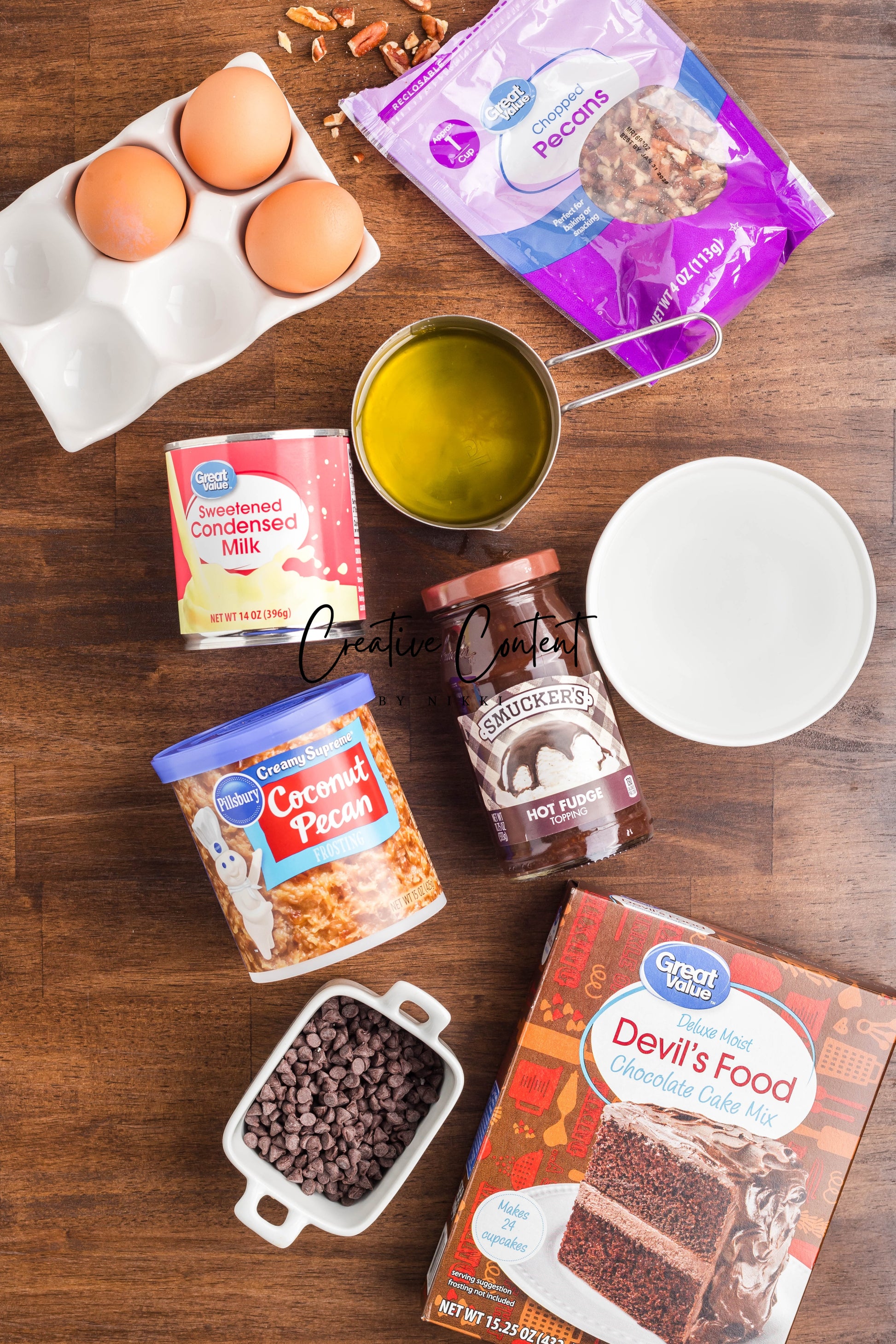 - Ingredients: chocolate cake mix, water, vegetable oil, eggs, sweetened condensed milk, hot fudge topping, coconut pecan frosting, chopped pecans