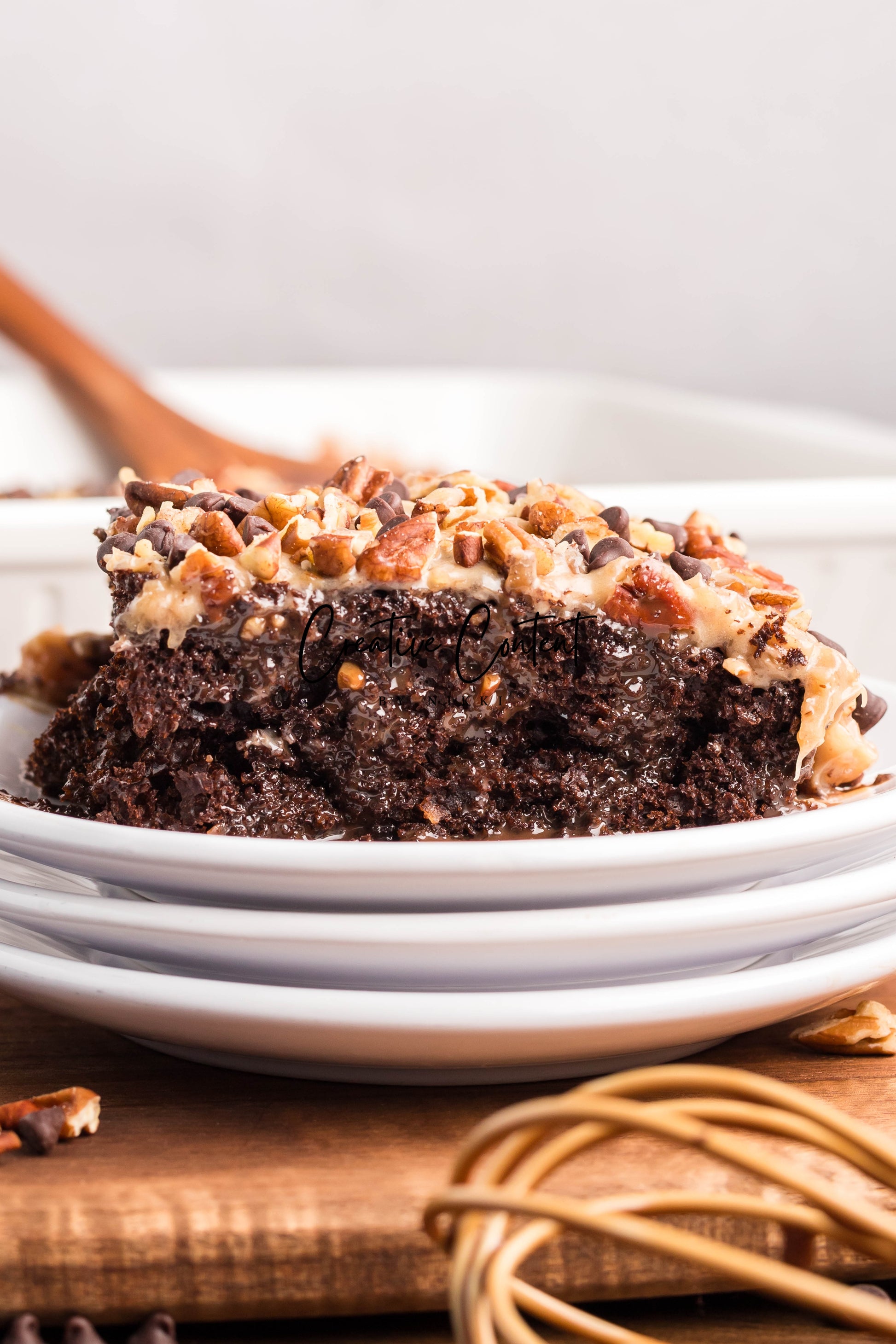 This German Chocolate Poke Cake is rich and satisfying. The cake is soaked with a sweetened warm fudge sauce, making it extra moist. A layer of coconut pecan frosting adds the perfect texture, and the chopped pecans give it a nice crunch. Every bite is packed with chocolate, caramel-like sweetness, and nutty flavor. It’s the kind of dessert that disappears fast at any gathering.