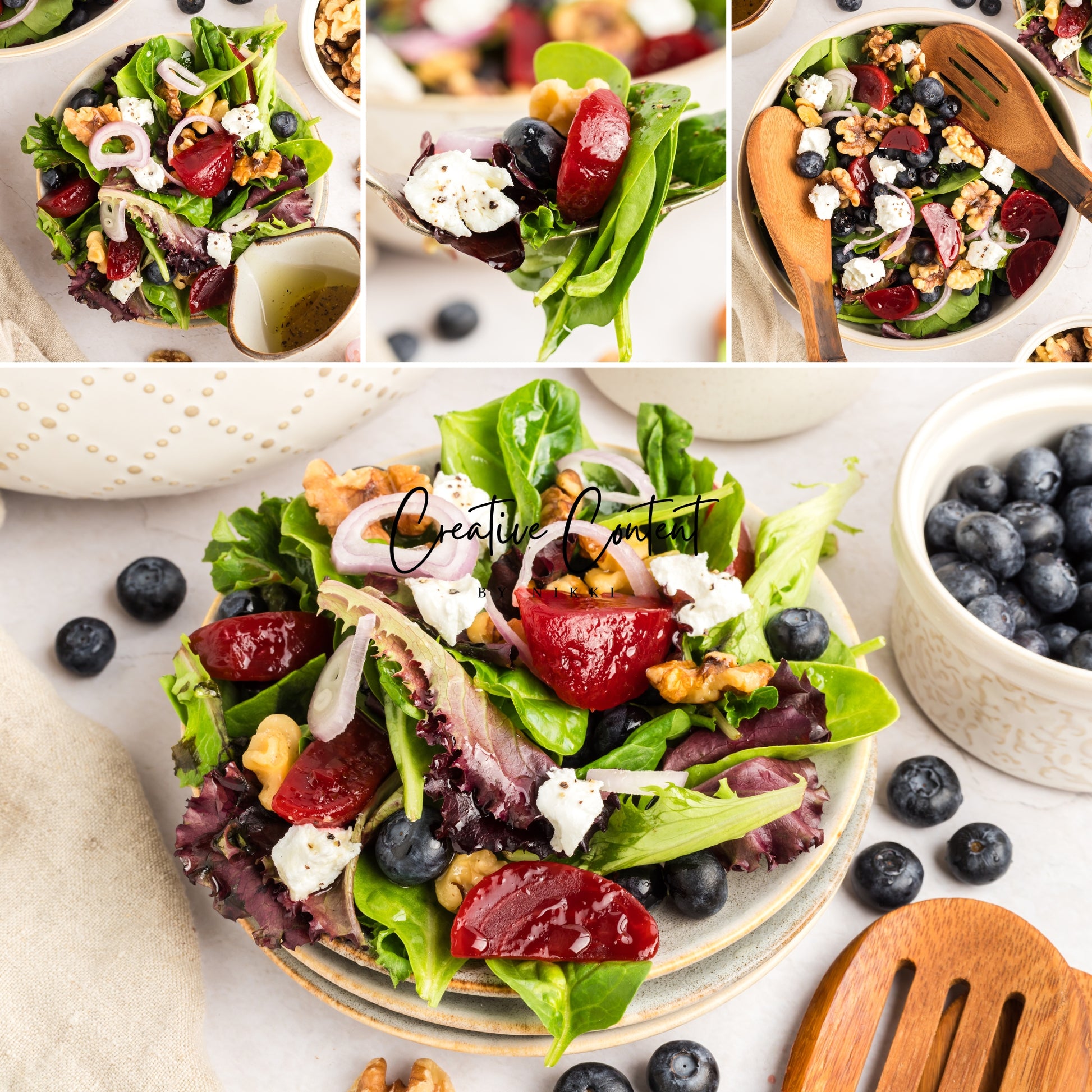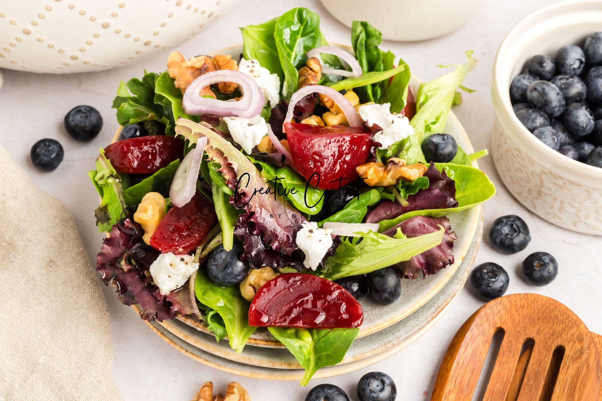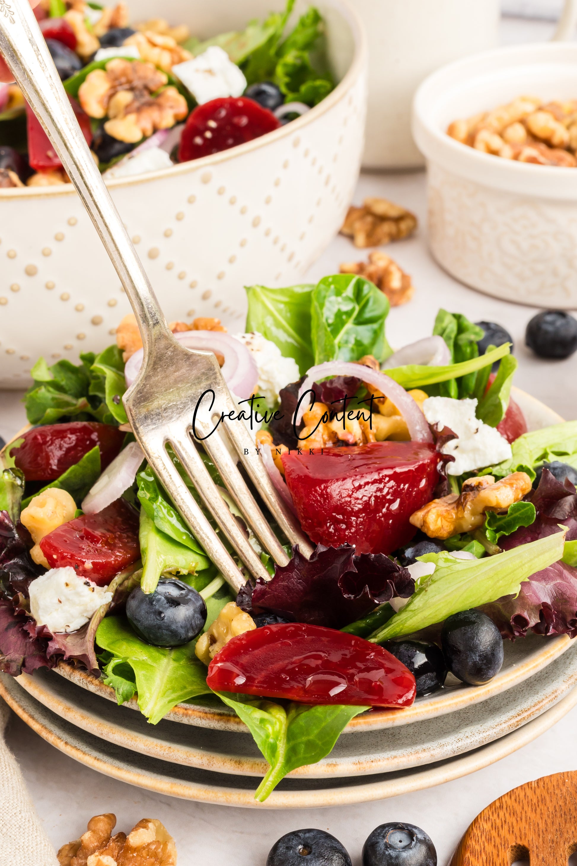 This goat cheese salad is beyond delicious with the homemade vinaigrette, fresh salad mix, salty goat cheese, and tangy beets. The sweet vinaigrette is infused with honey, fresh garlic, and shallot which creates a creamy combination for this salad. The crunchy salad with sweet blueberries, crunchy walnuts, and salty goat cheese is an explosion of flavors.