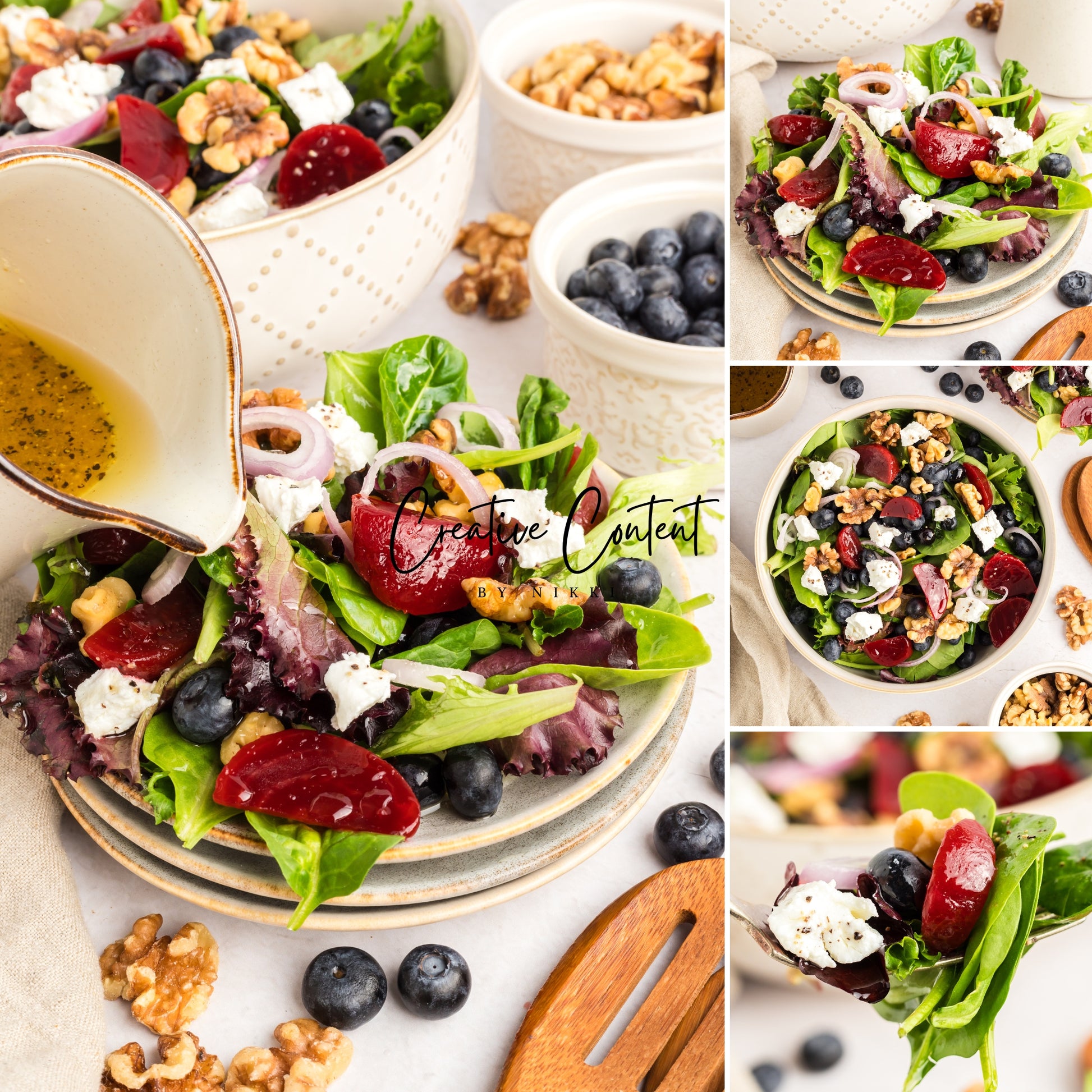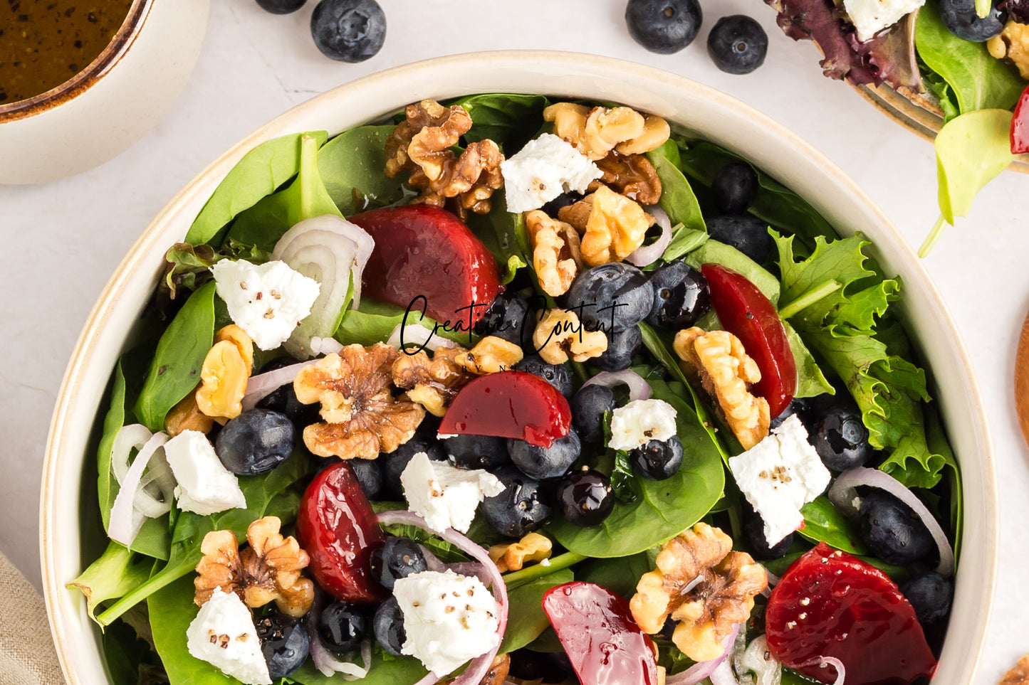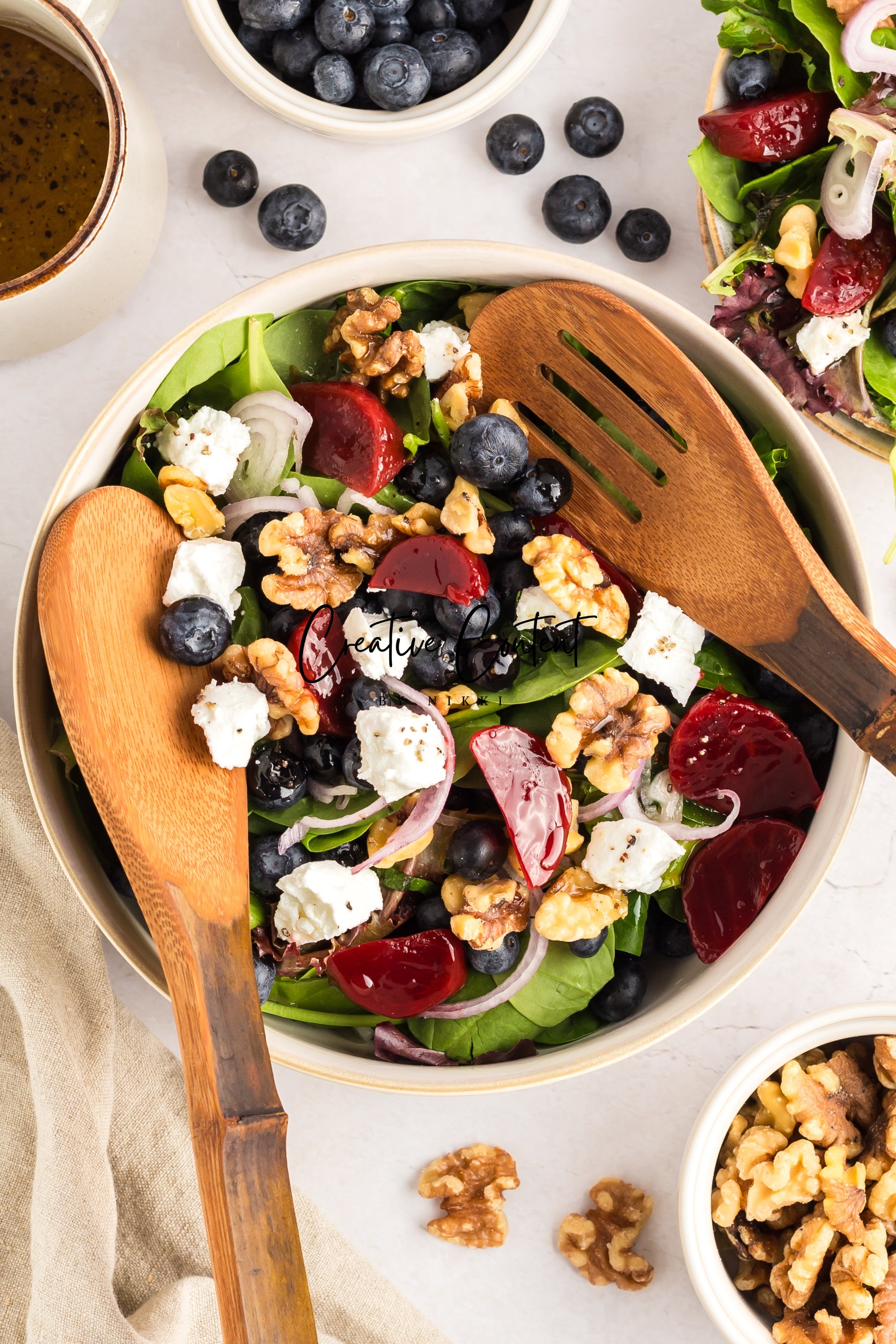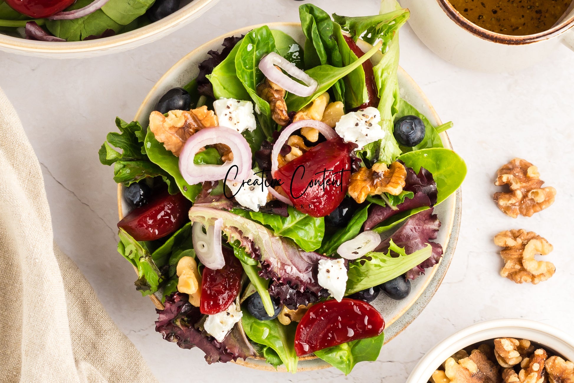 This goat cheese salad is beyond delicious with the homemade vinaigrette, fresh salad mix, salty goat cheese, and tangy beets. The sweet vinaigrette is infused with honey, fresh garlic, and shallot which creates a creamy combination for this salad. The crunchy salad with sweet blueberries, crunchy walnuts, and salty goat cheese is an explosion of flavors.