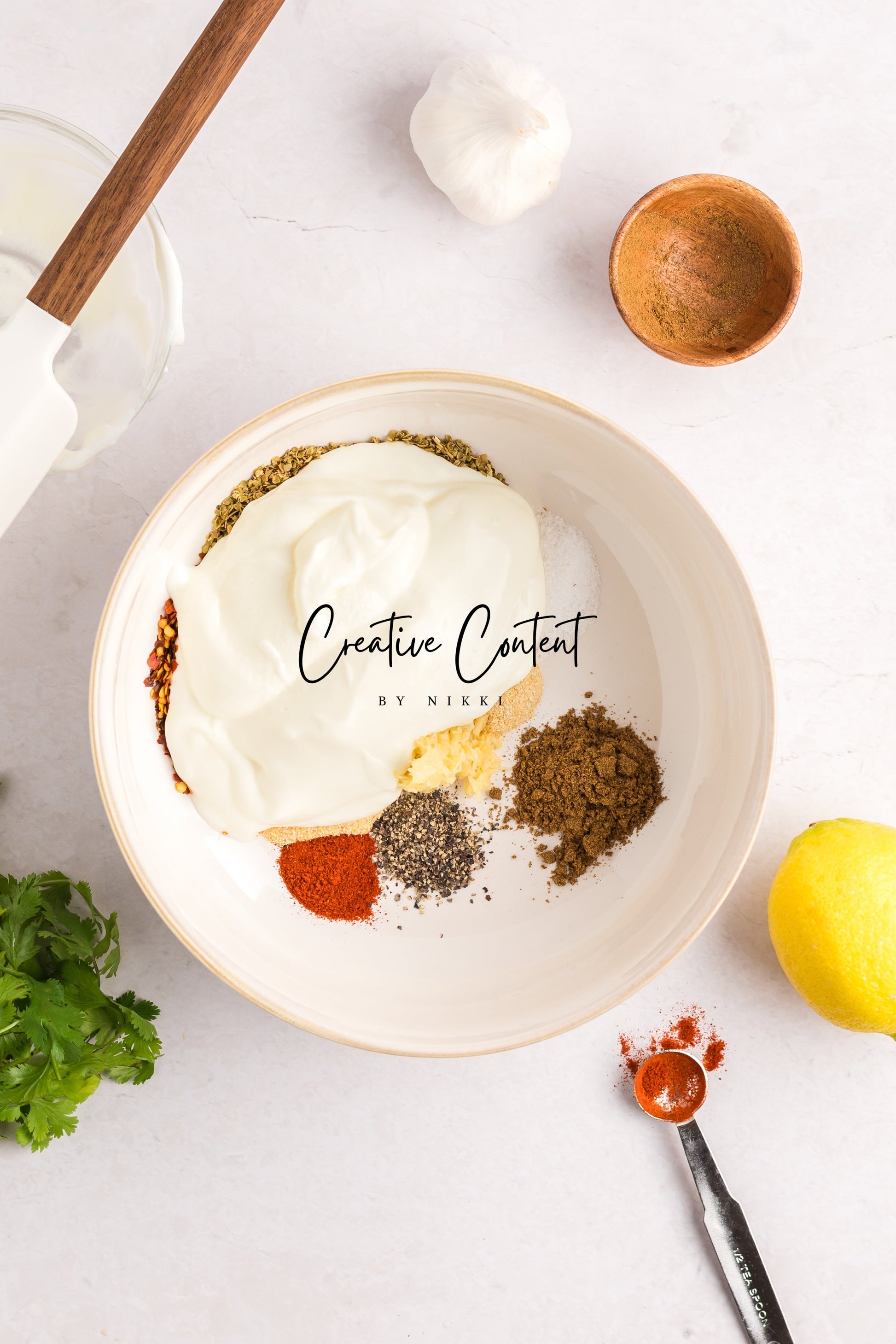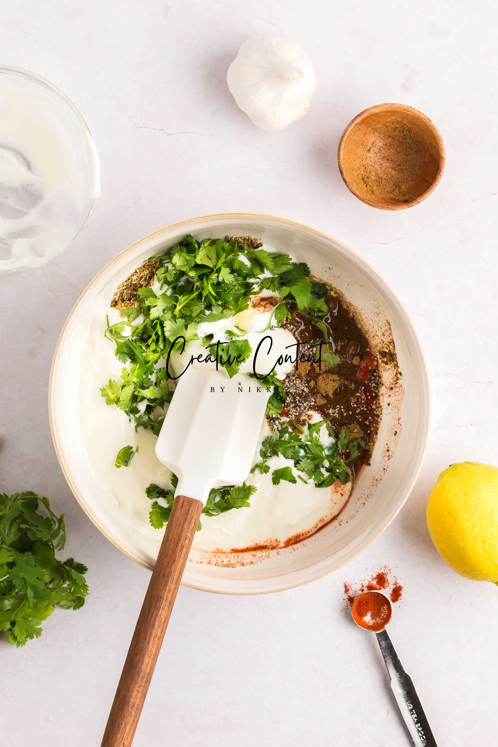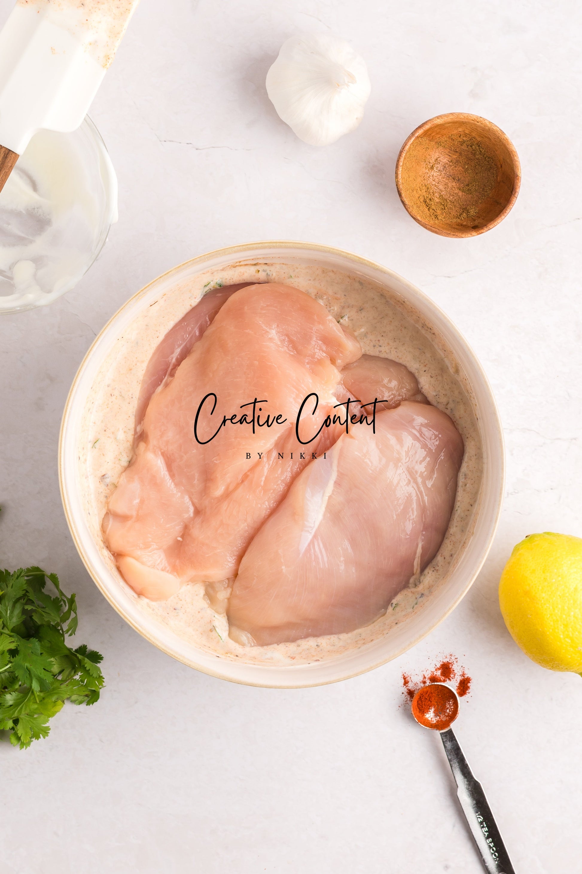 - Ingredients needed; full fat plain Greek yogurt, cilantro, garlic cloves, lemon juice, cumin, paprika, oregano, coarse kosher salt, black pepper, onion powder, garlic powder, red pepper flakes, chicken breasts, and avocado oil.