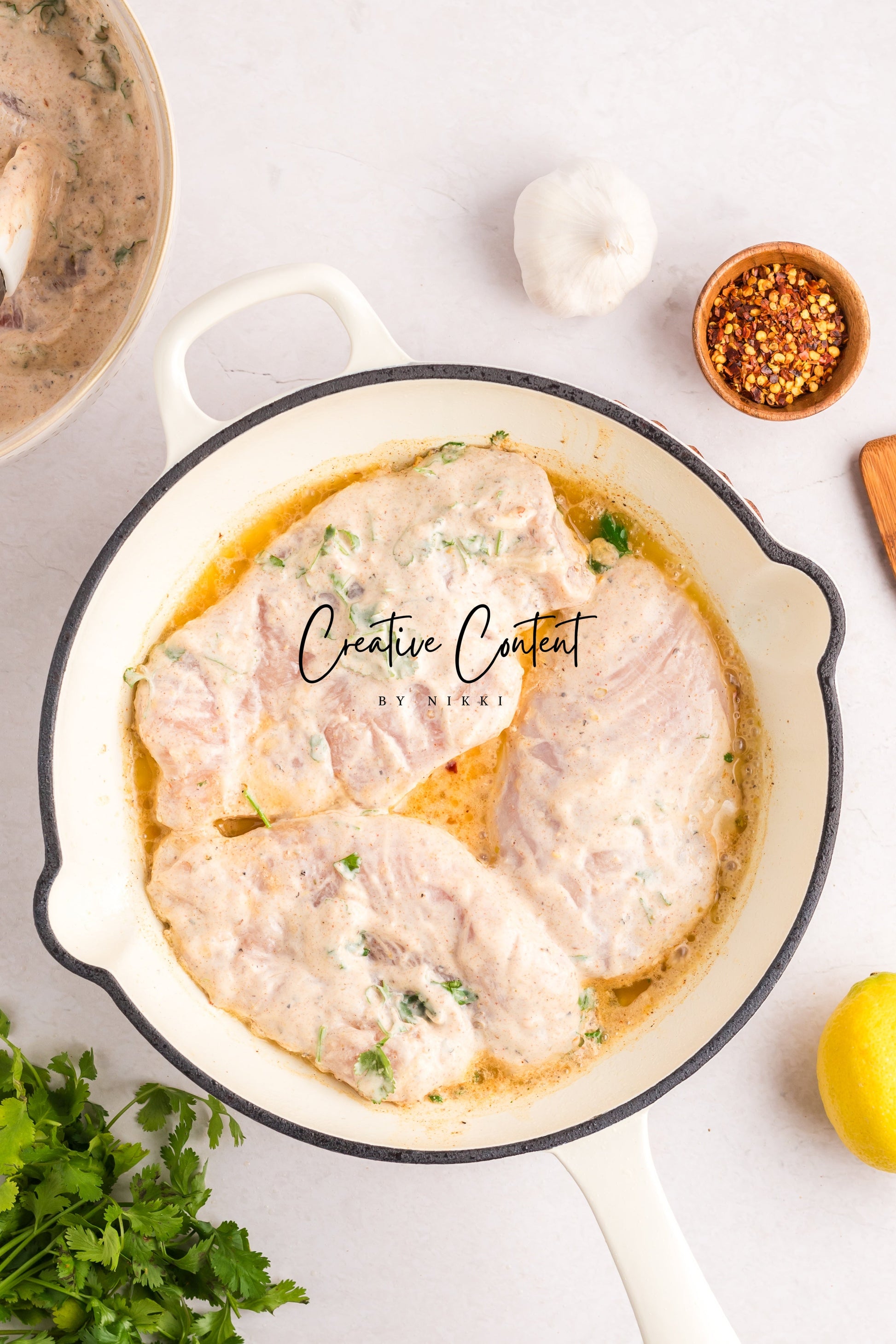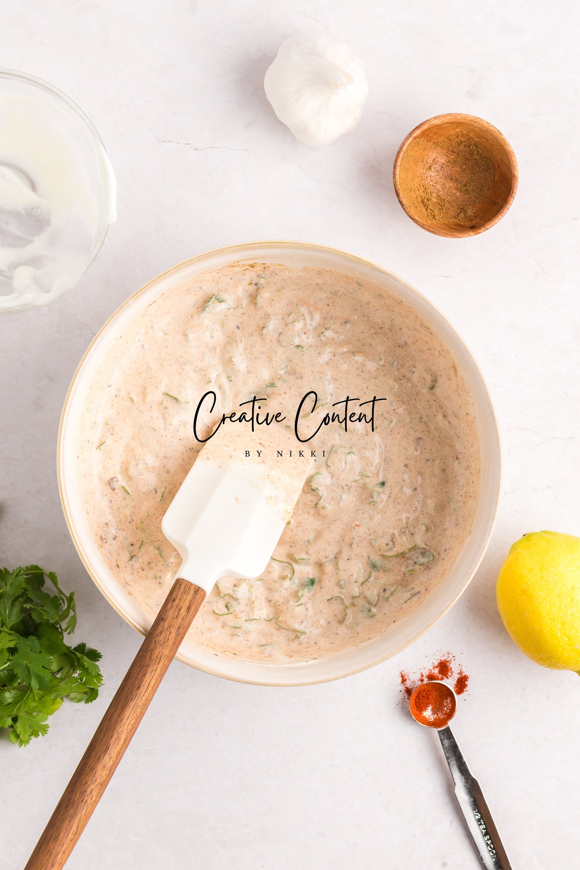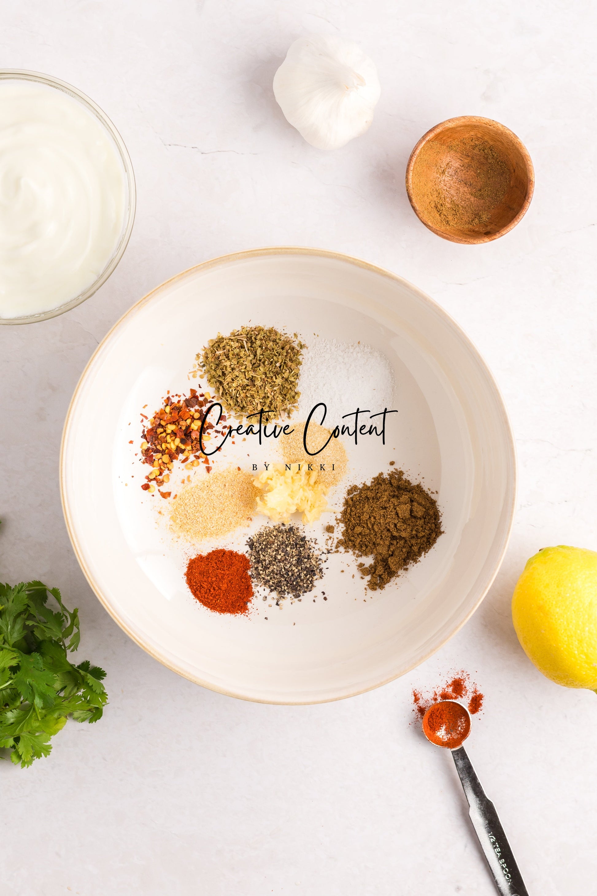 - Ingredients needed; full fat plain Greek yogurt, cilantro, garlic cloves, lemon juice, cumin, paprika, oregano, coarse kosher salt, black pepper, onion powder, garlic powder, red pepper flakes, chicken breasts, and avocado oil.