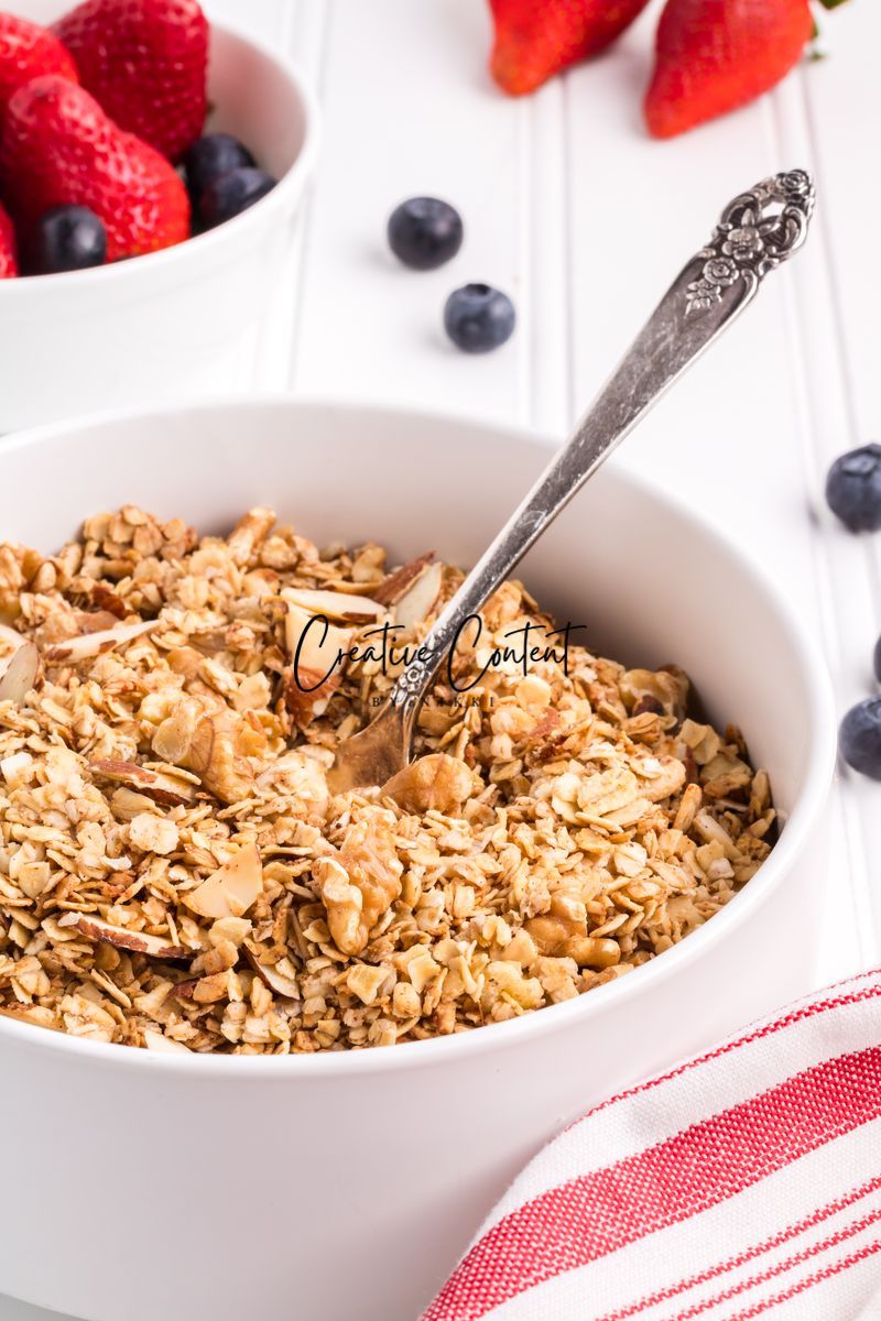Featured Ingredients; Maple syrup, coconut oil, date sugar, vanilla, cinnamon, coarse kosher salt, oats, almonds, walnuts, plain Greek yogurt, strawberries, blueberries, honey, and mint.