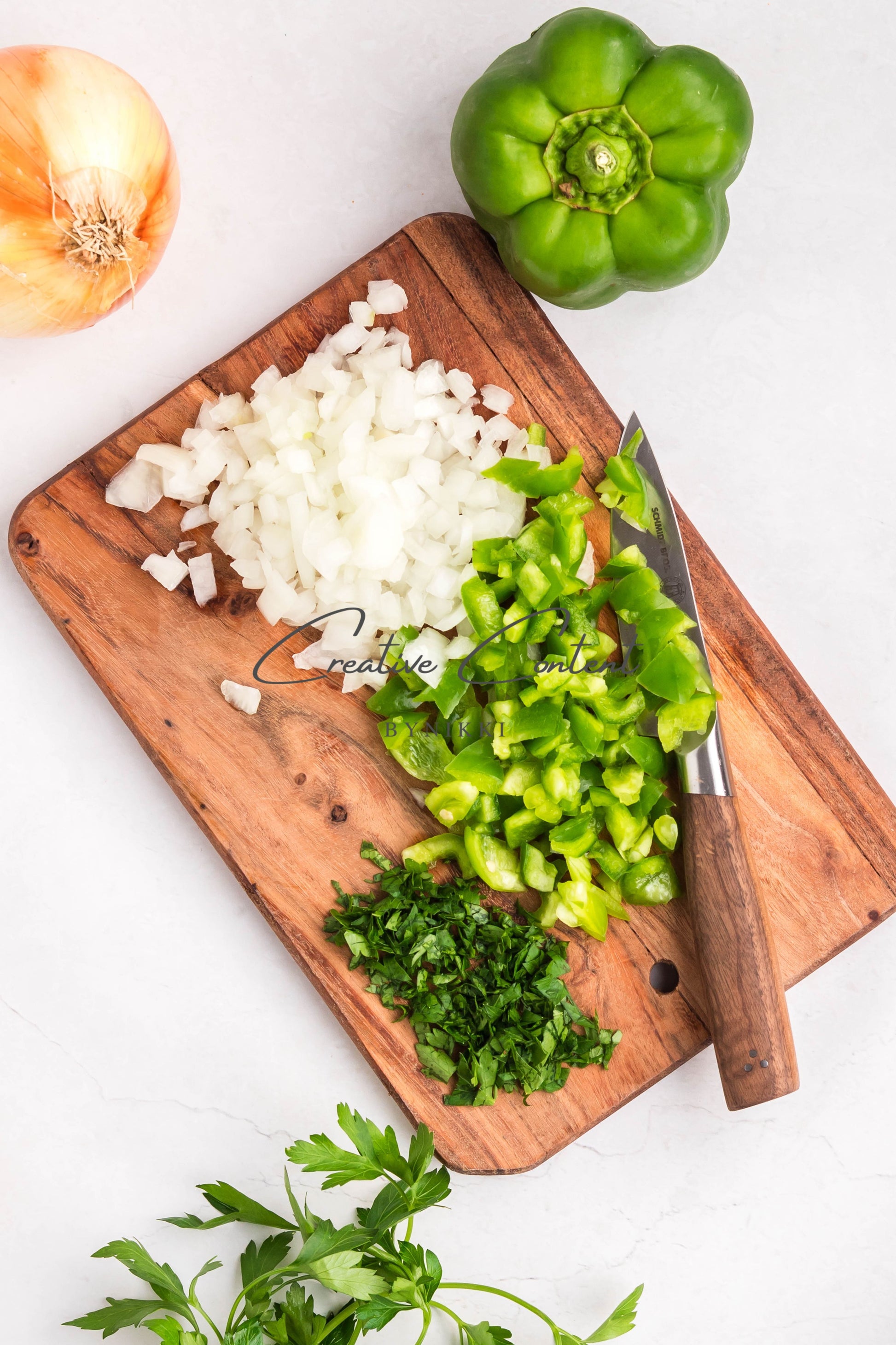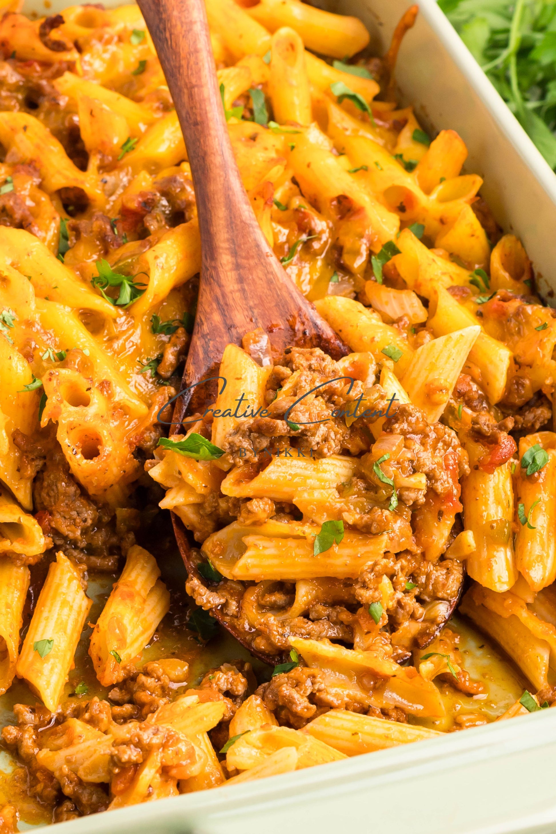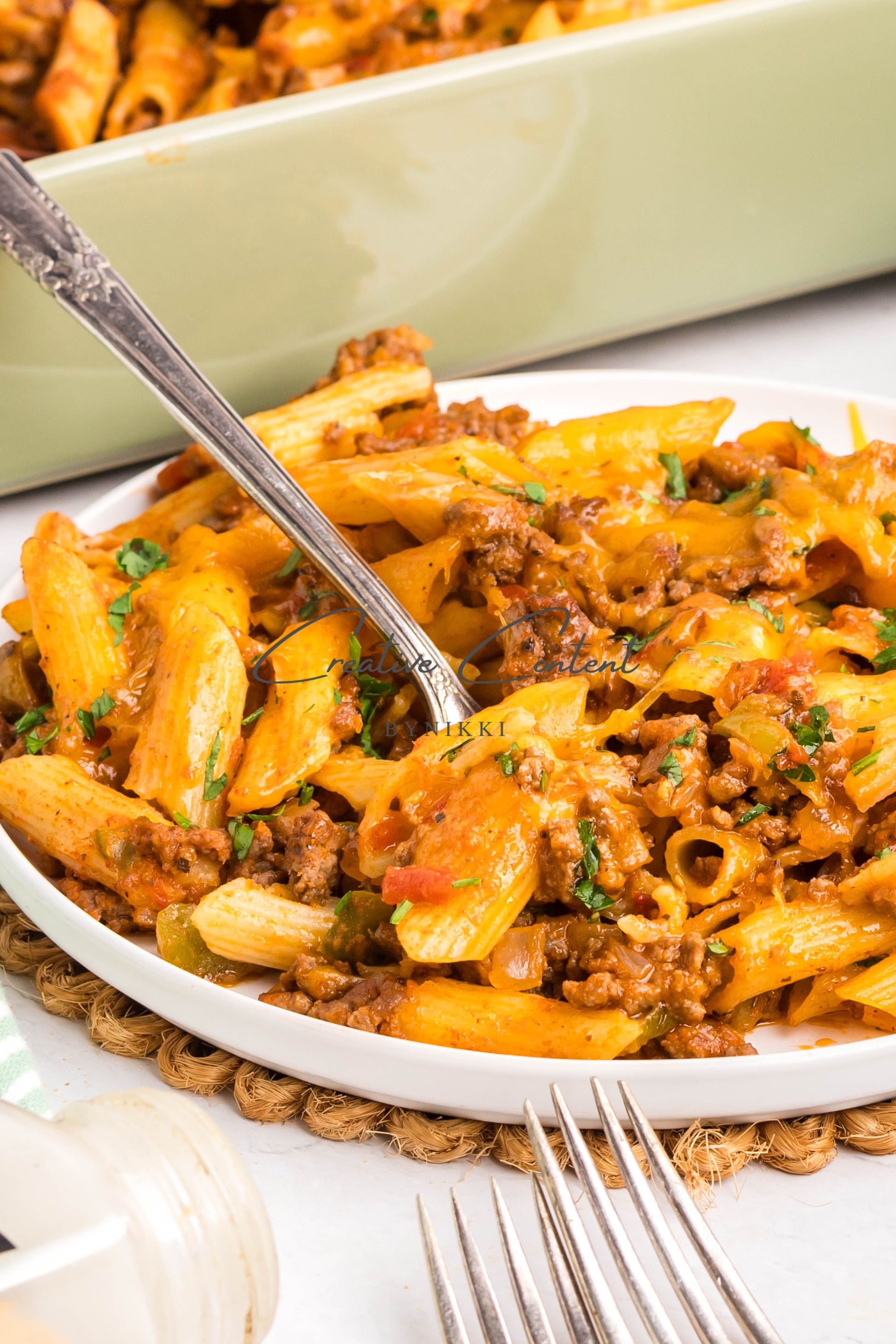 - Ingredients: penne pasta, ground beef, green bell pepper, yellow onion, garlic powder, onion powder, spaghetti sauce, cheddar cheese, parsley