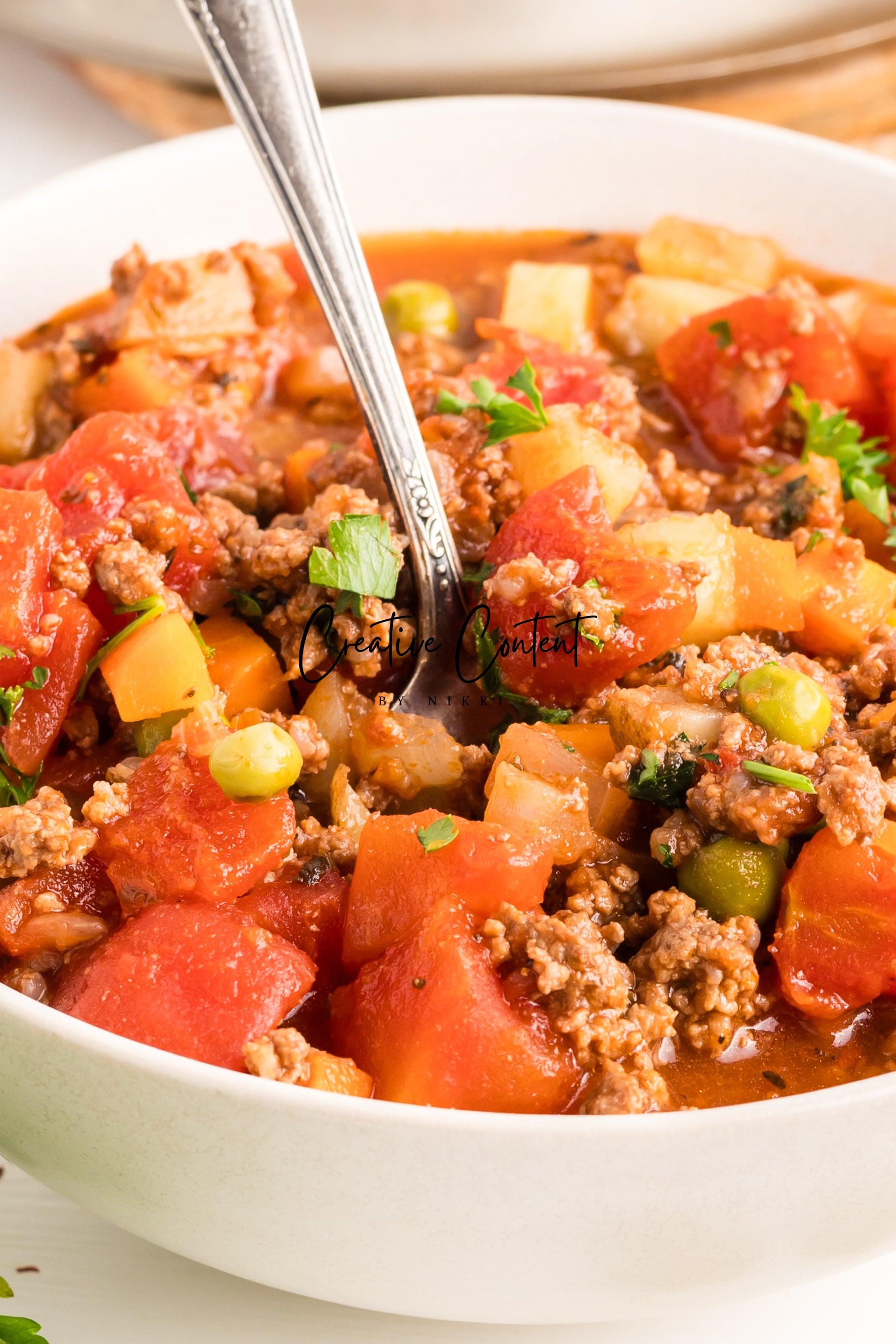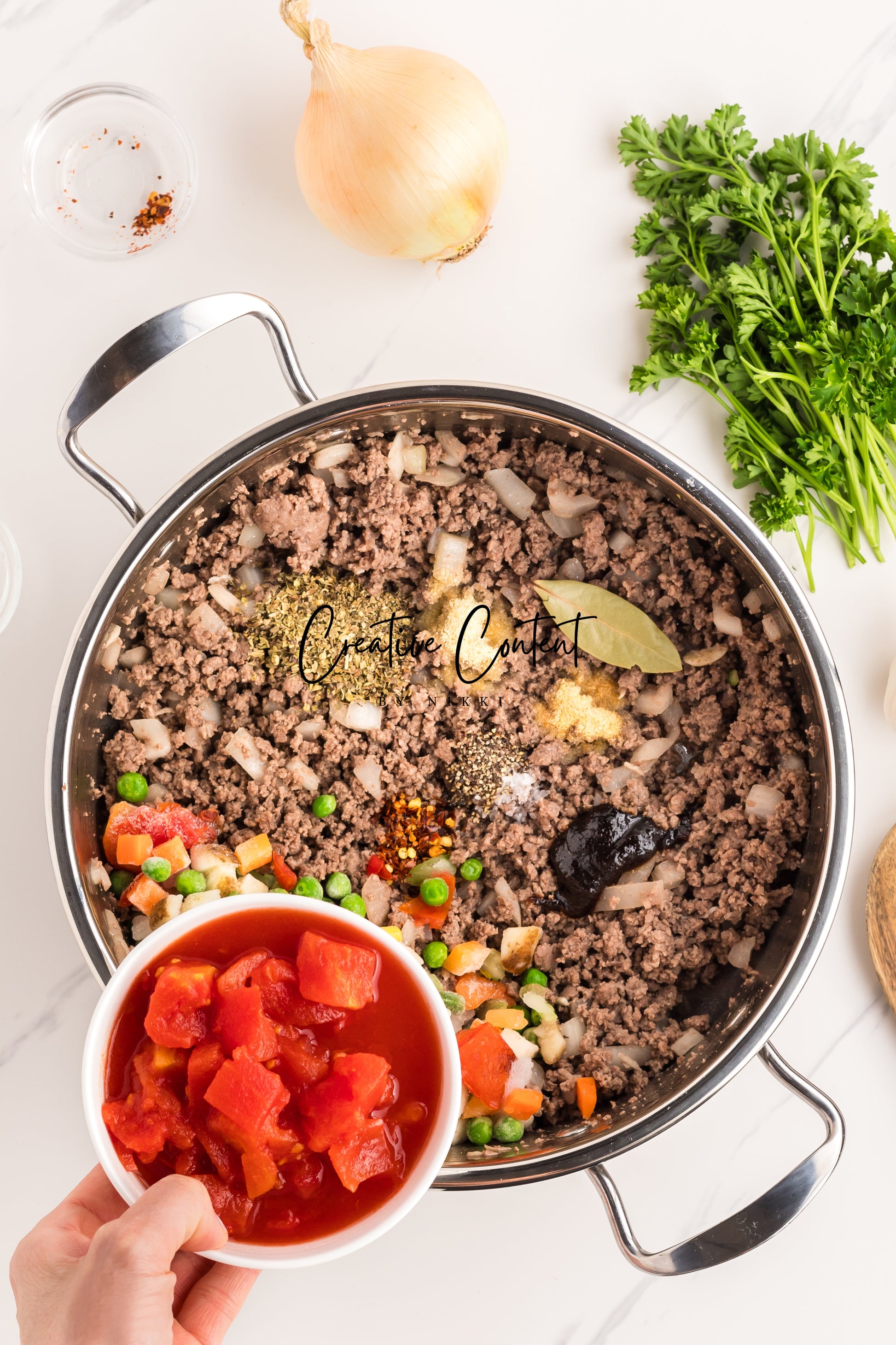 - Featured Ingredients; ground beef, yellow onion, garlic cloves, diced tomatoes, beef broth, tomato sauce, Beef Better Than Bouillon, seasonings, and frozen vegetables.