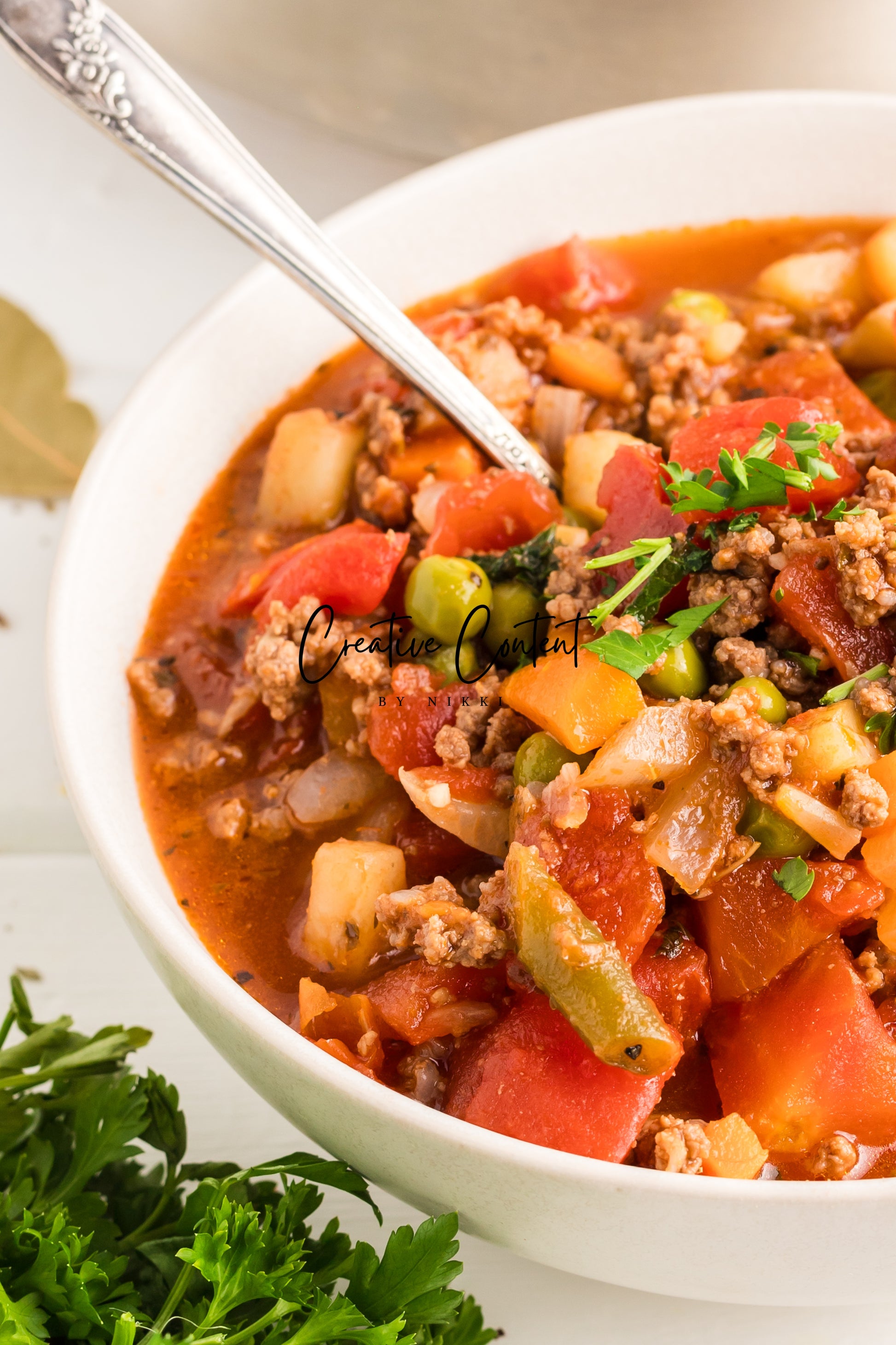 This hamburger vegetable soup is loaded with flavor from the seasonings, onion, tomatoes, ground beef, and vegetables. If you are looking for a great dinner for your weeknight or want something special when having people over this soup is a great soup to make. I also love this soup, as I have most of the pantry items already.
