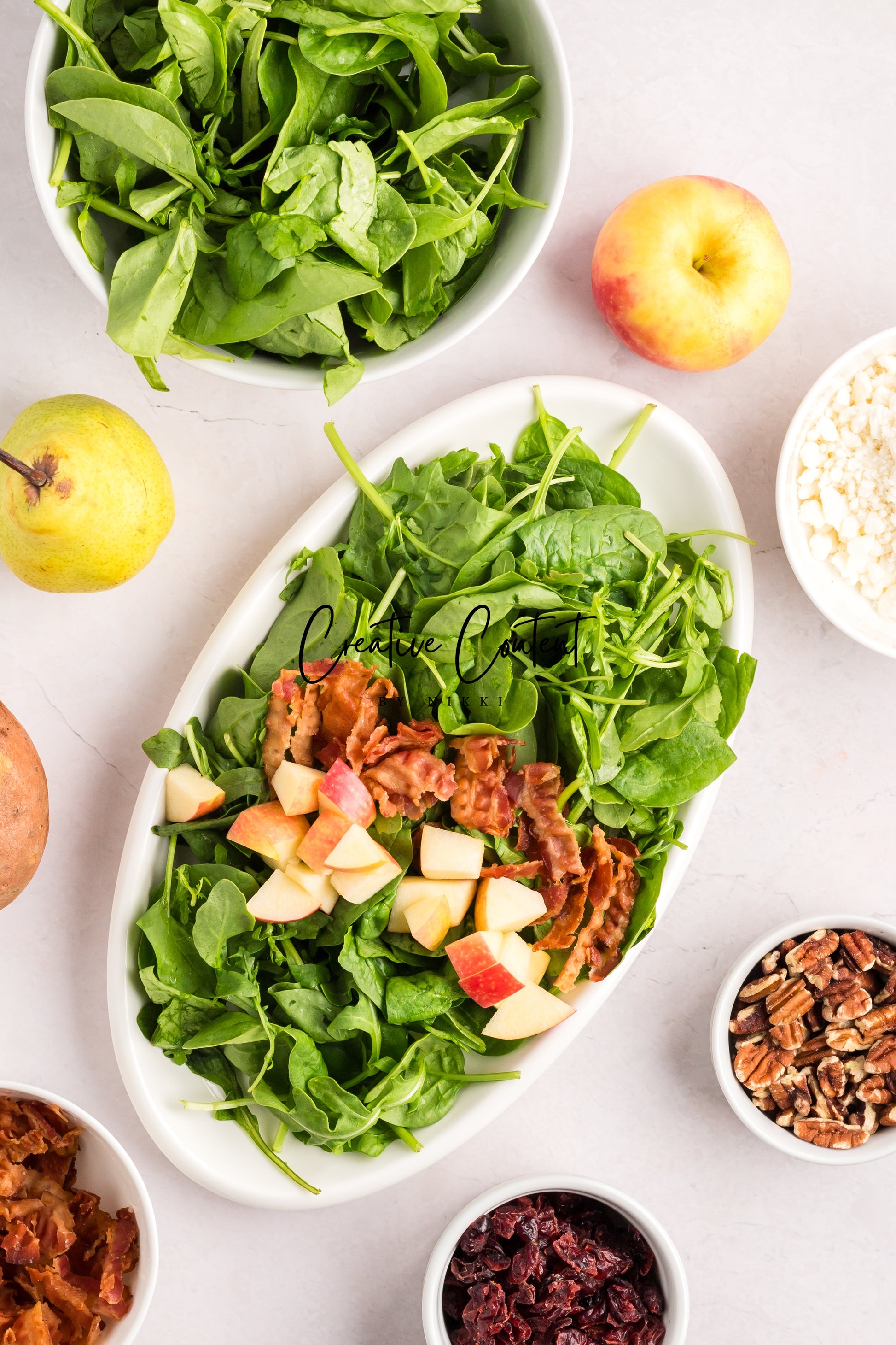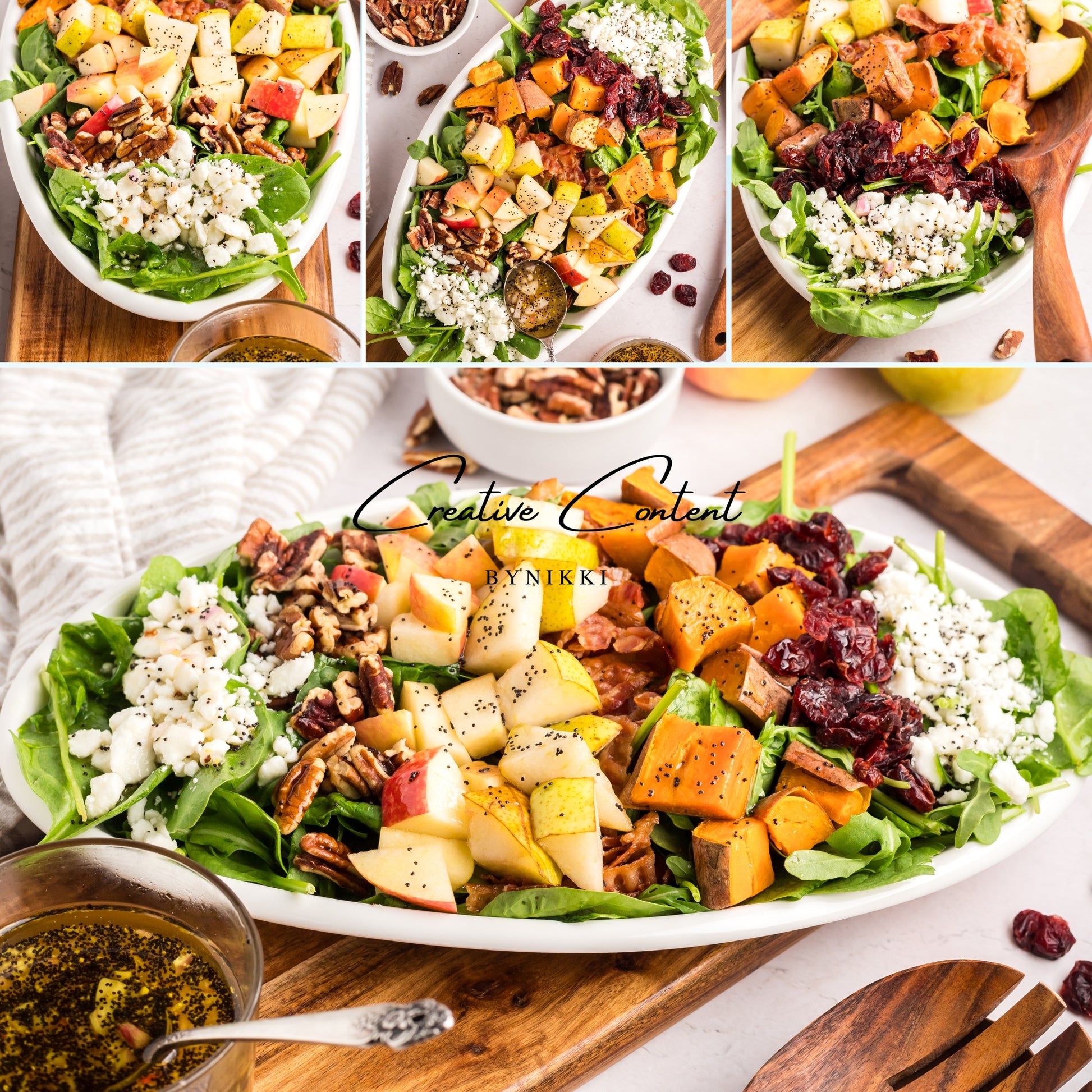 - Featured Ingredients; avocado oil, rose vinegar, honey, shallot, poppy seeds, ground mustard, salt, pepper, romaine lettuce, pre-cooked bacon, sweet potato, apple, pear, pecan halves, cranberries, and feta cheese.