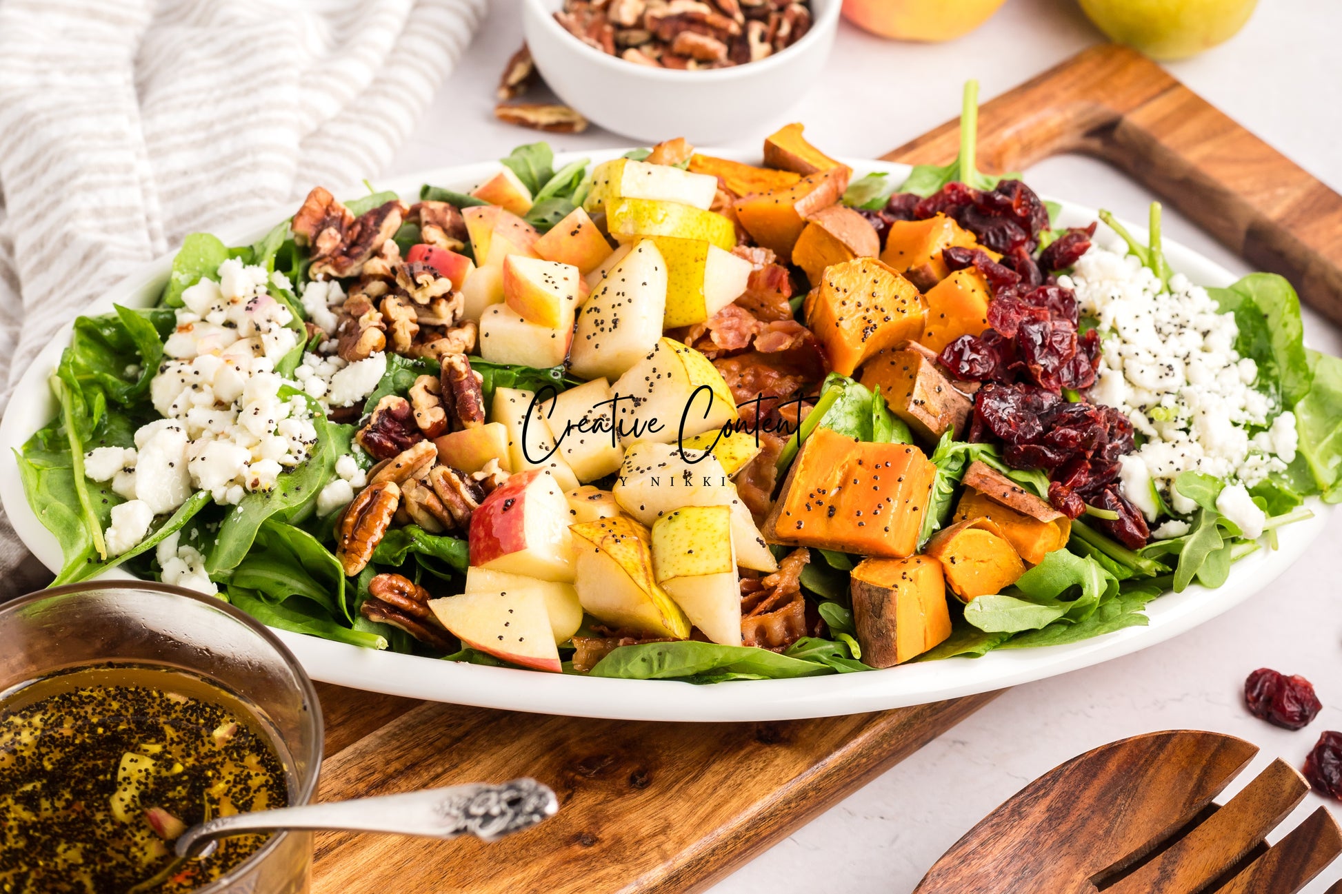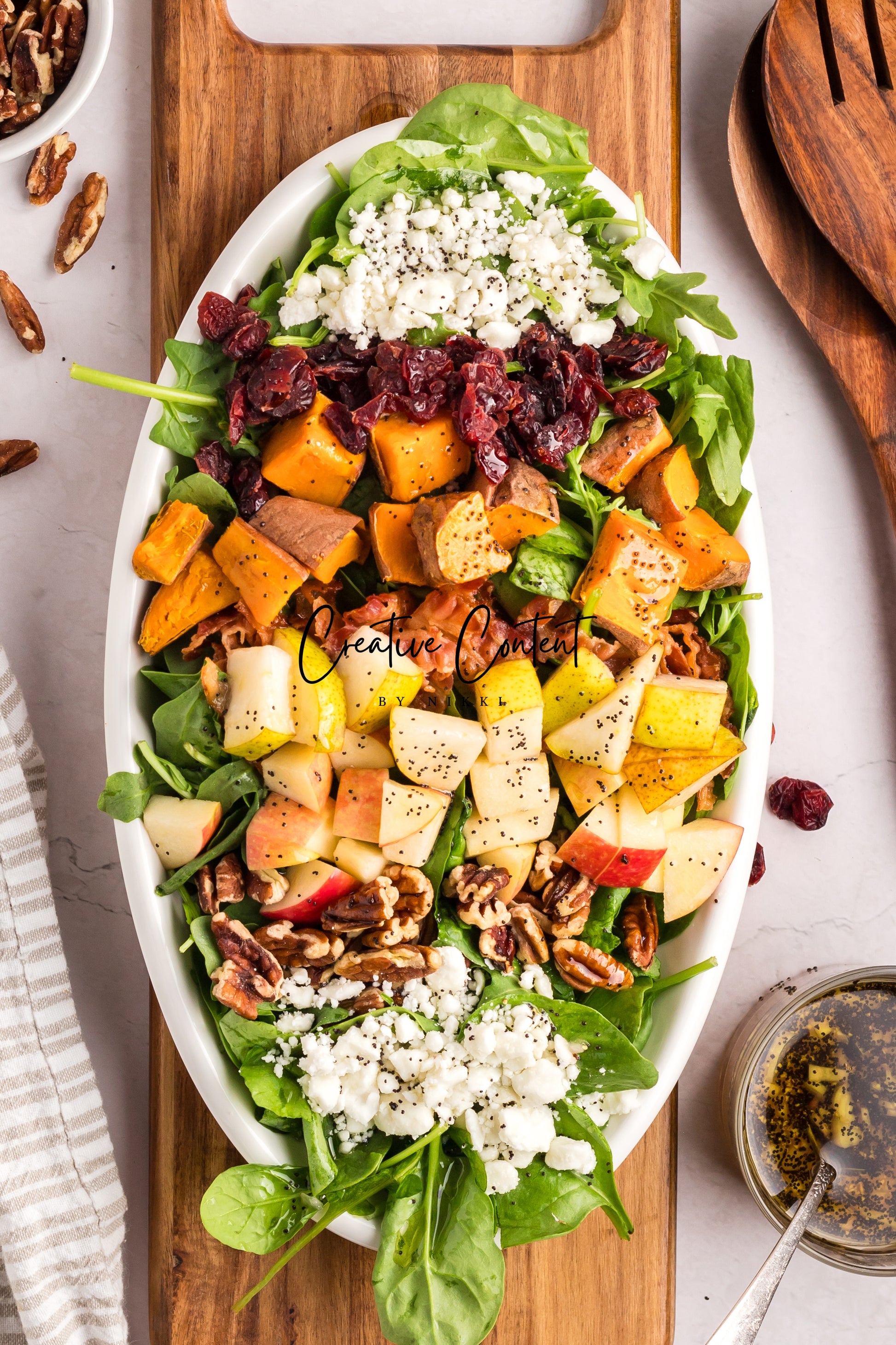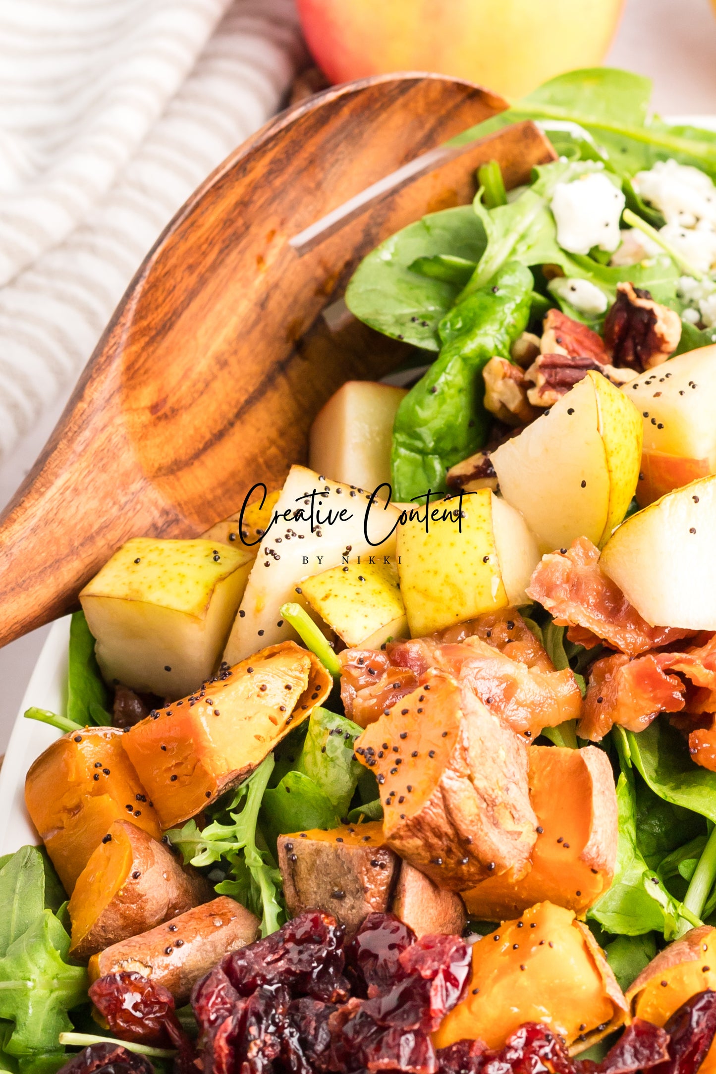 This Harvest Cobb Salad has the perfect combination of flavors with the homemade poppyseed dressing that is sweet and tangy. The salad is loaded with crunchy bacon, sweet potatoes, sweet cranberries, and feta cheese. This salad is the perfect fall salad as it is comforting and hearty.