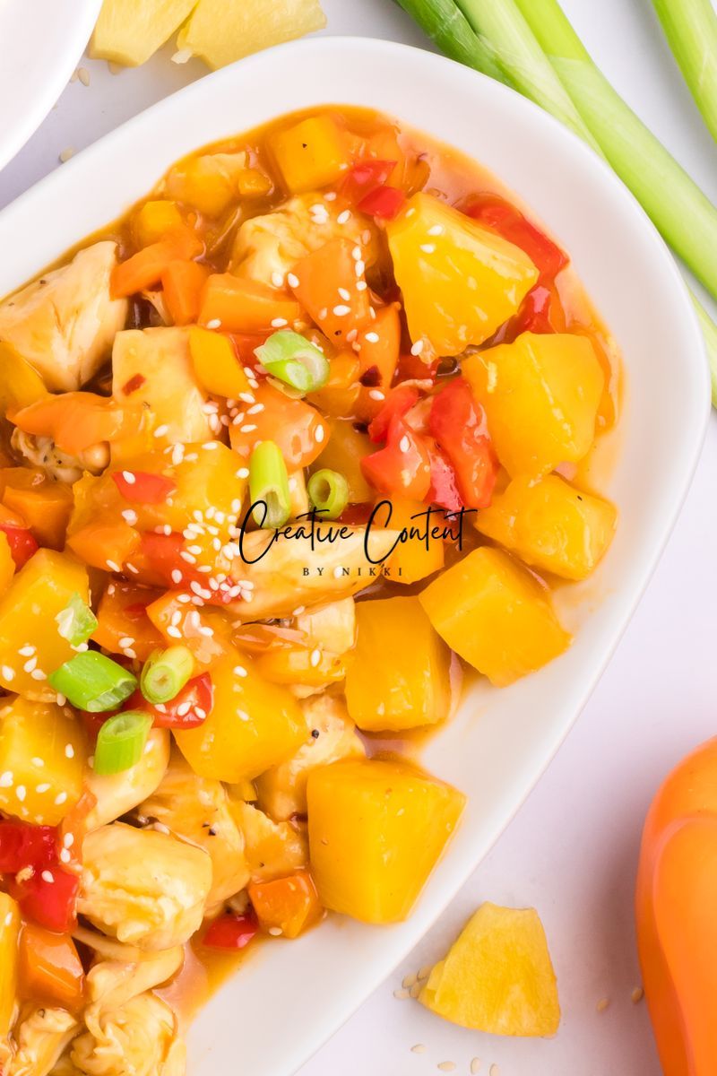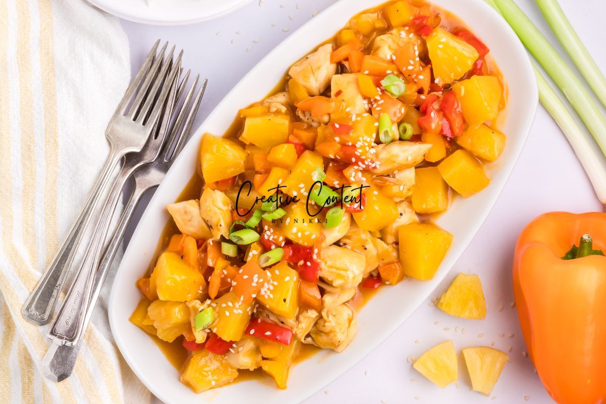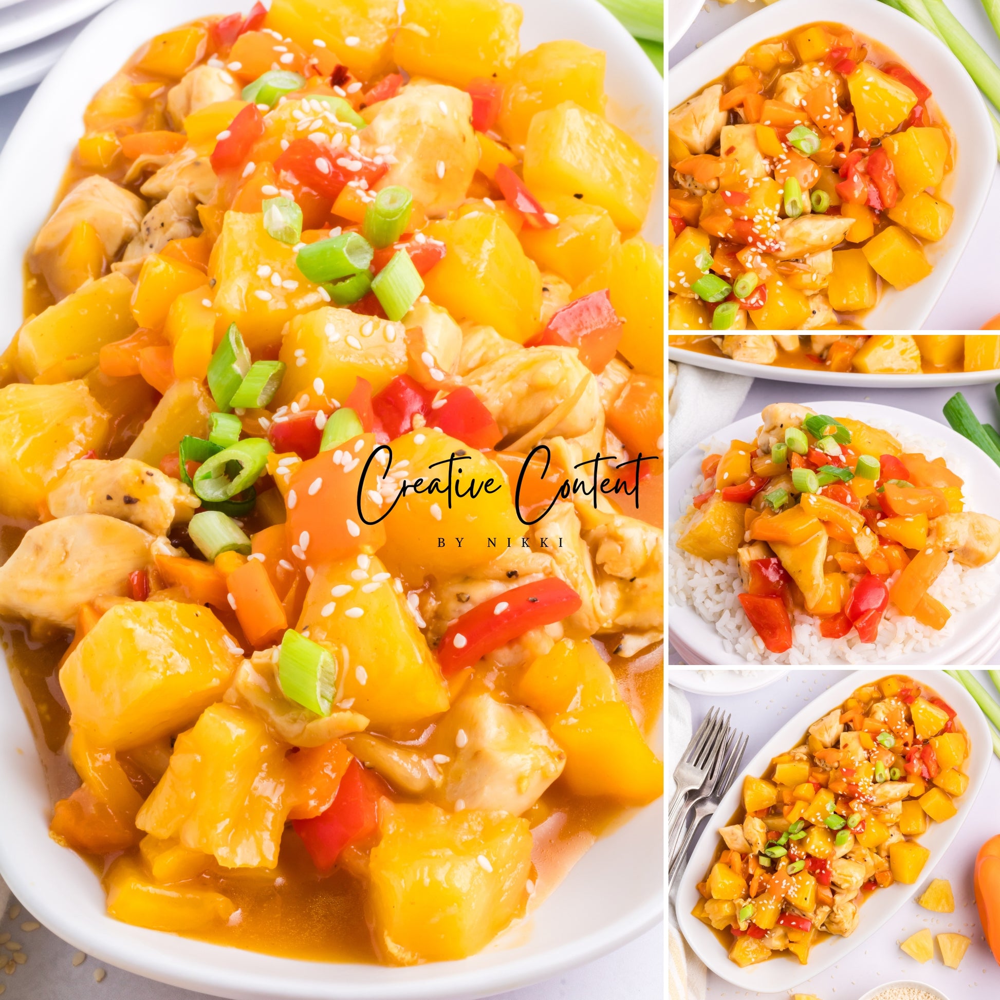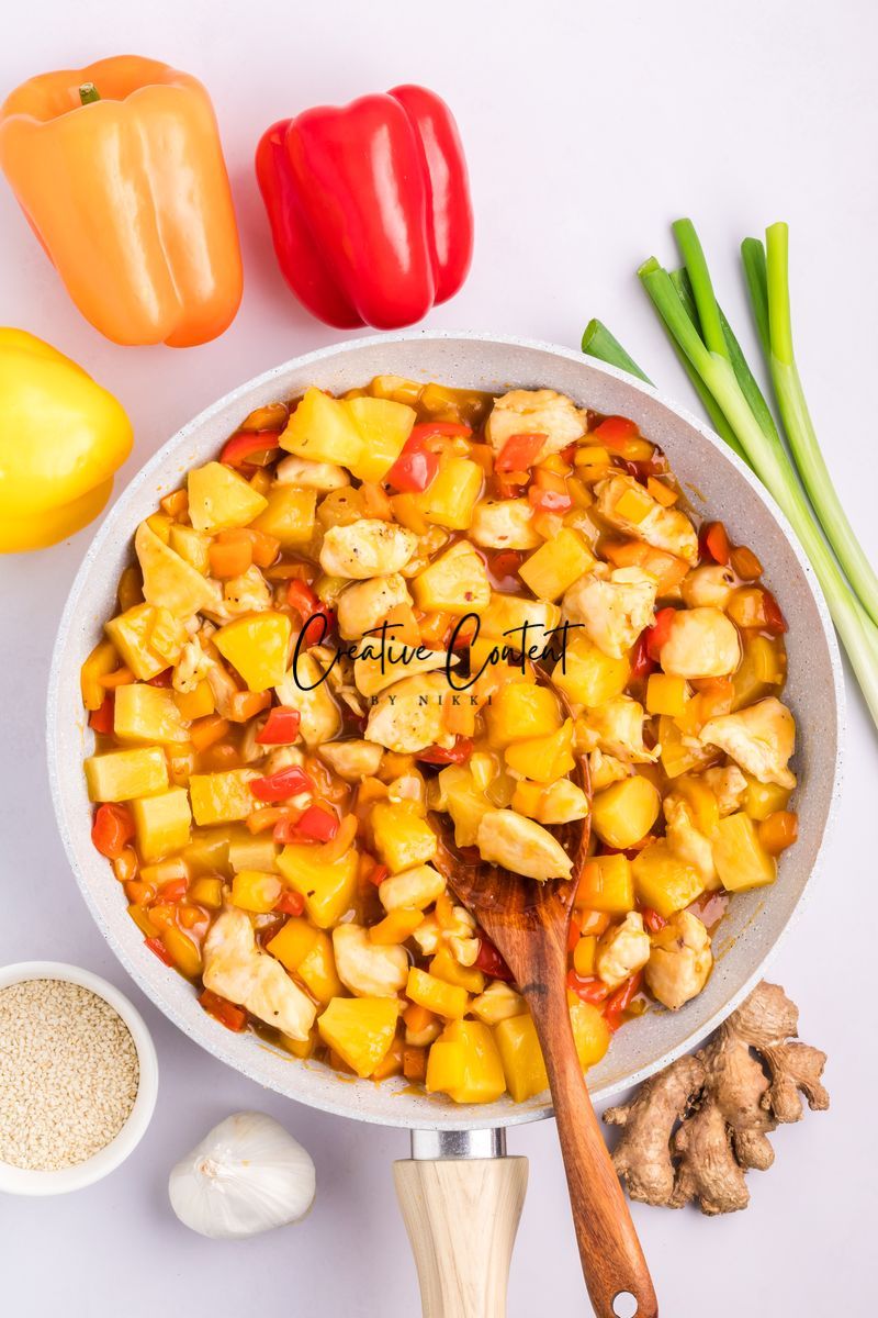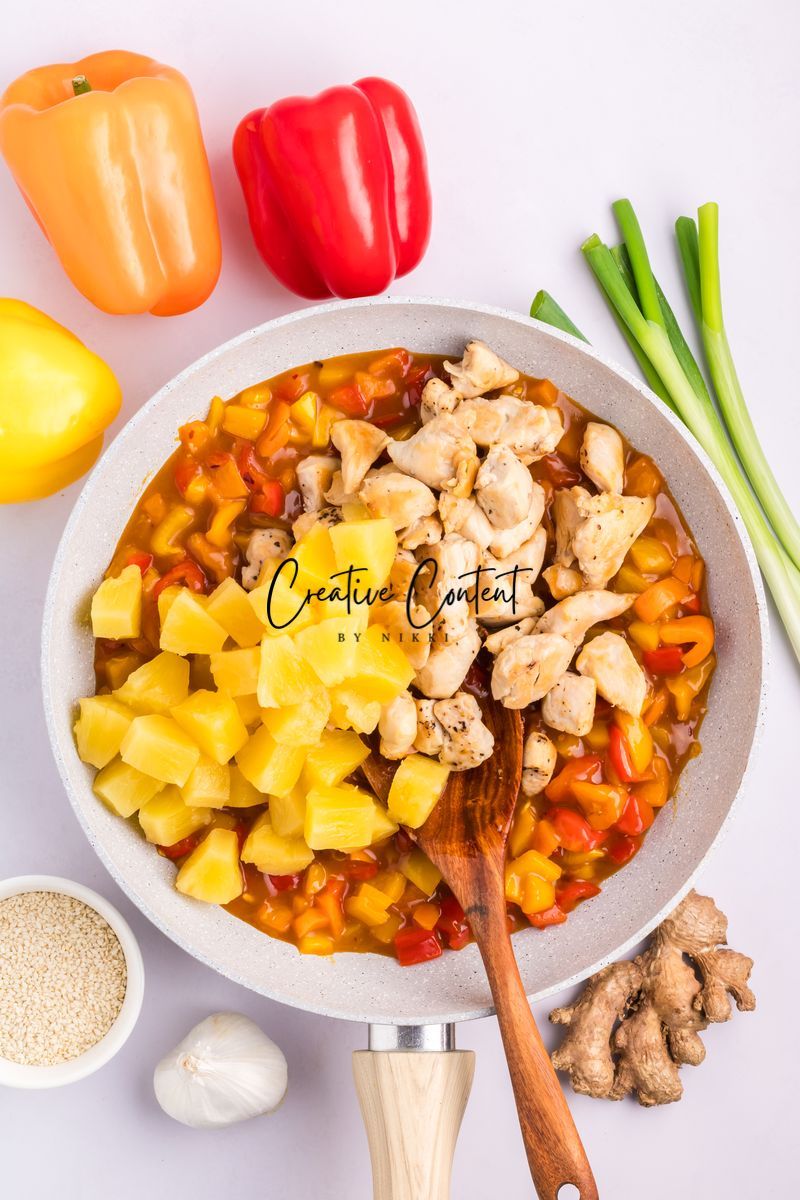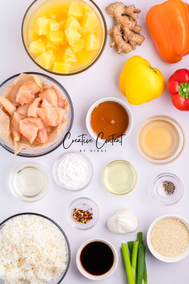 - Featured Ingredients; pineapple juice, chicken stock, soy sauce, honey, rice vinegar, garlic clove, ginger, red pepper flakes, water cornstarch, avocado oil, boneless skinless chicken, coarse kosher salt, black pepper, red, orange, and yellow bell peppers, and pineapple chunks.