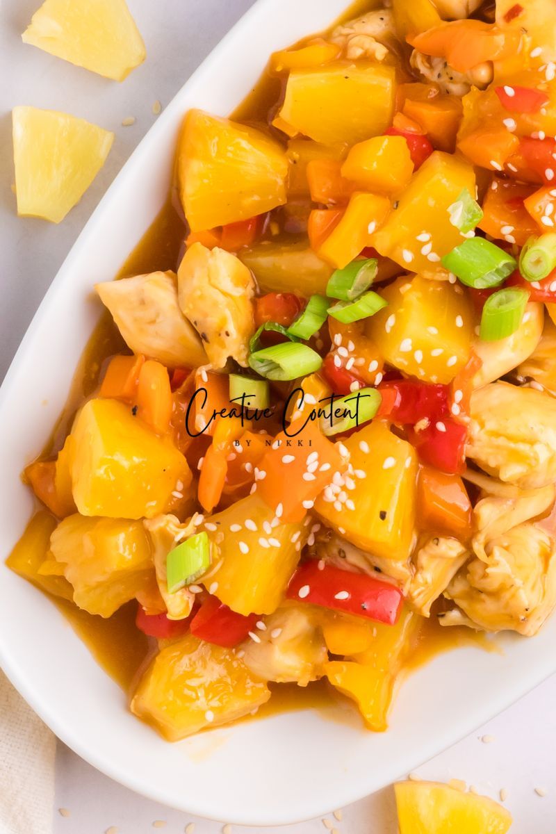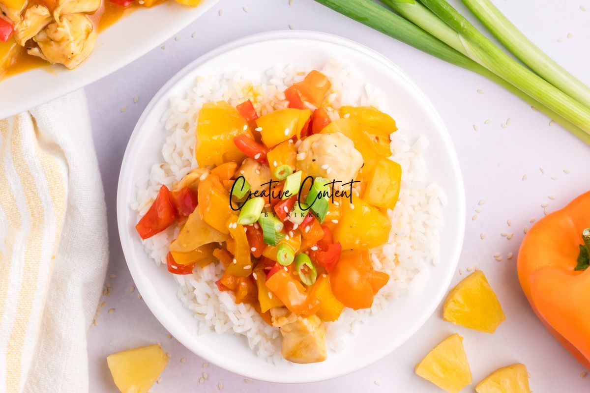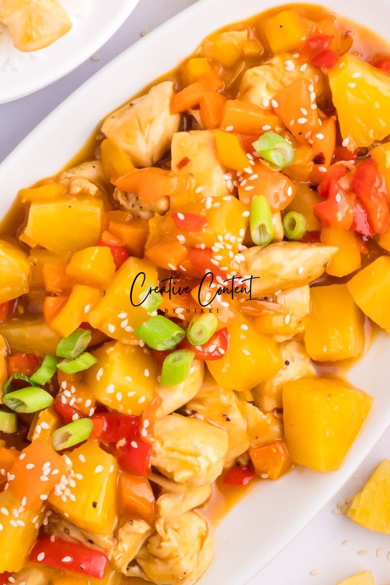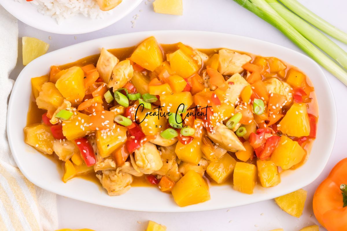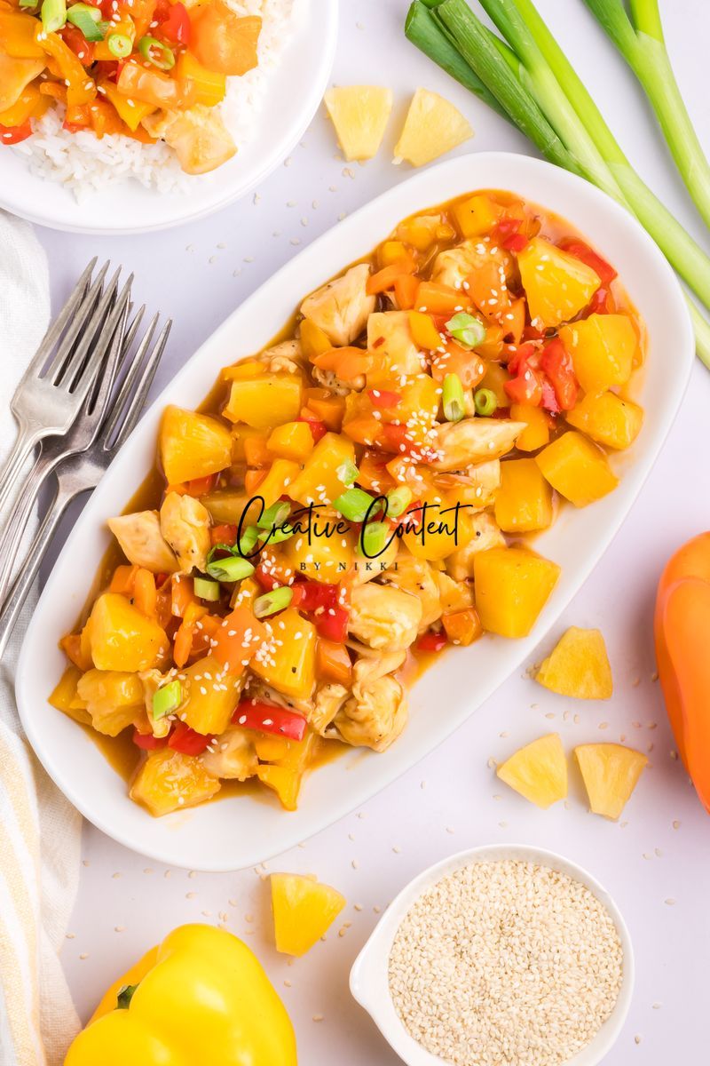 - Featured Ingredients; pineapple juice, chicken stock, soy sauce, honey, rice vinegar, garlic clove, ginger, red pepper flakes, water cornstarch, avocado oil, boneless skinless chicken, coarse kosher salt, black pepper, red, orange, and yellow bell peppers, and pineapple chunks.