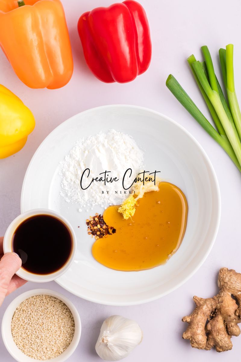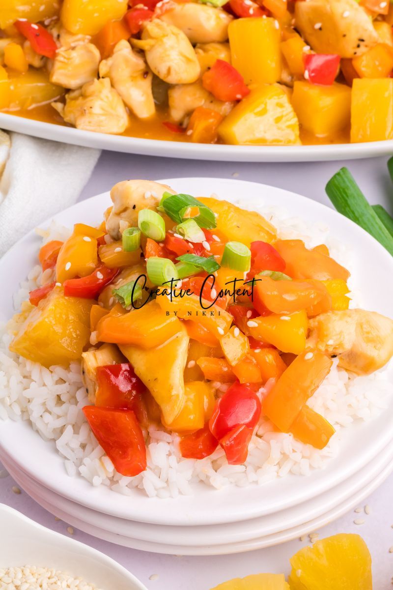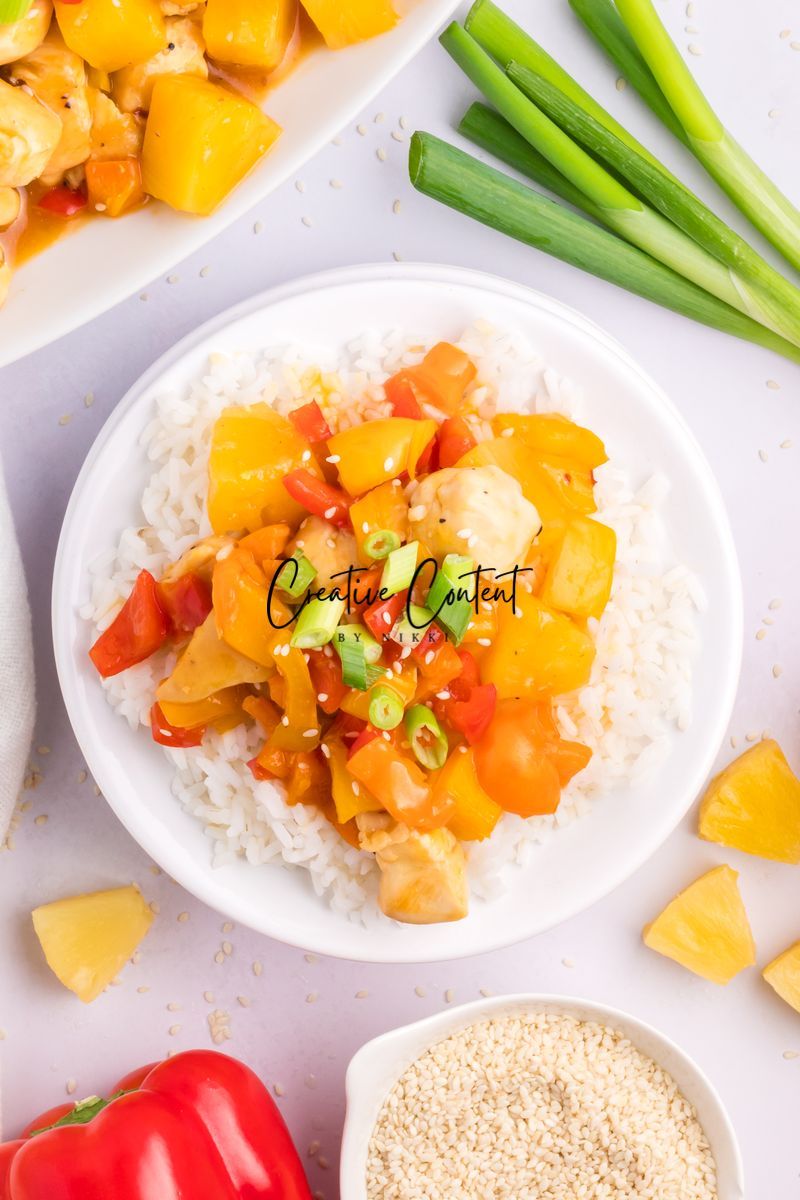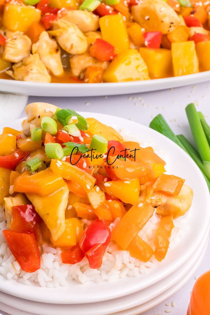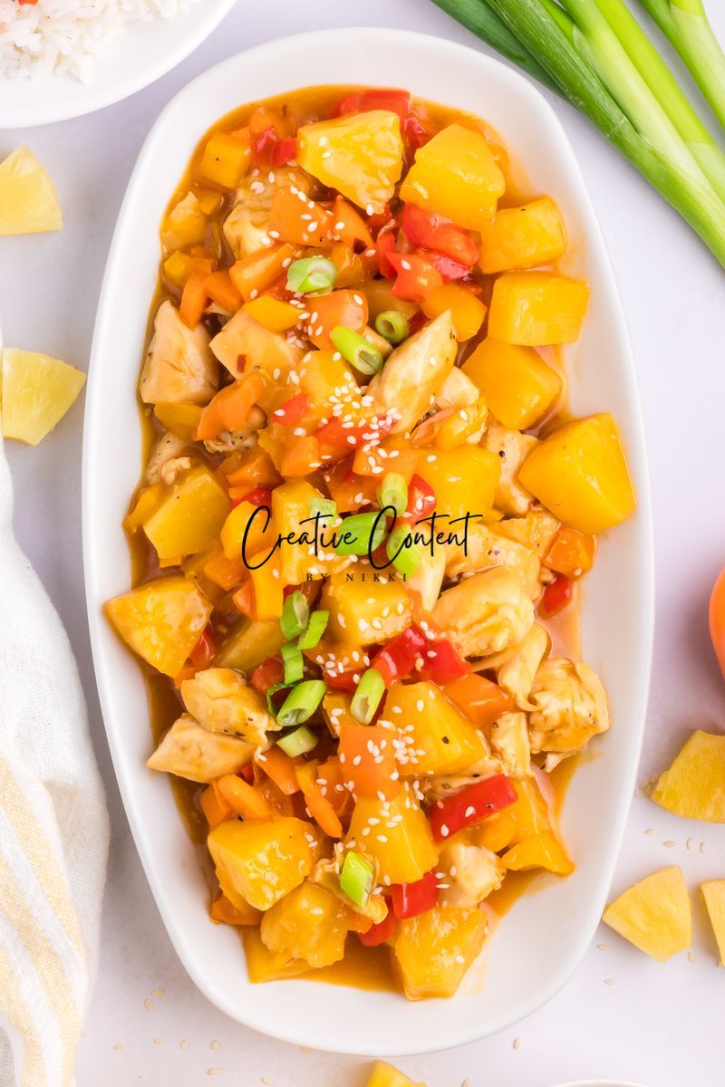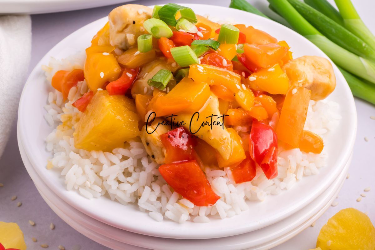 - Featured Ingredients; pineapple juice, chicken stock, soy sauce, honey, rice vinegar, garlic clove, ginger, red pepper flakes, water cornstarch, avocado oil, boneless skinless chicken, coarse kosher salt, black pepper, red, orange, and yellow bell peppers, and pineapple chunks.