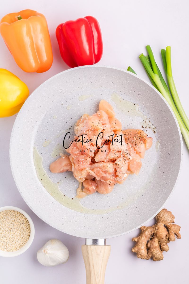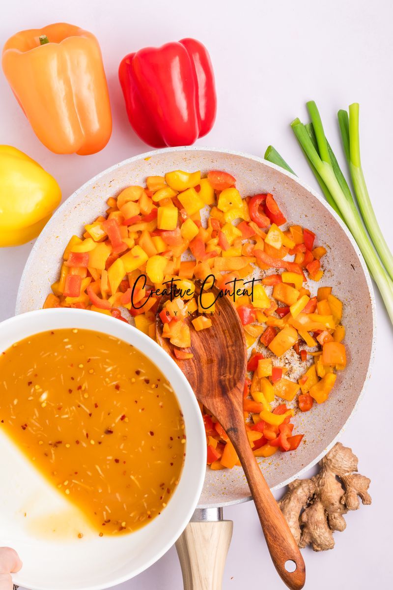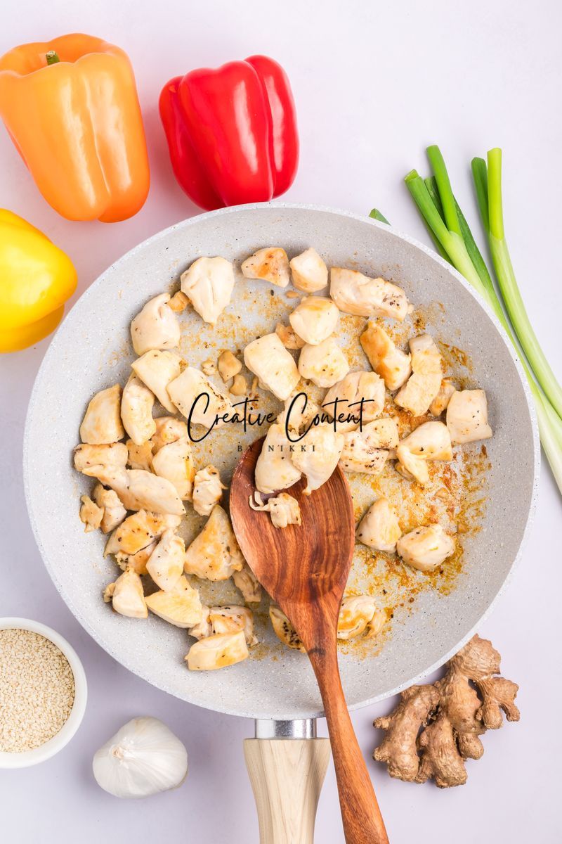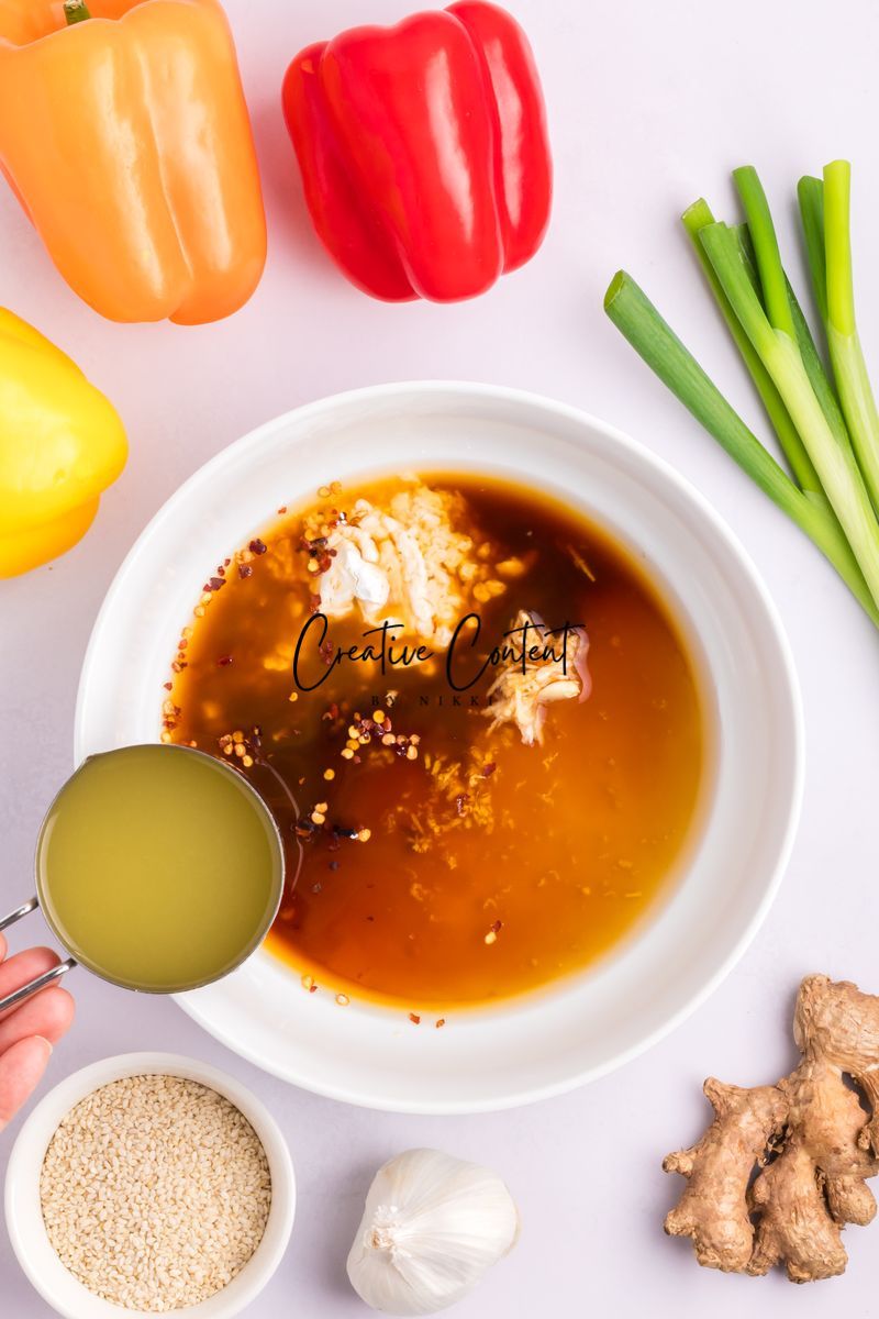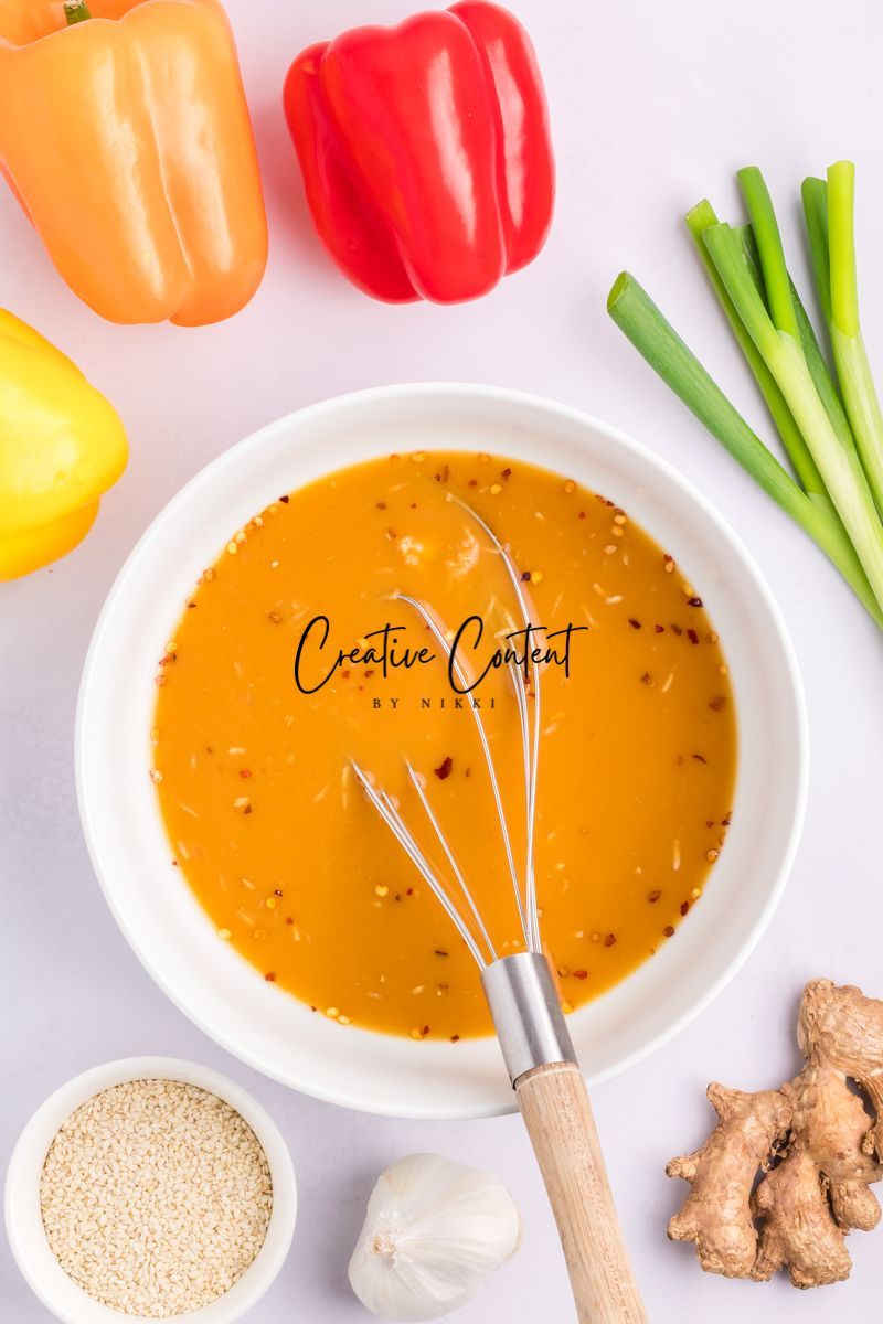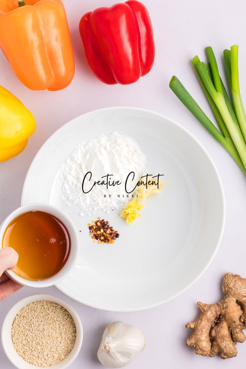 - Featured Ingredients; pineapple juice, chicken stock, soy sauce, honey, rice vinegar, garlic clove, ginger, red pepper flakes, water cornstarch, avocado oil, boneless skinless chicken, coarse kosher salt, black pepper, red, orange, and yellow bell peppers, and pineapple chunks.